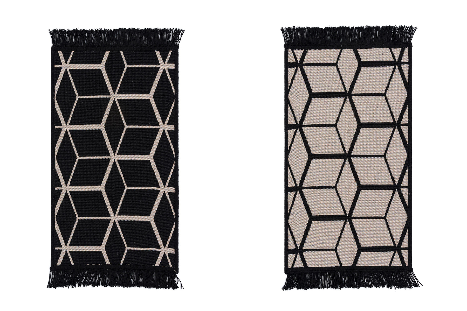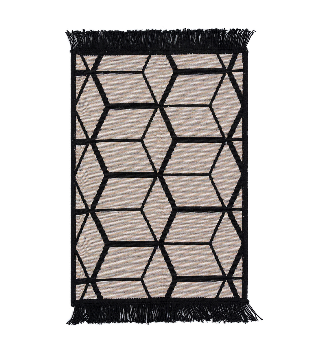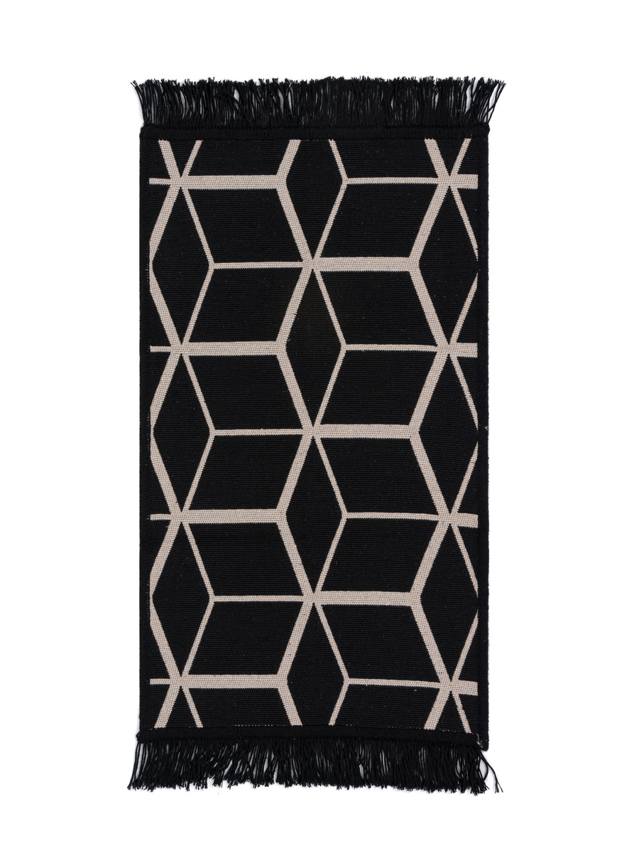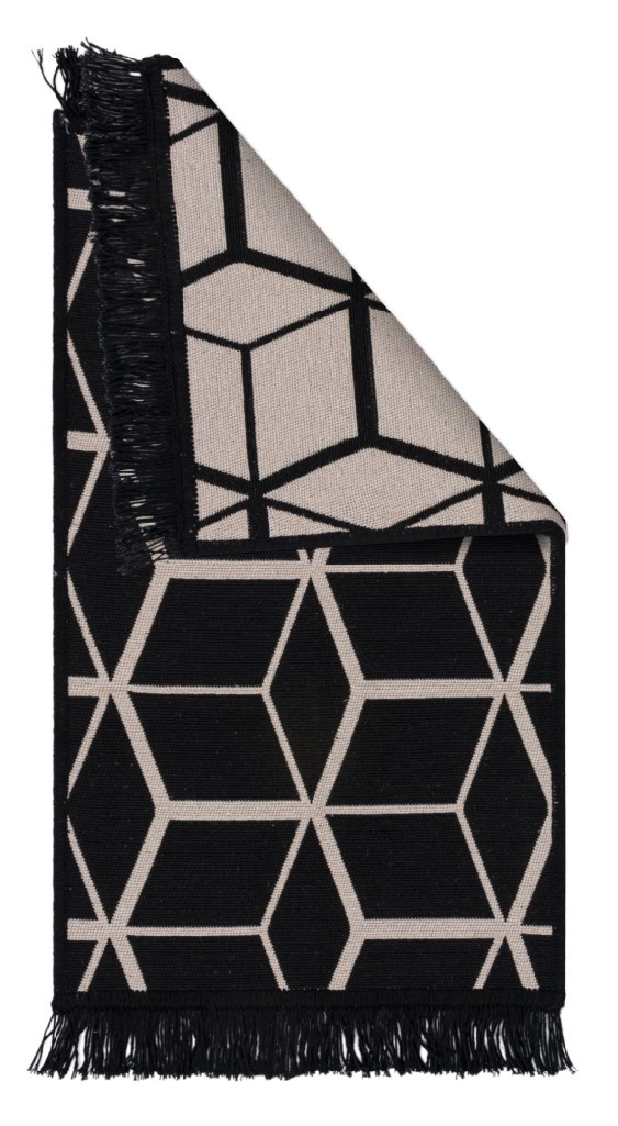 - Dwustronny, mięciutki dywanik - chodniczek Orient z geometrycznym wzorem Cubes w czerni i beżu z delikatnymi frędzelkami.