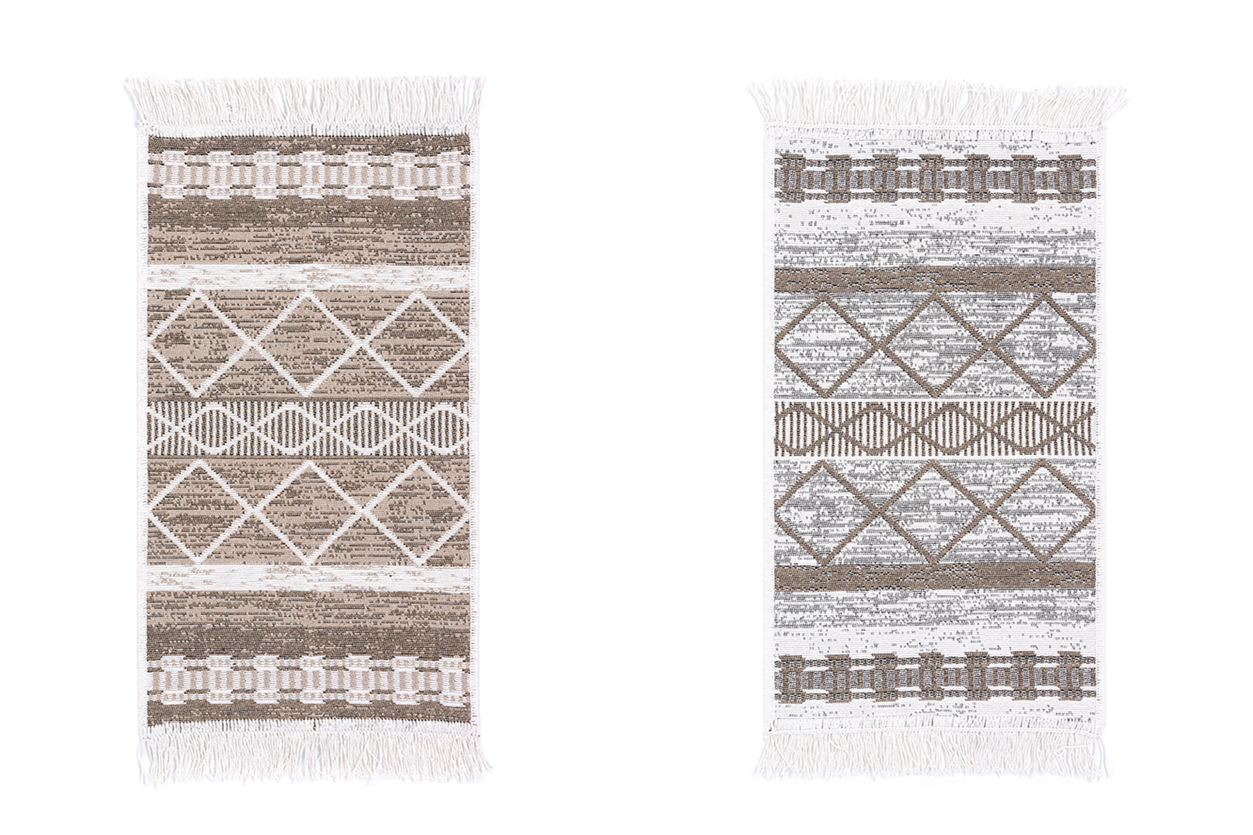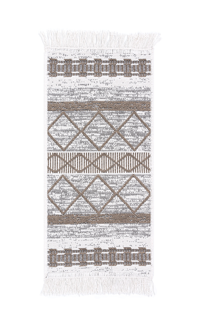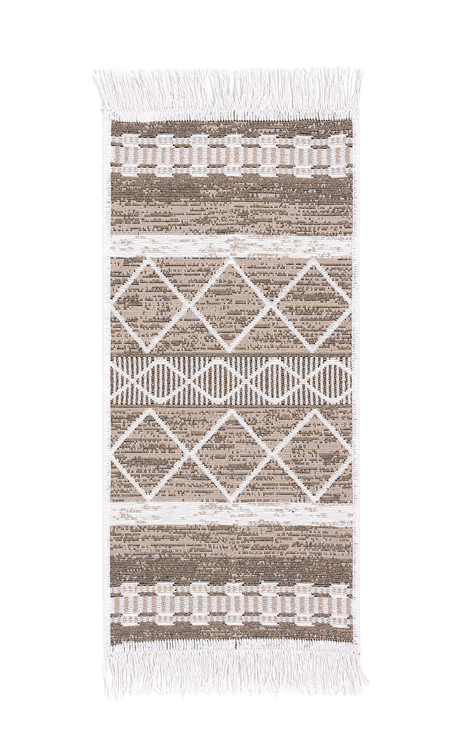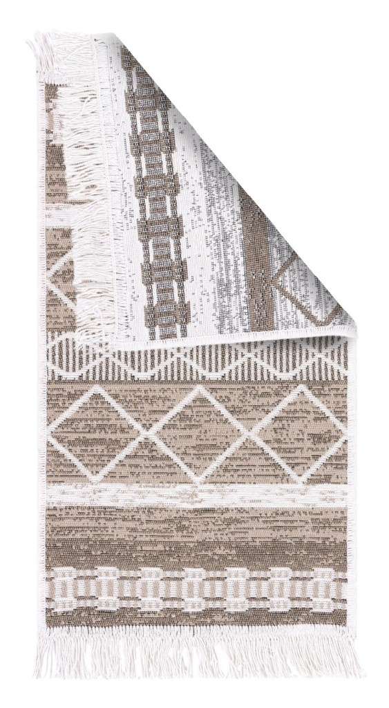 - Dwustronny, mięciutki dywanik - chodniczek Orient z geometrycznym wzorem etnicznym w romby w odcieniach brązu, beżu i kremu, z delikatnymi frędzelkami.