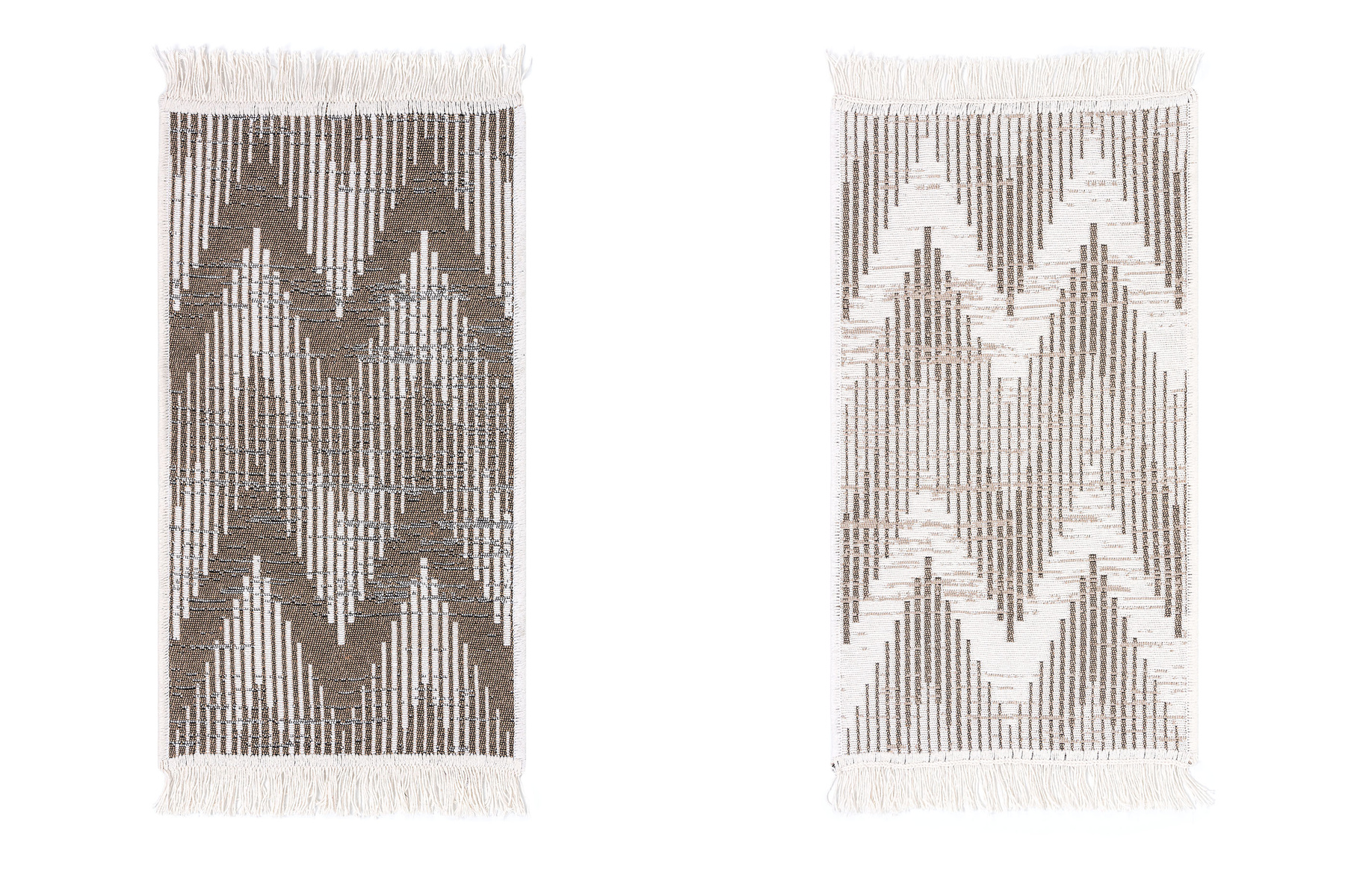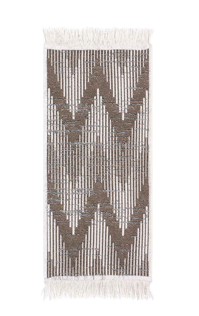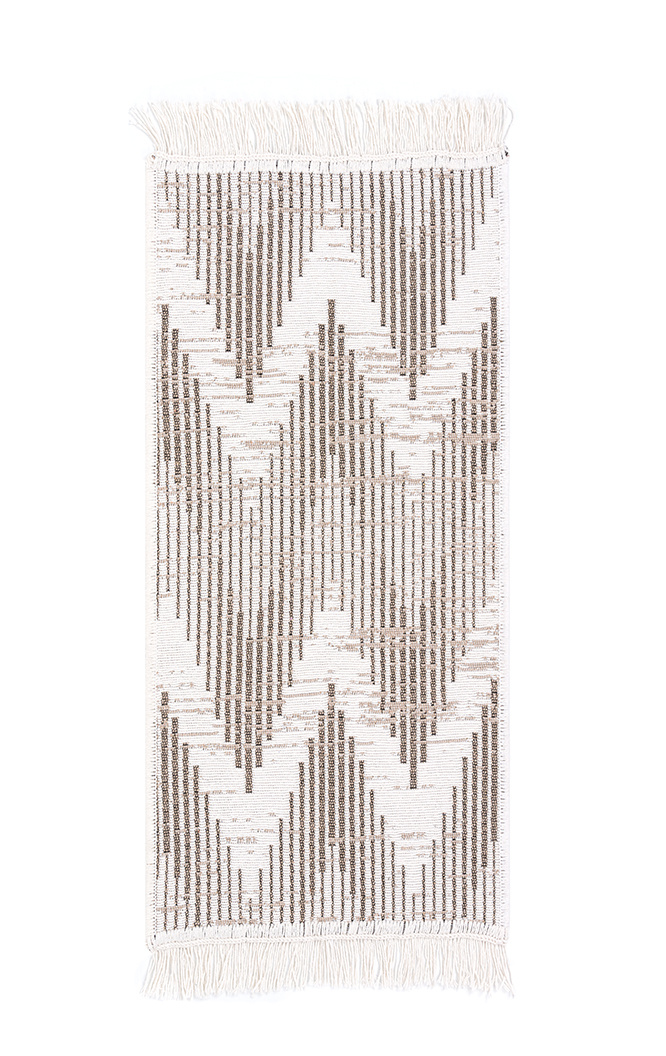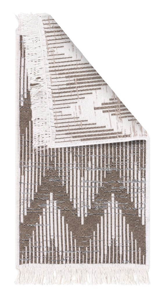 - Dwustronny, mięciutki dywanik - chodniczek Orient z geometrycznym wzorem w odcieniach kremu i brązu, z delikatnymi frędzelkami.
