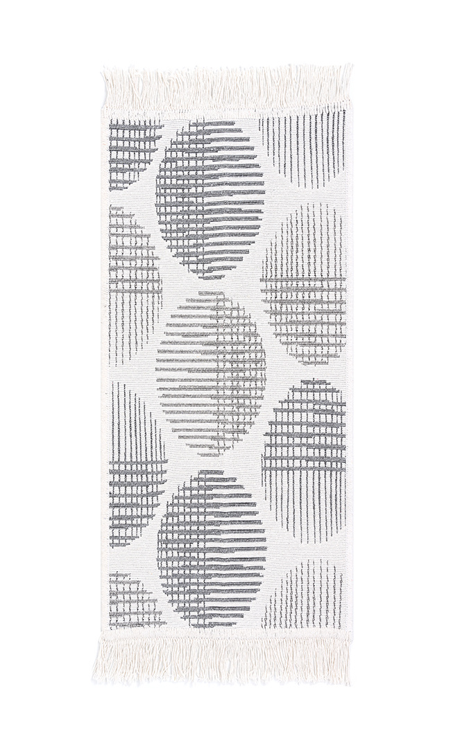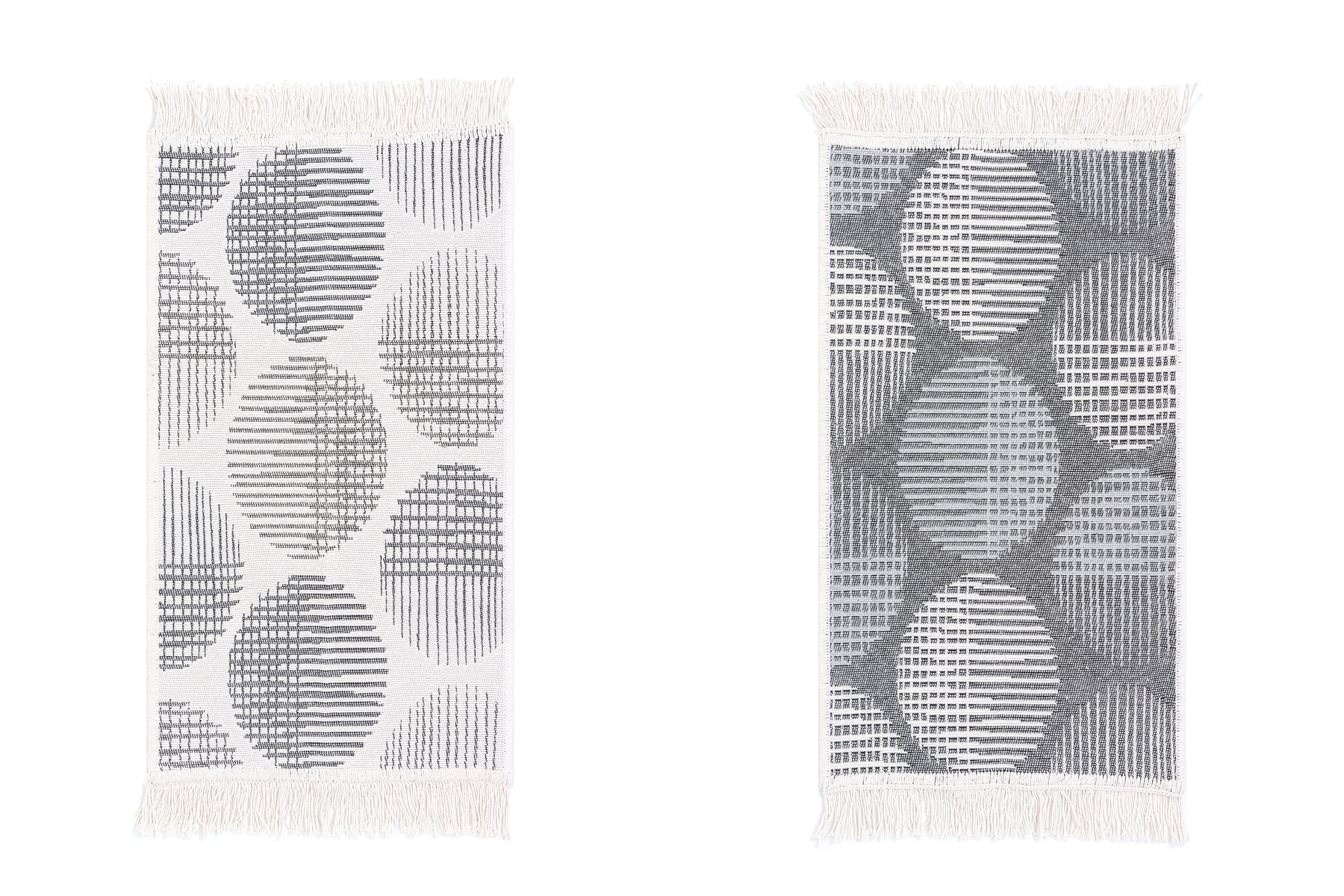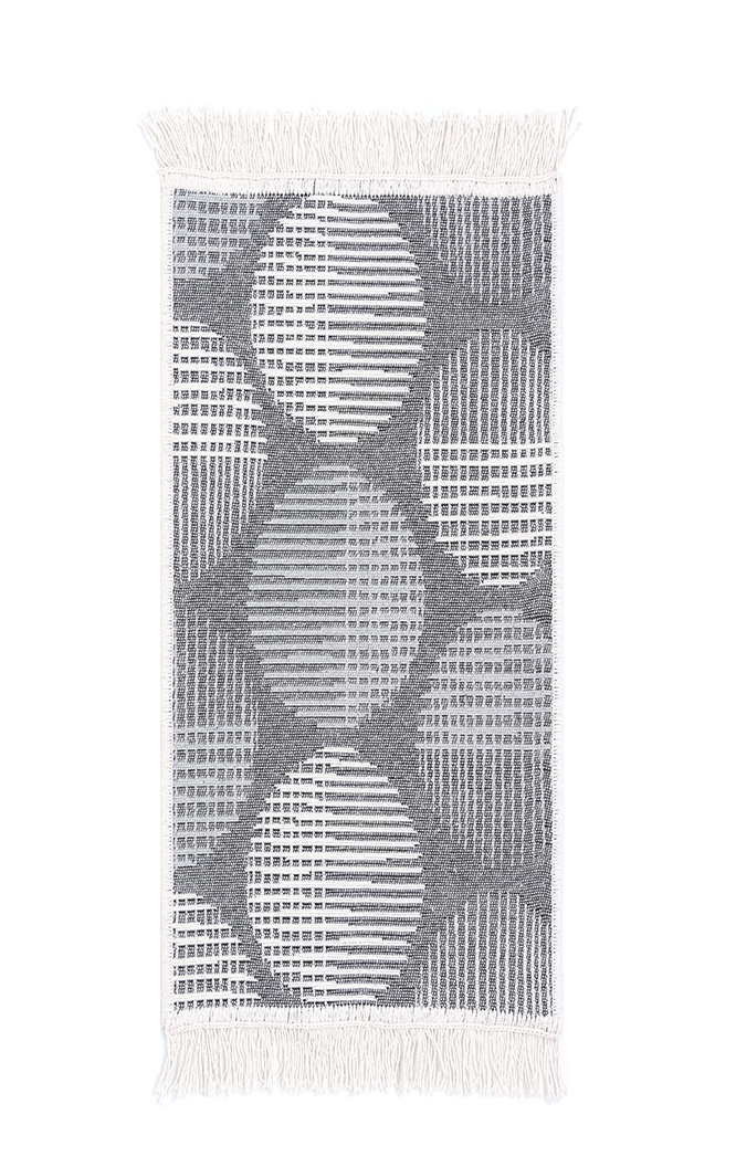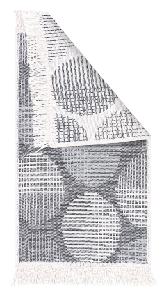 - Dwustronny, mięciutki dywanik - chodniczek Orient z geometrycznym wzorem w koła w odcieniach szarości z delikatnymi frędzelkami.