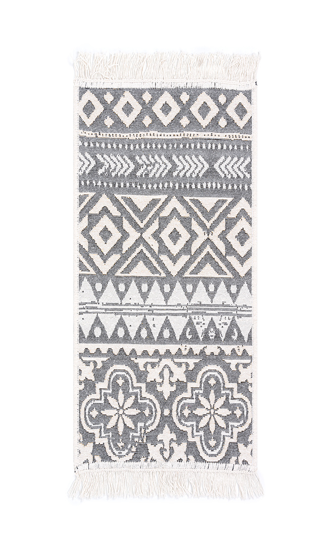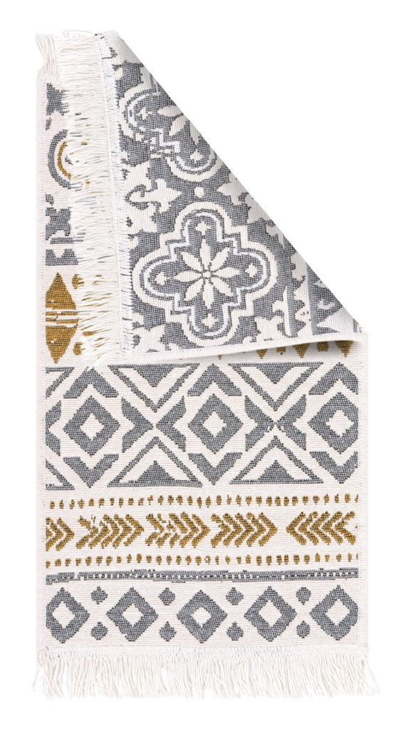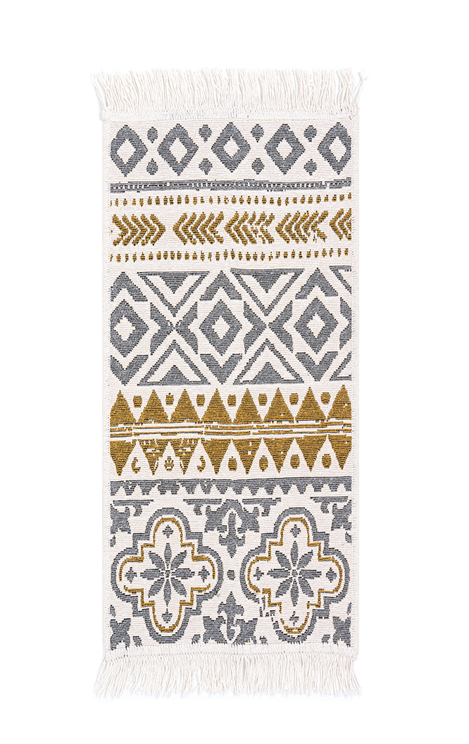 - Dwustronny, mięciutki dywanik - chodniczek Orient z geometrycznym wzorem w odcieniach żółtego, kremu i szarości, z delikatnymi frędzelkami.