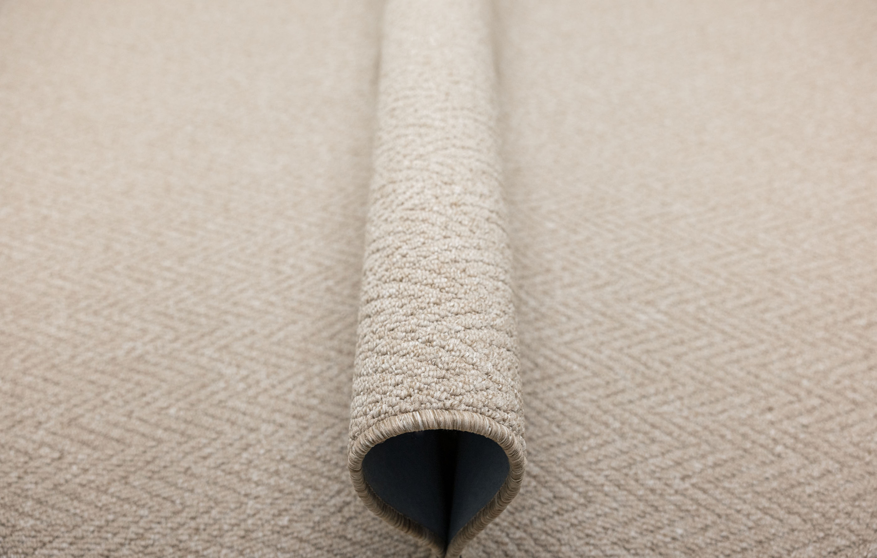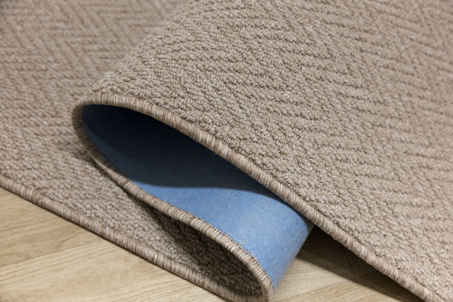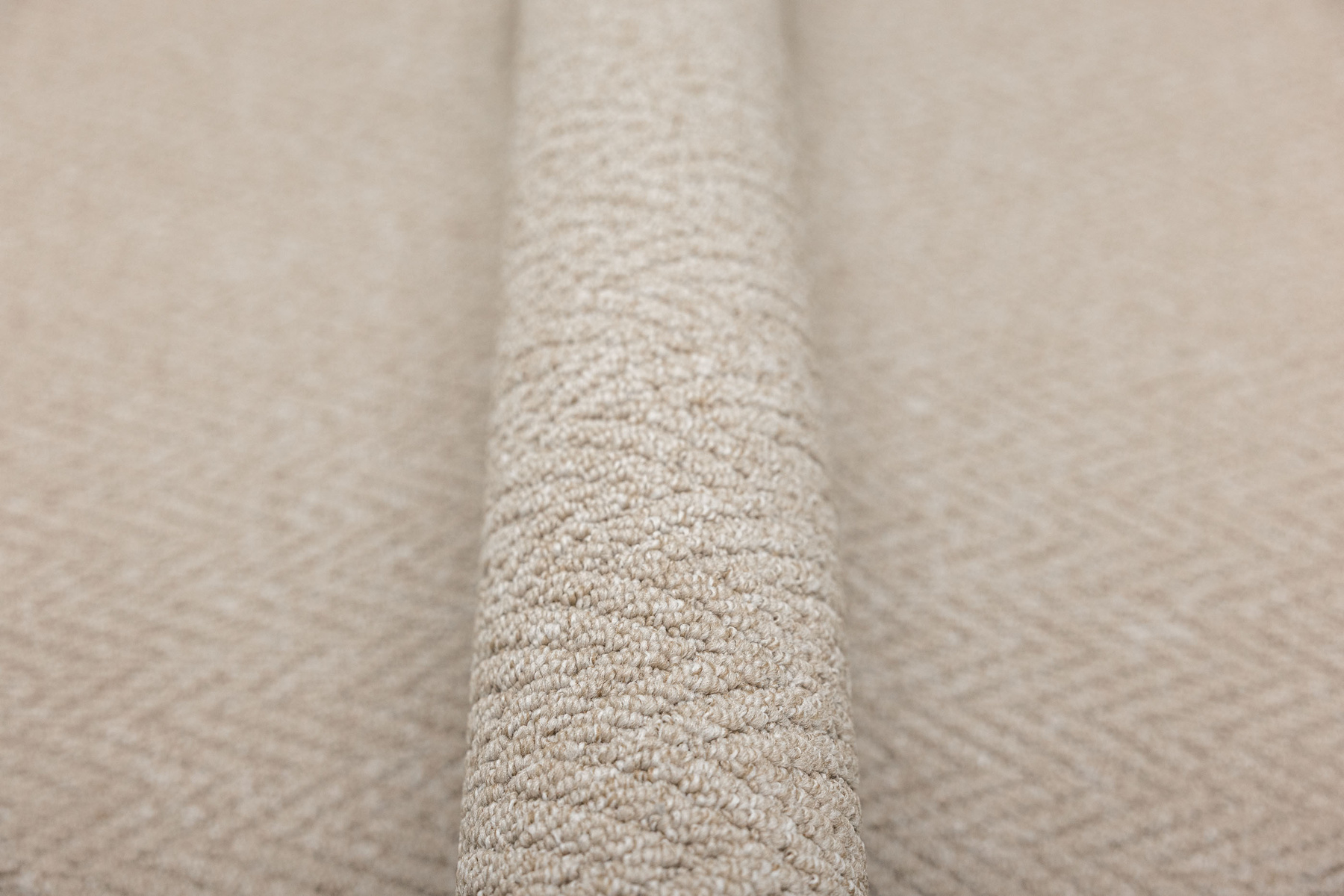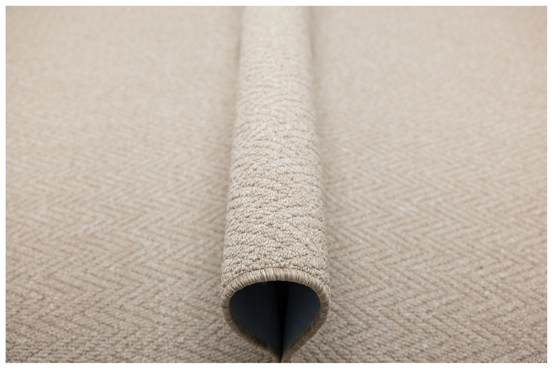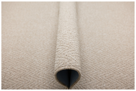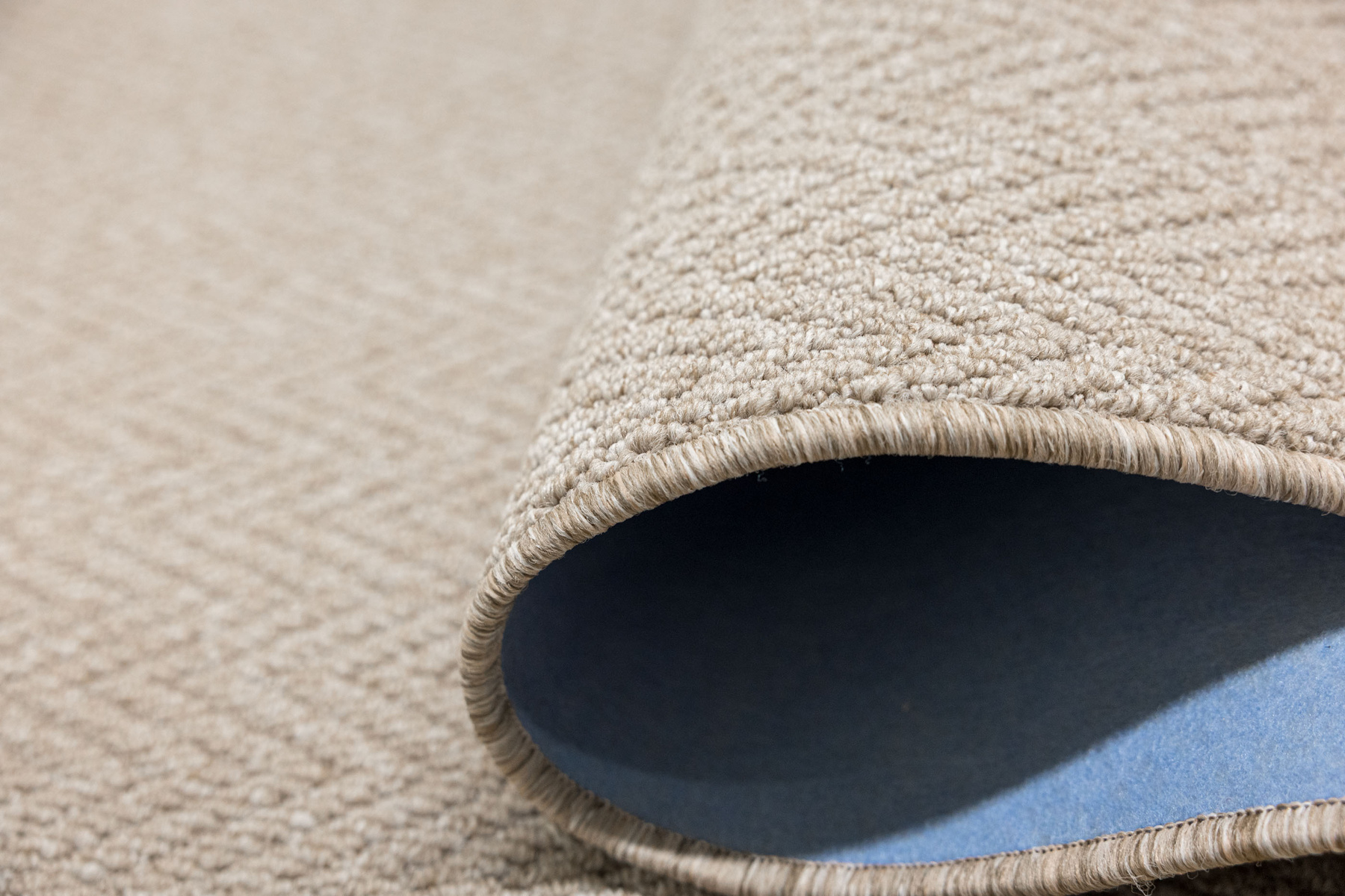 • Dywan wykonany z wykładziny pętelkowej Havanna z unikalnym, oryginalnym grubym splotem w jodełkę w melanżu odcieni beżu i kremu ze spodem wykończonym niebieskim filcem.