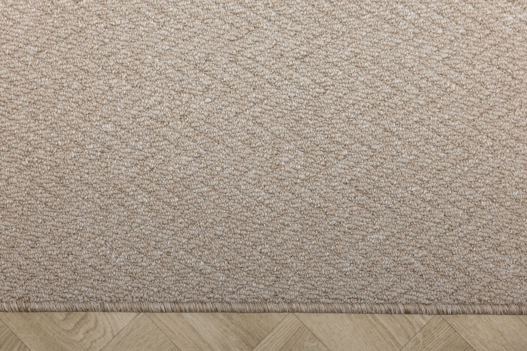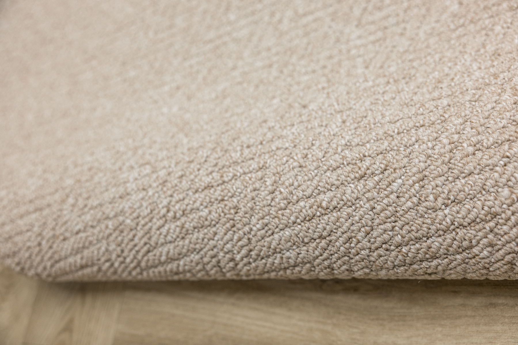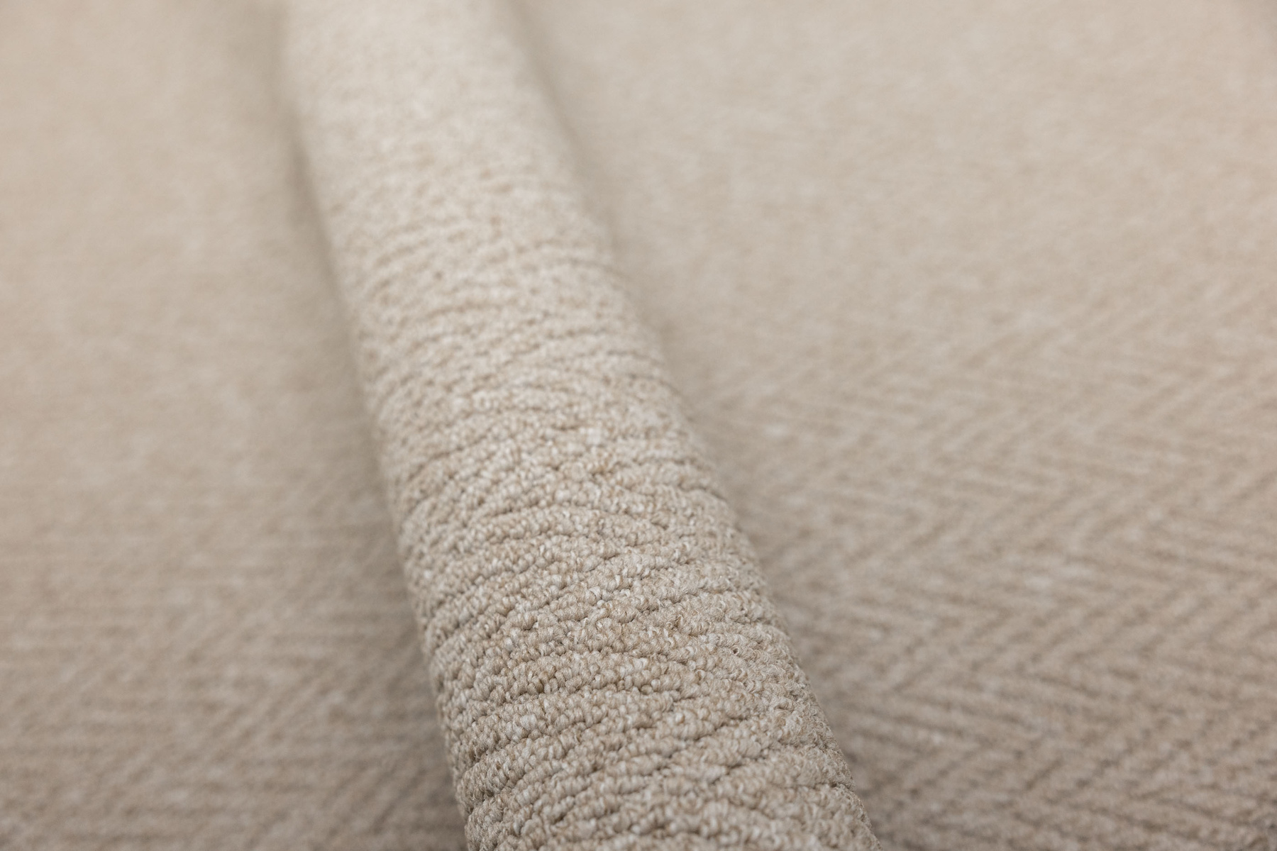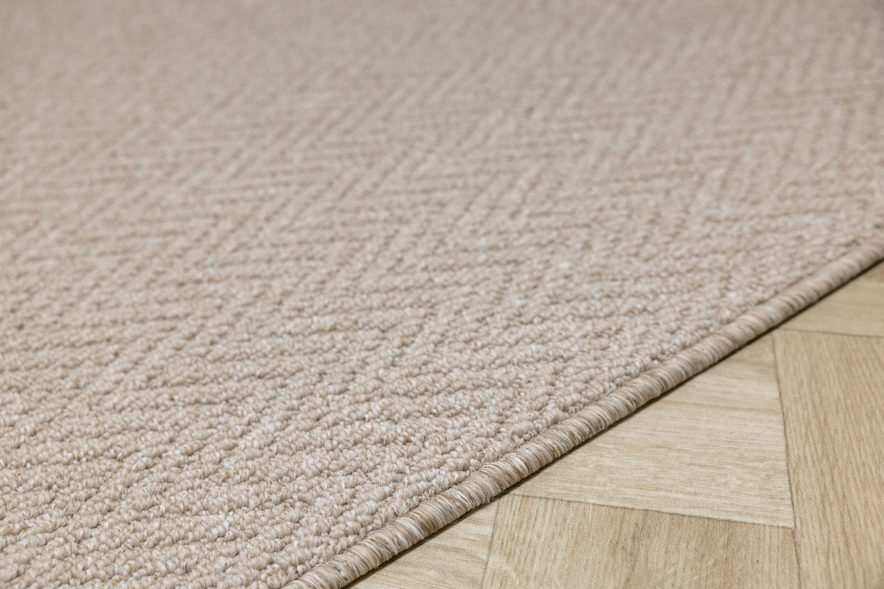 • Dywan wykonany z wykładziny pętelkowej Havanna z unikalnym, oryginalnym grubym splotem w jodełkę w melanżu odcieni beżu i kremu ze spodem wykończonym niebieskim filcem.