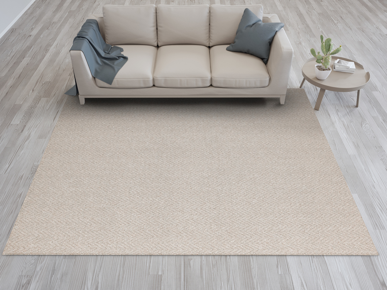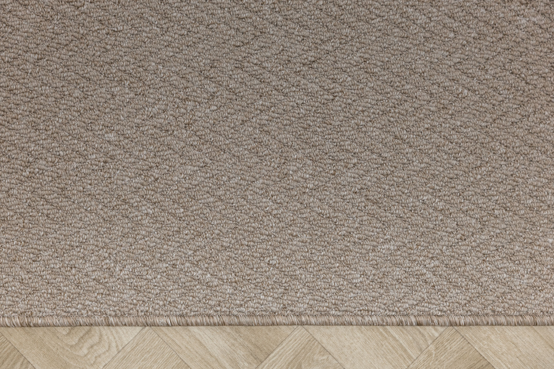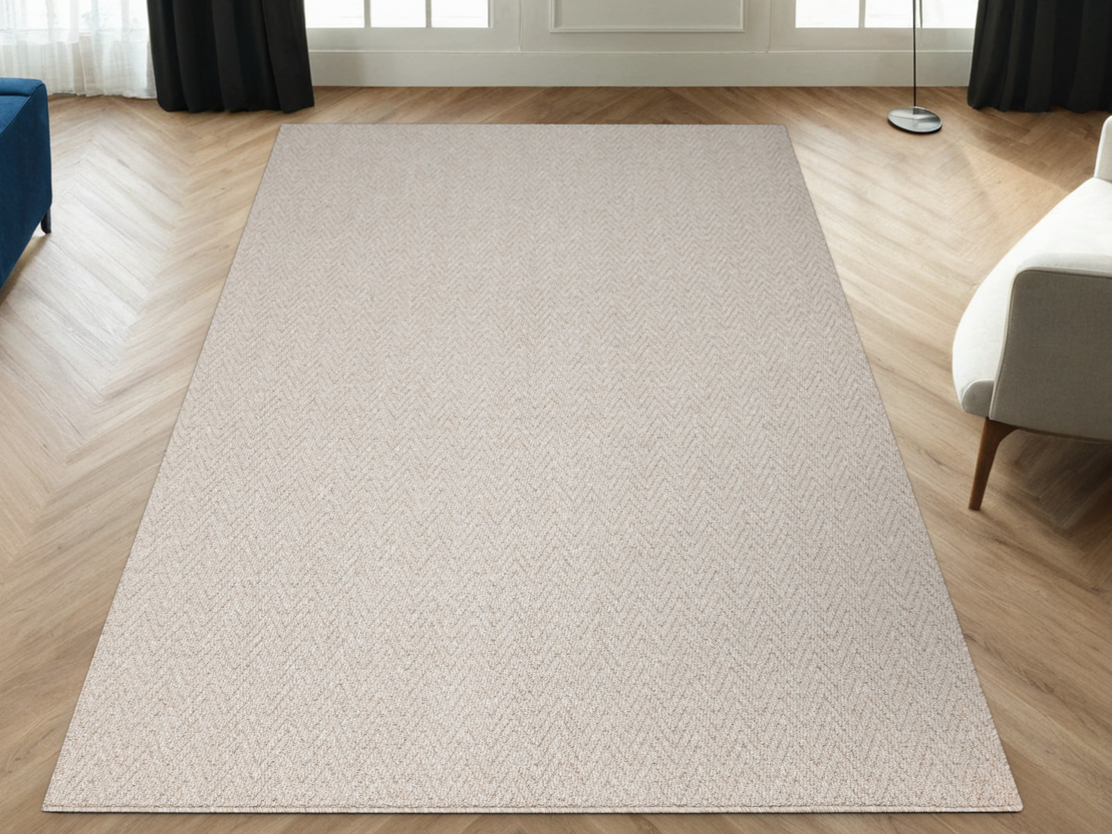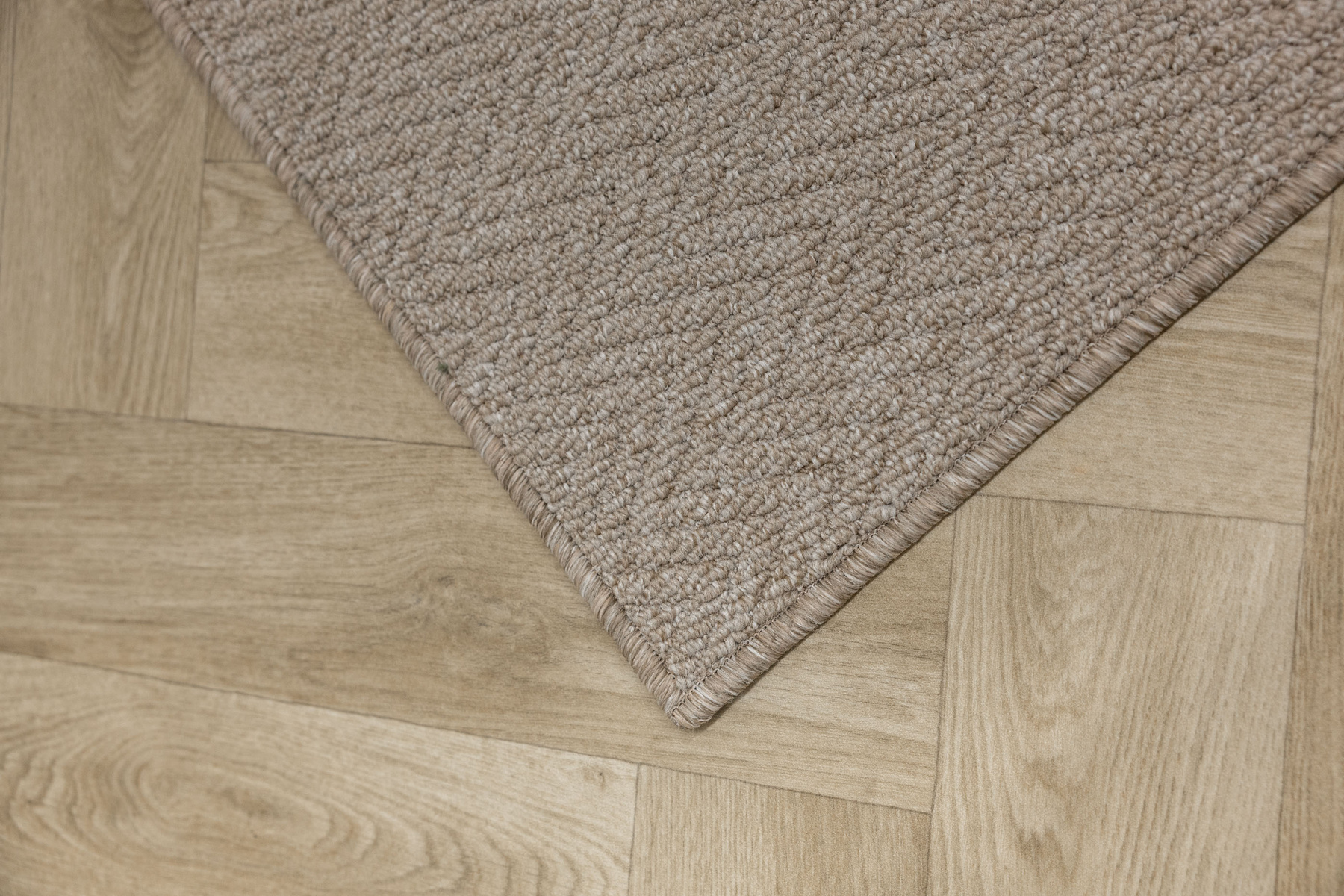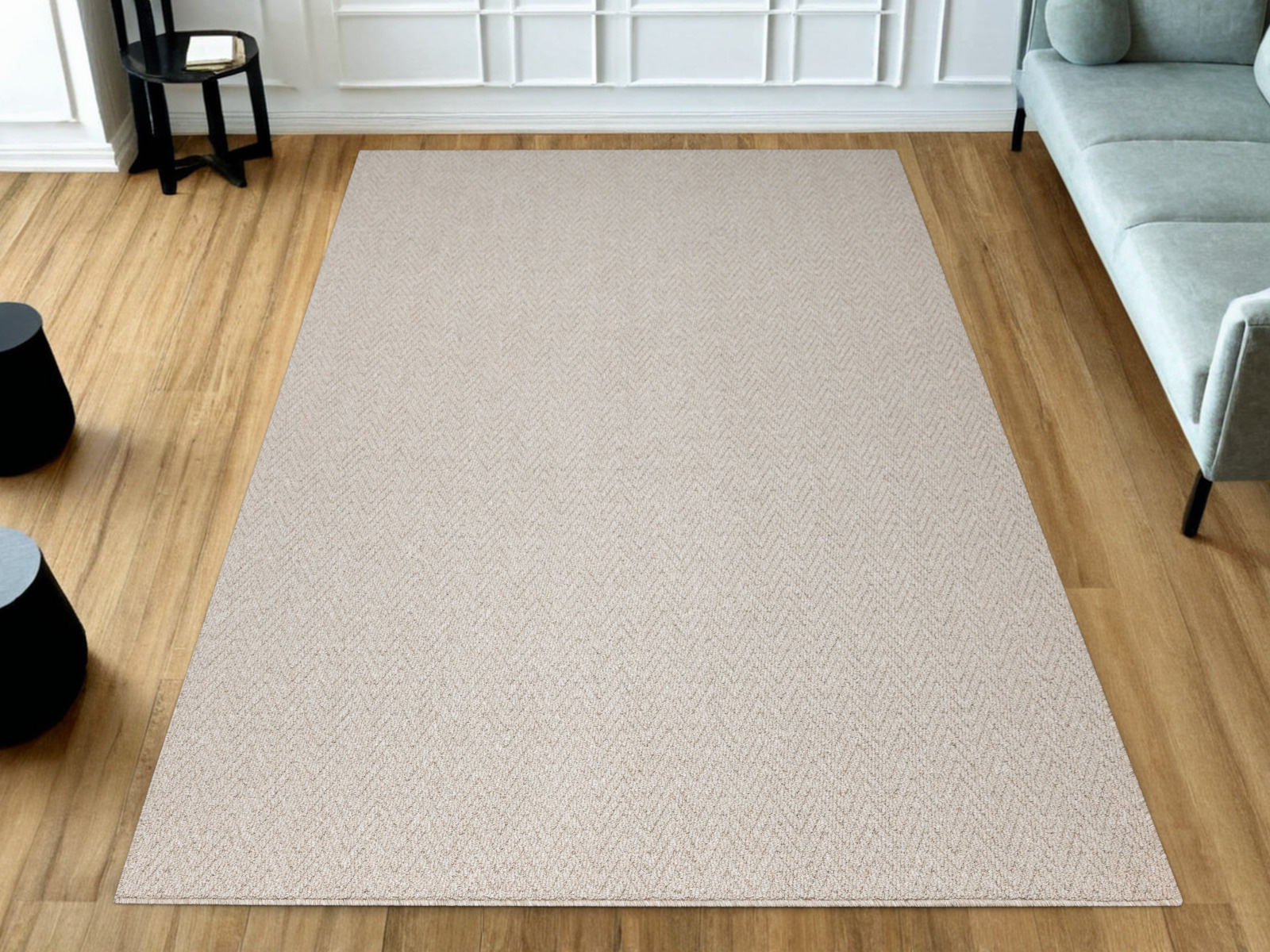 • Dywan wykonany z wykładziny pętelkowej Havanna z unikalnym, oryginalnym grubym splotem w jodełkę w melanżu odcieni beżu i kremu ze spodem wykończonym niebieskim filcem.