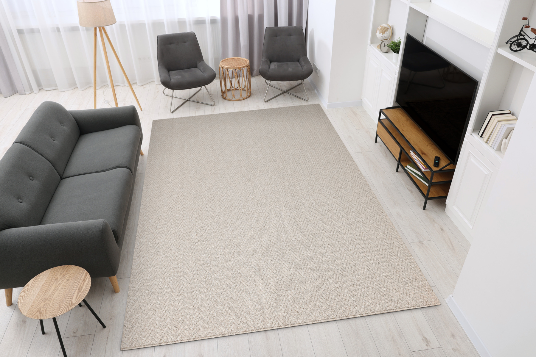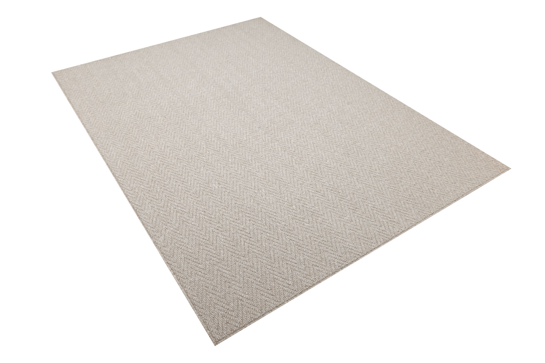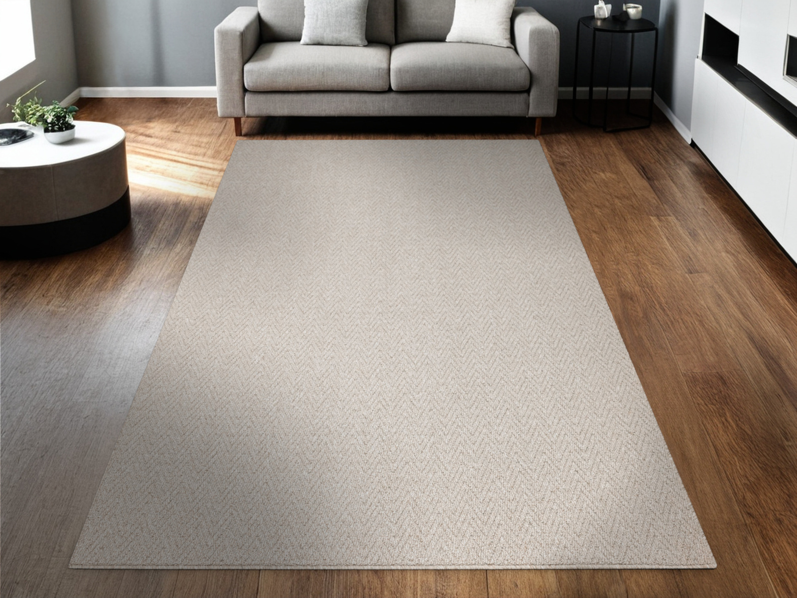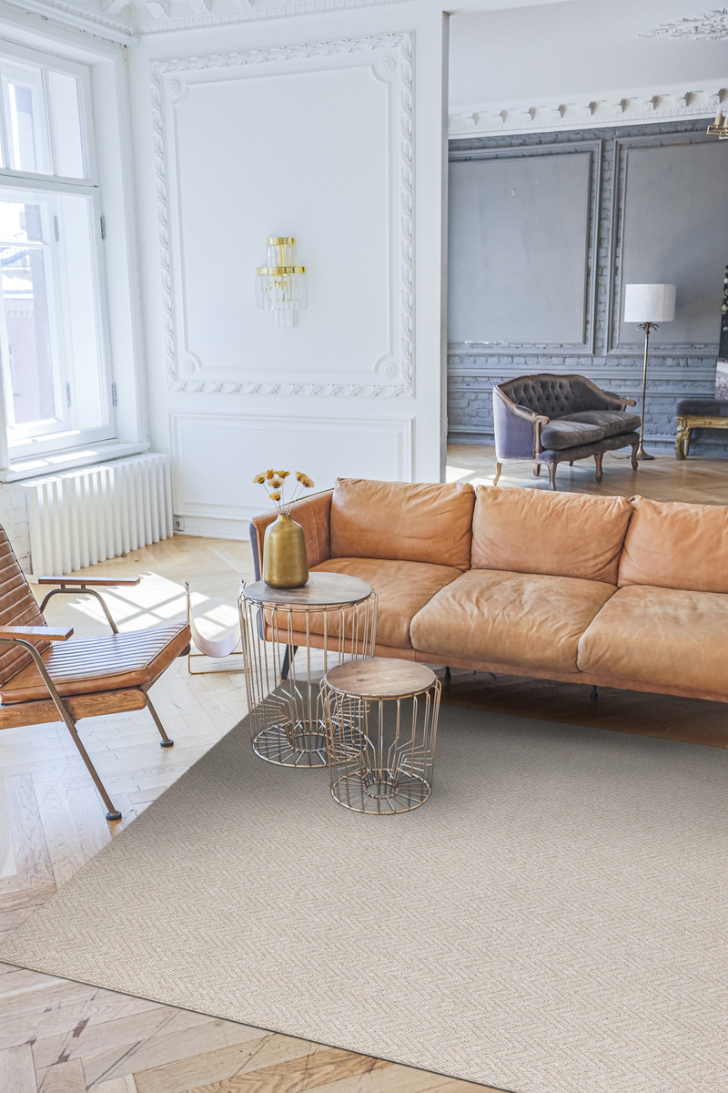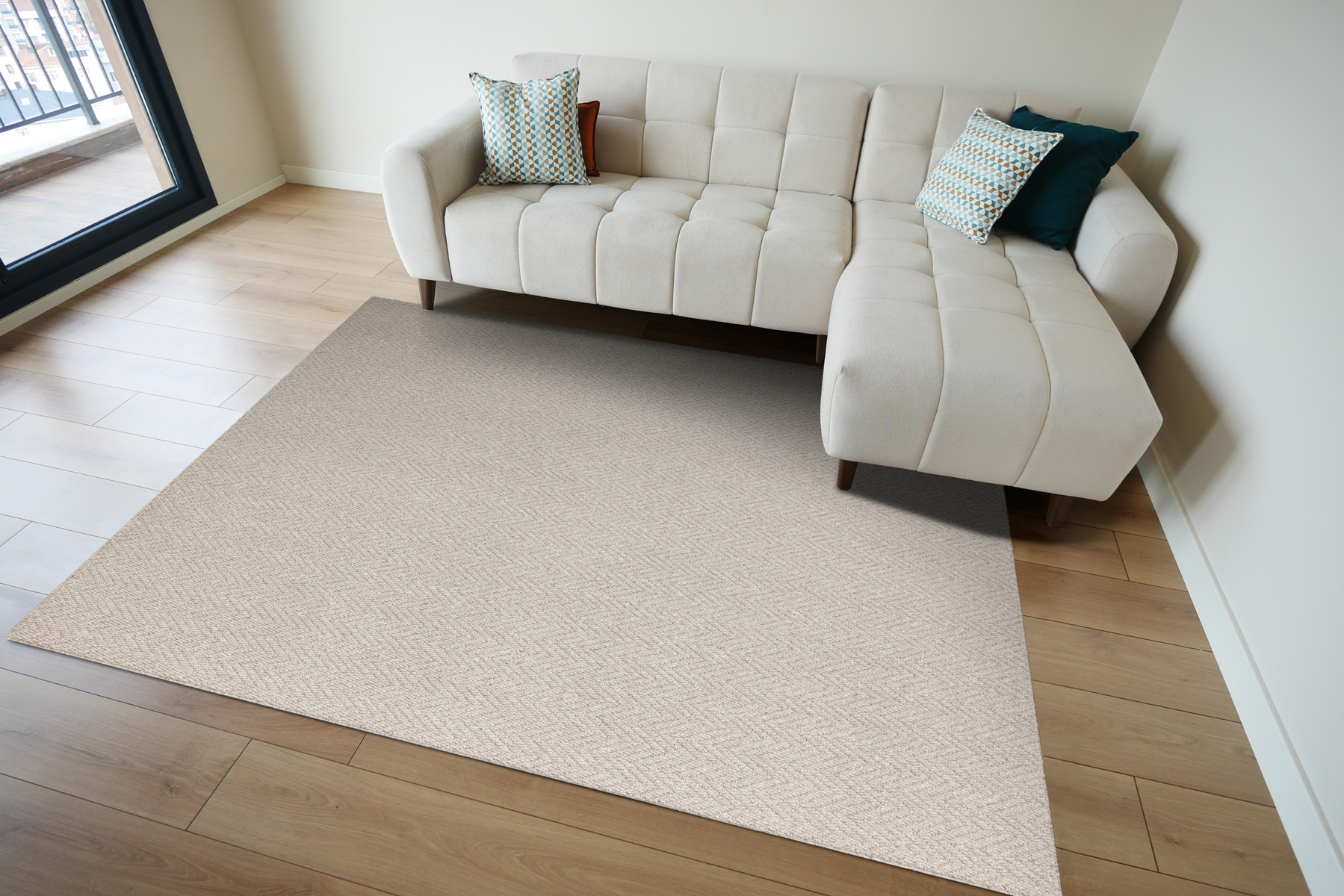 • Dywan wykonany z wykładziny pętelkowej Havanna z unikalnym, oryginalnym grubym splotem w jodełkę w melanżu odcieni beżu i kremu ze spodem wykończonym niebieskim filcem.