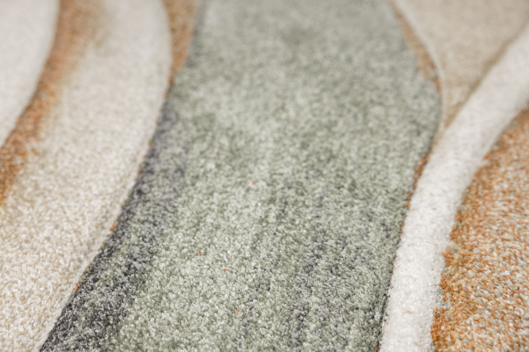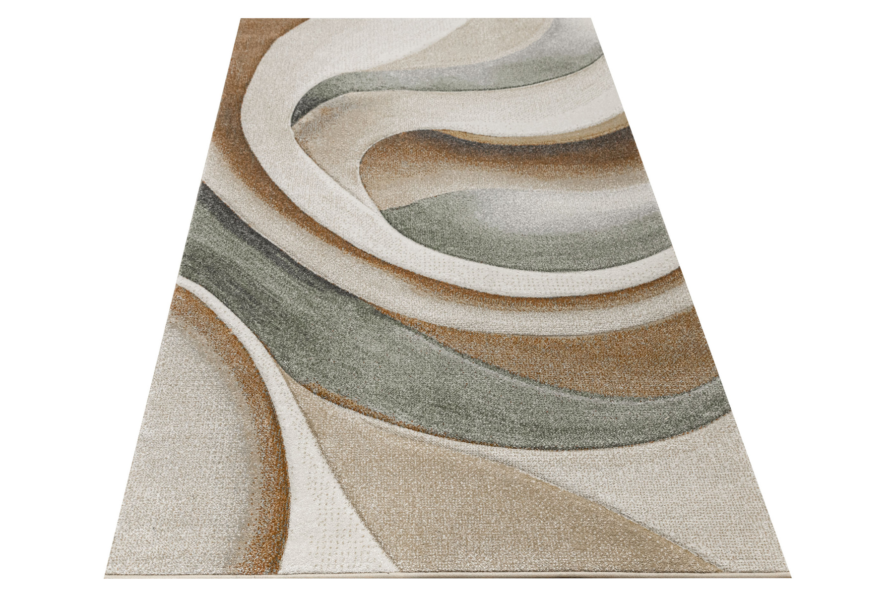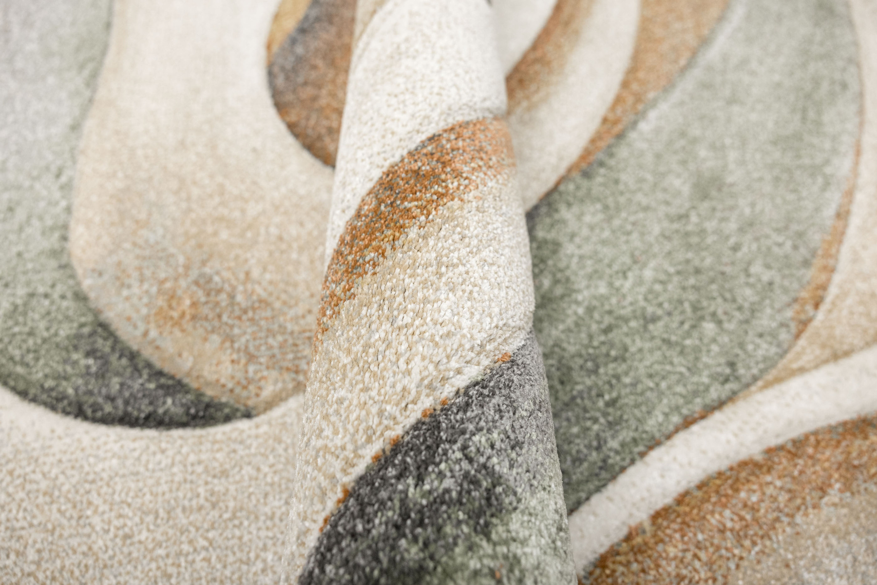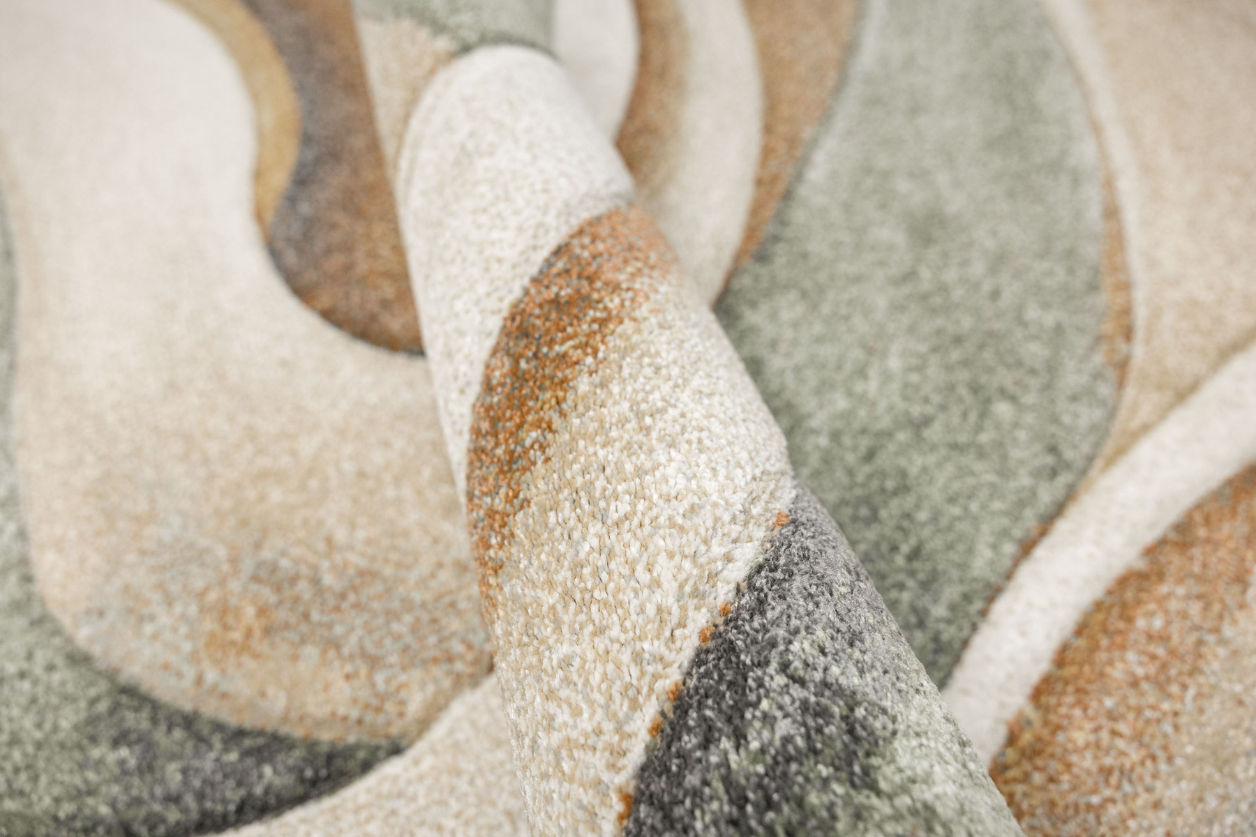 • Miękki dywan Agent o gęstym, lśniącym fryzowanym runie ozdobionym nowoczesnym wzorem abstrakcyjnym w fale w odcieniach beżu, miedzianego, oliwkowej zieleni z dodatkiem szarości i kremu.