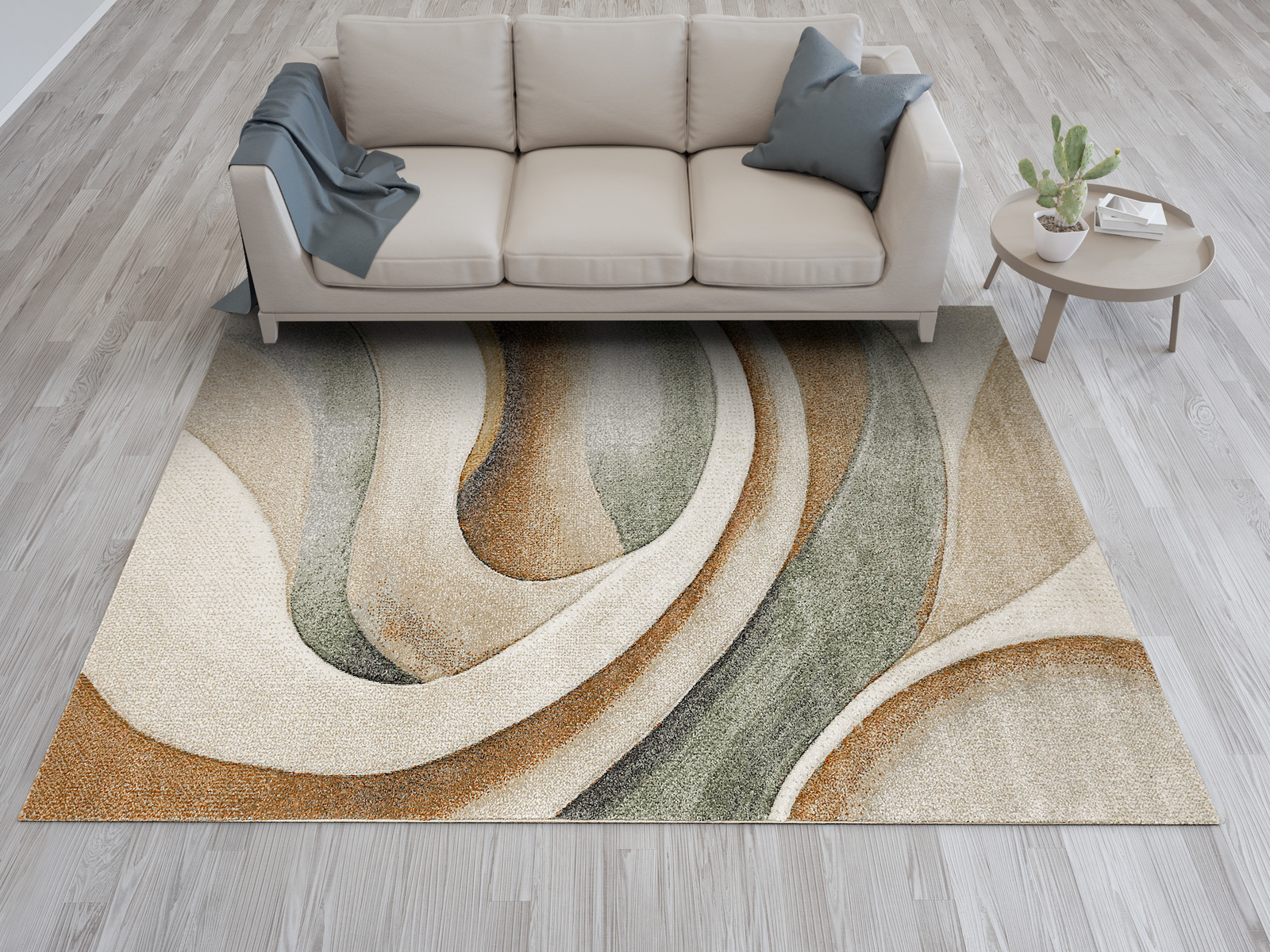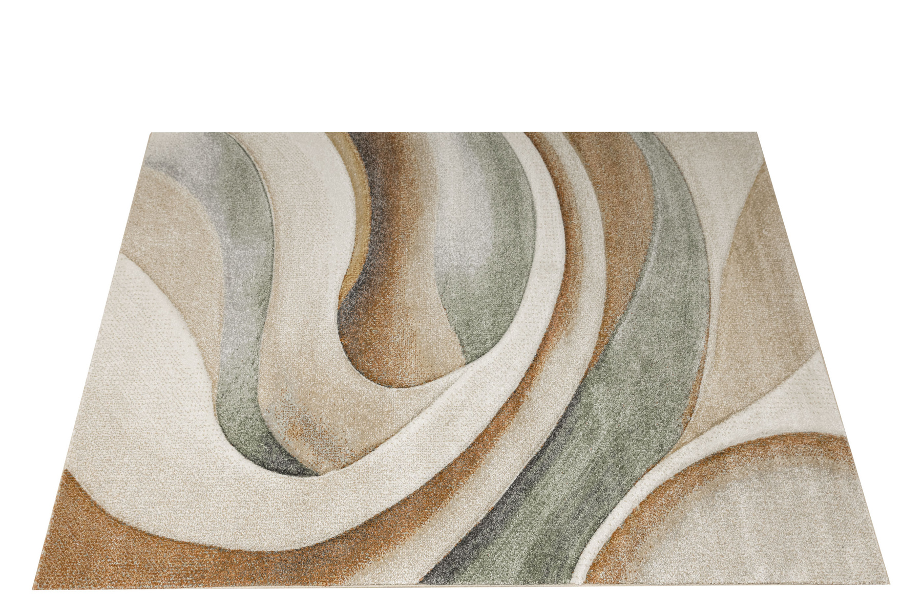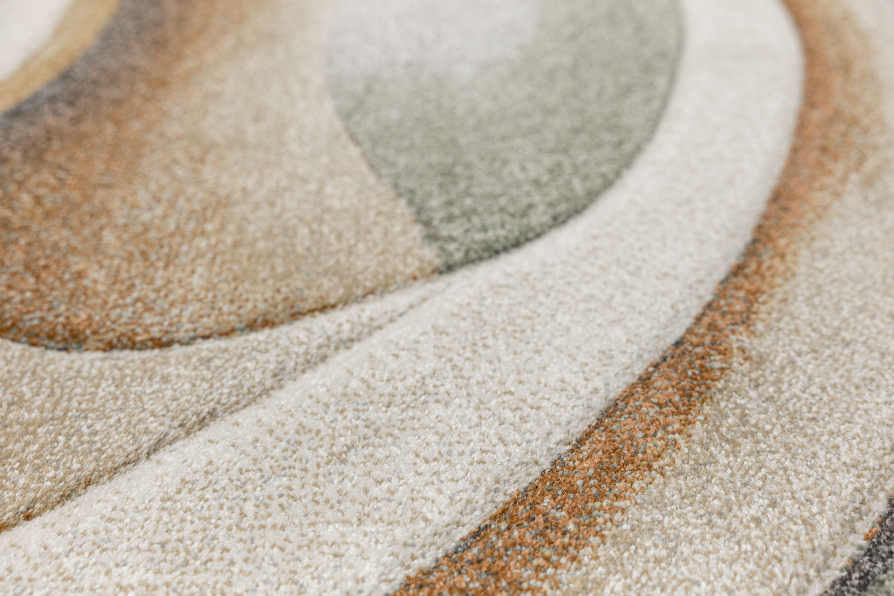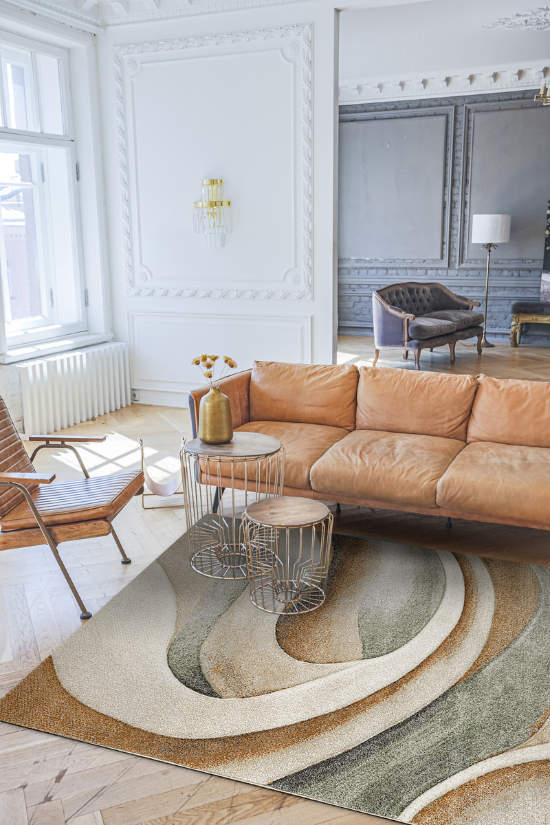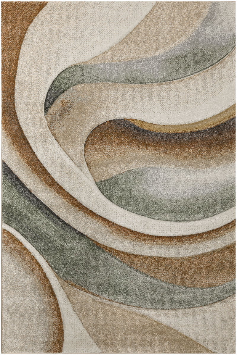 • Miękki dywan Agent o gęstym, lśniącym fryzowanym runie ozdobionym nowoczesnym wzorem abstrakcyjnym w fale w odcieniach beżu, miedzianego, oliwkowej zieleni z dodatkiem szarości i kremu.