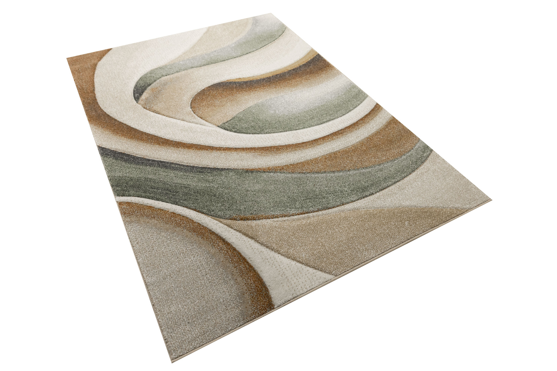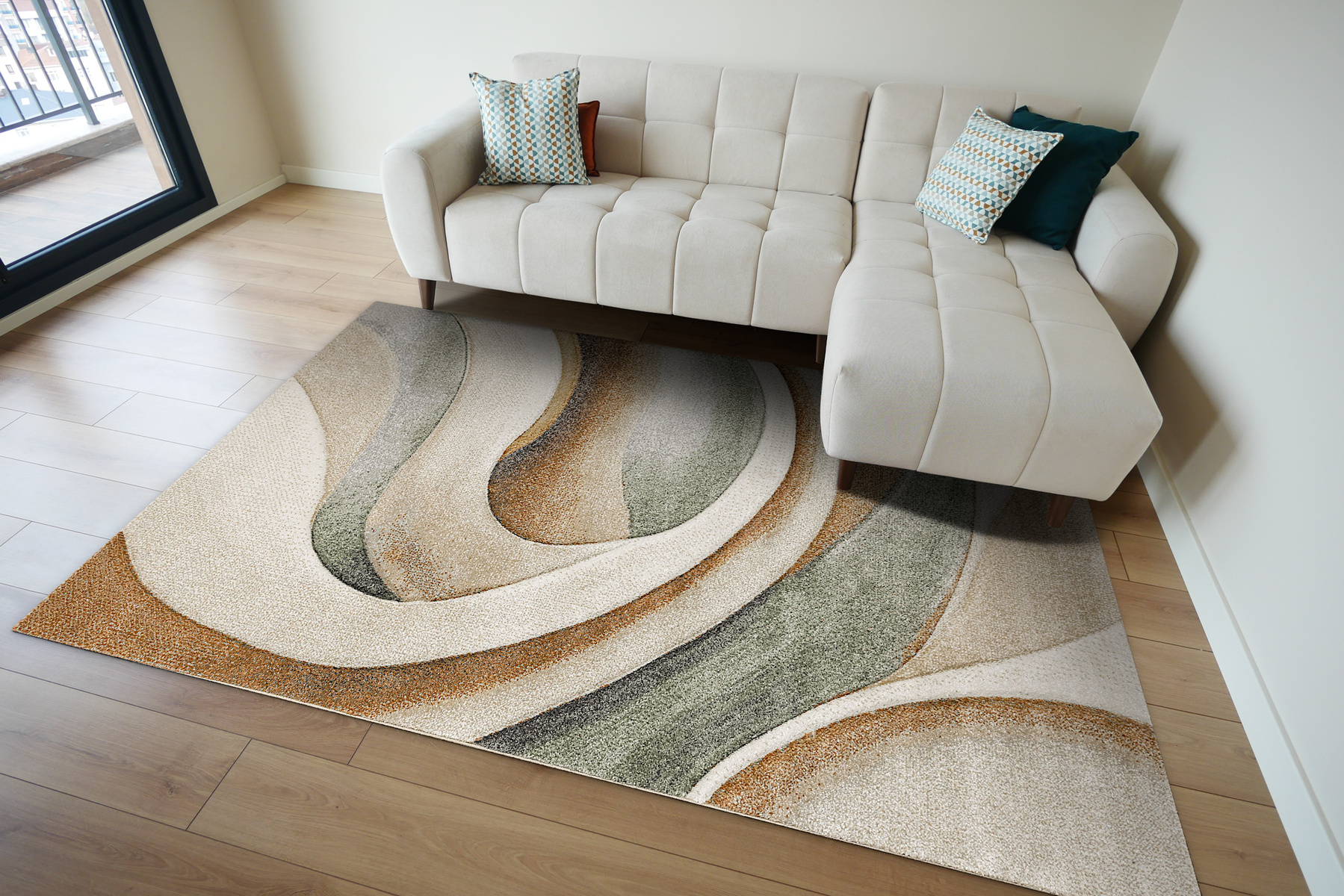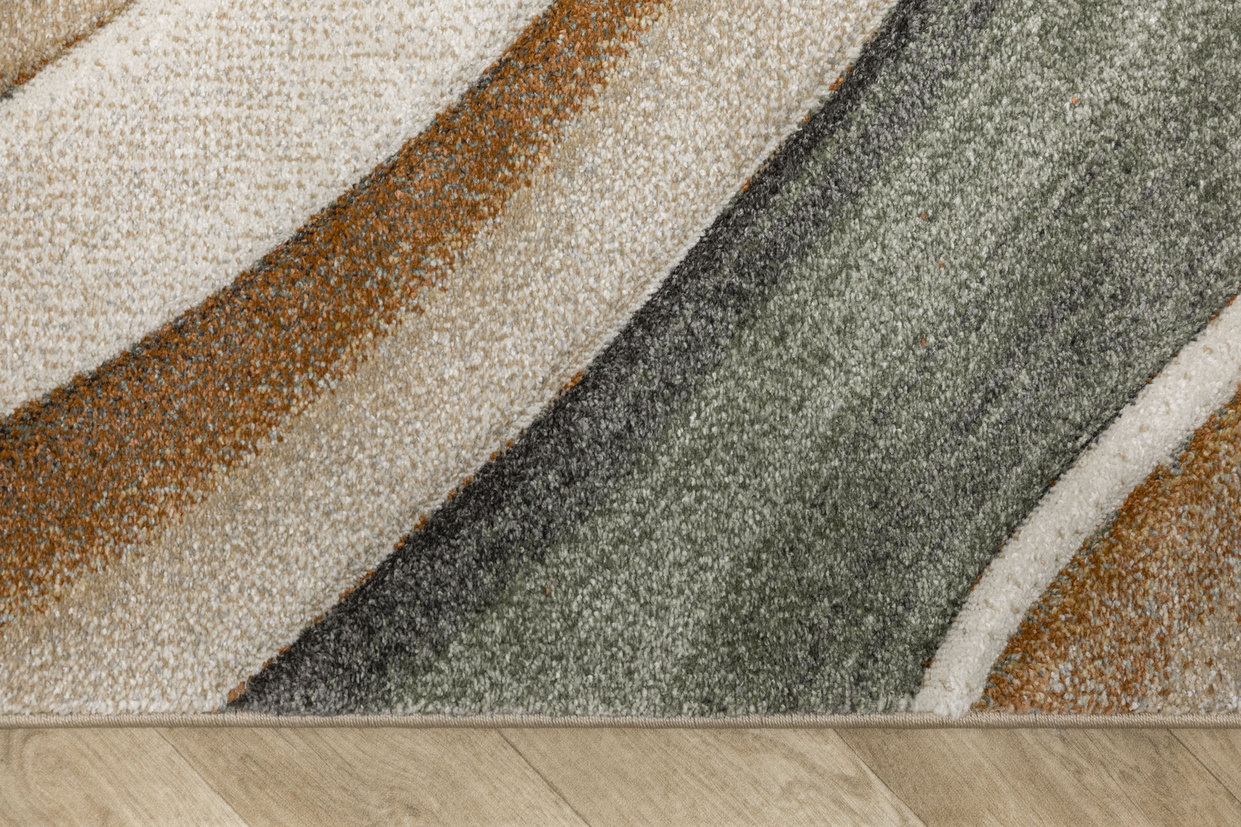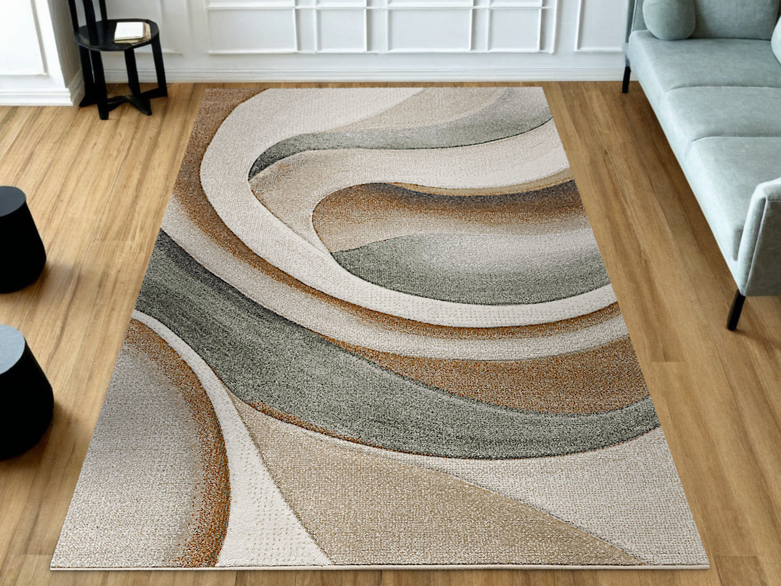 • Miękki dywan Agent o gęstym, lśniącym fryzowanym runie ozdobionym nowoczesnym wzorem abstrakcyjnym w fale w odcieniach beżu, miedzianego, oliwkowej zieleni z dodatkiem szarości i kremu.