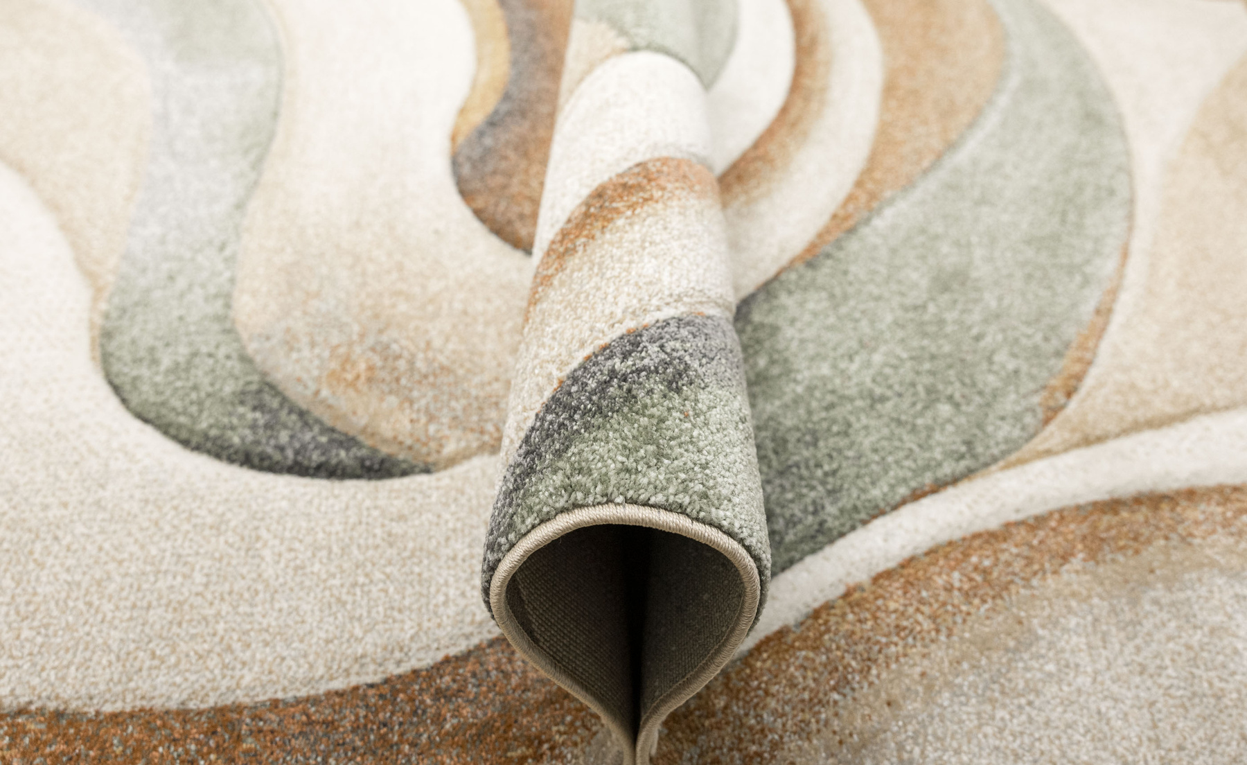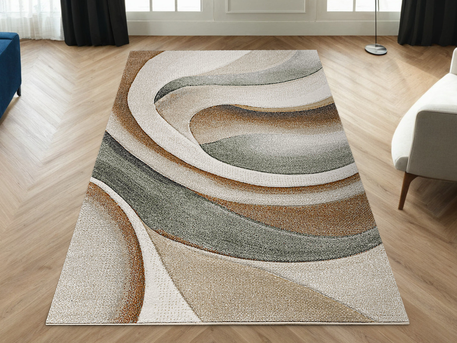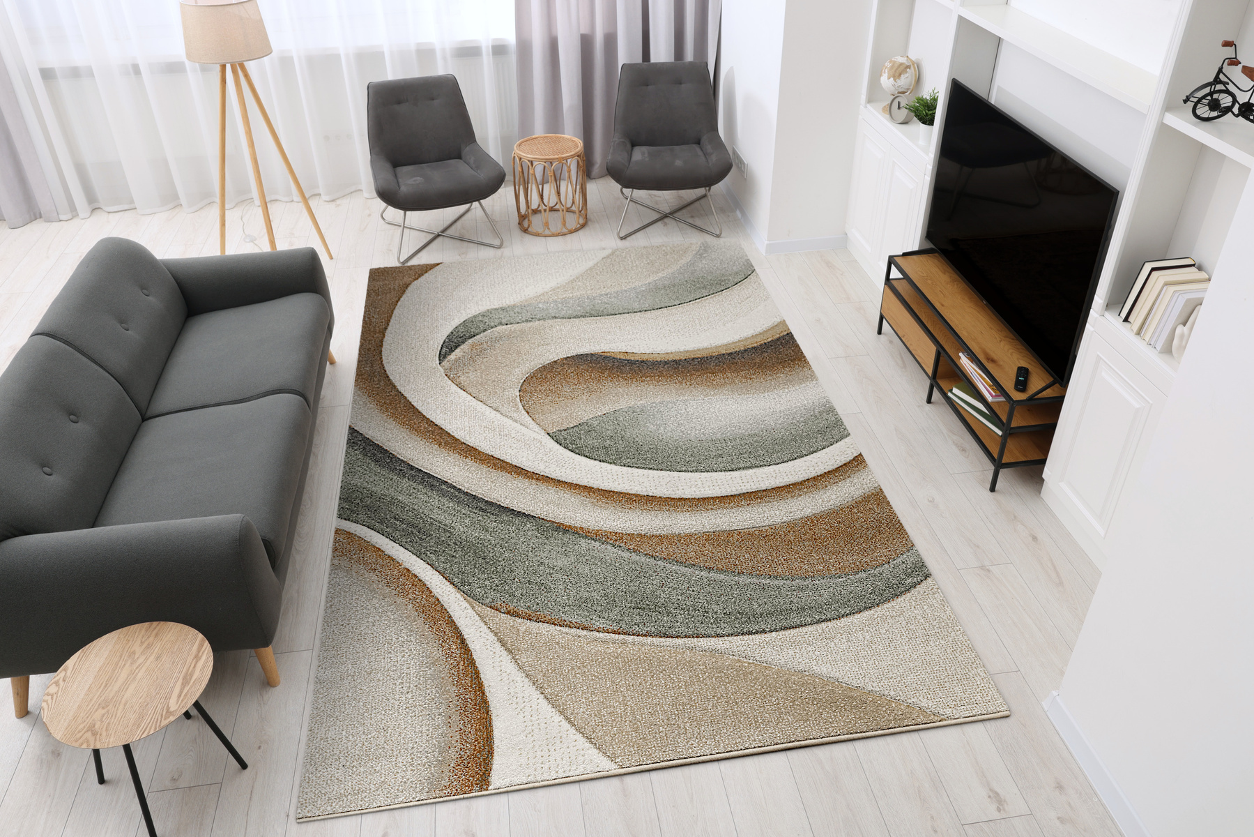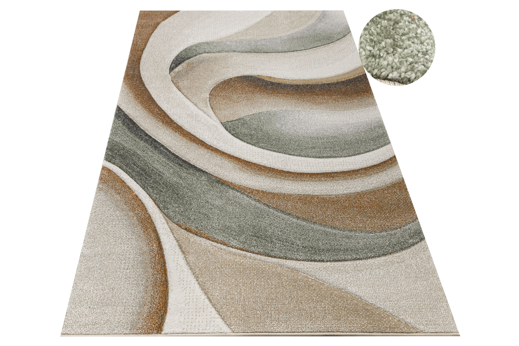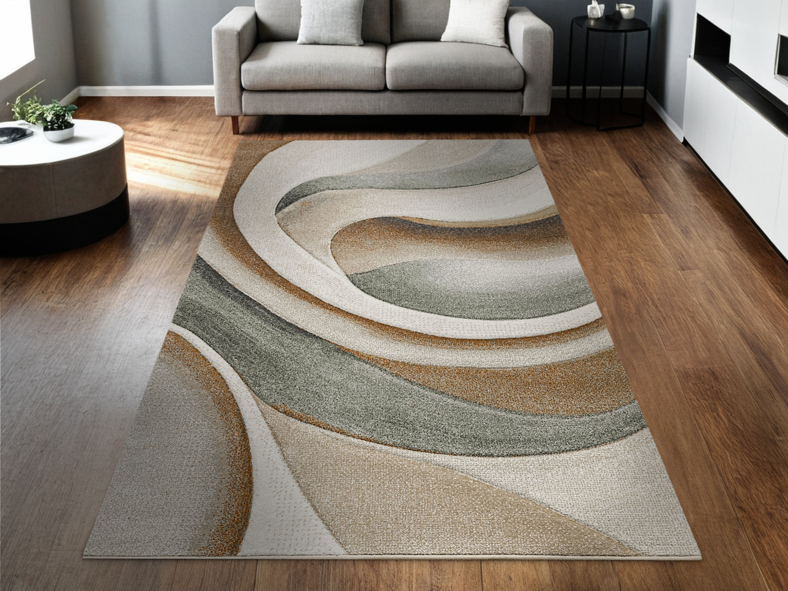 • Miękki dywan Agent o gęstym, lśniącym fryzowanym runie ozdobionym nowoczesnym wzorem abstrakcyjnym w fale w odcieniach beżu, miedzianego, oliwkowej zieleni z dodatkiem szarości i kremu.