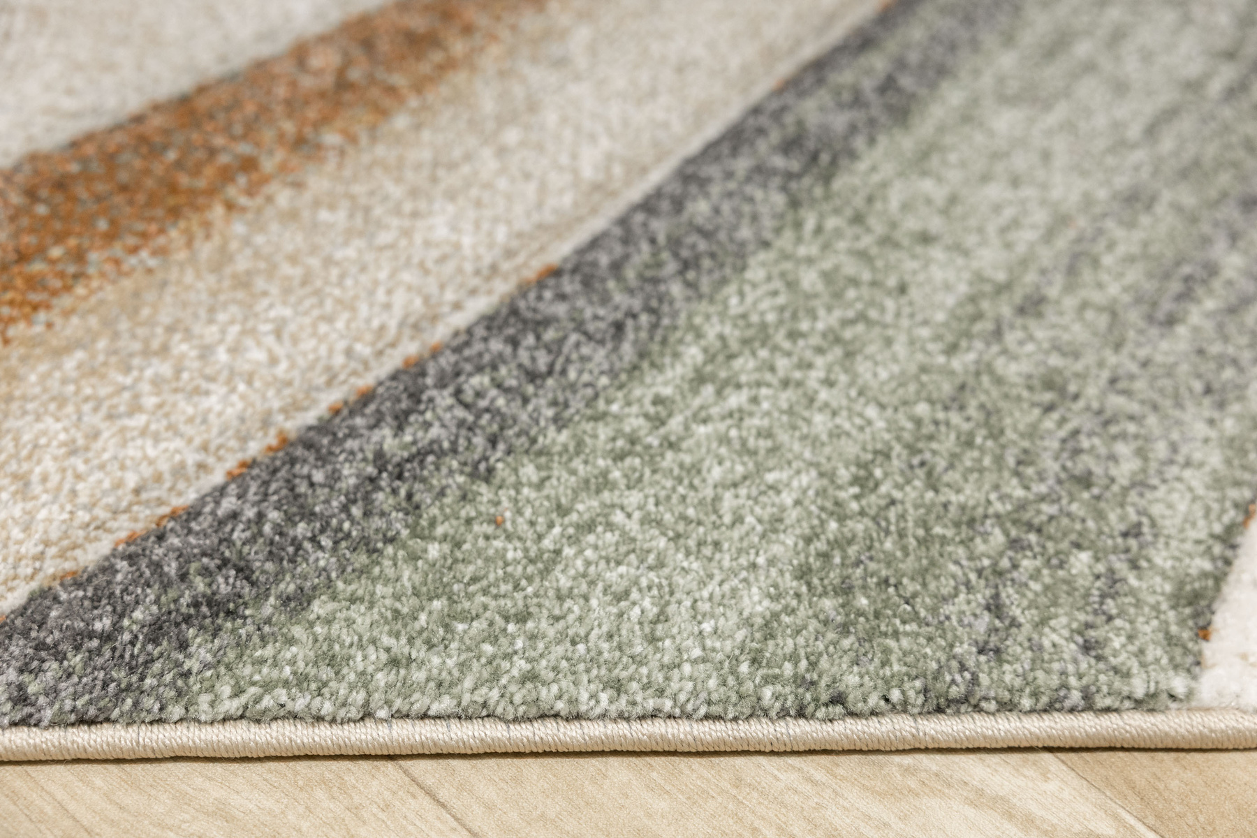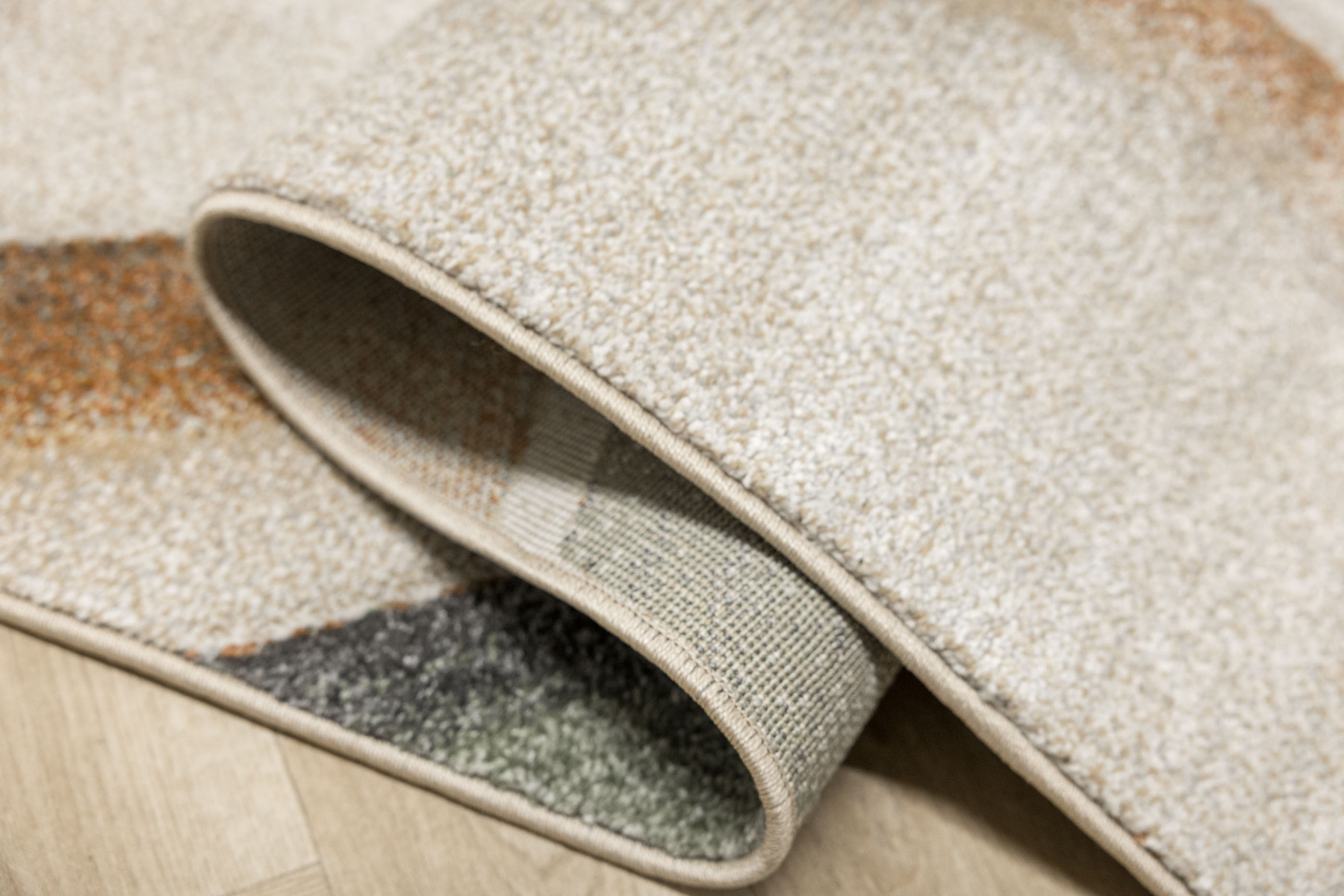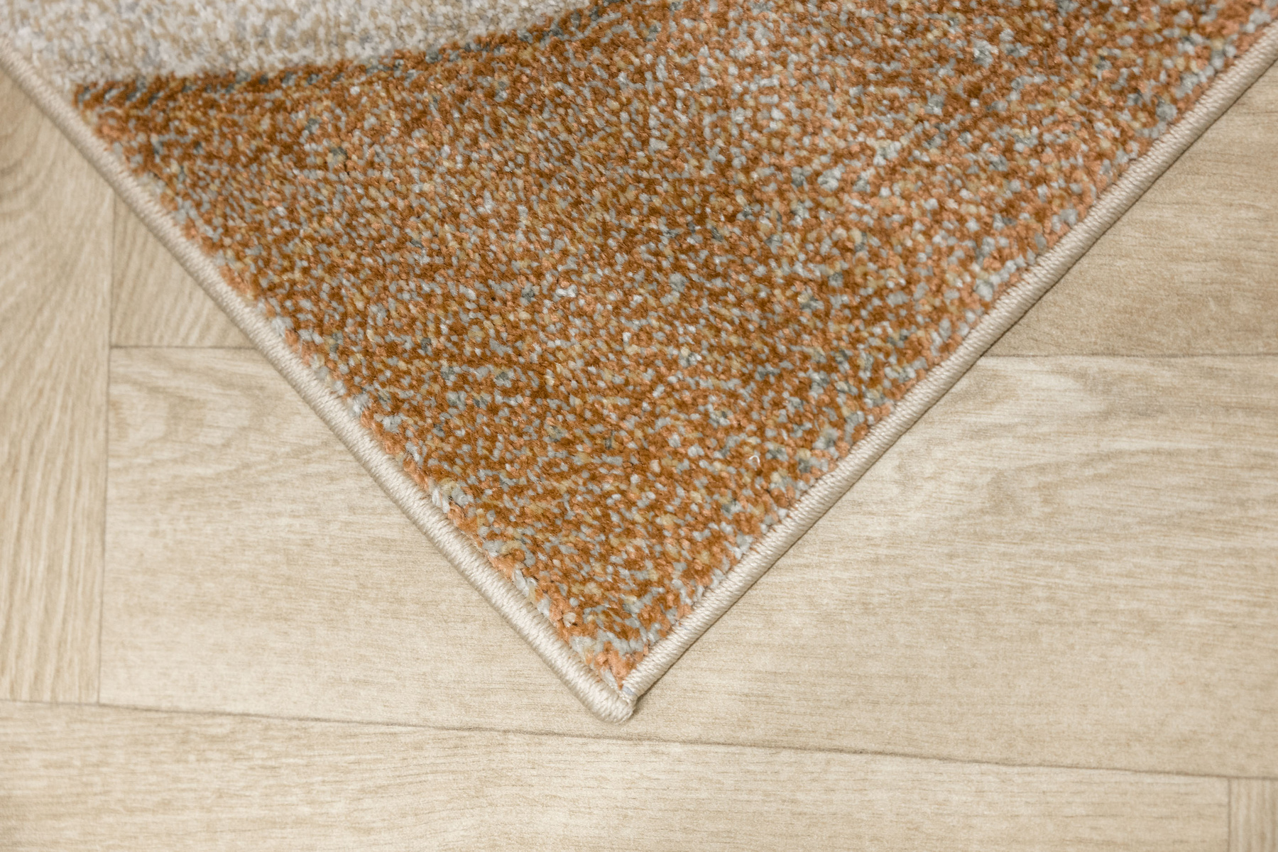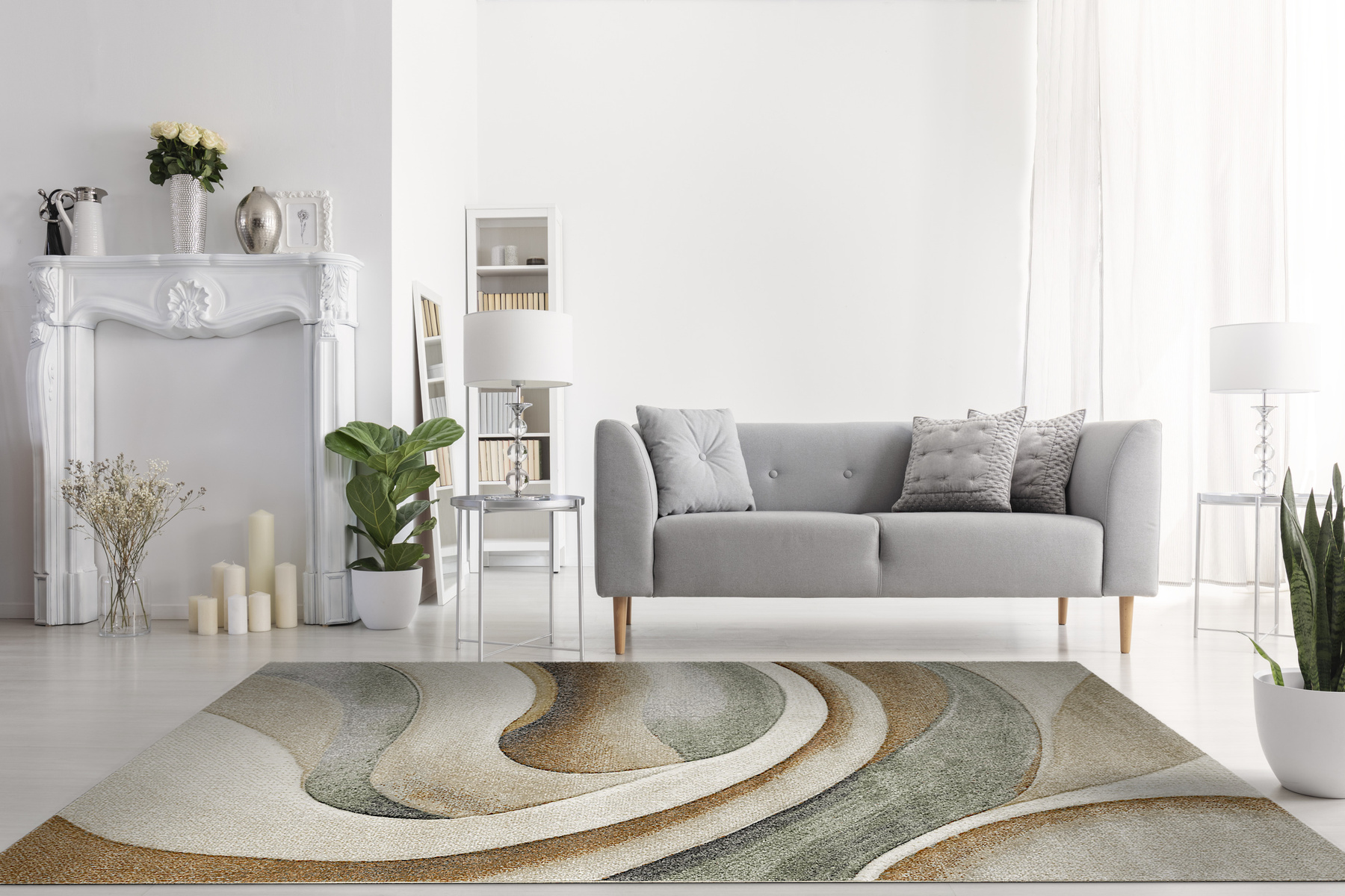 • Miękki dywan Agent o gęstym, lśniącym fryzowanym runie ozdobionym nowoczesnym wzorem abstrakcyjnym w fale w odcieniach beżu, miedzianego, oliwkowej zieleni z dodatkiem szarości i kremu.