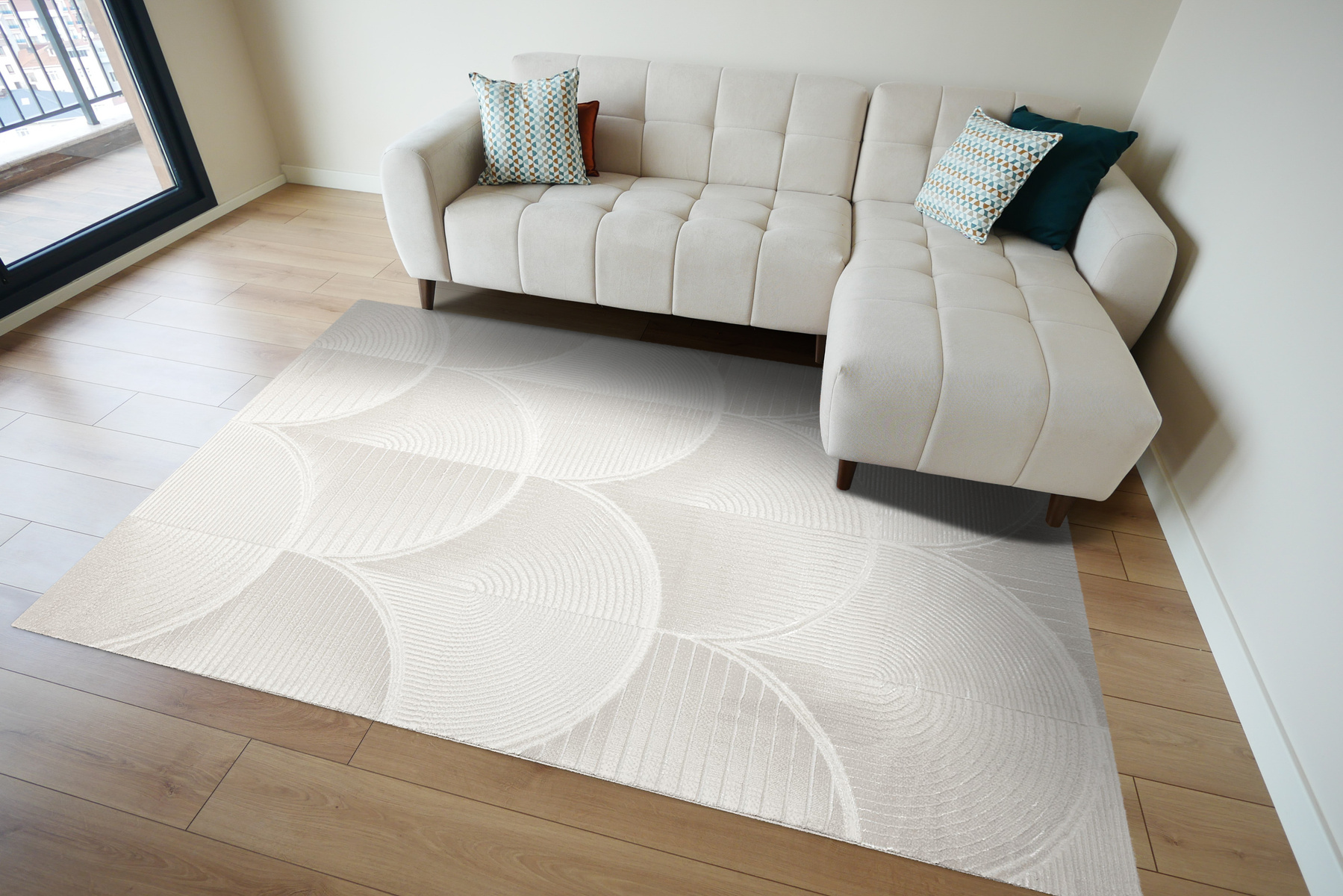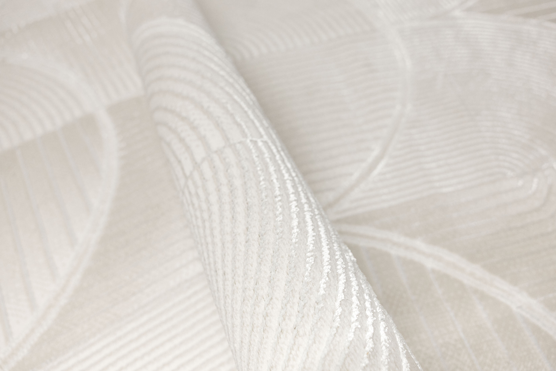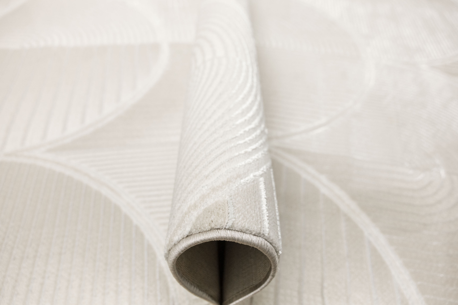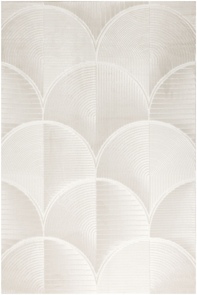 • Miękki dywan Factor o gęstym, lśniącym dwupoziomowym runie ozdobionym geometrycznym wzorem wachlarzowym w stylu art deco w odcieniach kremu i beżu.