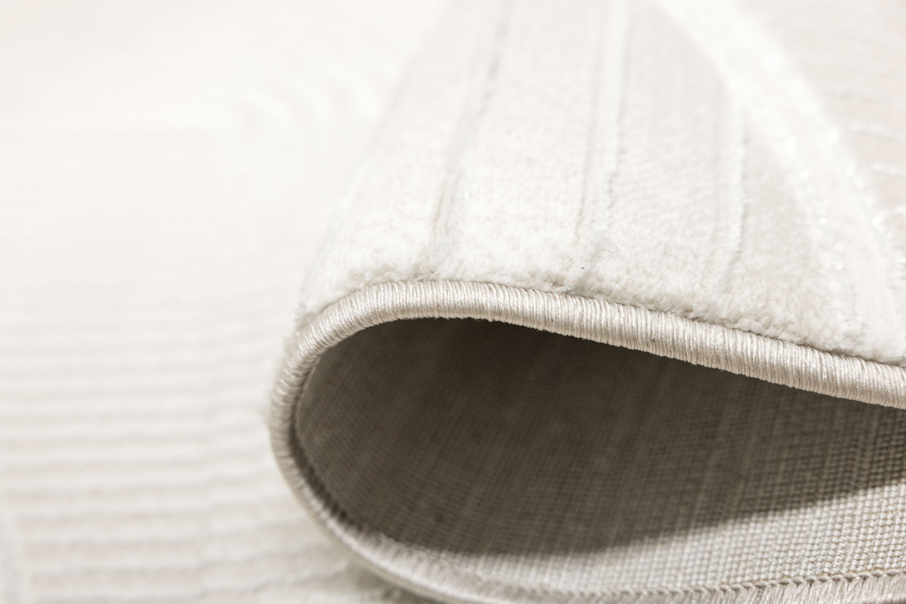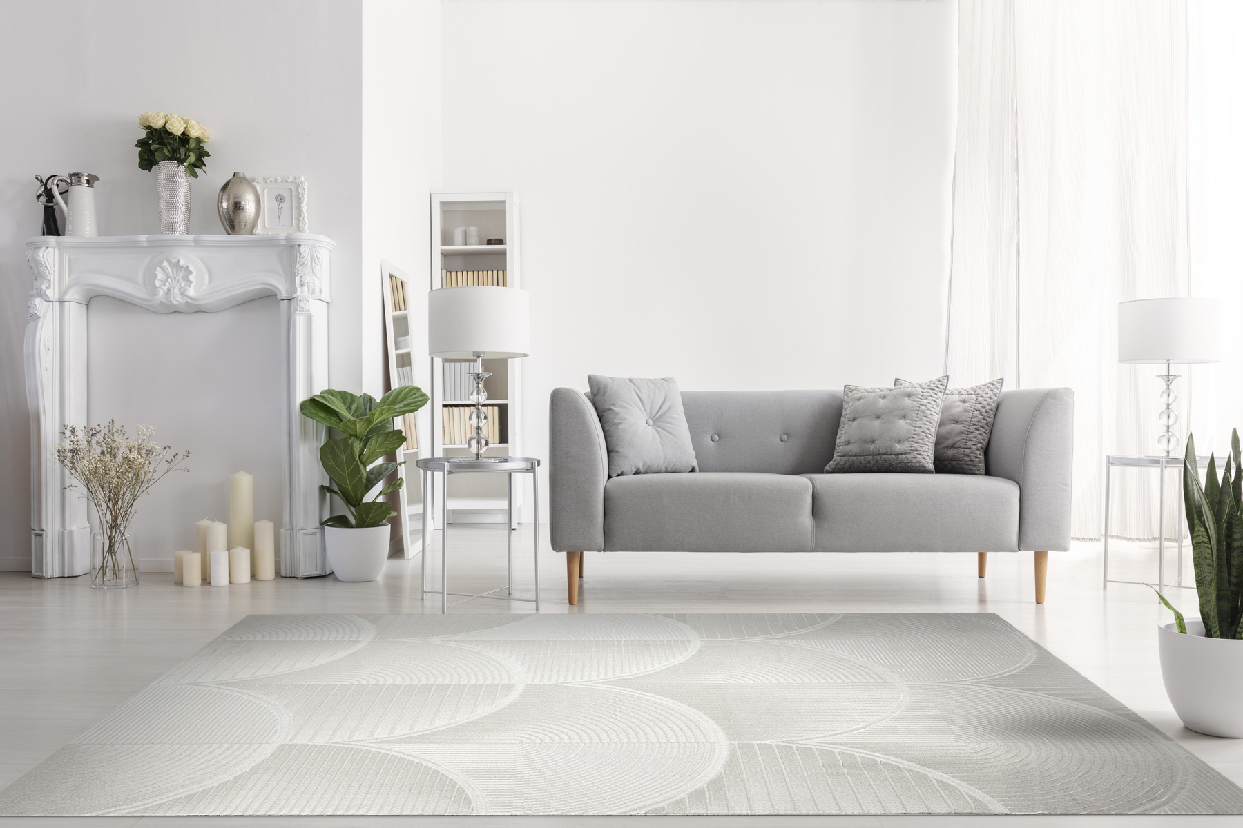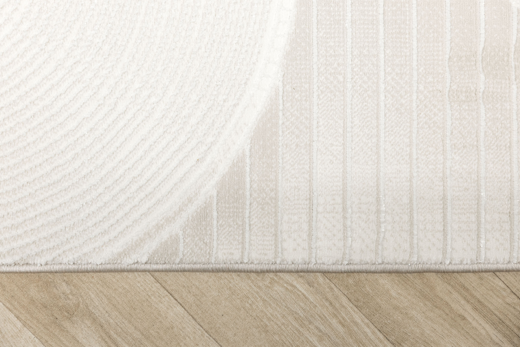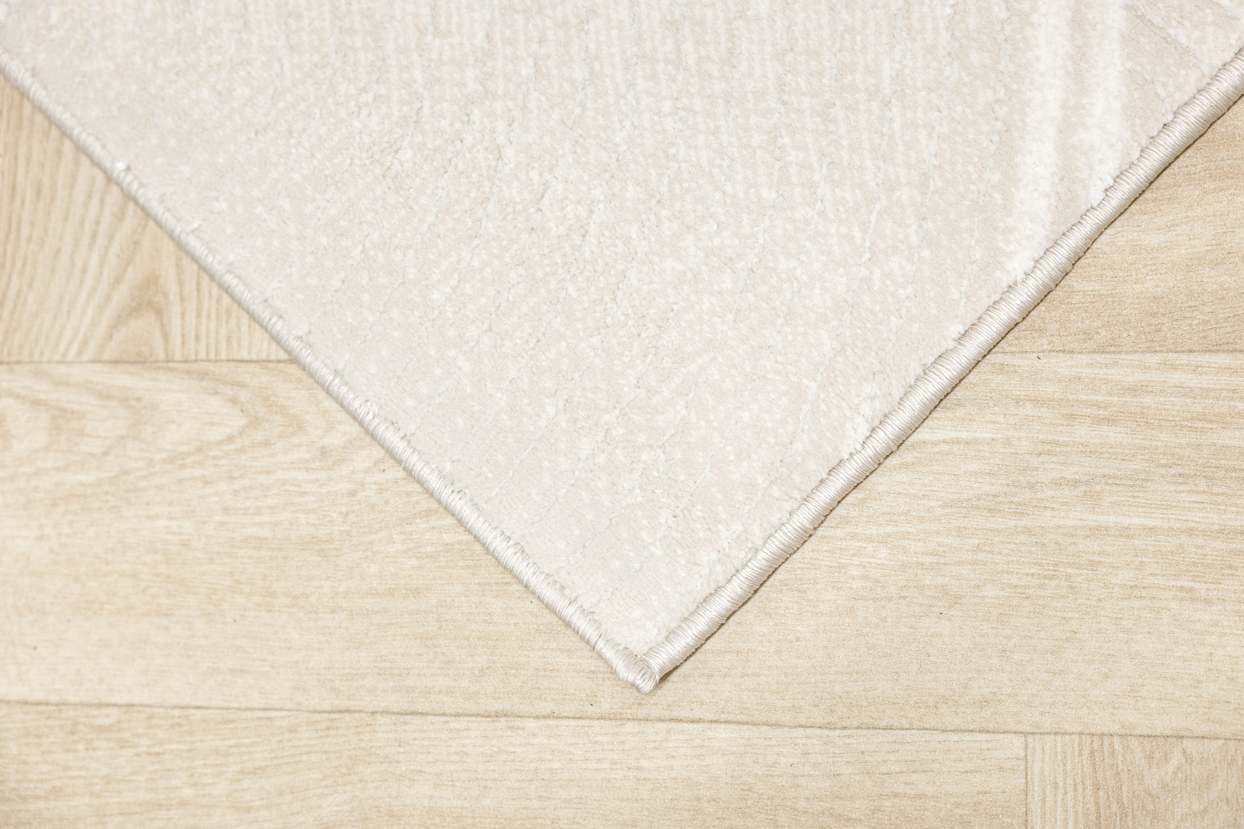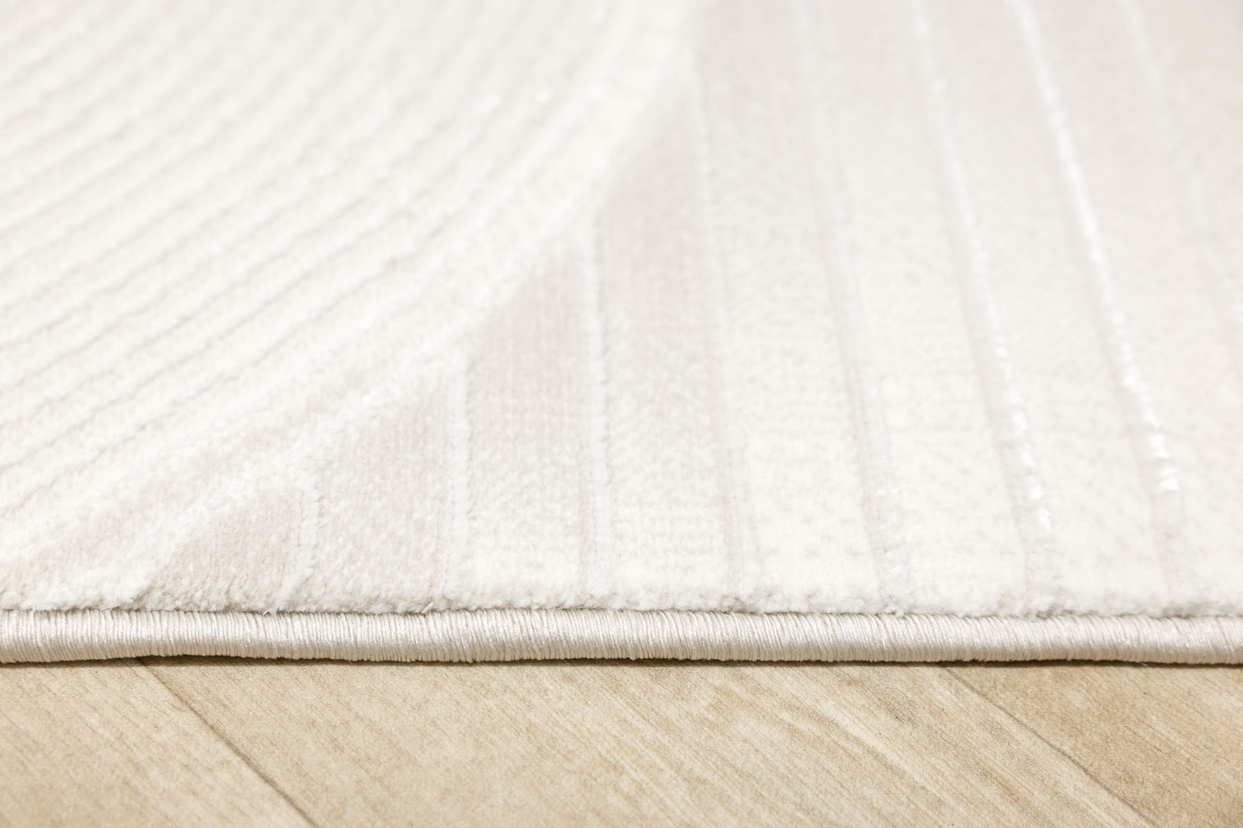 • Miękki dywan Factor o gęstym, lśniącym dwupoziomowym runie ozdobionym geometrycznym wzorem wachlarzowym w stylu art deco w odcieniach kremu i beżu.