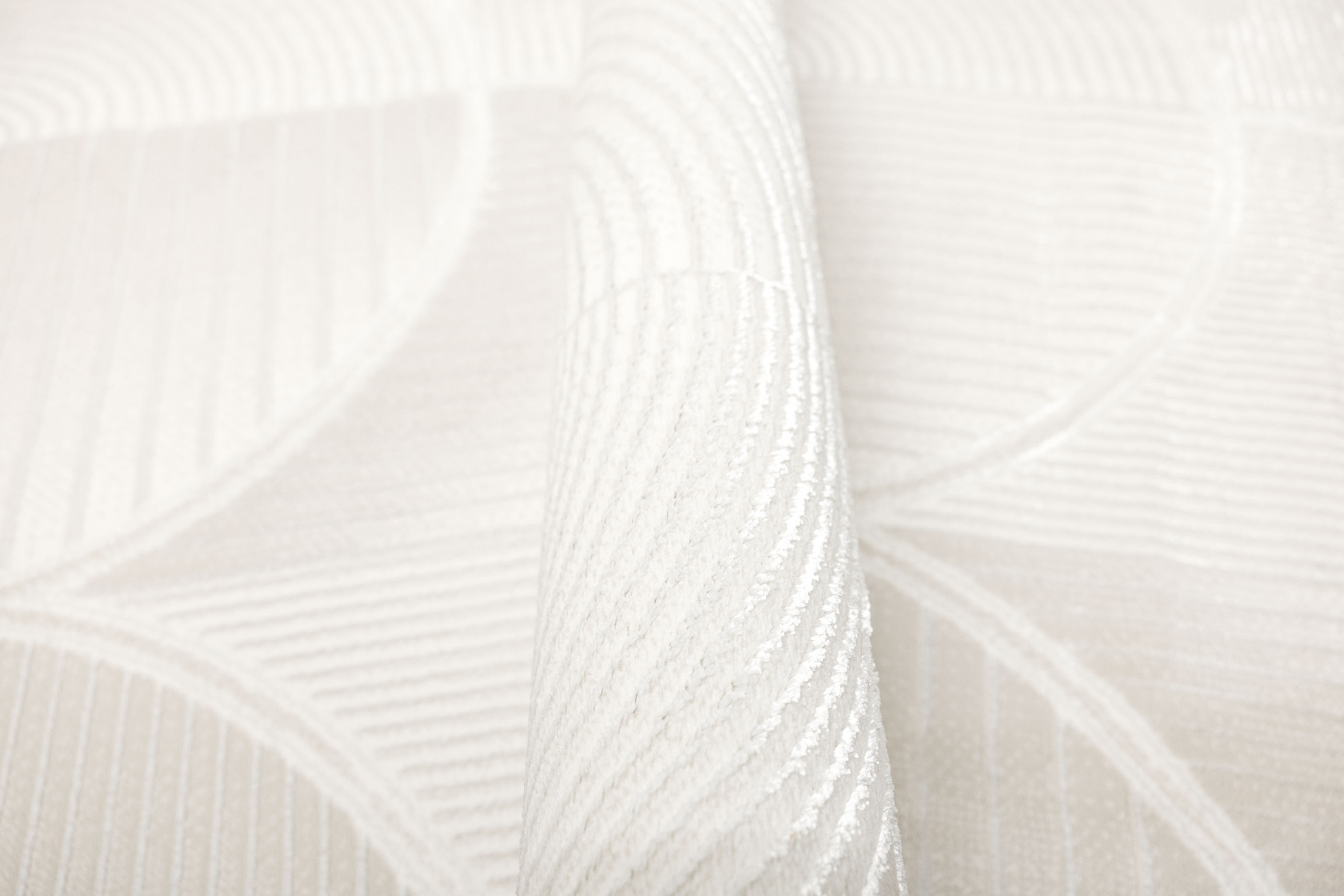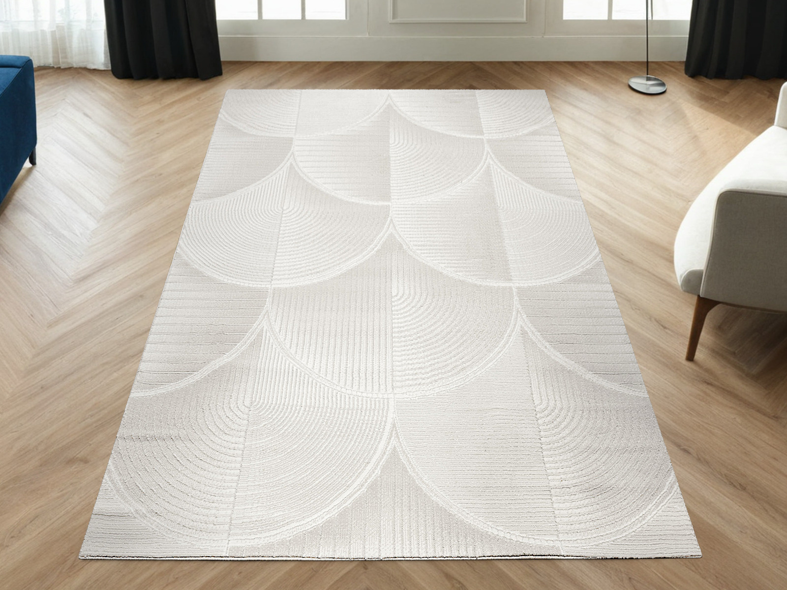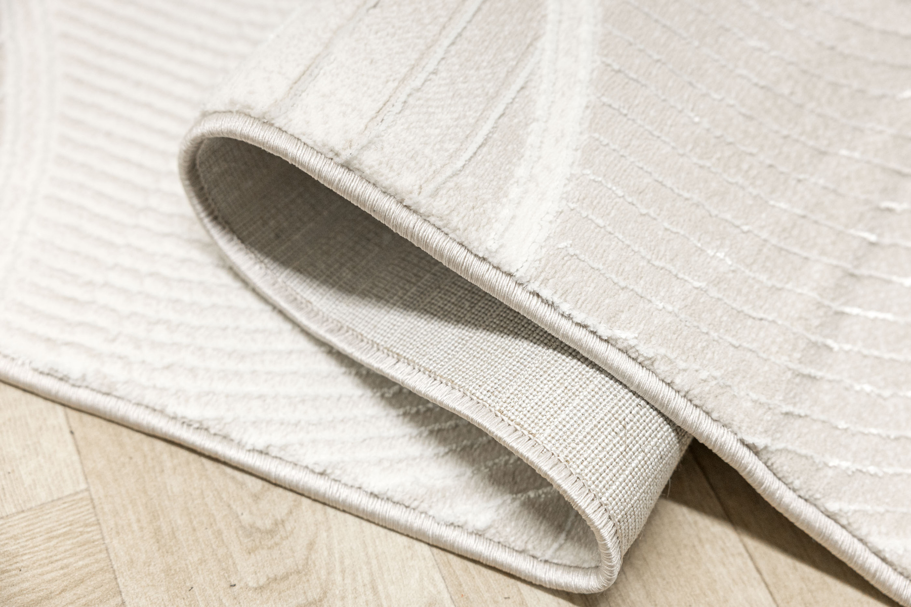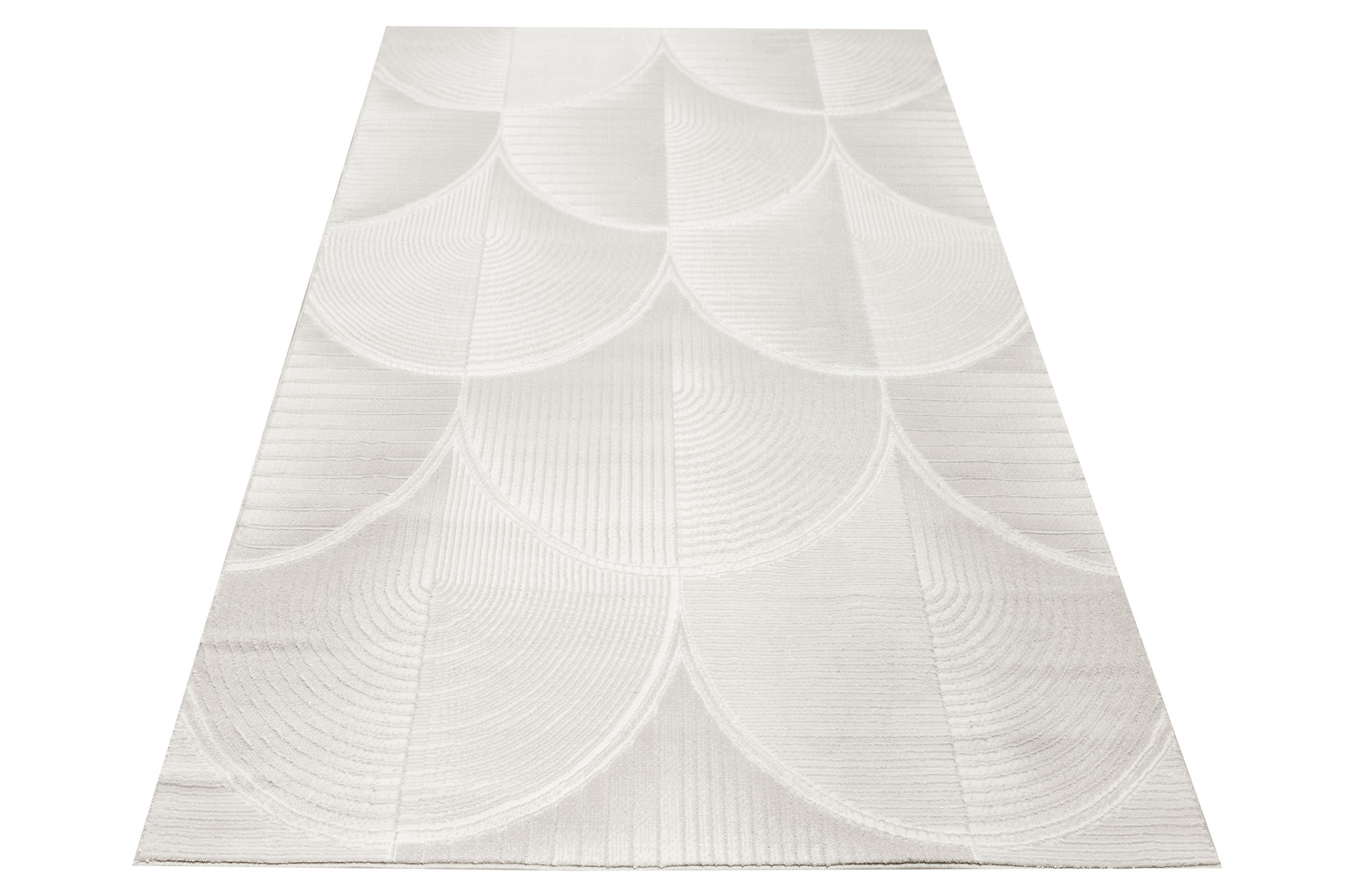 • Miękki dywan Factor o gęstym, lśniącym dwupoziomowym runie ozdobionym geometrycznym wzorem wachlarzowym w stylu art deco w odcieniach kremu i beżu.