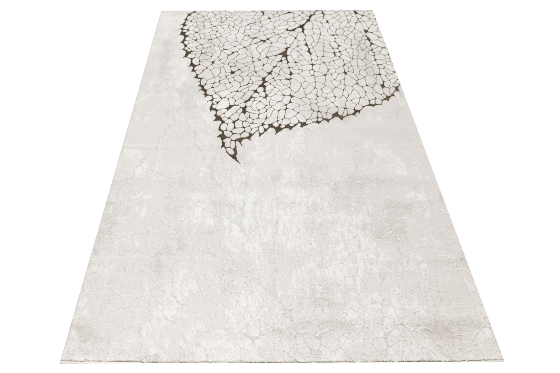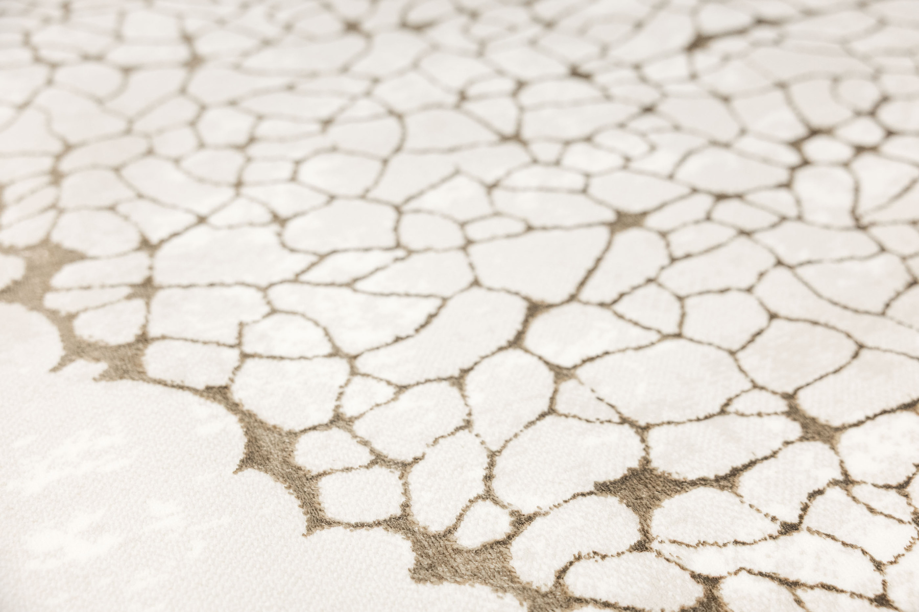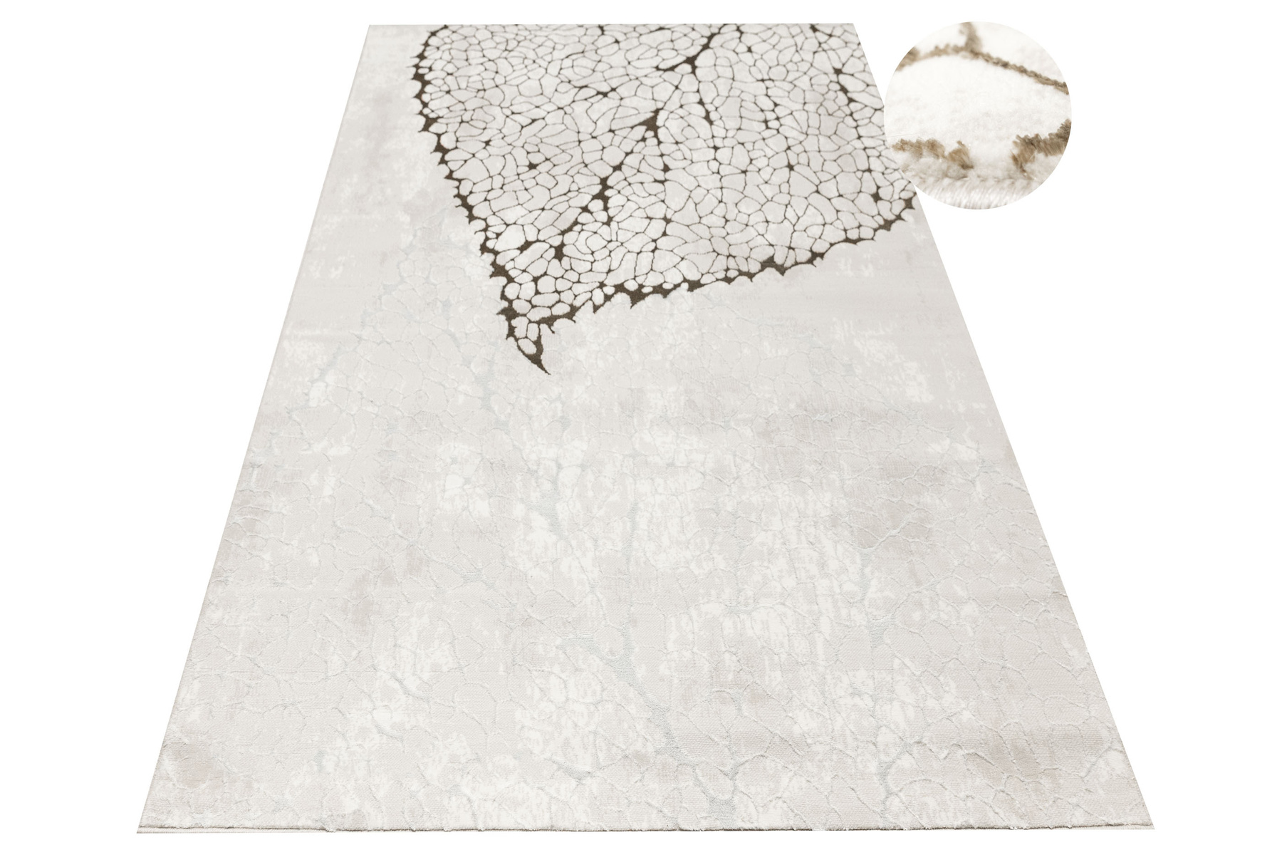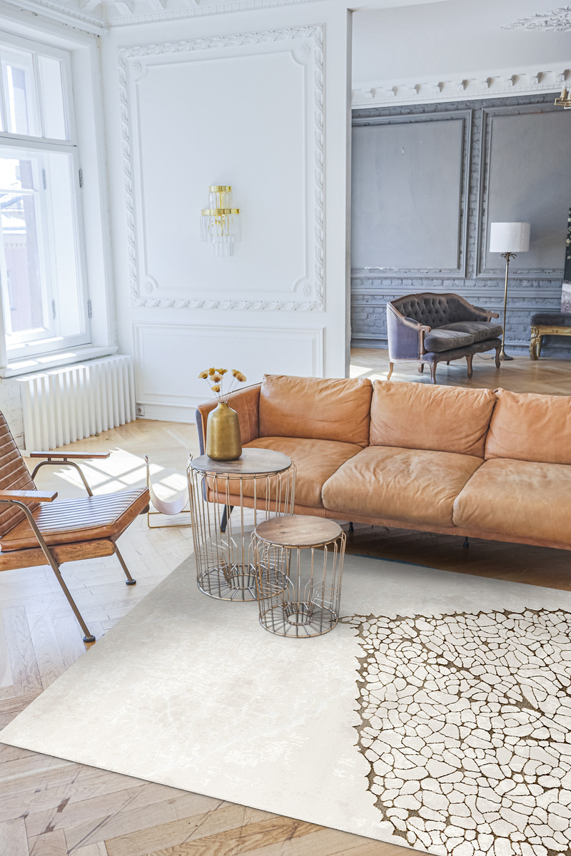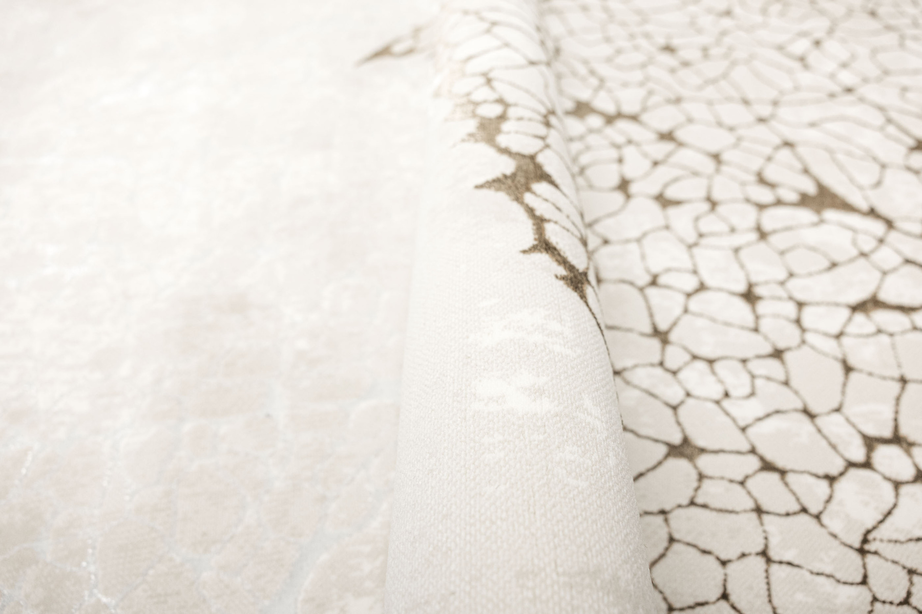 • Miękki dywan Factor o gęstym, lśniącym dwupoziomowym runie ozdobionym naturalnym wzorem z motywem liści w odcieniach kremu beżu, brązu z elementami w srebrzystej szarości.