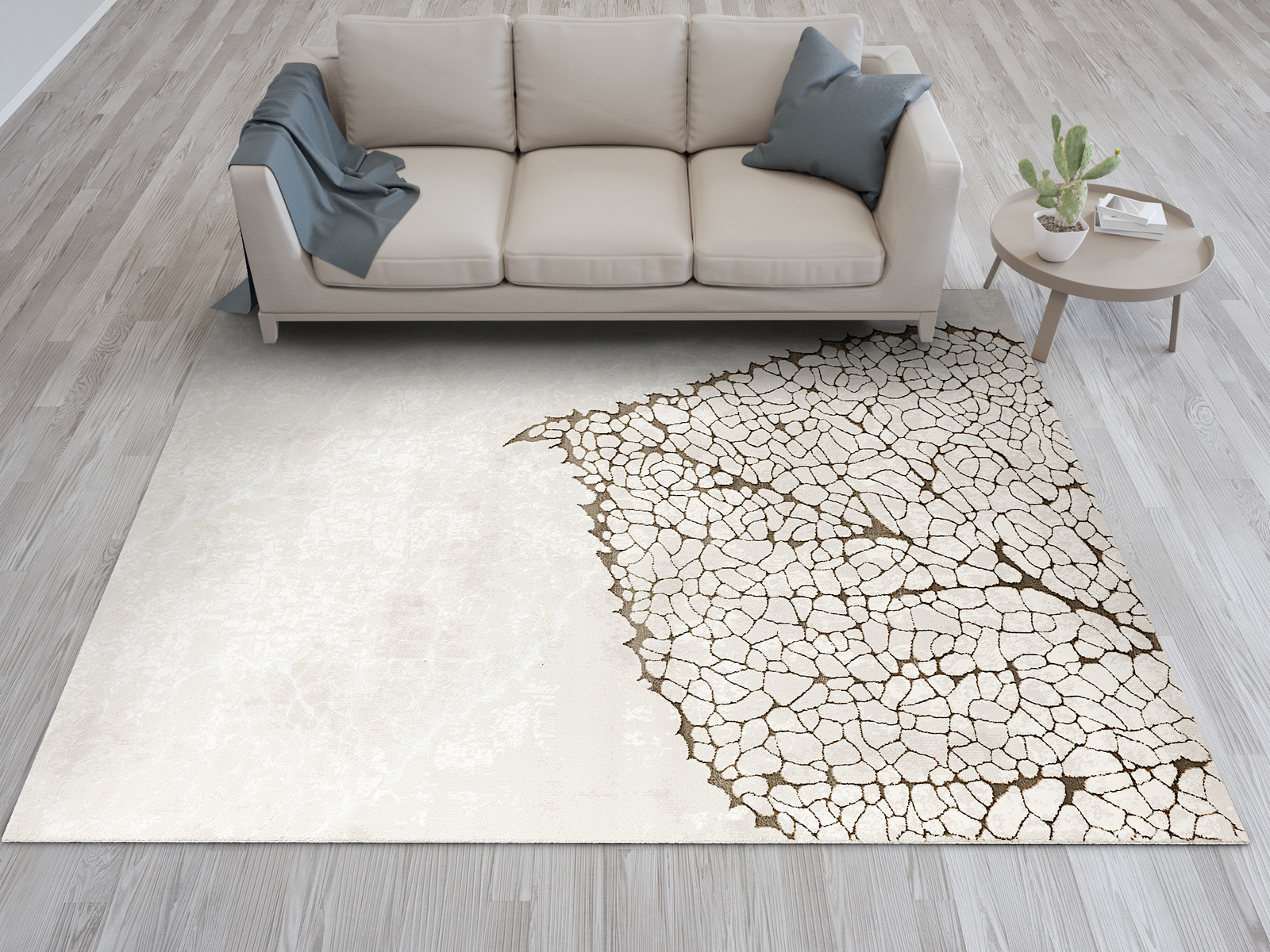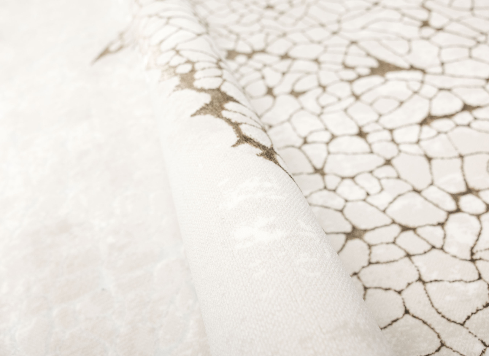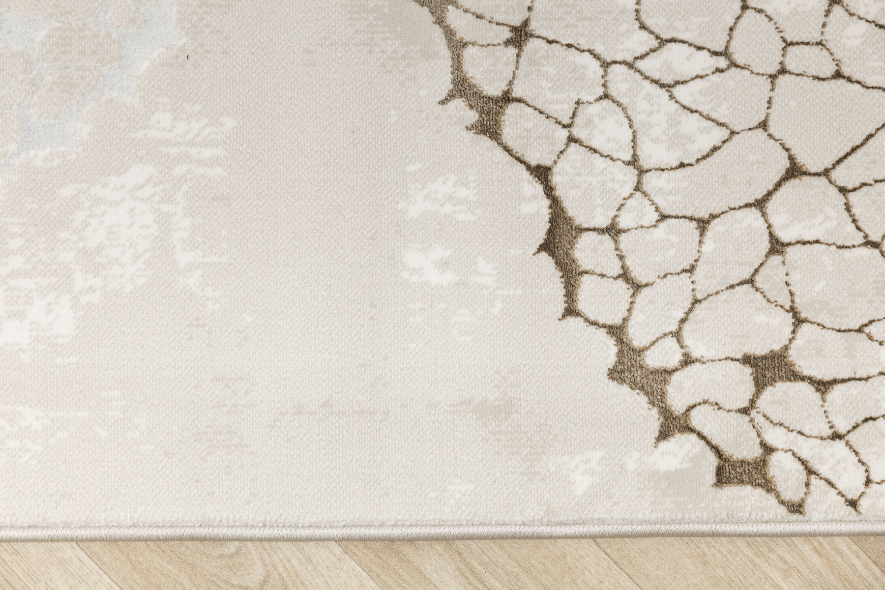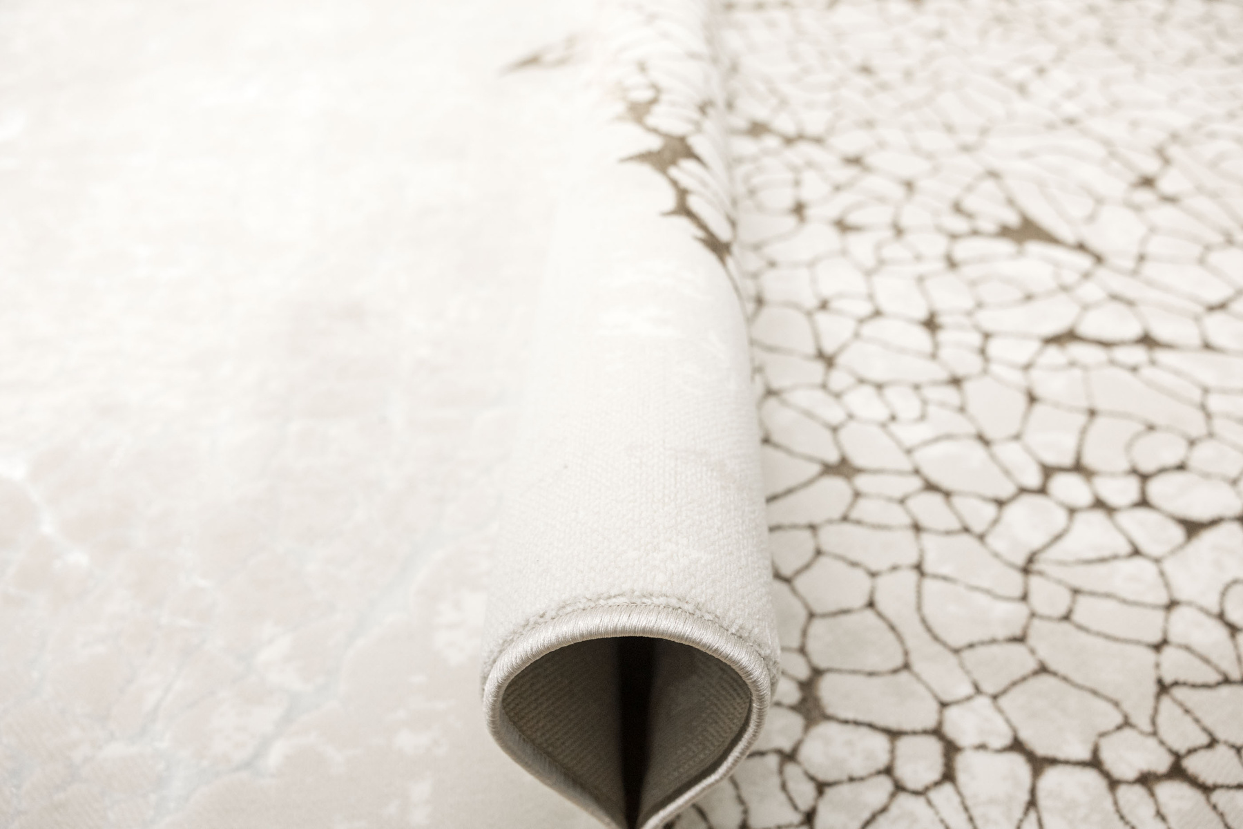 • Miękki dywan Factor o gęstym, lśniącym dwupoziomowym runie ozdobionym naturalnym wzorem z motywem liści w odcieniach kremu beżu, brązu z elementami w srebrzystej szarości.