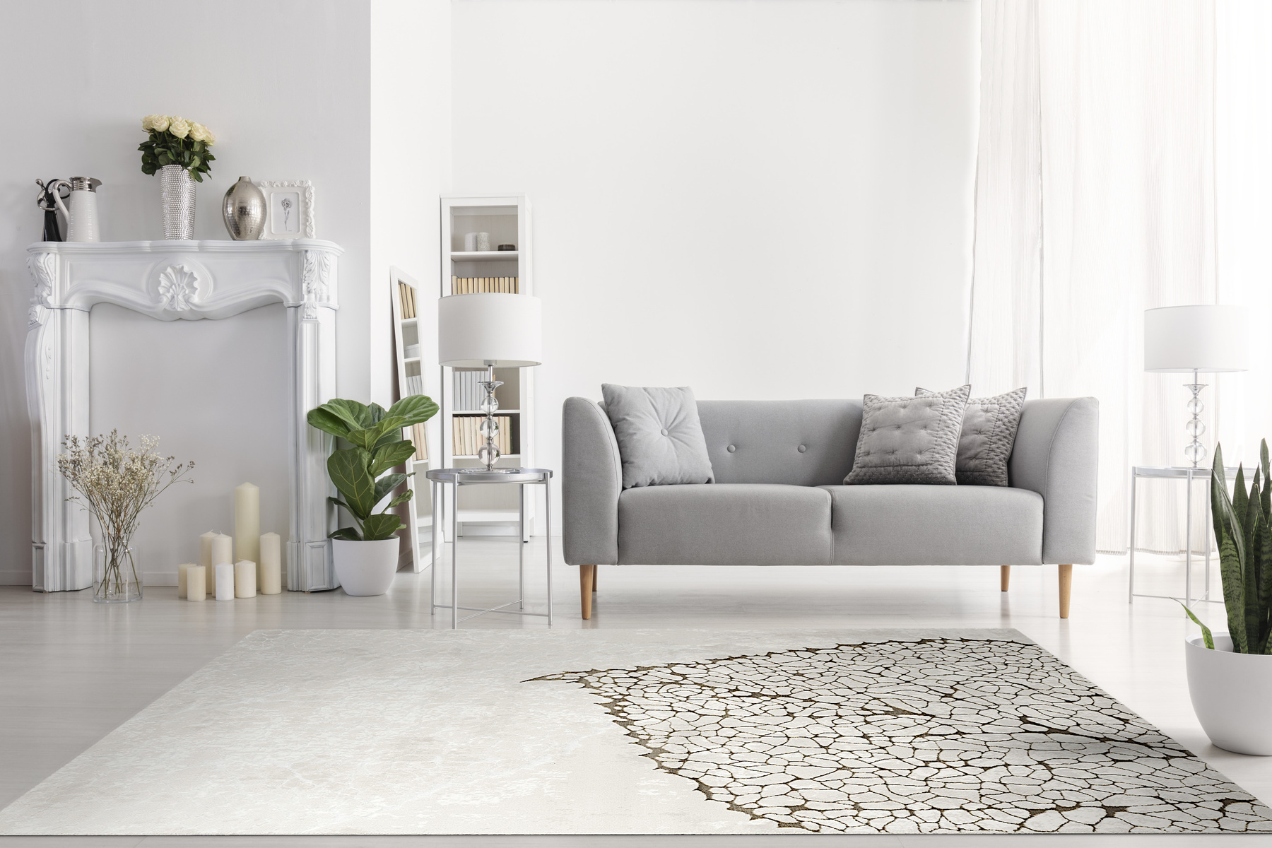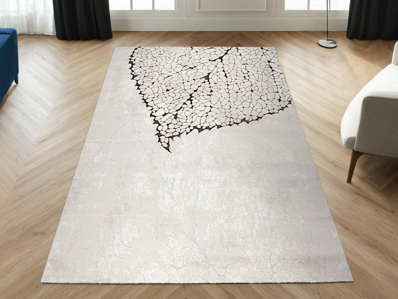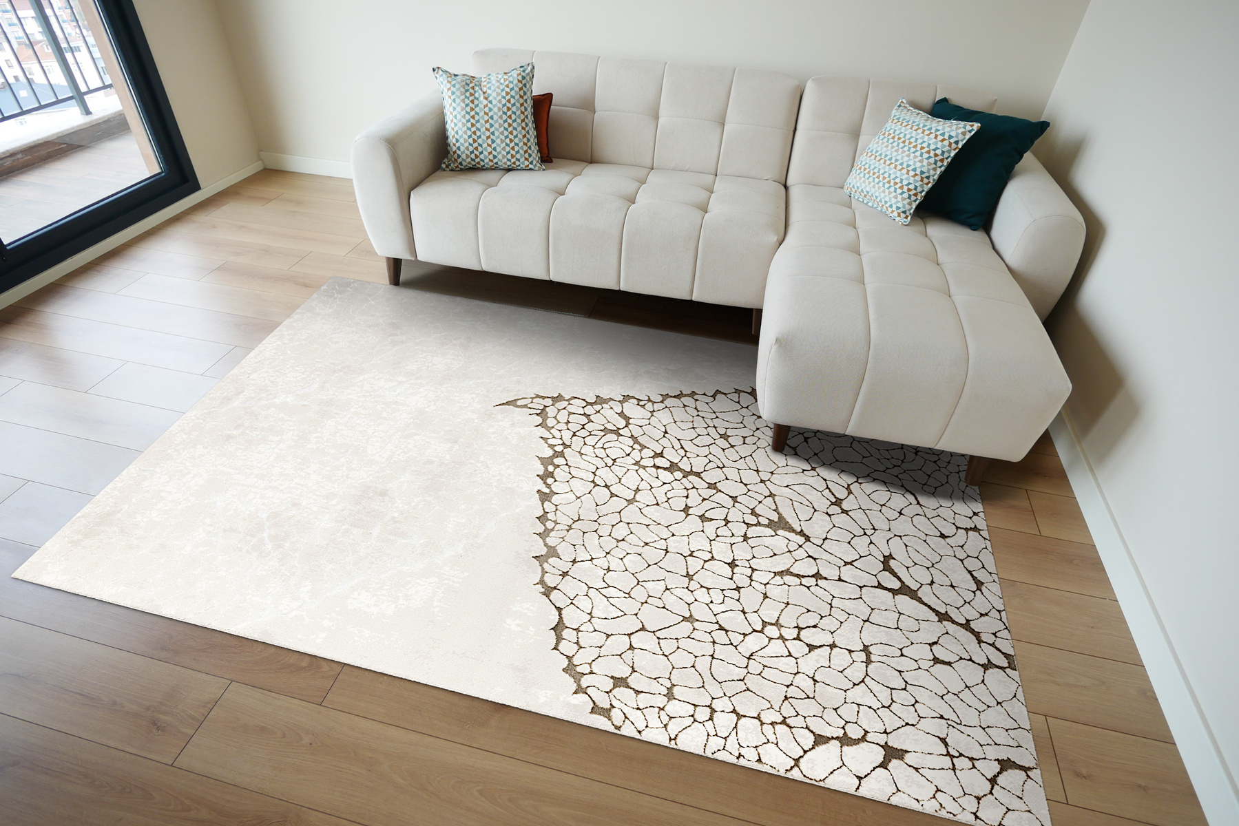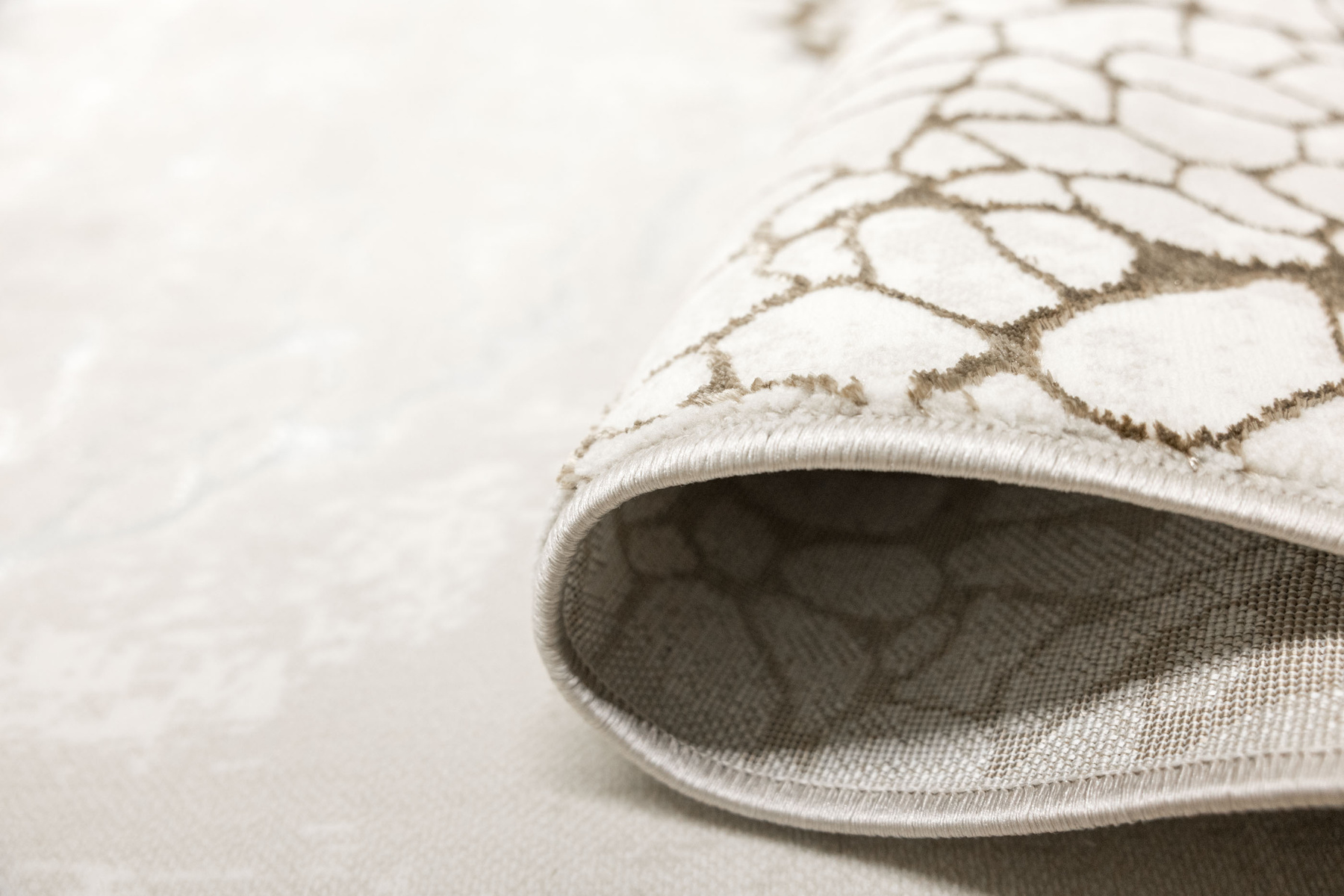 • Miękki dywan Factor o gęstym, lśniącym dwupoziomowym runie ozdobionym naturalnym wzorem z motywem liści w odcieniach kremu beżu, brązu z elementami w srebrzystej szarości.