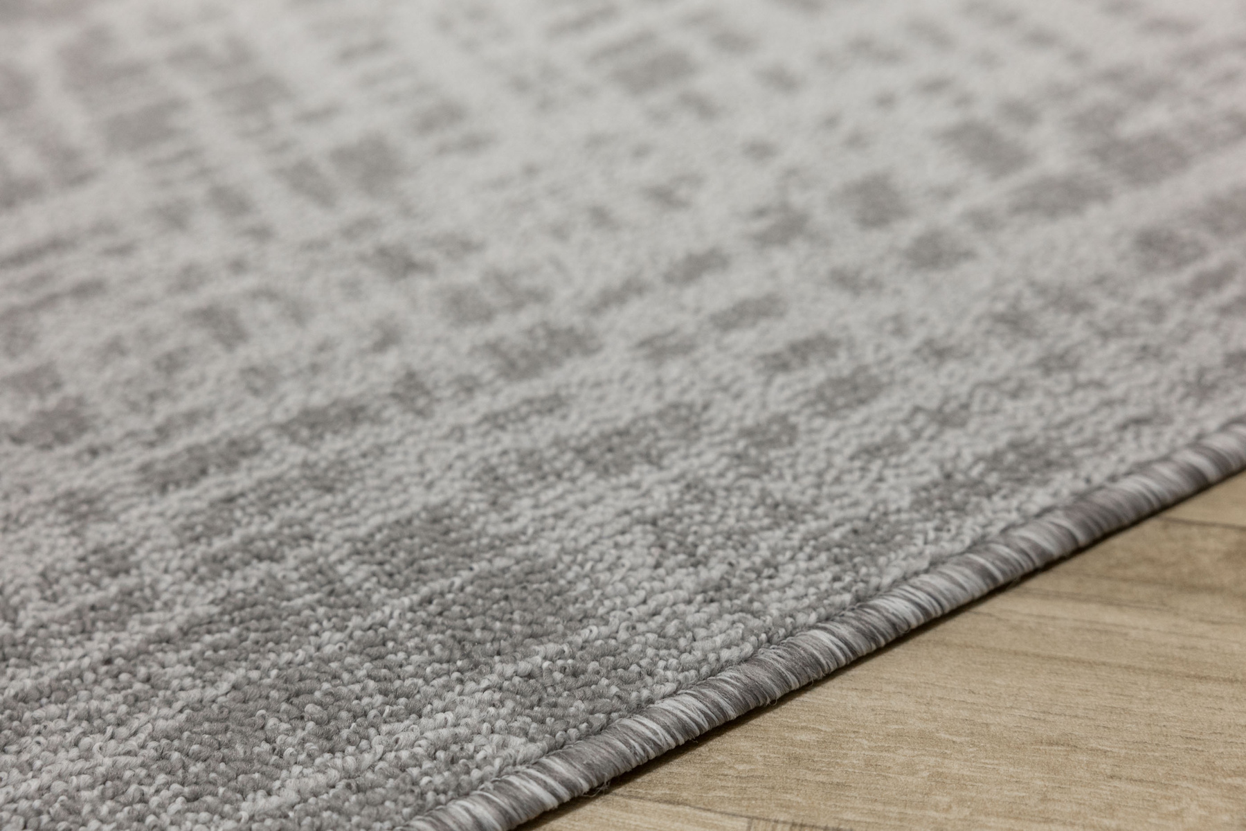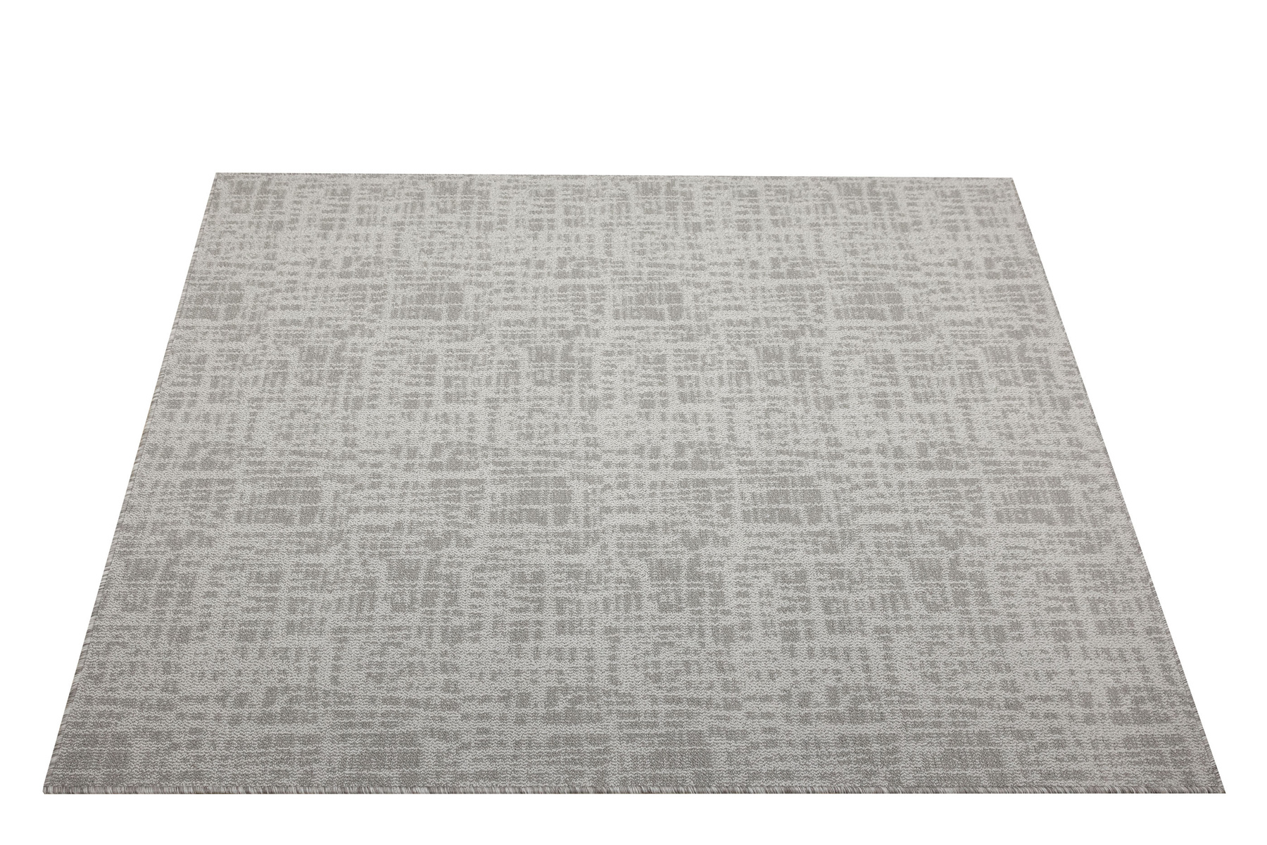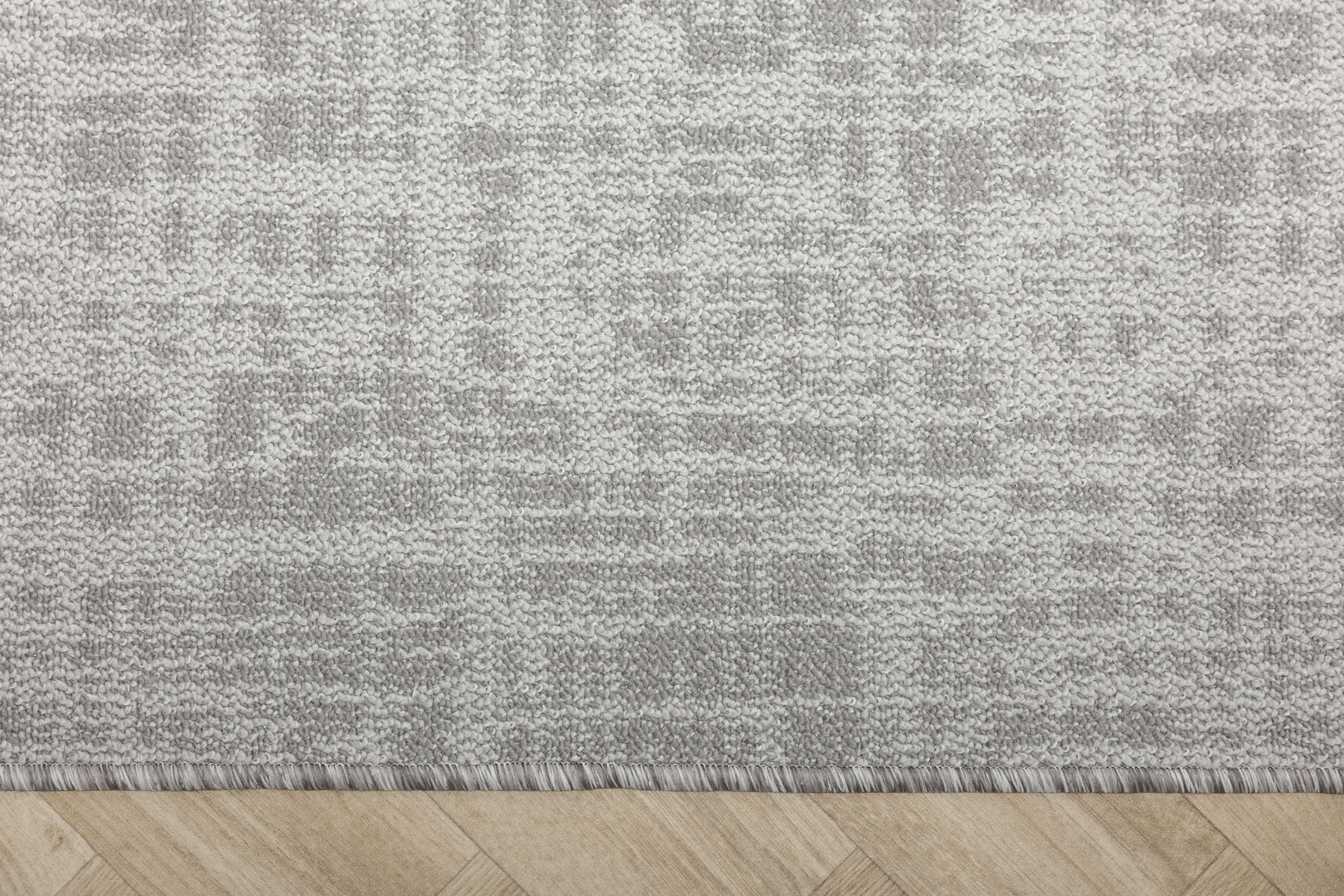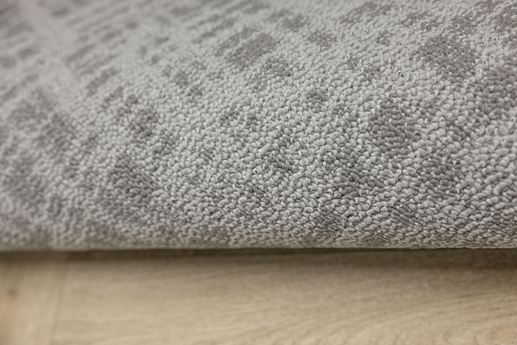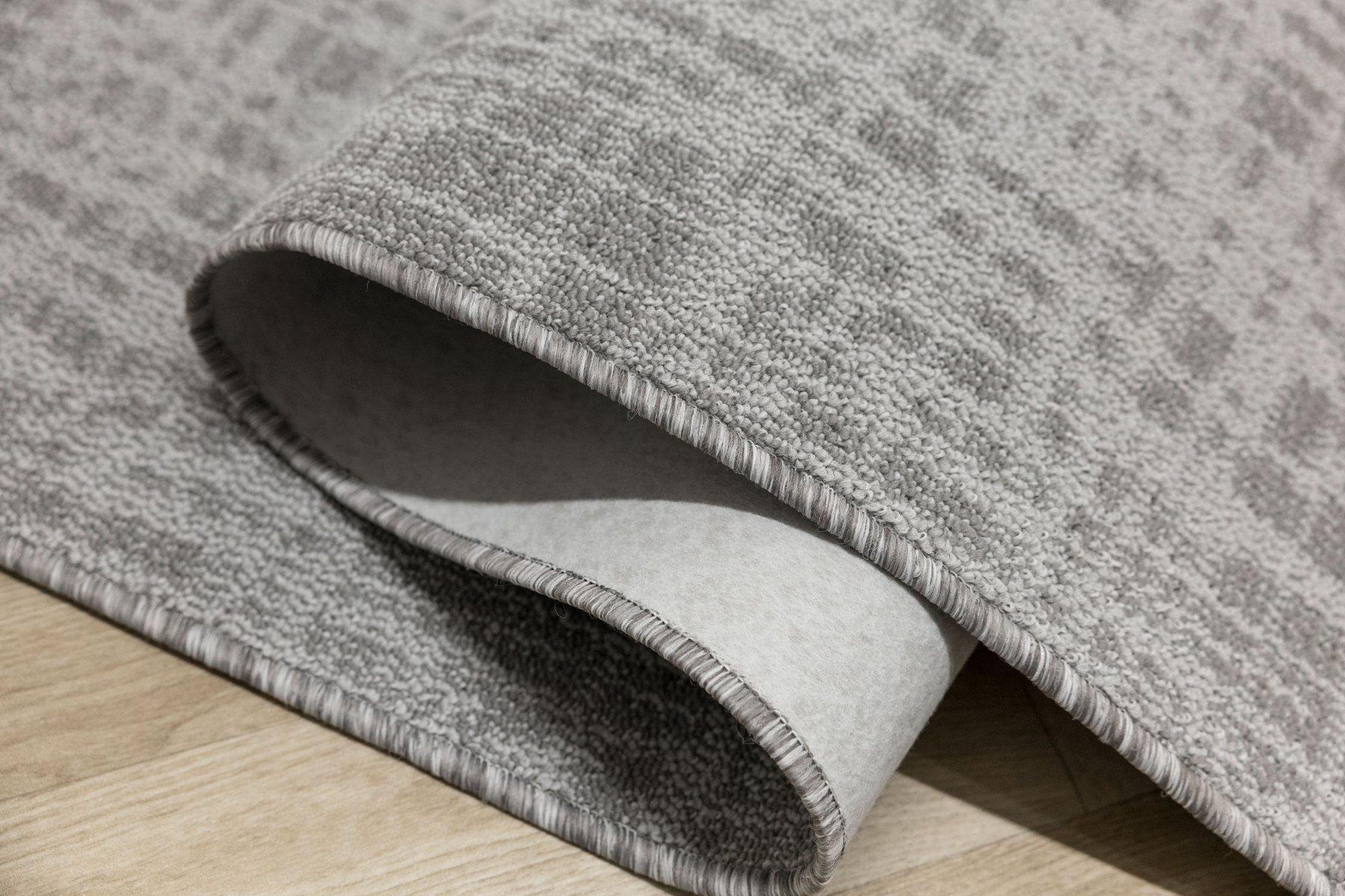 - Dywan wykonany z wykładziny pętelkowej Traffic z runem w melanżu odcieni szarości z geometrycznym wzorem nieregularnej kratki oraz ze spodem wykończonym filcem.