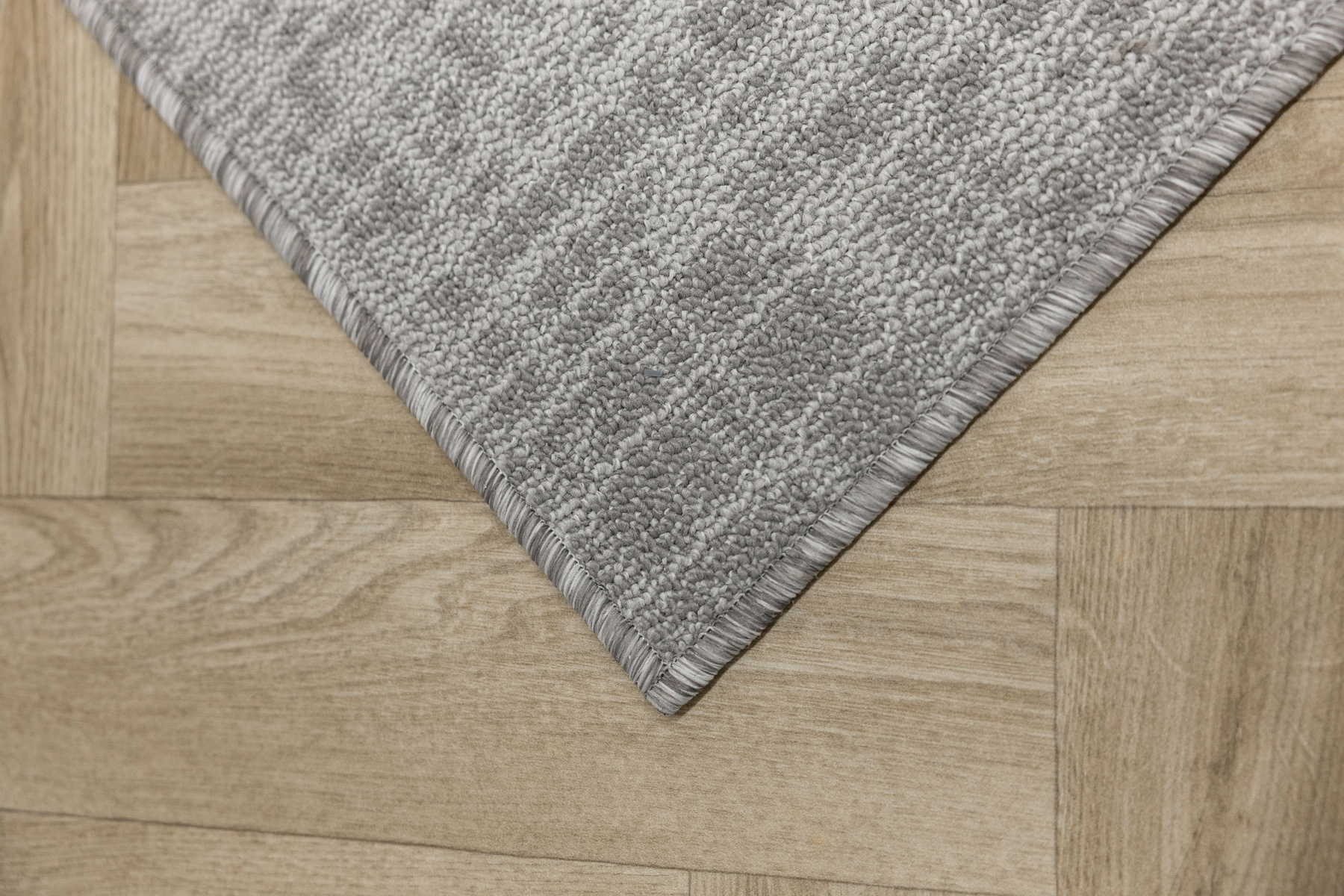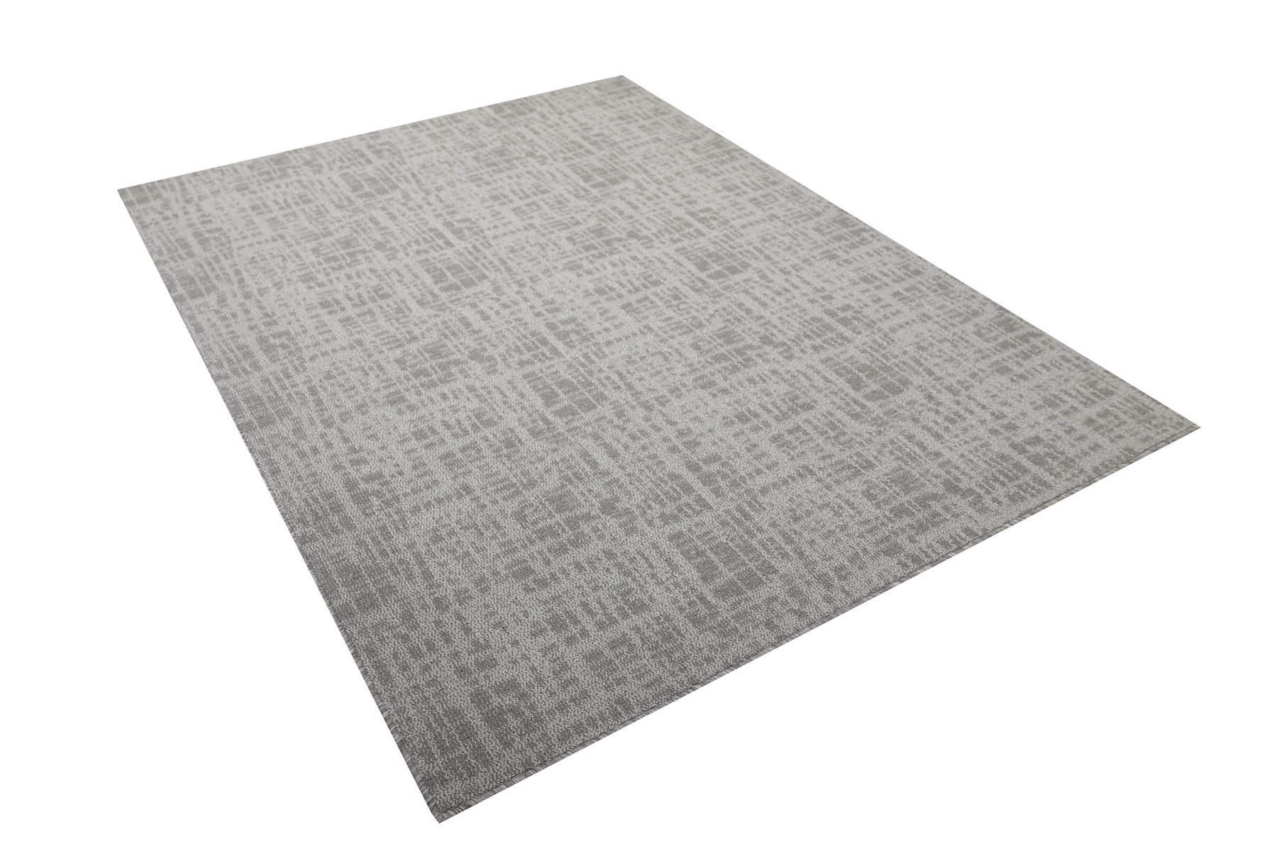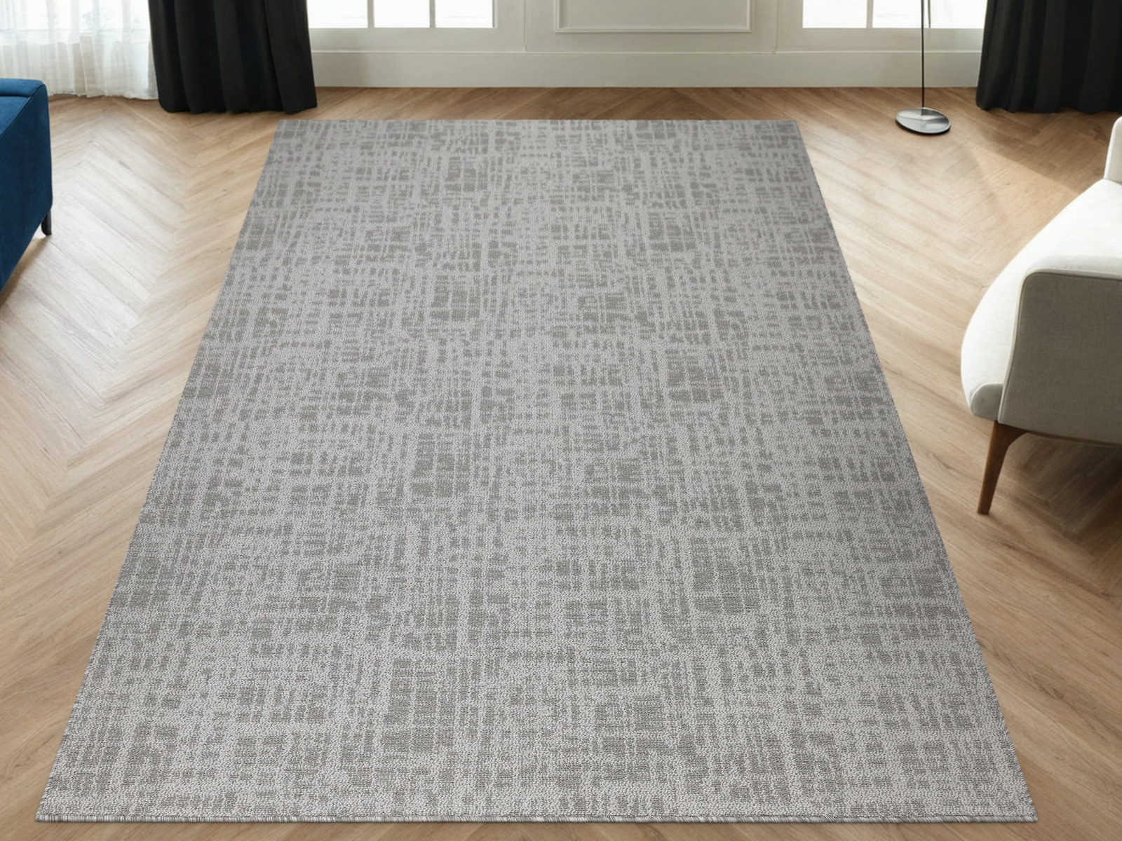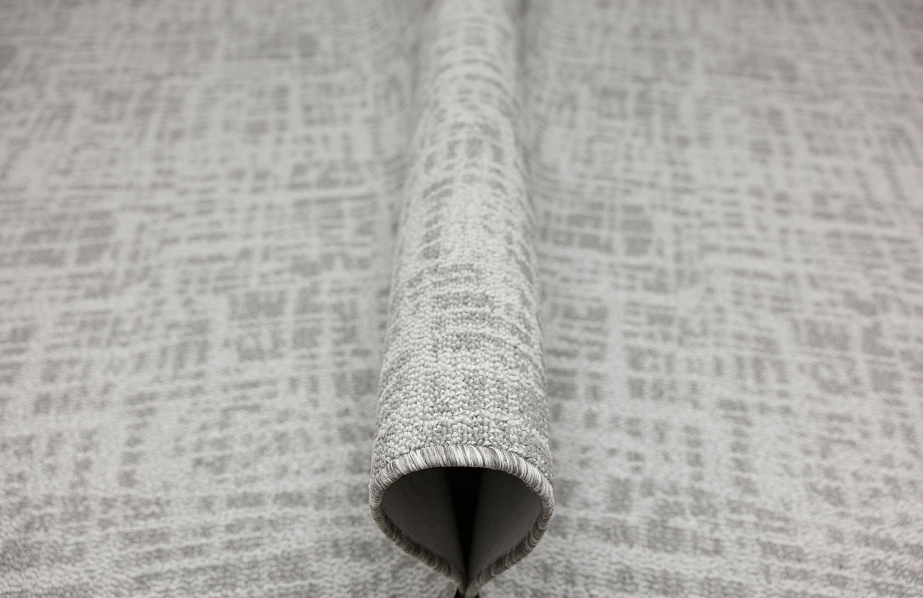 - Dywan wykonany z wykładziny pętelkowej Traffic z runem w melanżu odcieni szarości z geometrycznym wzorem nieregularnej kratki oraz ze spodem wykończonym filcem.
