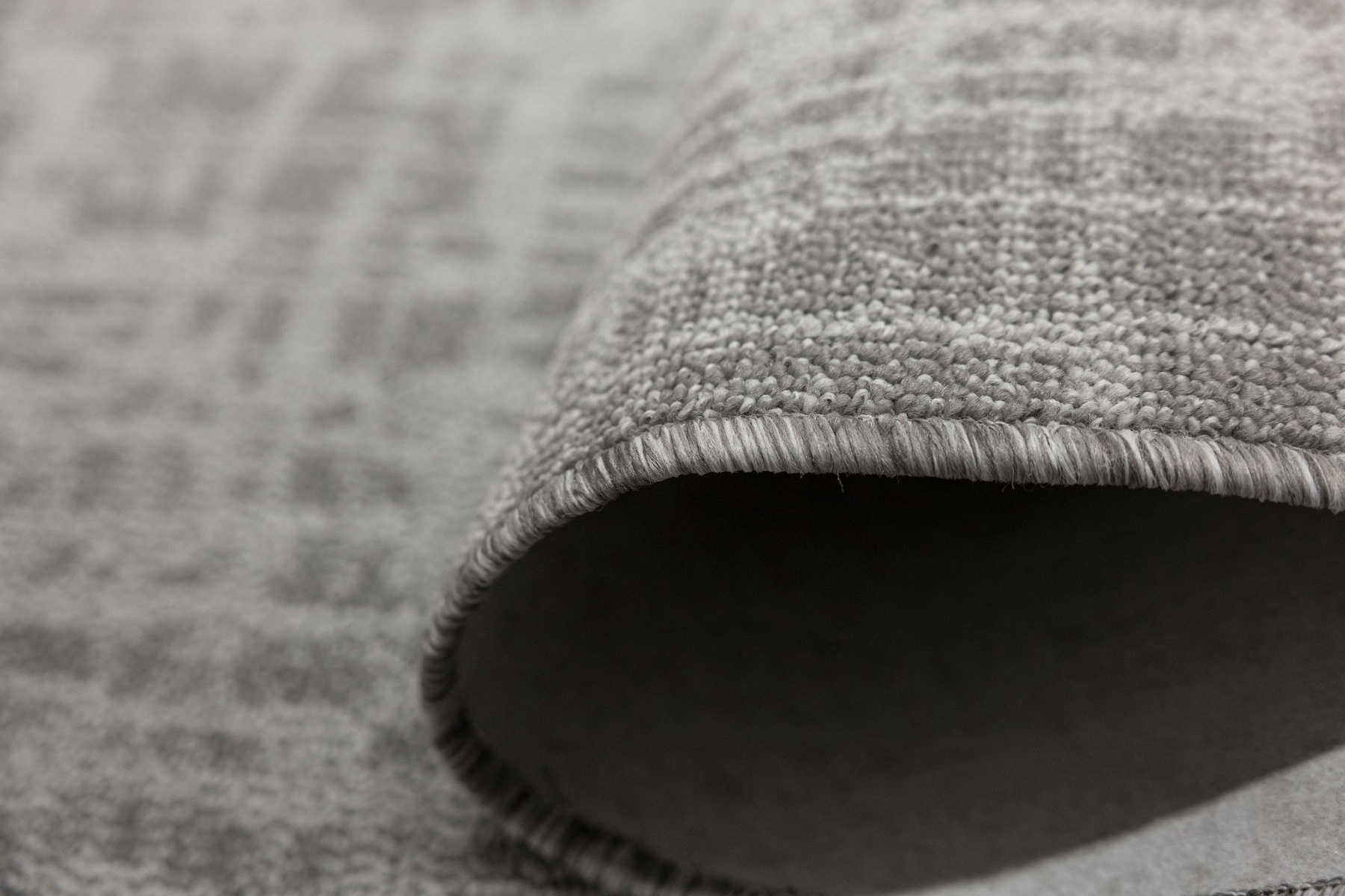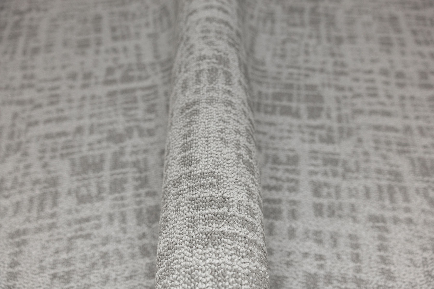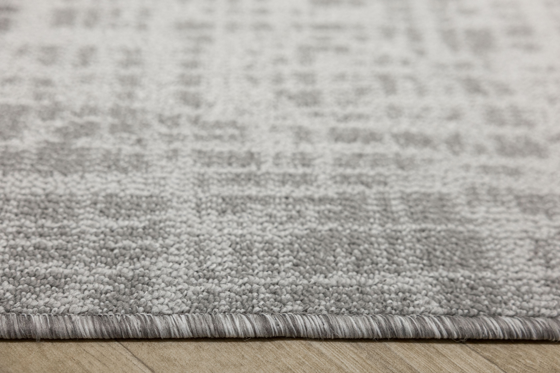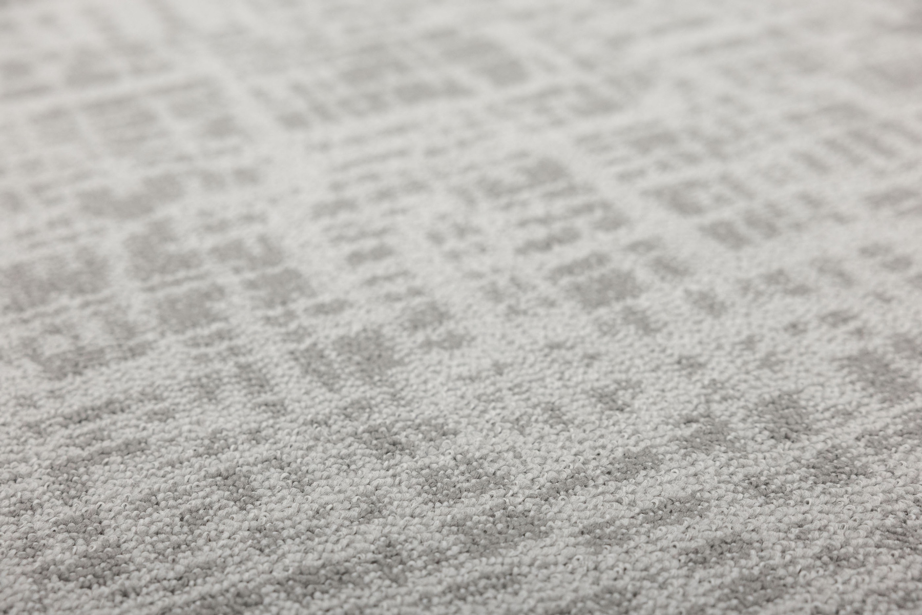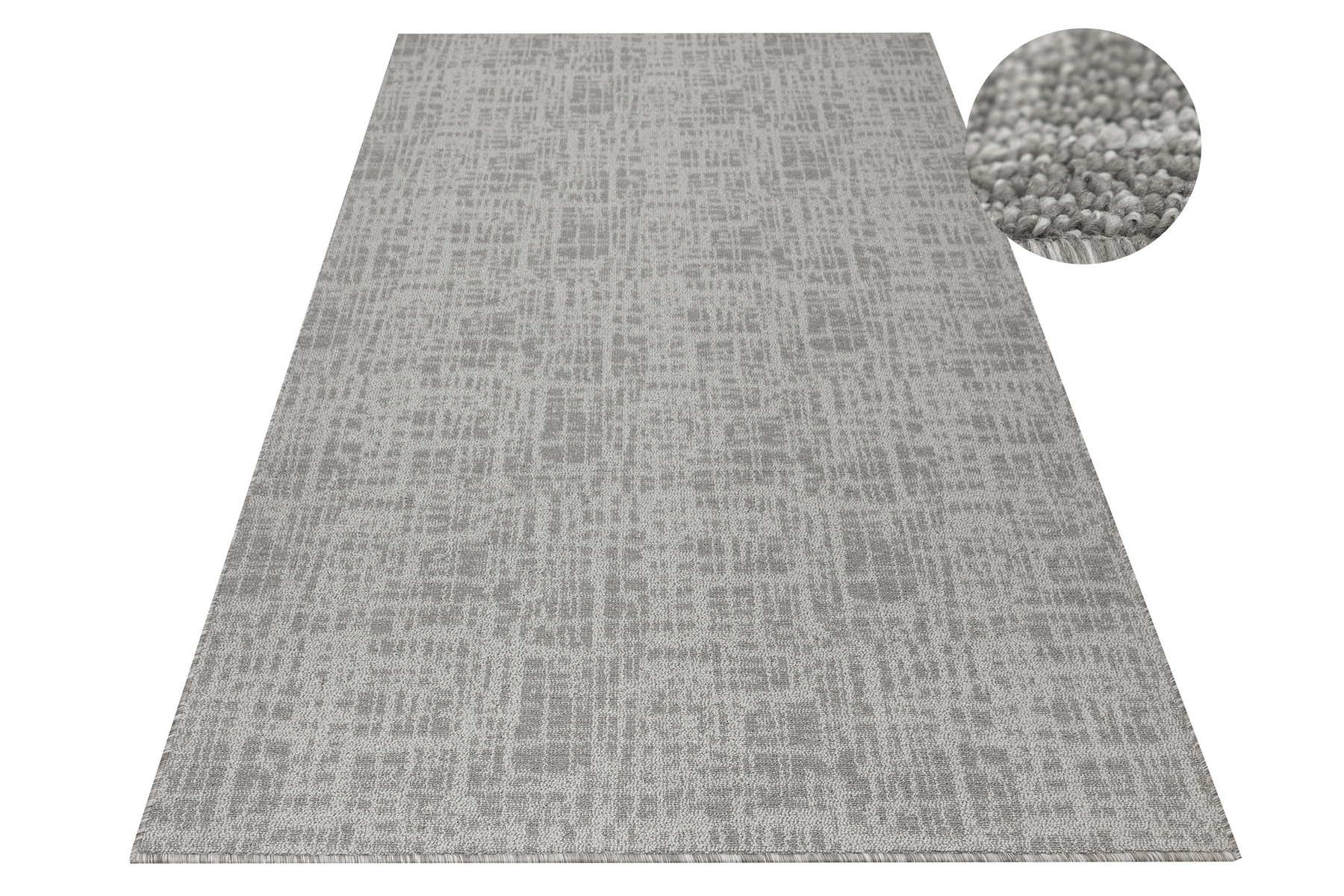 - Dywan wykonany z wykładziny pętelkowej Traffic z runem w melanżu odcieni szarości z geometrycznym wzorem nieregularnej kratki oraz ze spodem wykończonym filcem.