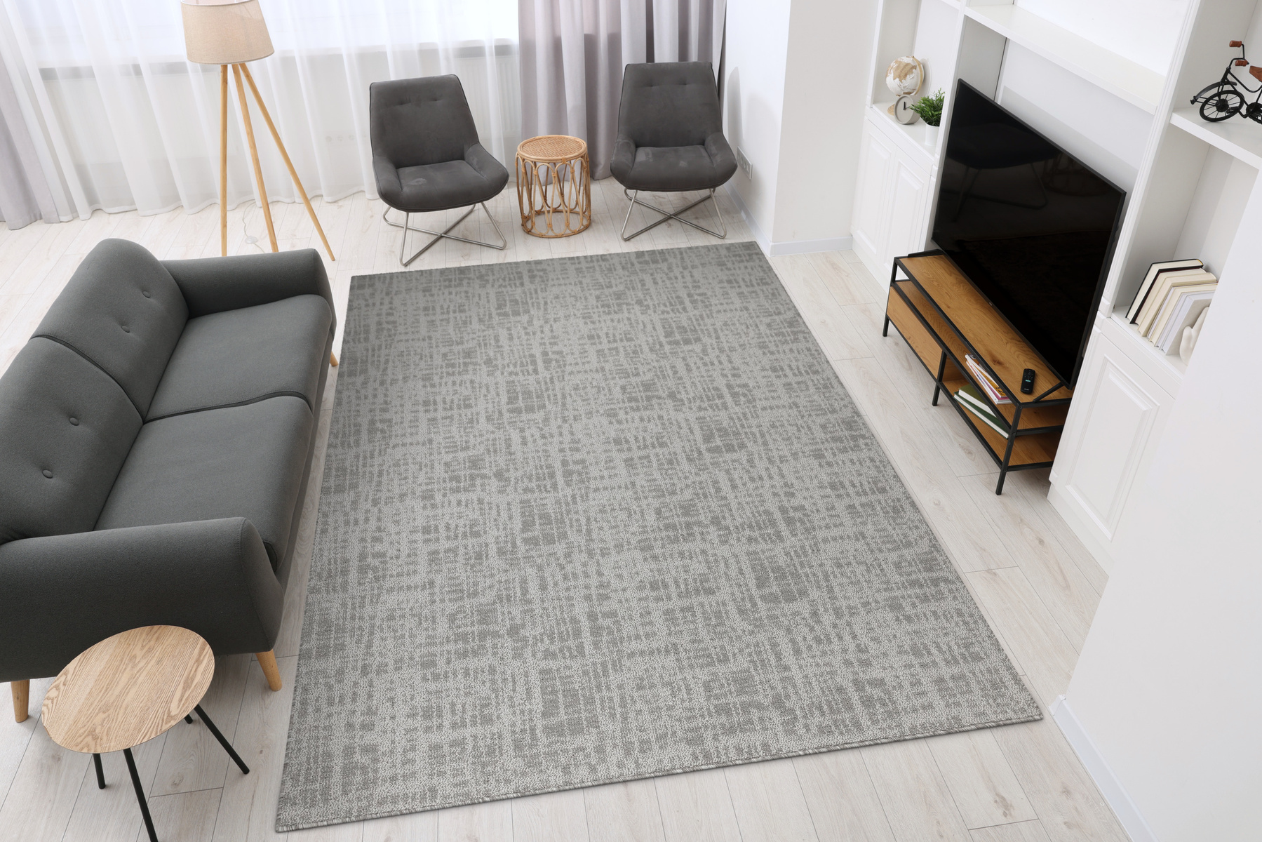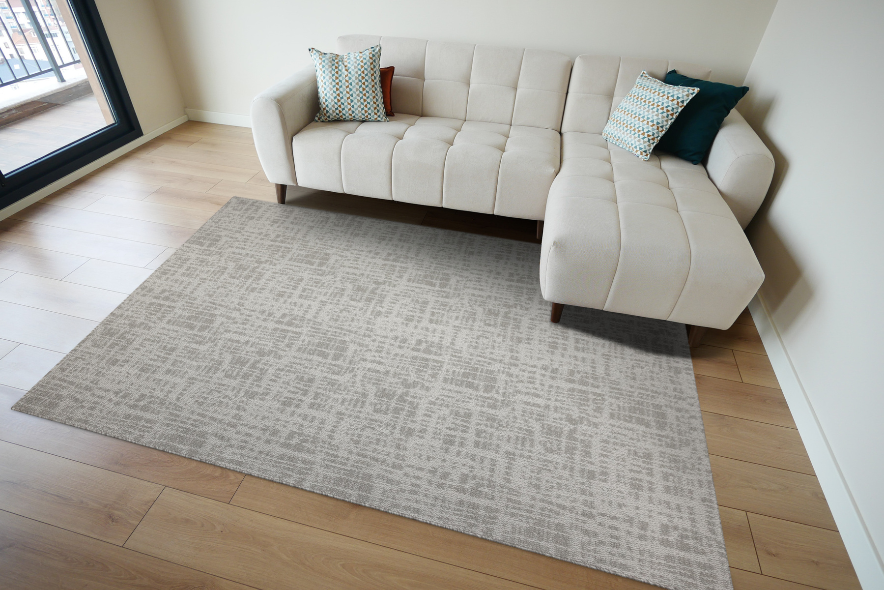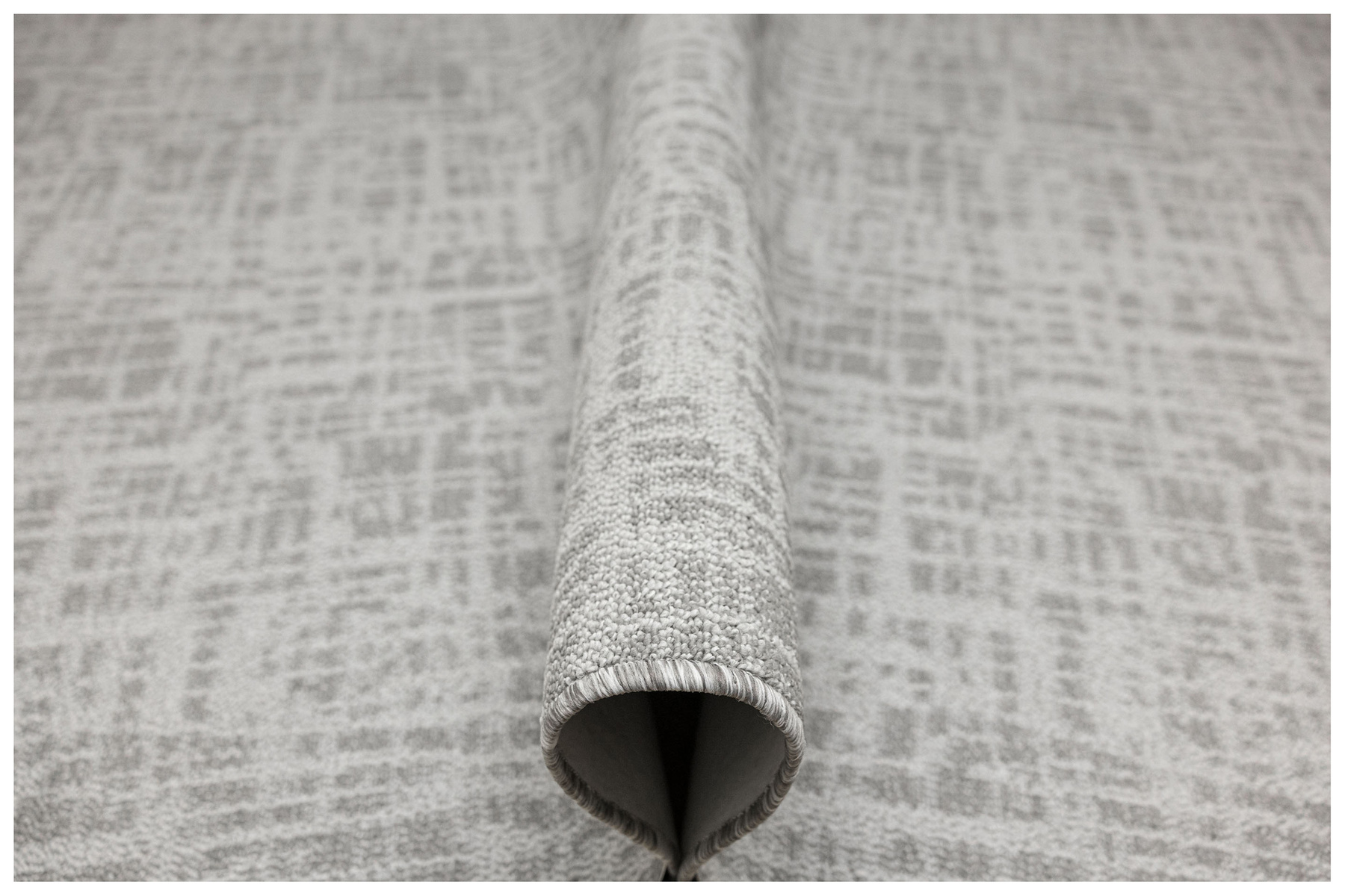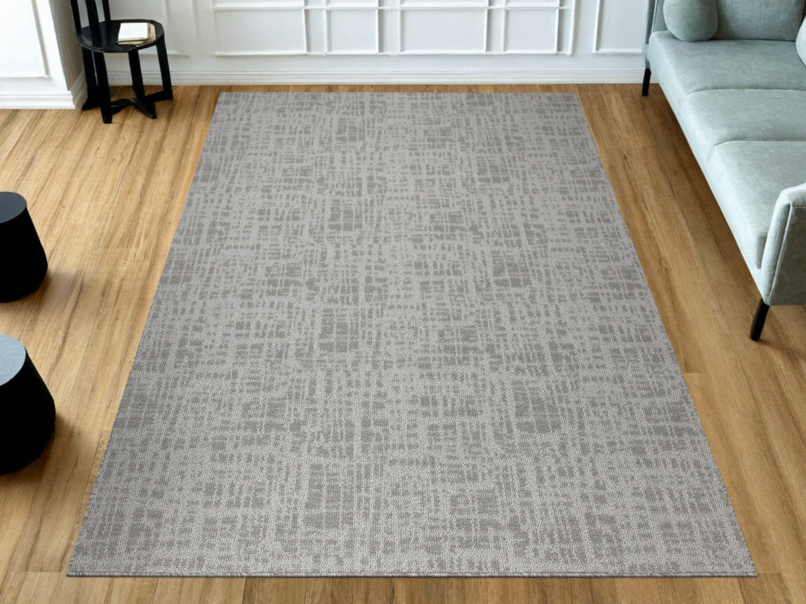 - Dywan wykonany z wykładziny pętelkowej Traffic z runem w melanżu odcieni szarości z geometrycznym wzorem nieregularnej kratki oraz ze spodem wykończonym filcem.