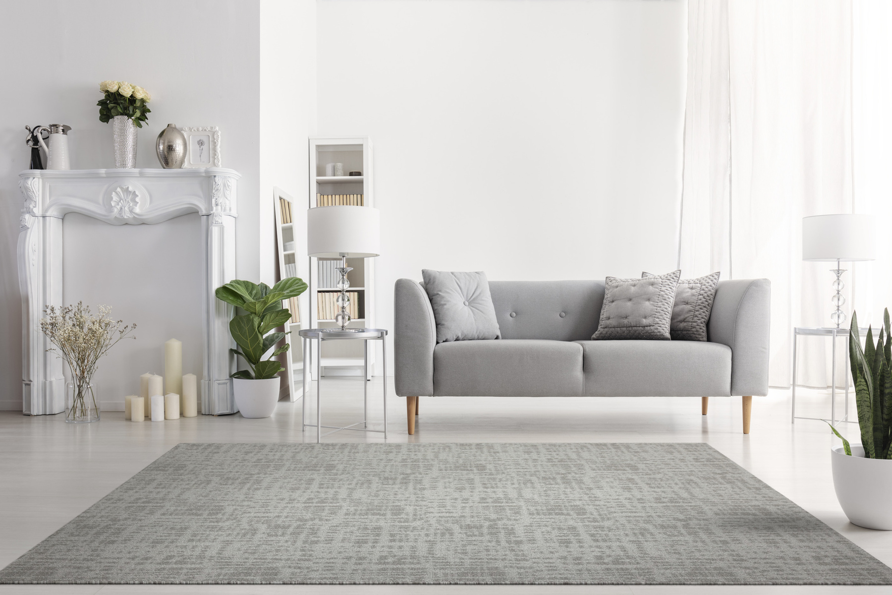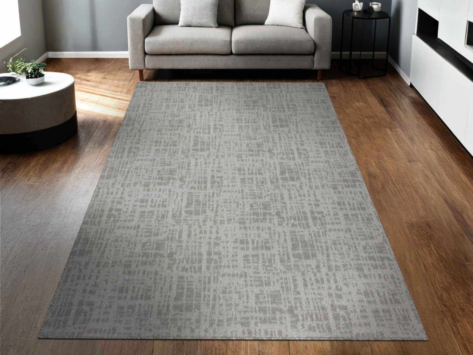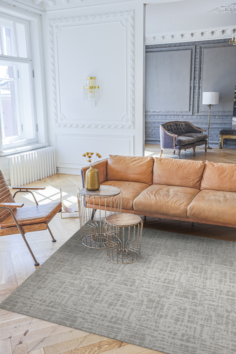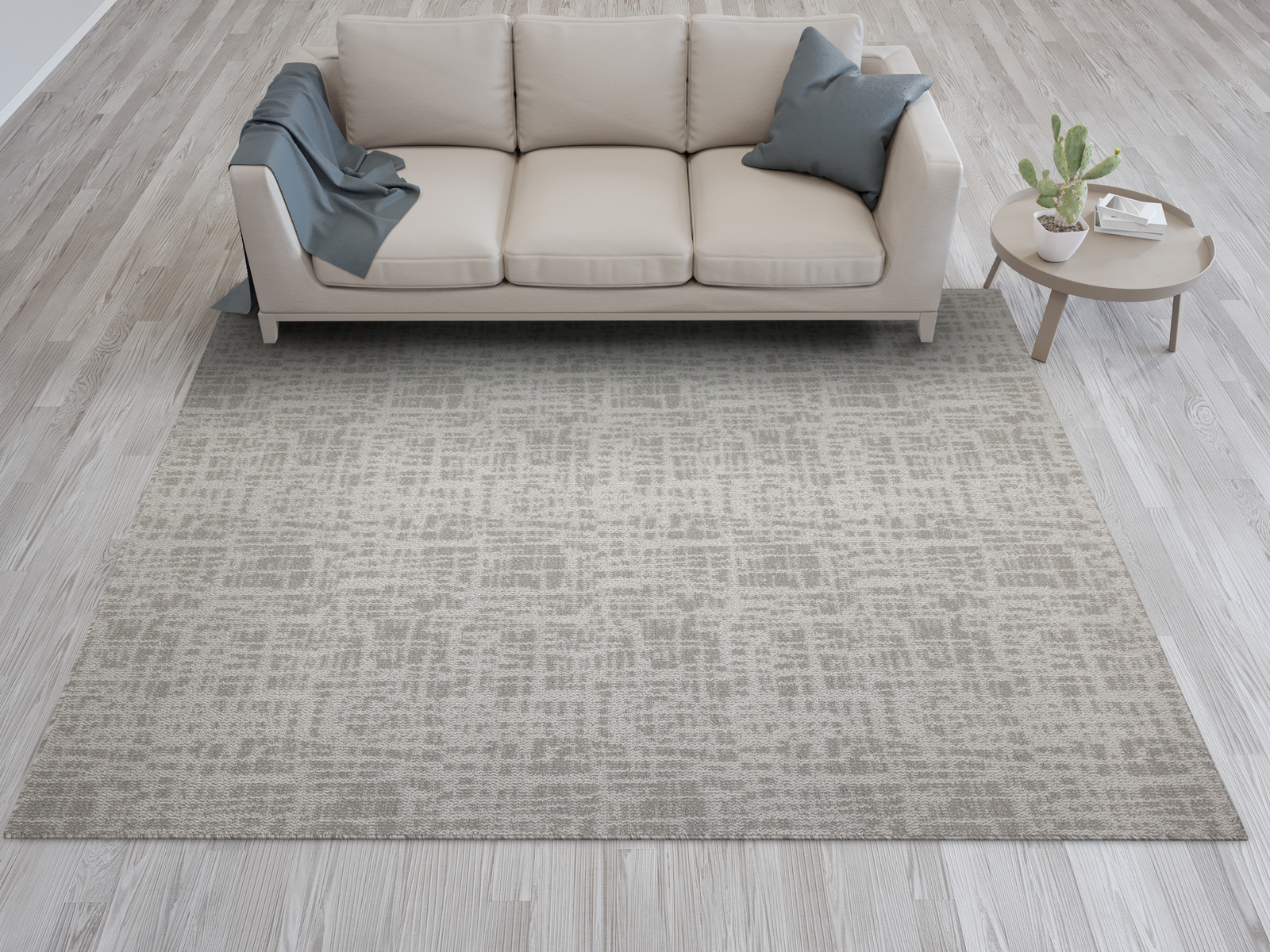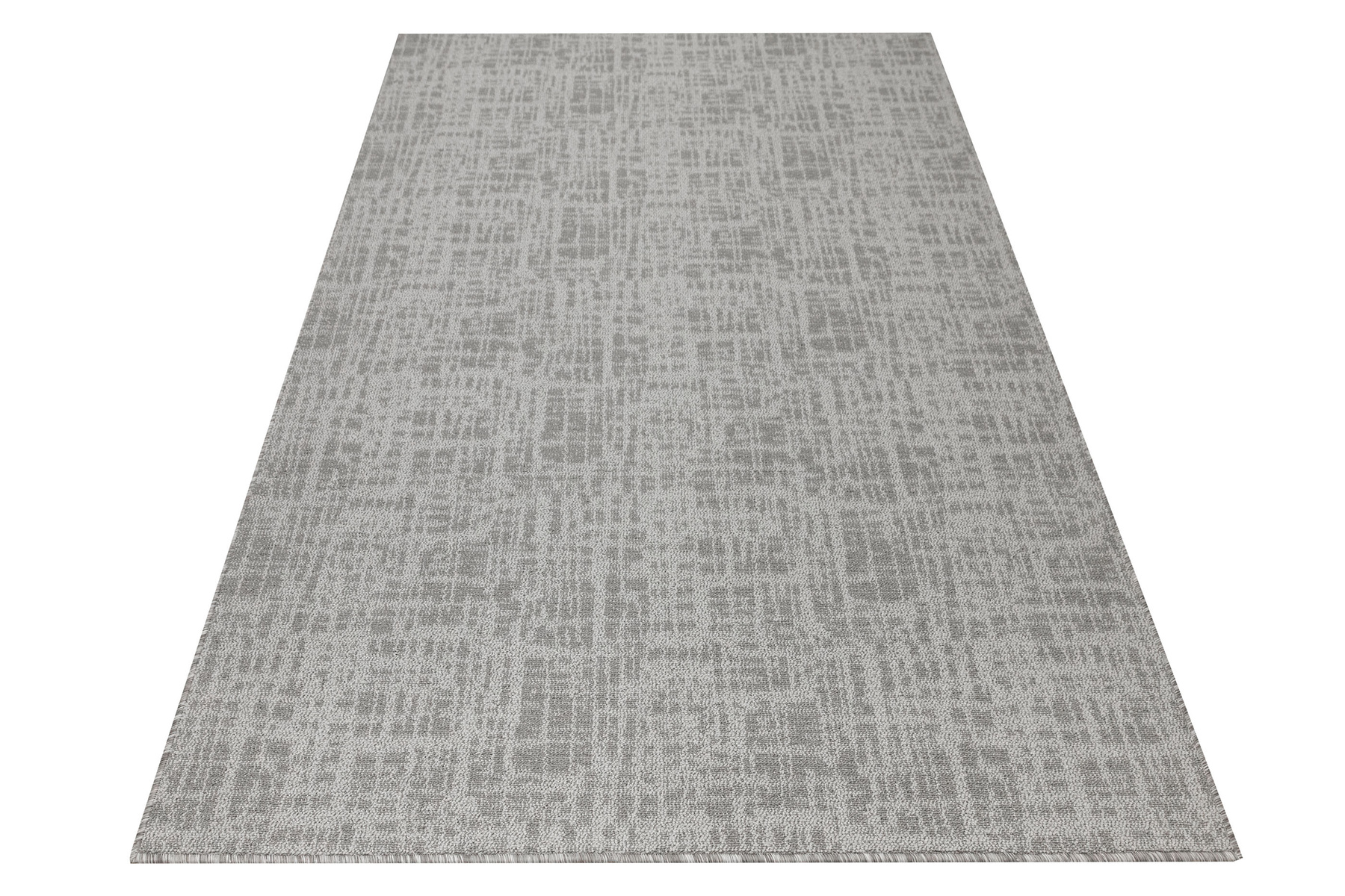 - Dywan wykonany z wykładziny pętelkowej Traffic z runem w melanżu odcieni szarości z geometrycznym wzorem nieregularnej kratki oraz ze spodem wykończonym filcem.
