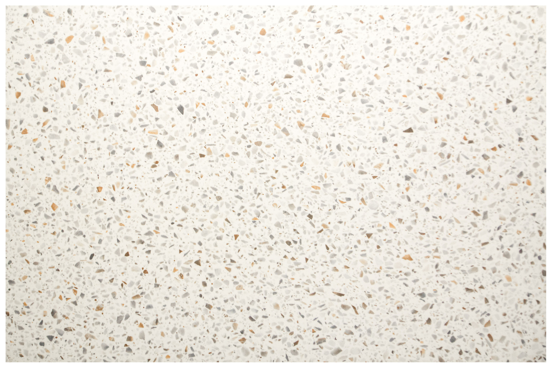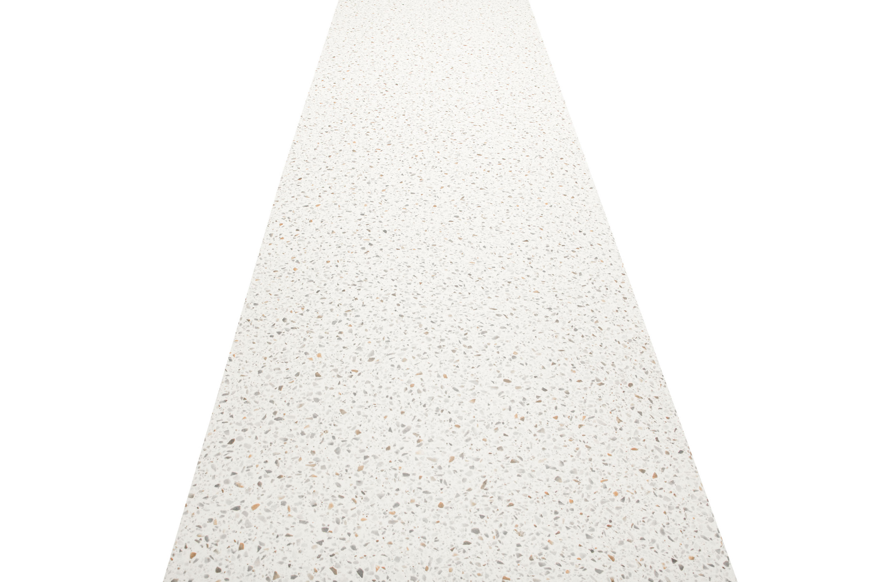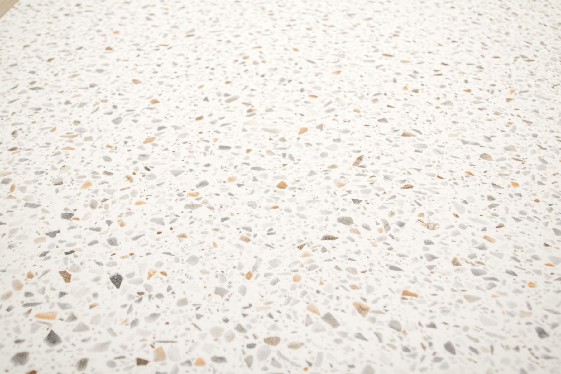 - Gruba elastyczna wykładzina podłogowa PCV Bingo Maira imitująca posadzkę lastryko w kremie z kamyczkami w odcieniach brązu, beżu i szarości.