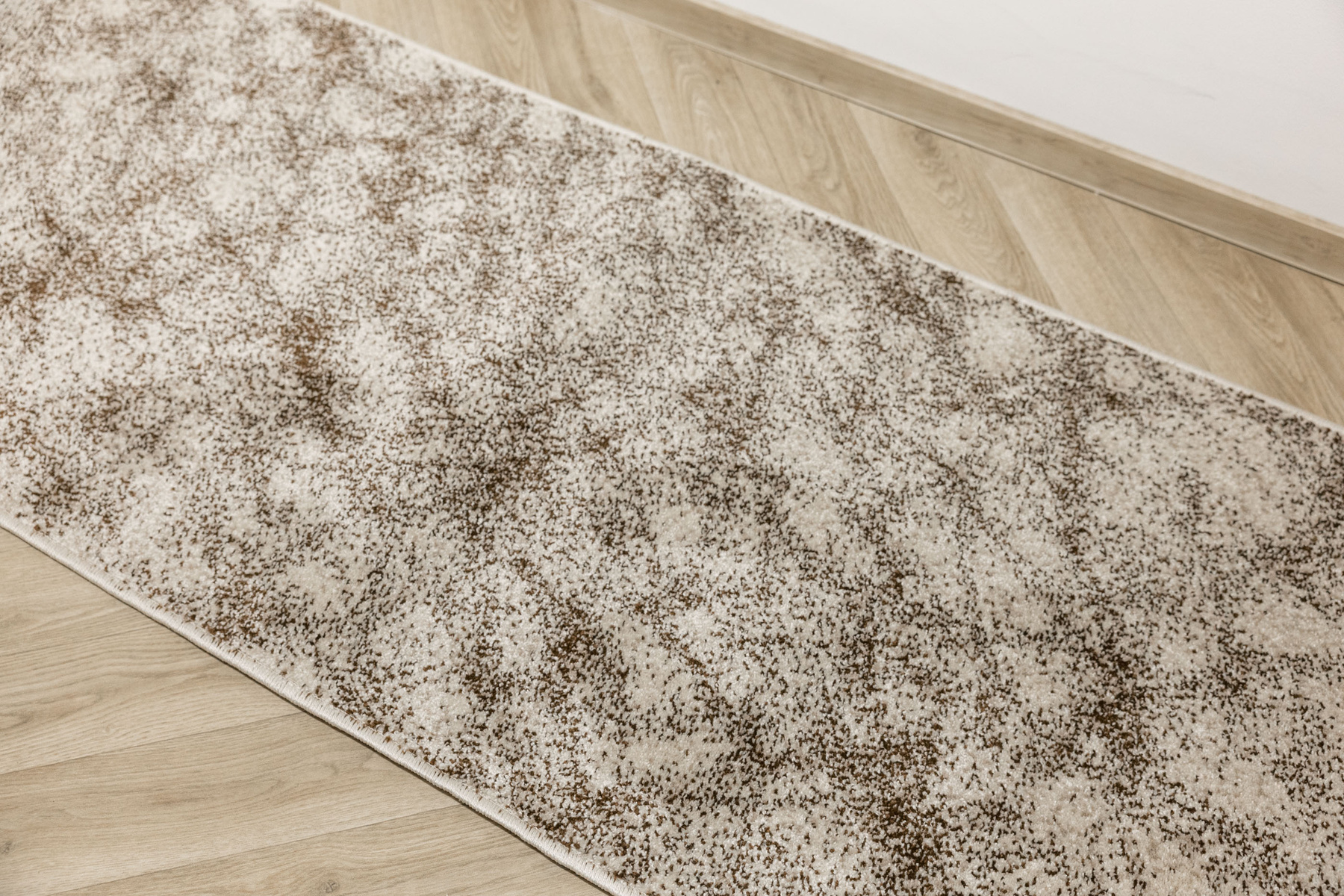 - Chodnik dywanowy Cappuccino z miękkim runem o wzorze imitującym fakturę marmuru w melanżu odcieni beżu, kremu i brązu, ze spodem wykończonym jutą.