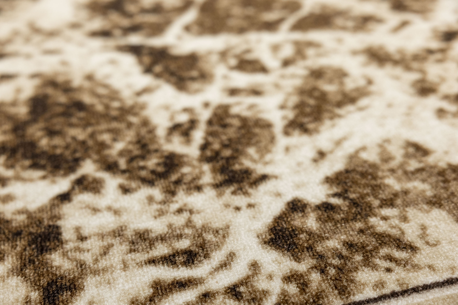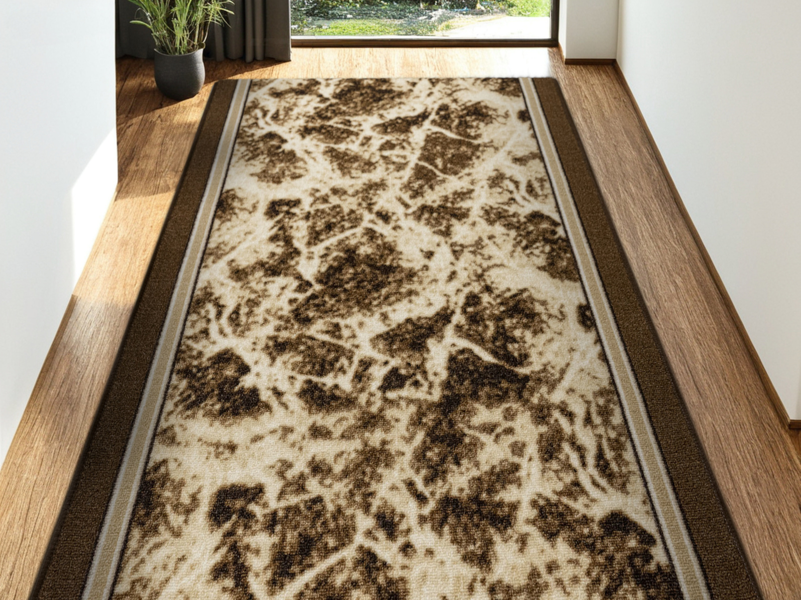 - Chodnik antypoślizgowy Terroso z niskim pętelkowym poliamidowym runem o wzorze imitującym fakturę marmuru w odcieniach beżu, brązu z akcentami kremu z borderami oraz podgumowanym spodem.