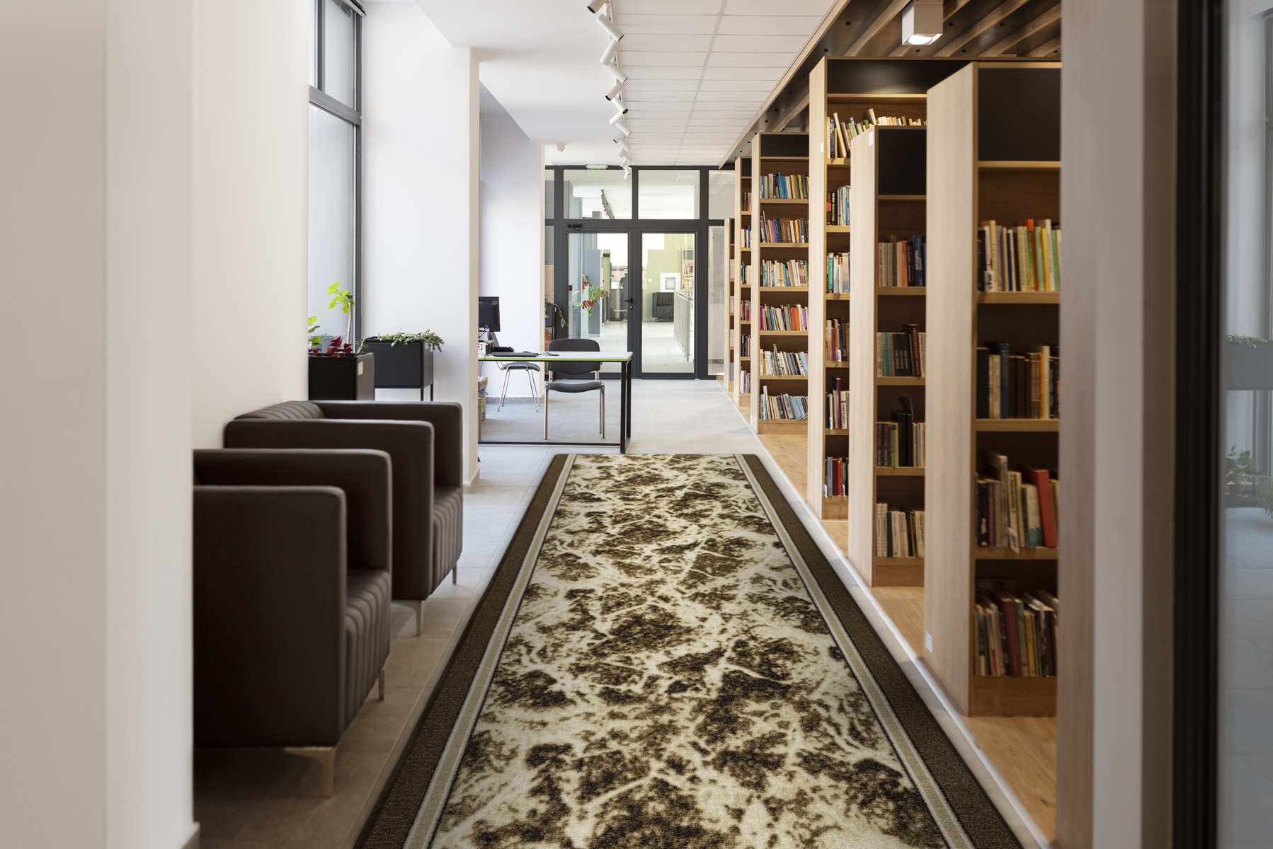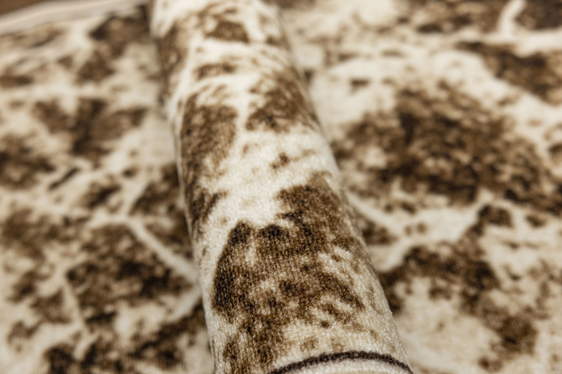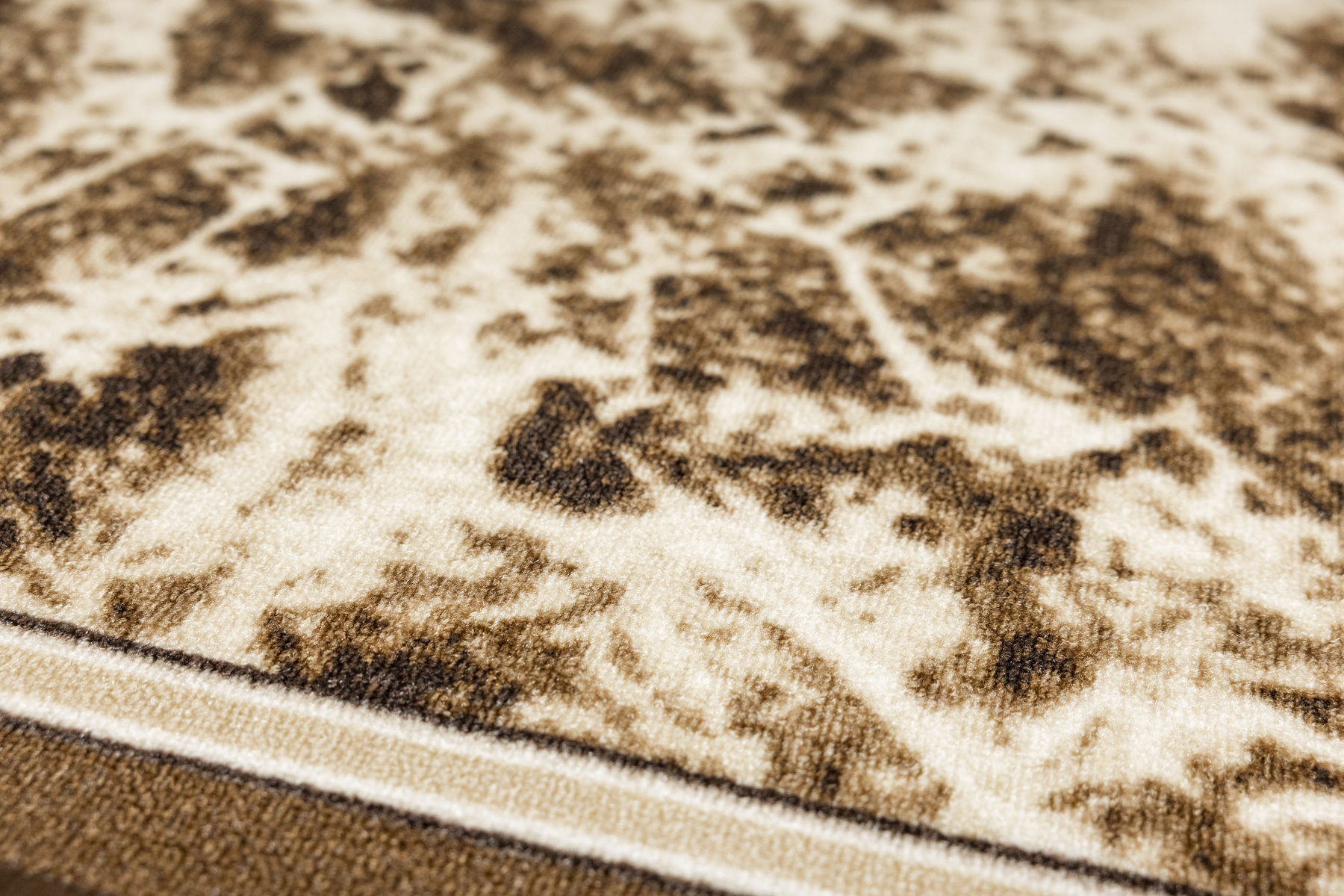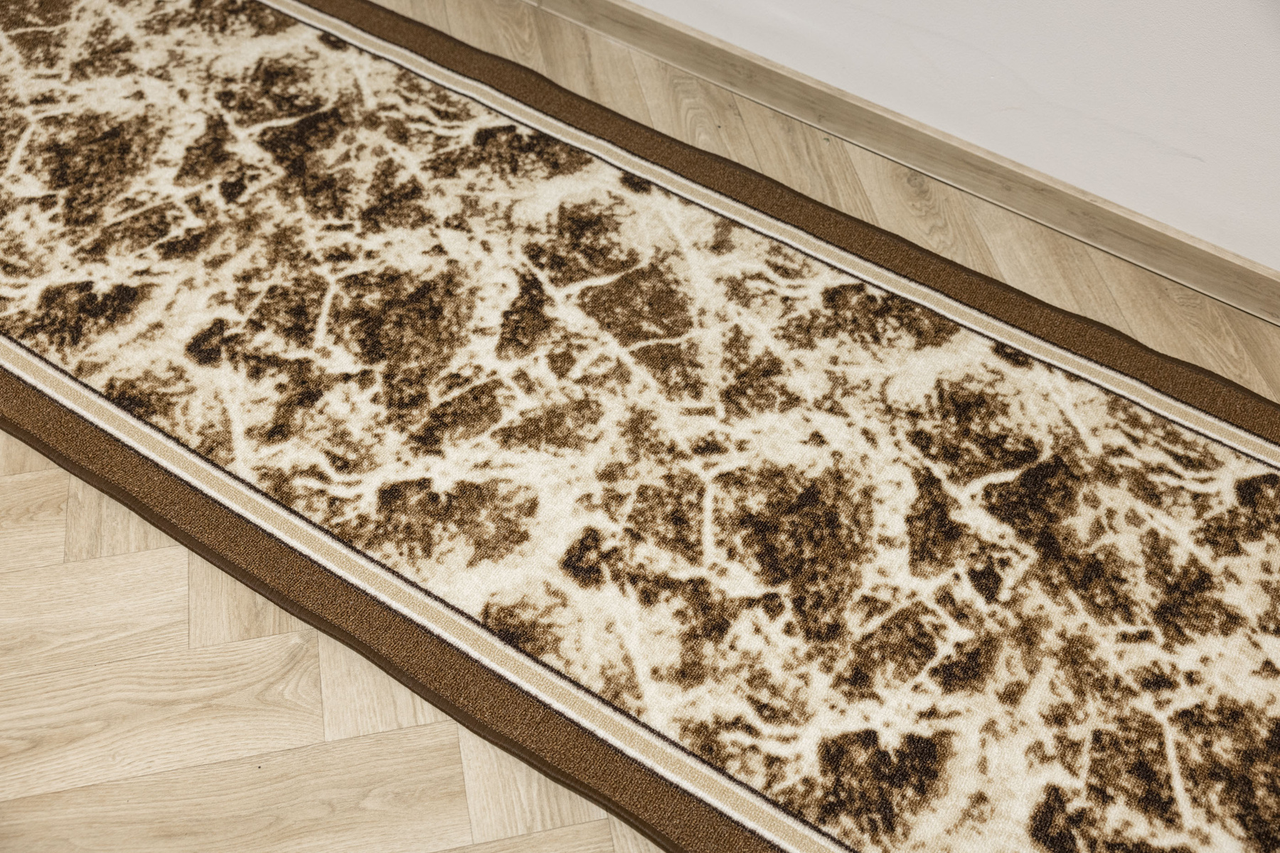 • Chodnik antypoślizgowy Terroso z niskim pętelkowym poliamidowym runem o wzorze imitującym fakturę marmuru w odcieniach beżu, brązu z akcentami kremu z borderami oraz podgumowanym spodem.