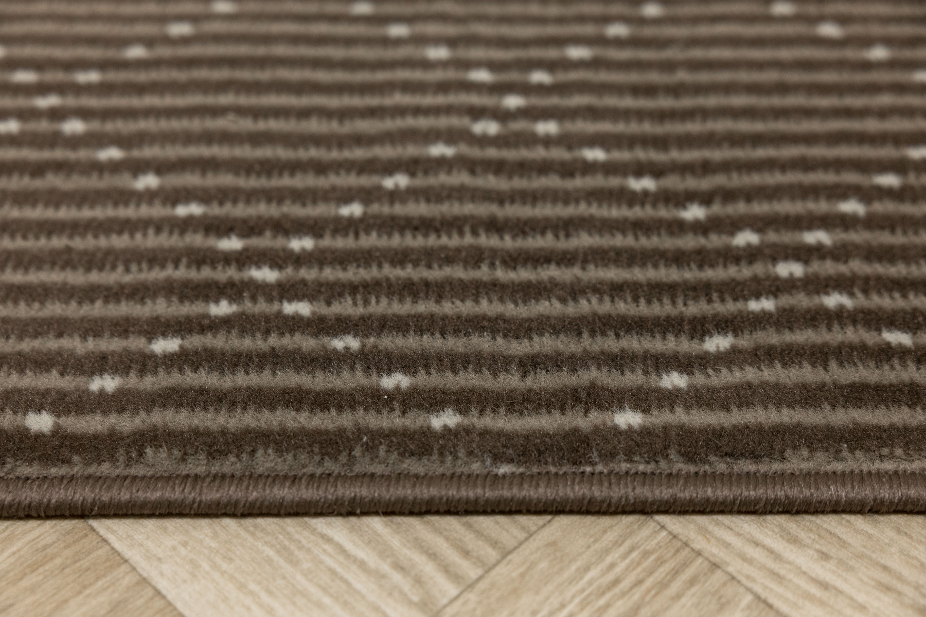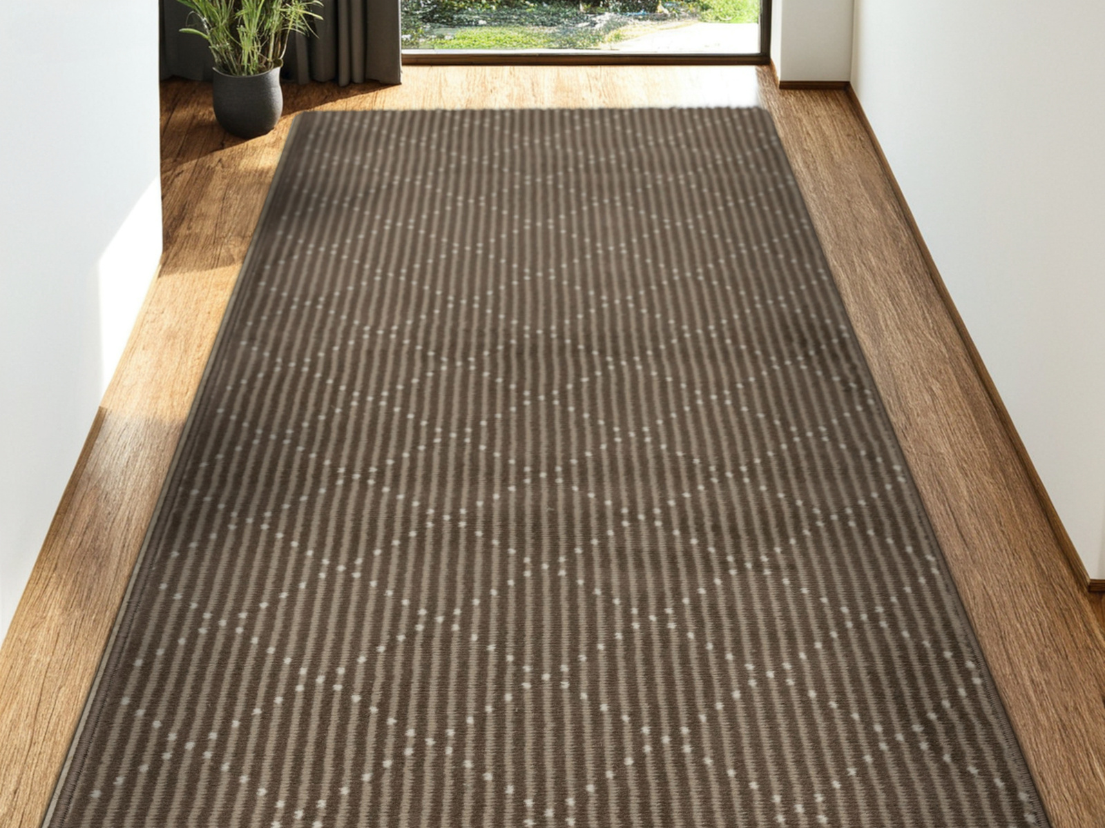 • Chodnik dywanowy Luna choco z miękkim runem ze wzorem geometrycznym w romby, paski w praktycznych i eleganckich odcieniach brązu, beżu oraz akcentami kremu o spodzie wykończonym jutą.