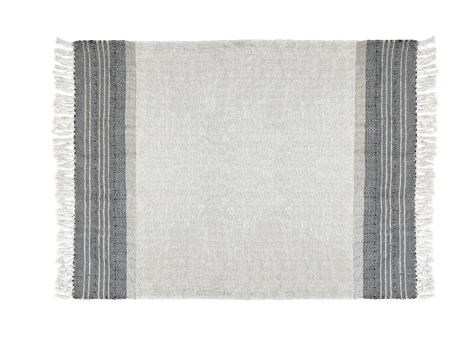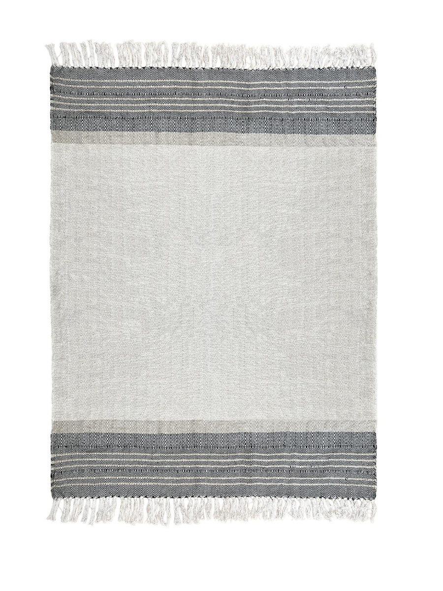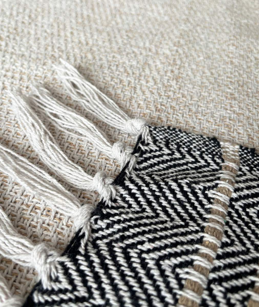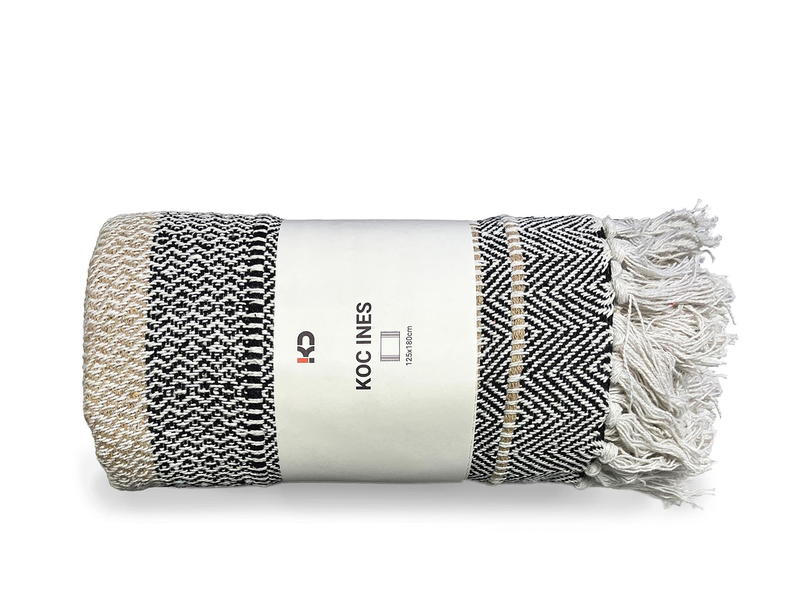 - Bawełniany koc z kolekcji Ines w odcieniach beżu, kremu i antracytu z delikatnym, ciekawym plecionym wzorem o elementach etnicznych typu zygzaki i romby. Krańce zakończone frędzelkami.