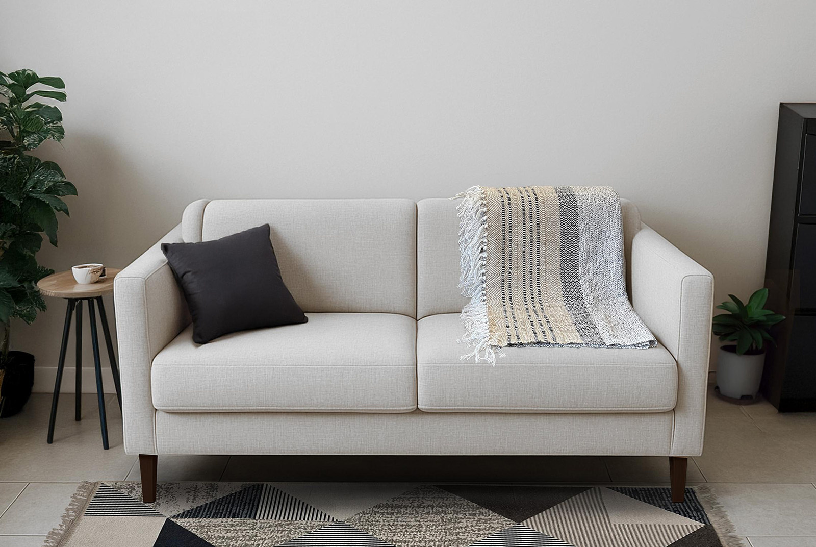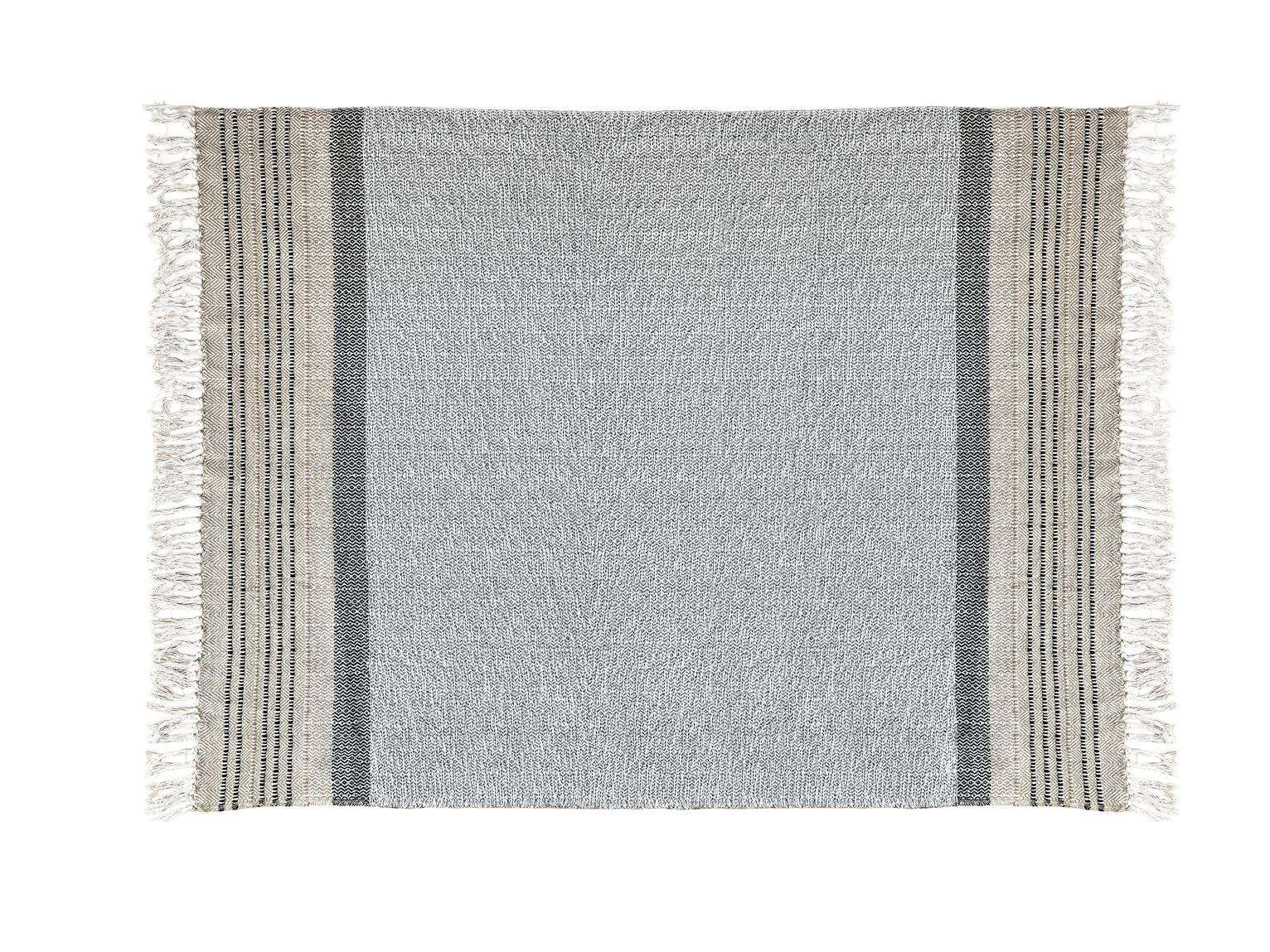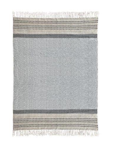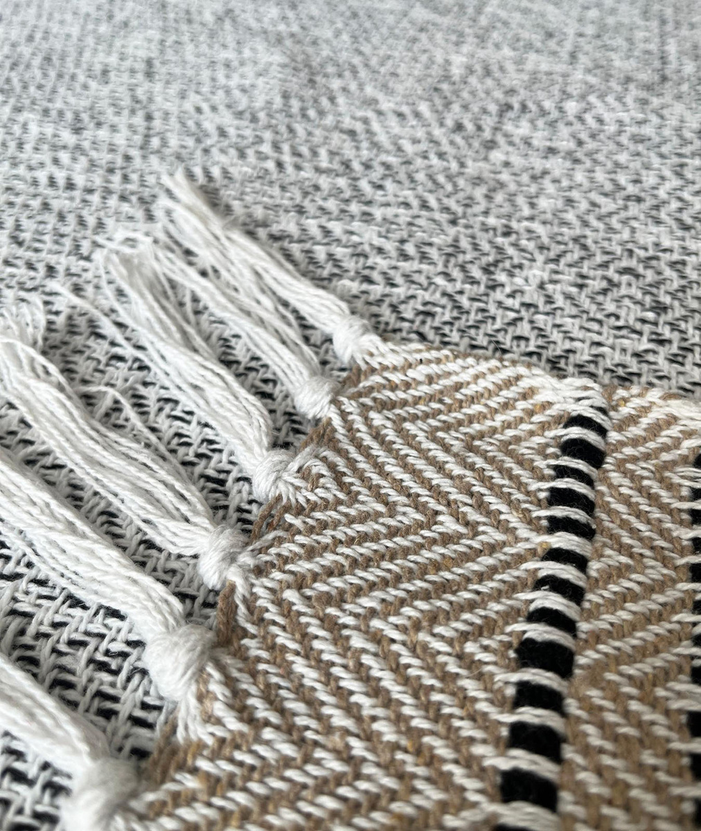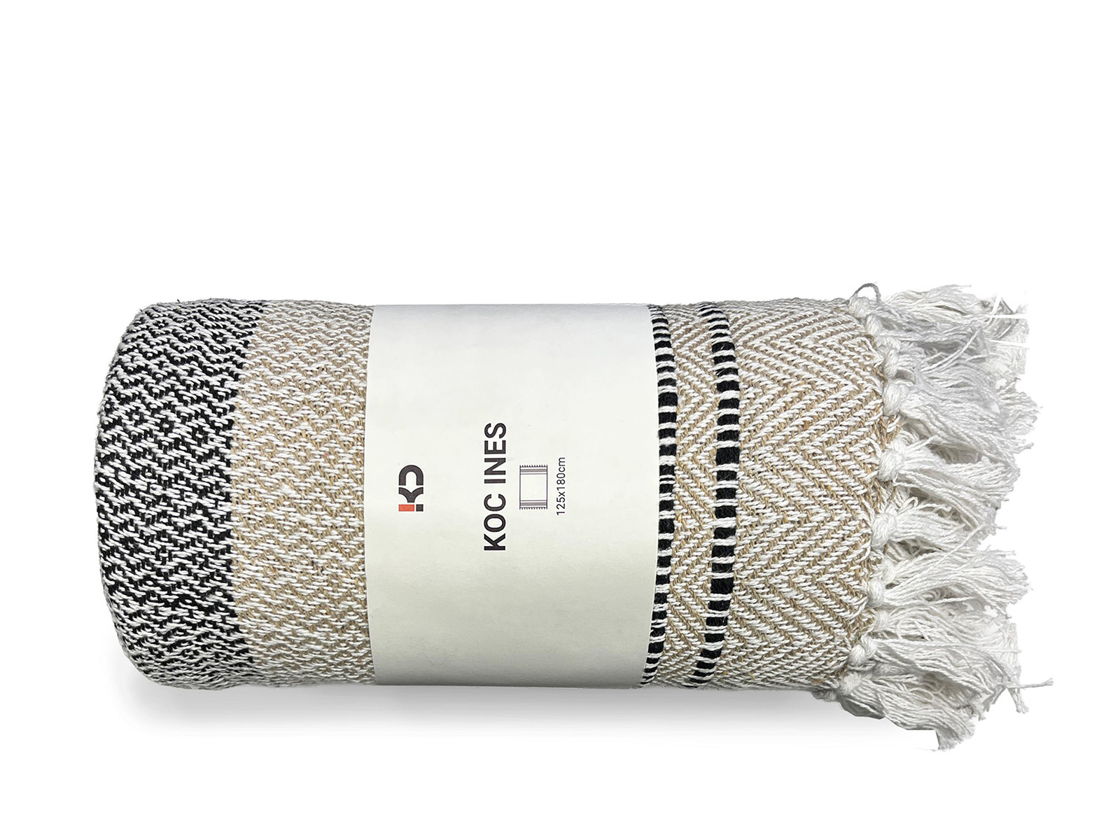- Bawełniany koc z kolekcji Ines w odcieniach beżu, kremu, szarości i antracytu z delikatnym, ciekawym plecionym wzorem o elementach etnicznych typu zygzaki i romby. Krańce zakończone frędzelkami.