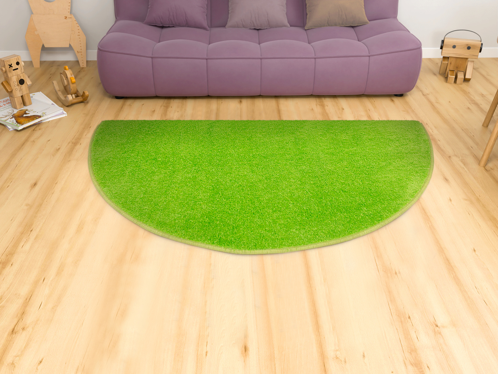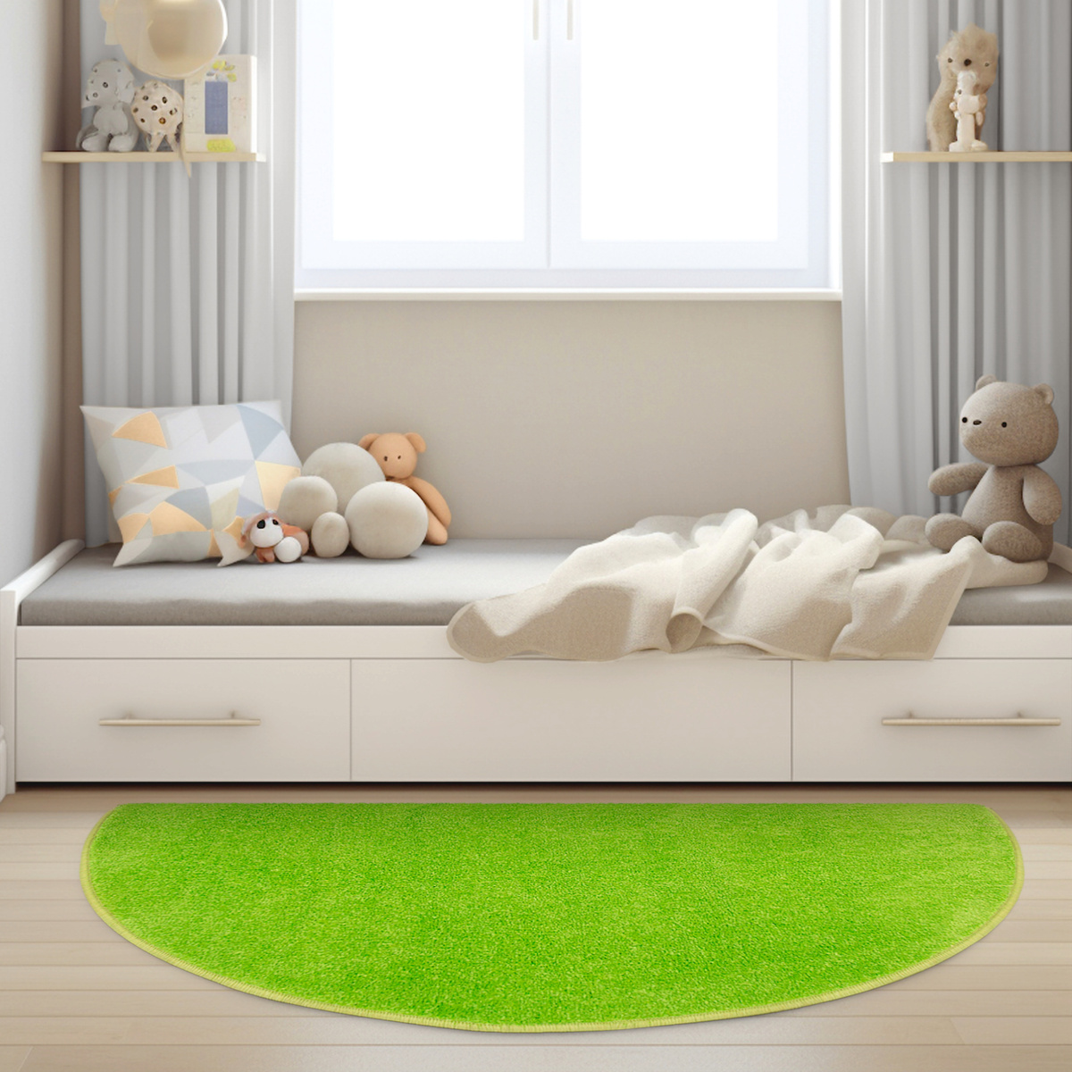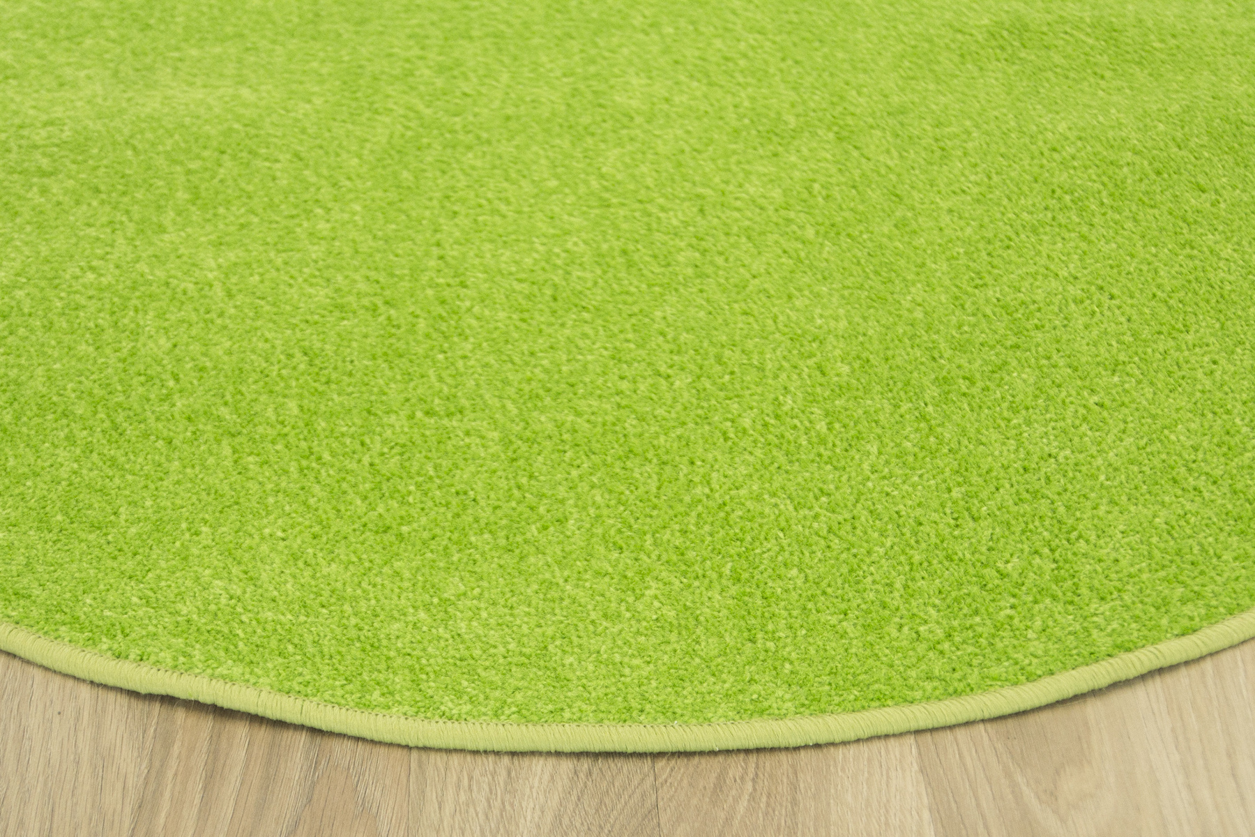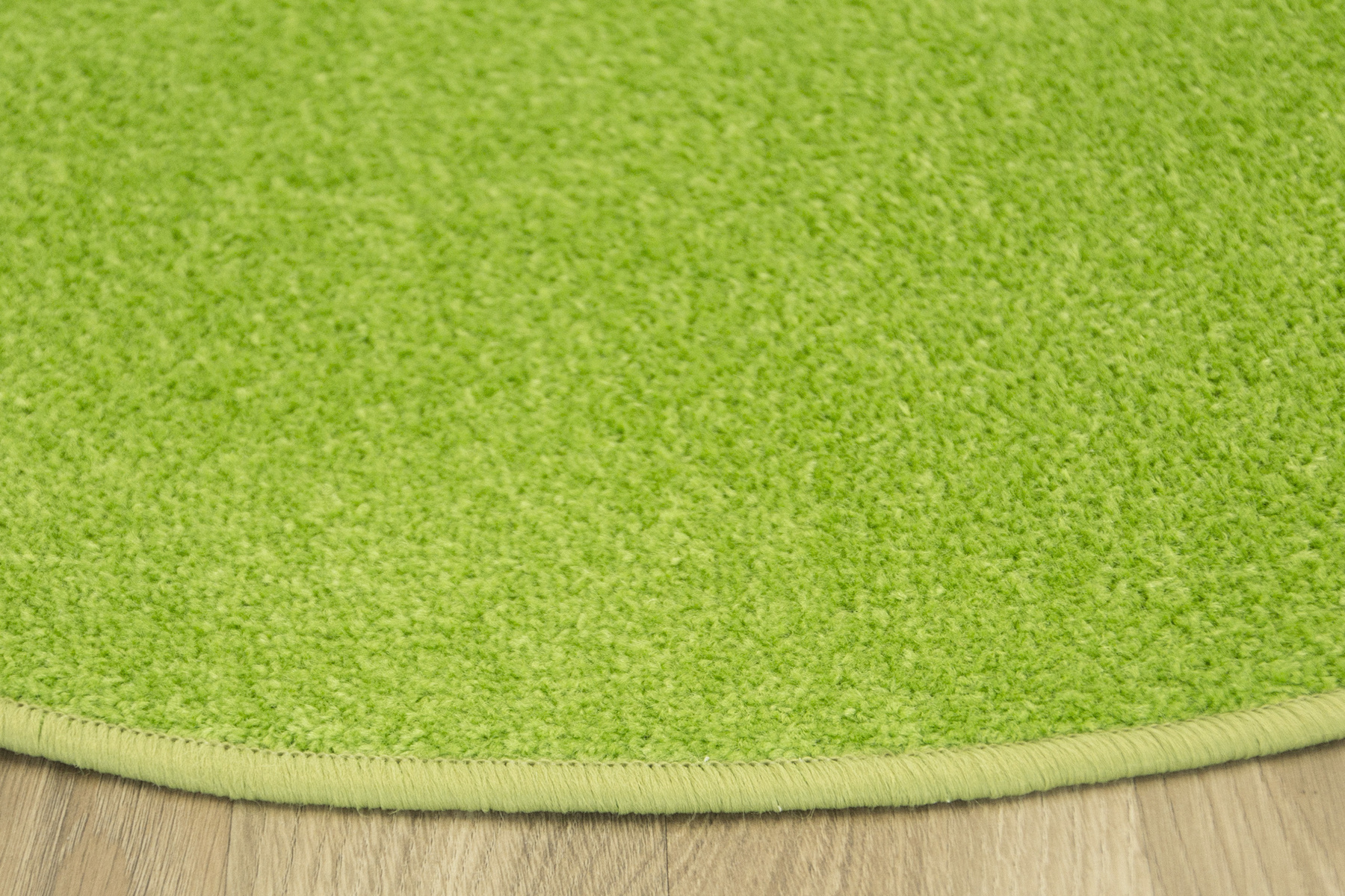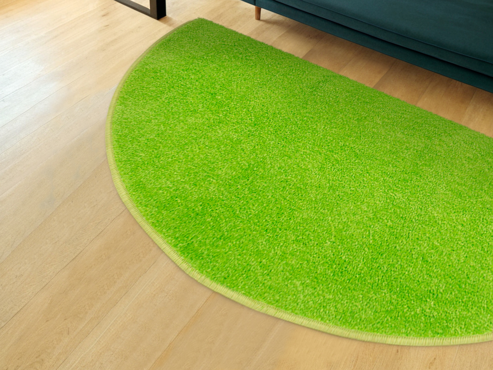• Dywan półokrągły z wykładziny Dynasty o niskim, praktycznym runie ciętym typu saxon w odcieniu jasnej seledynowej zieleni i spodem wykończonym filcem - idealny dodatek do przedszkoli, pokojów dziecięcych i bawialni.