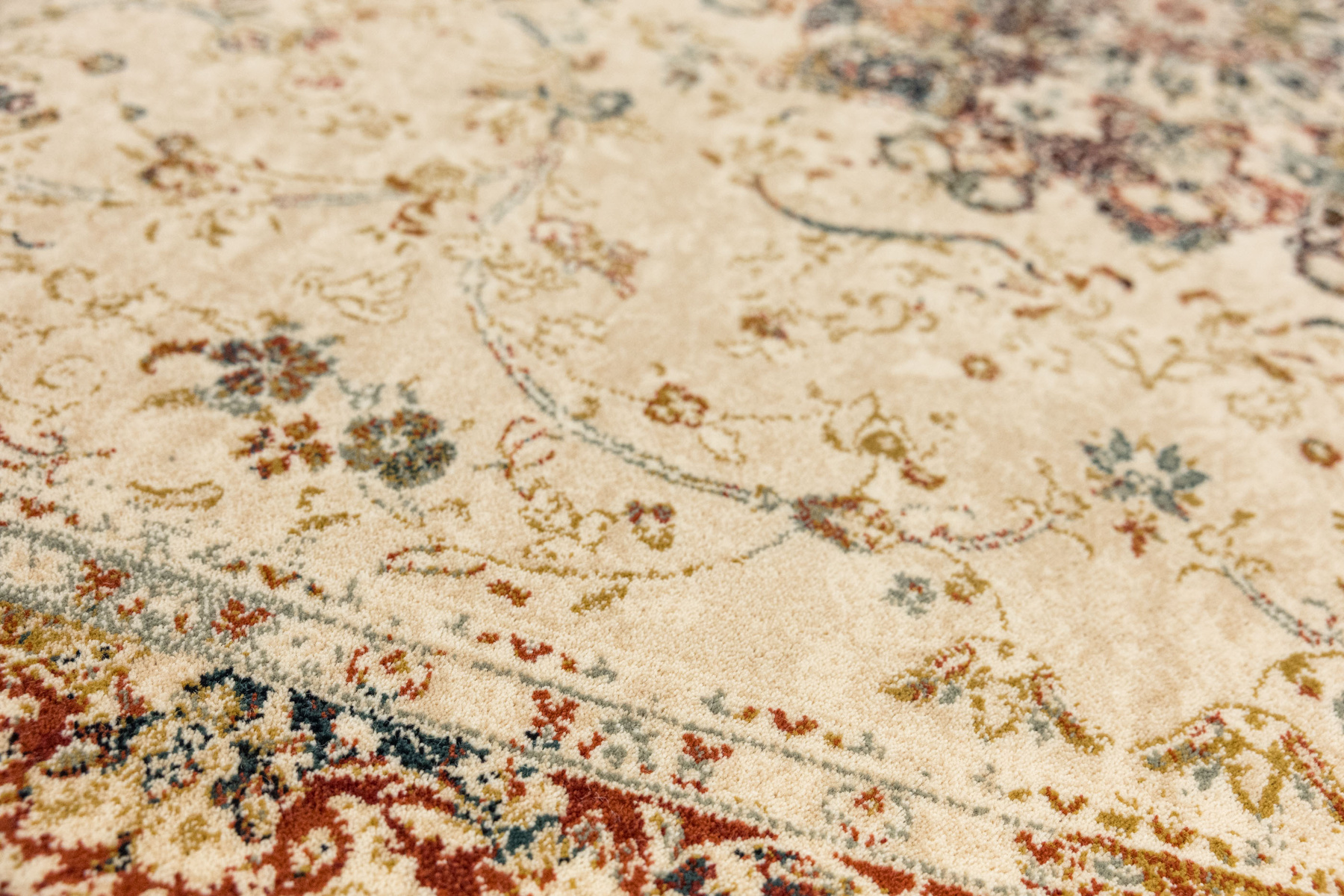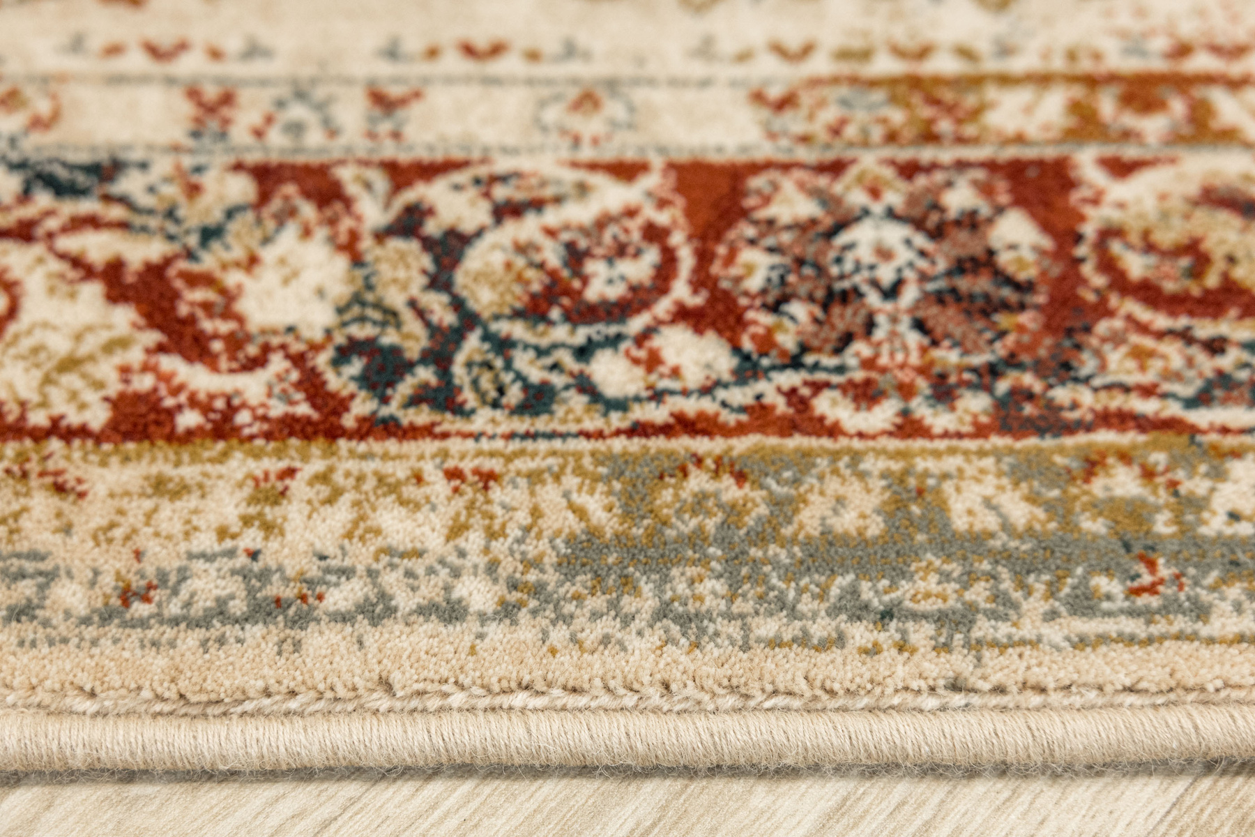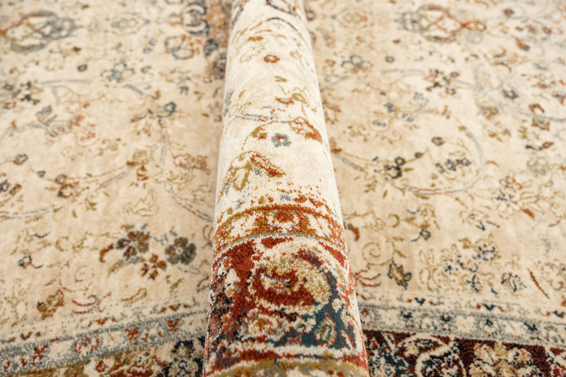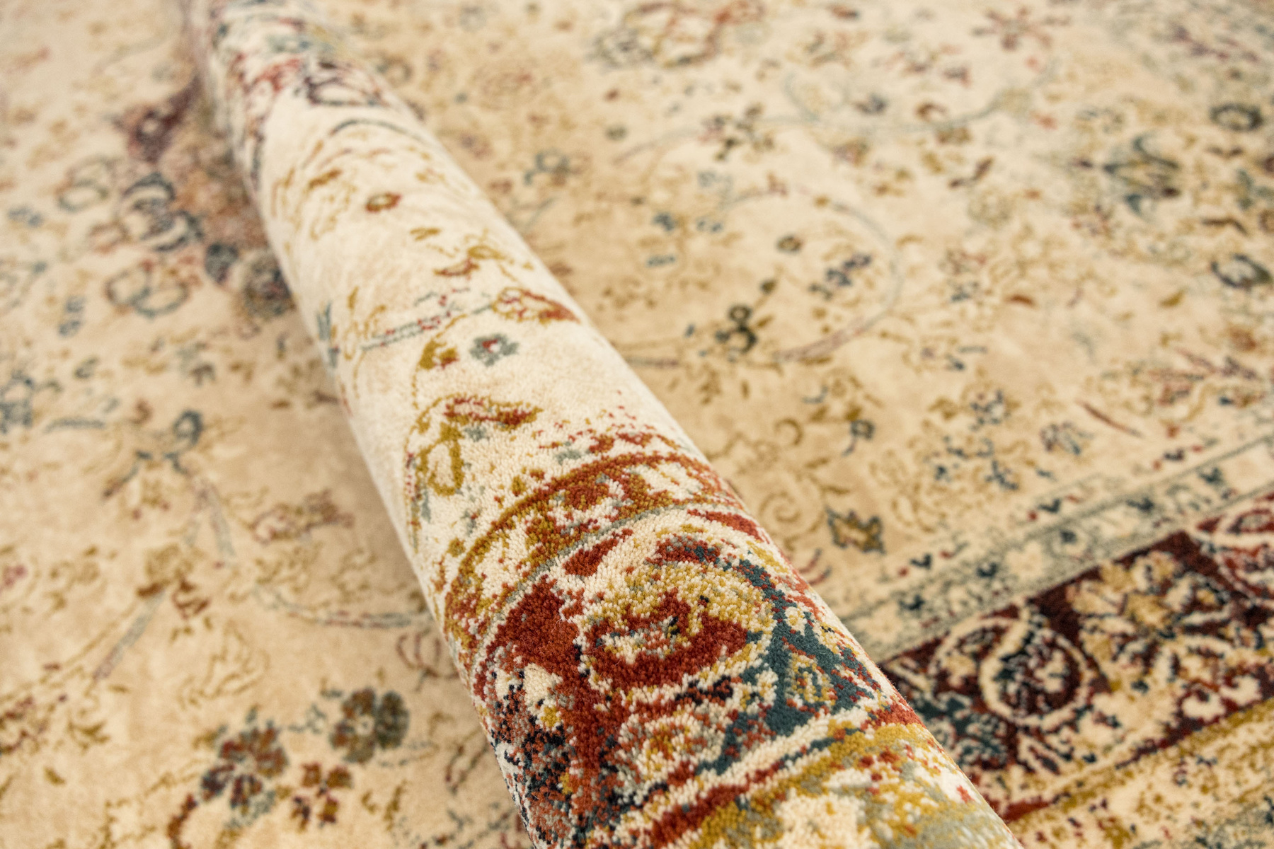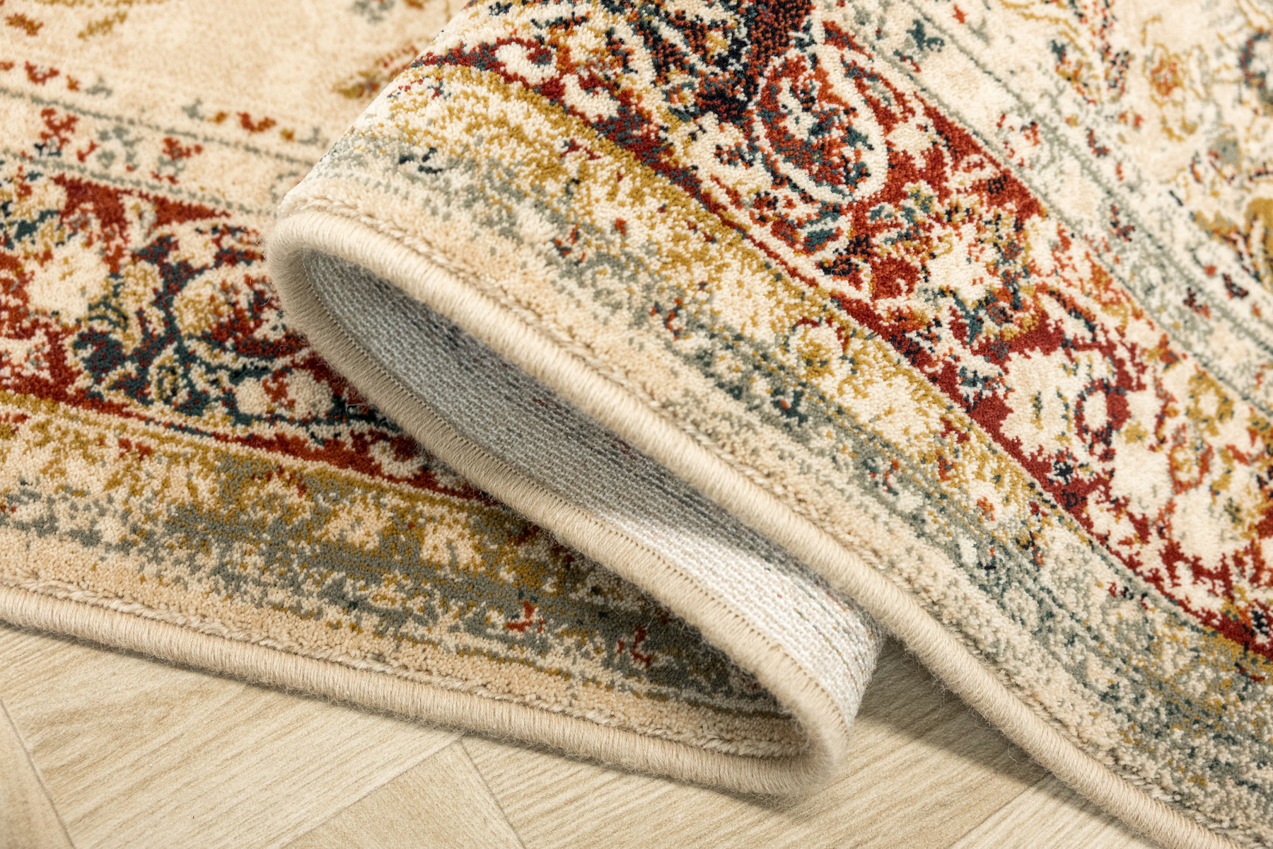 - Luksusowy dywan Omega Kordoba Kniak wykonany z wełny, z runem o klasycznym wzorze ornamentowym z w odcieniach beżu, kremu z akcentami w butelkowej, oliwkowej zieleni, czerwieni i czerni oraz spodem wykończonym jutą.