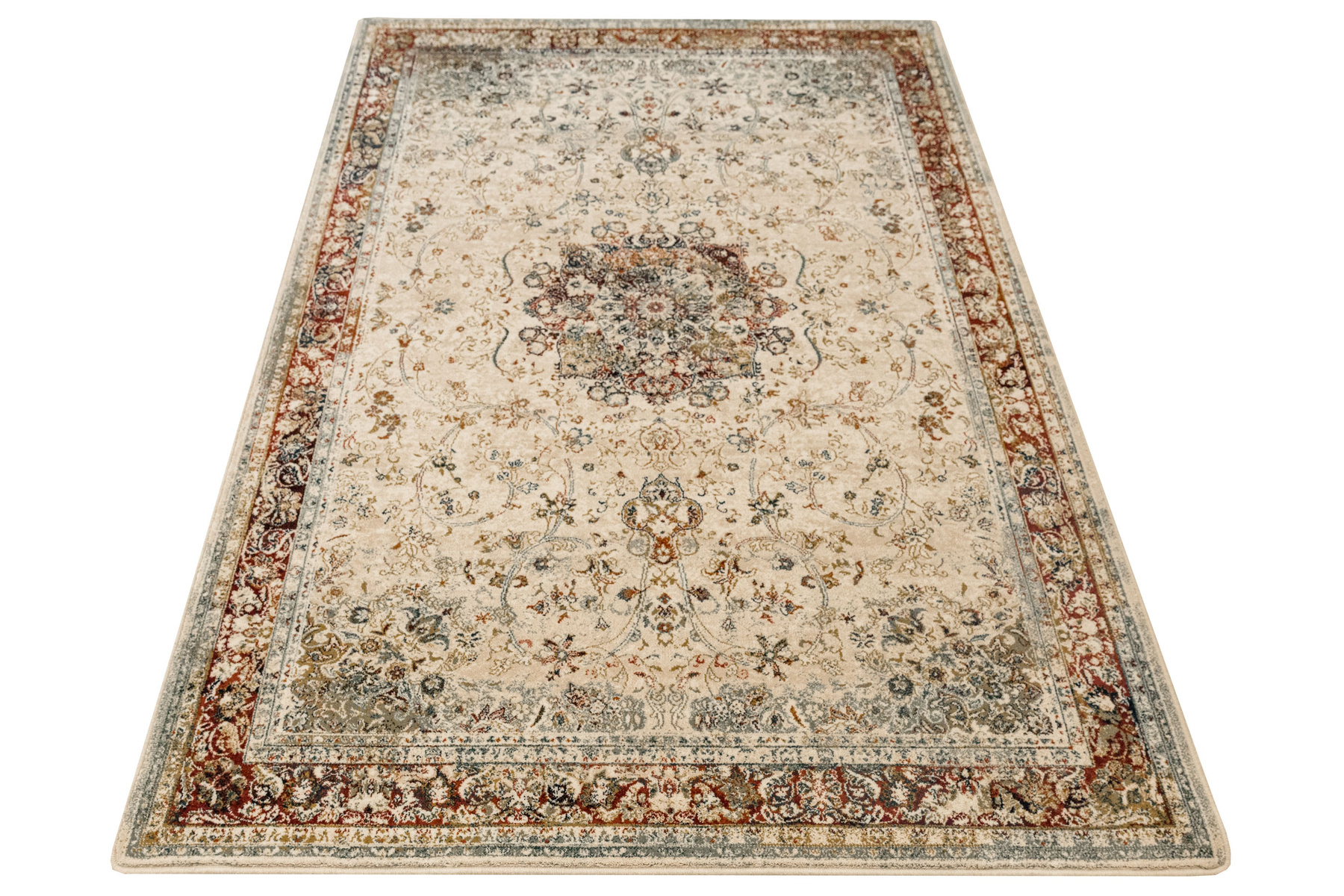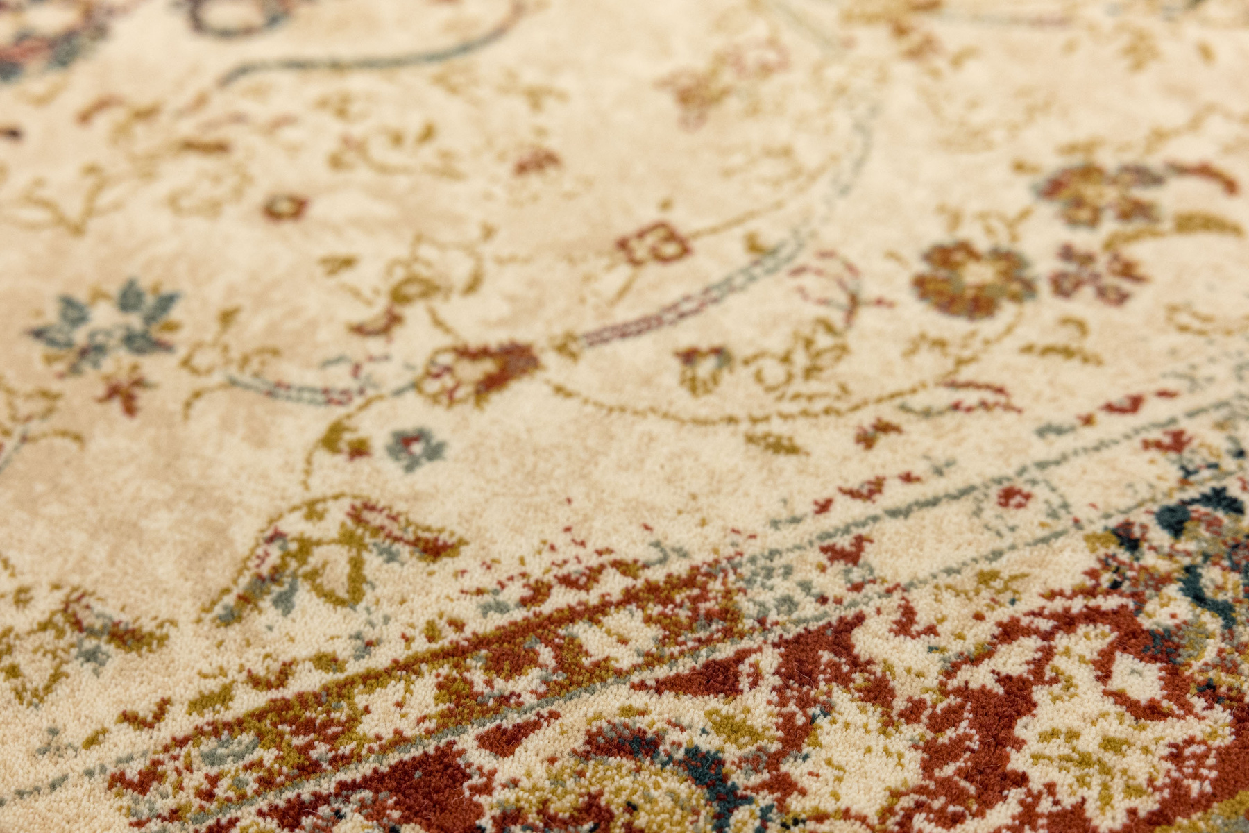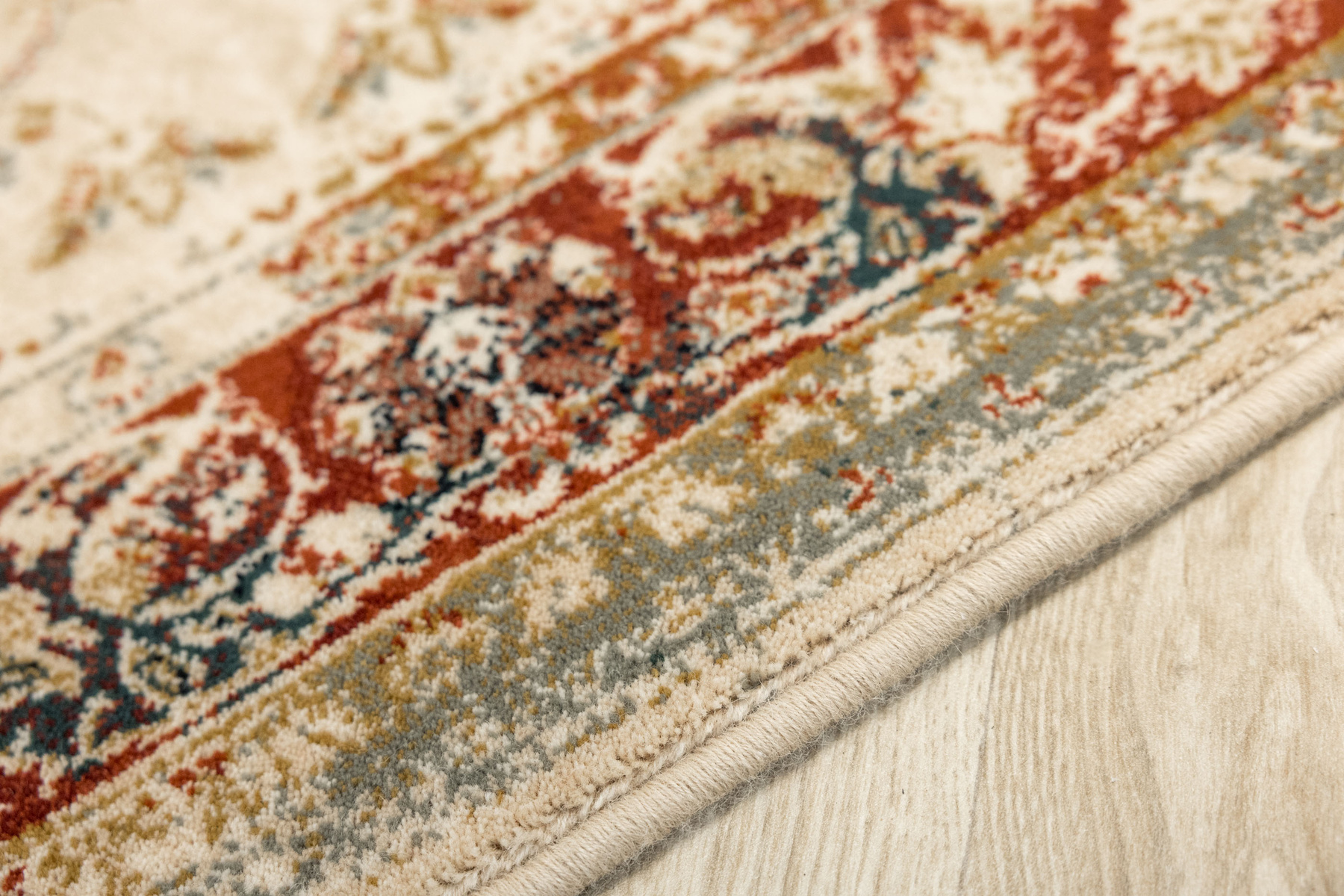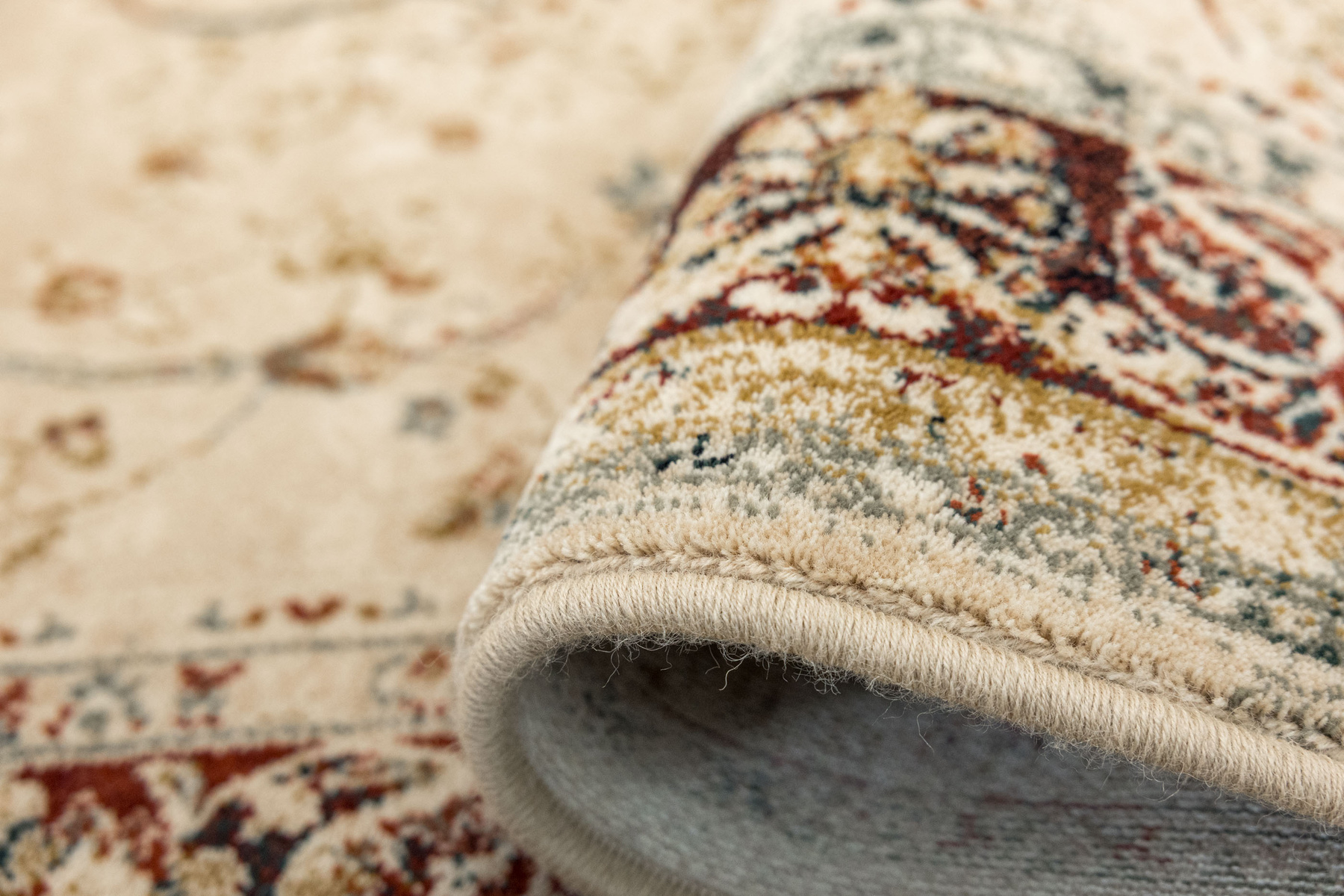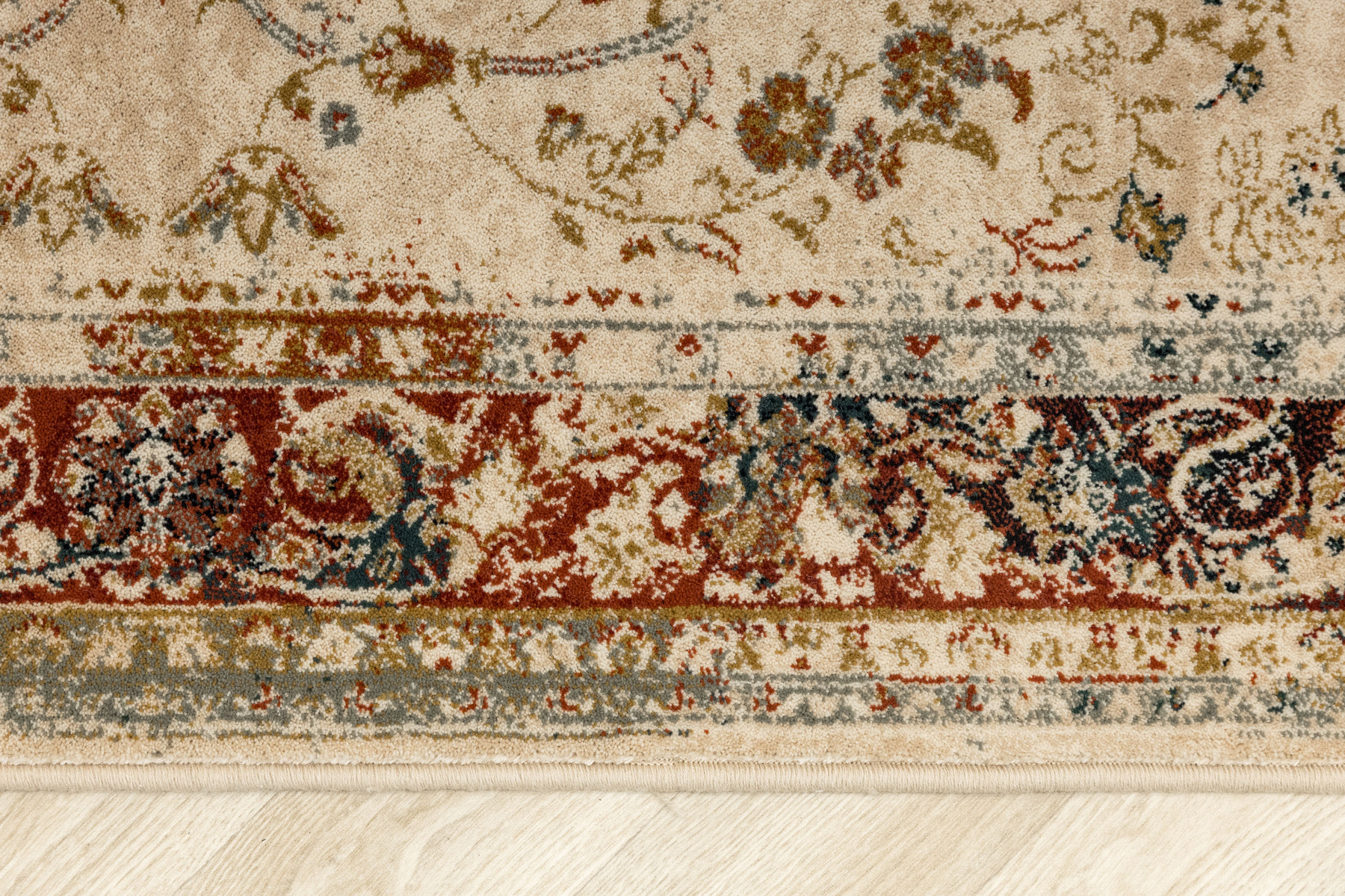 - Luksusowy dywan Omega Kordoba Kniak wykonany z wełny, z runem o klasycznym wzorze ornamentowym z w odcieniach beżu, kremu z akcentami w butelkowej, oliwkowej zieleni, czerwieni i czerni oraz spodem wykończonym jutą.