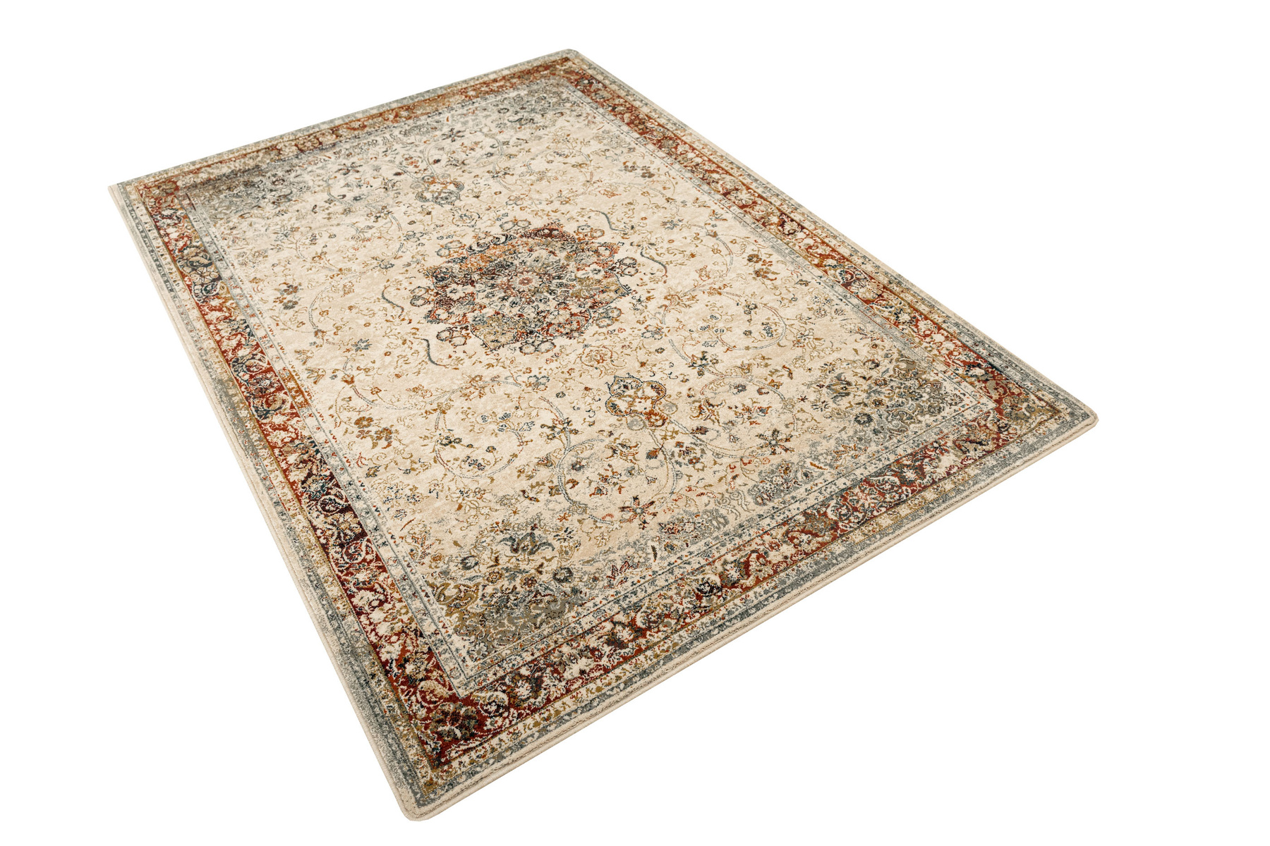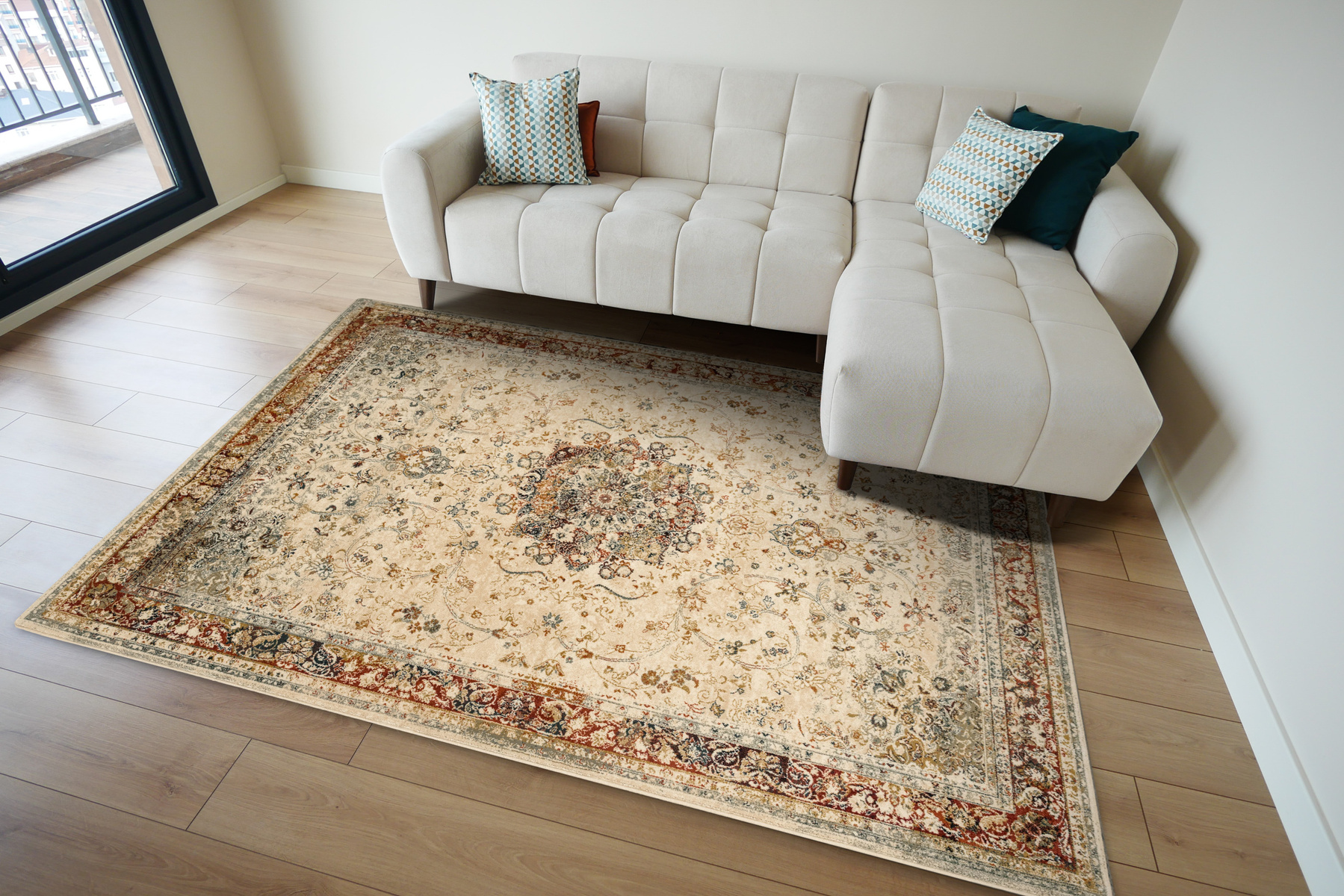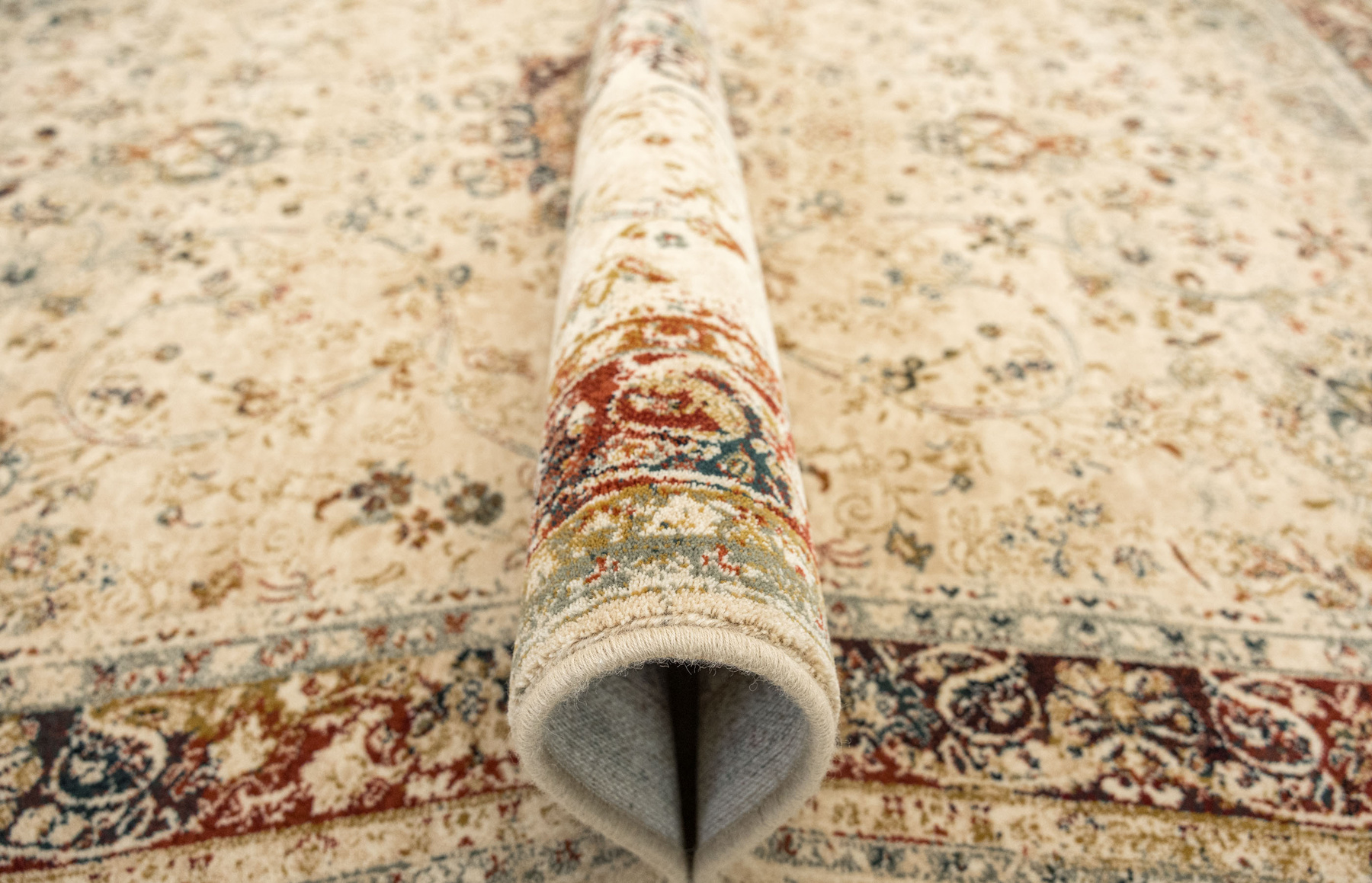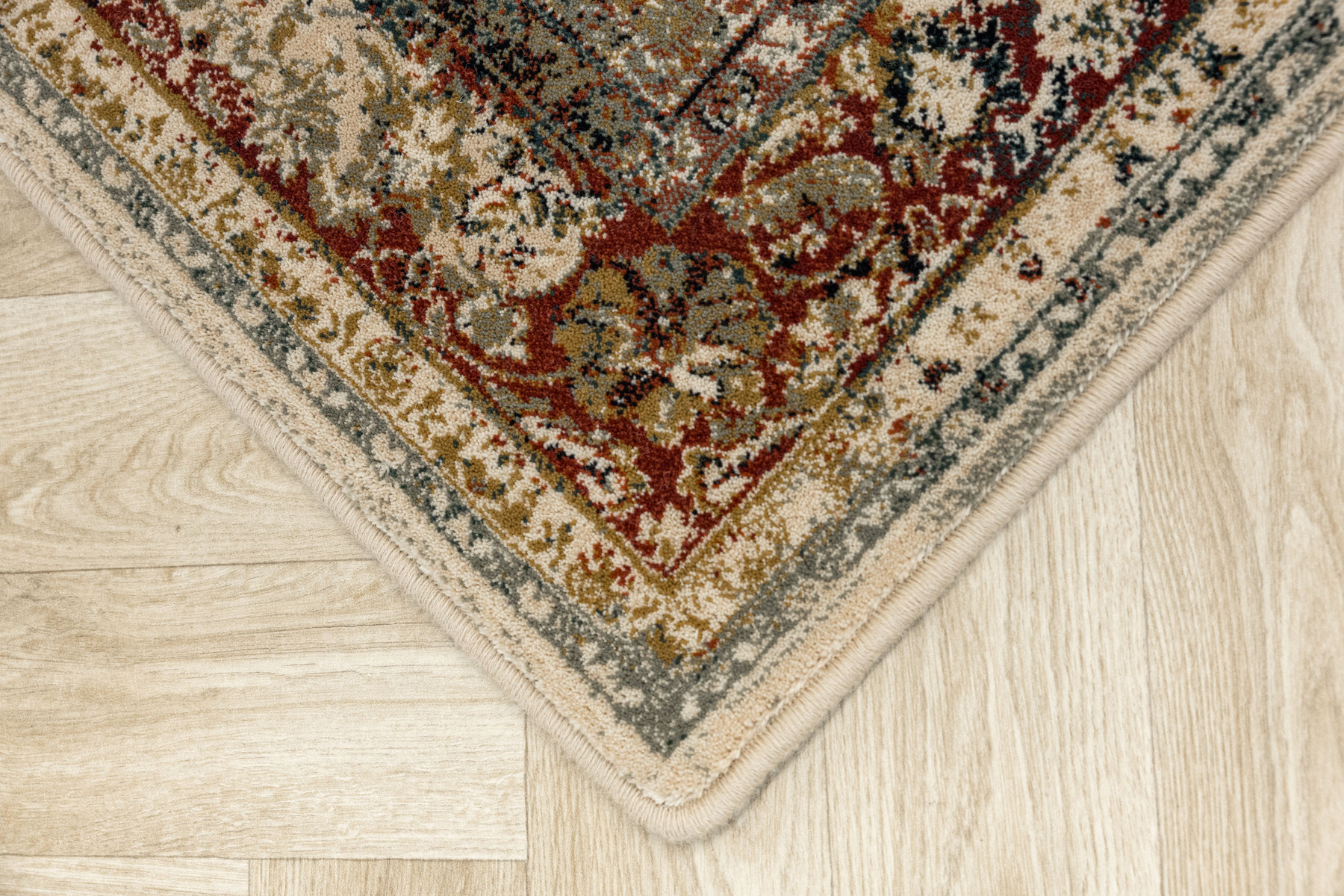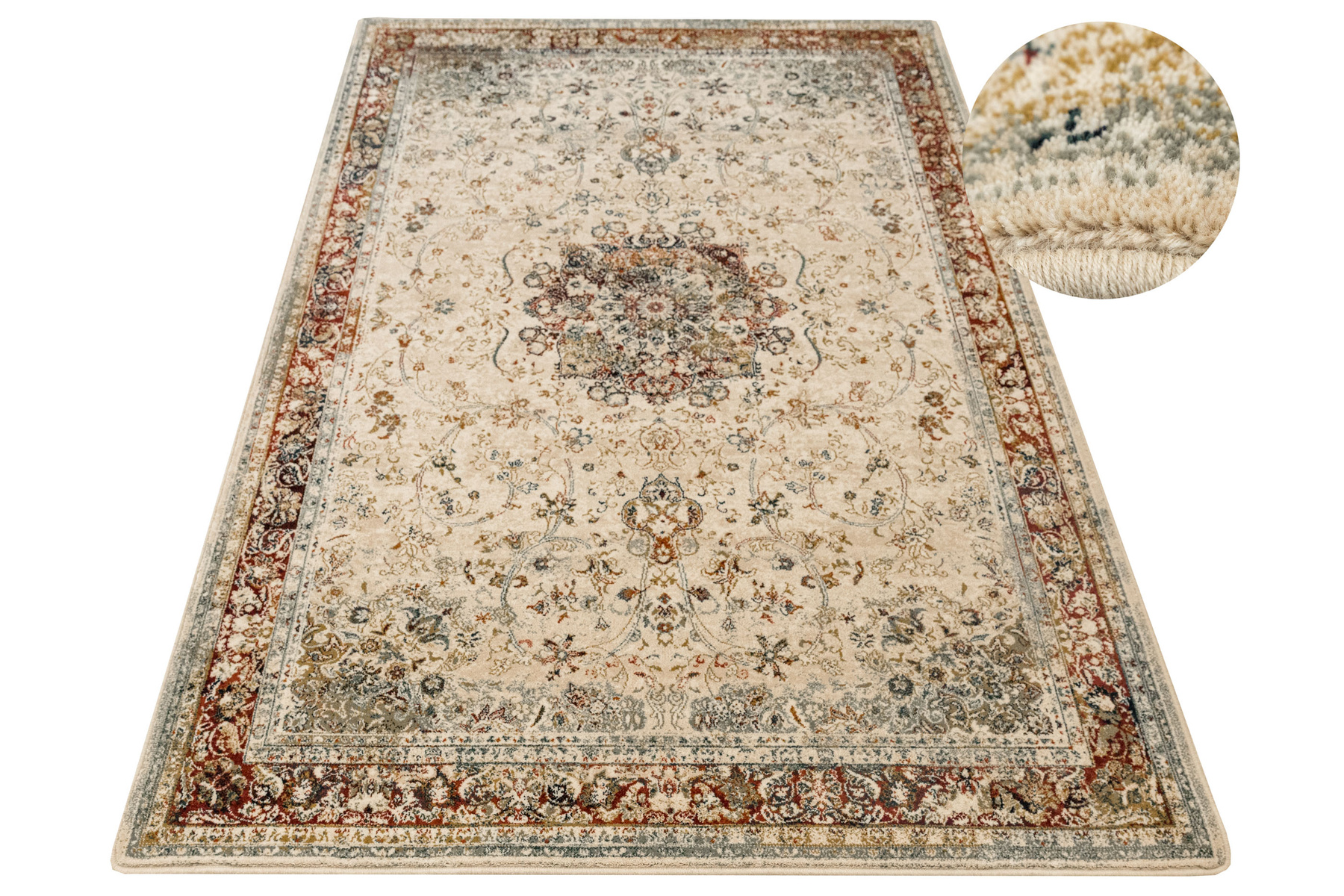 - Luksusowy dywan Omega Kordoba Kniak wykonany z wełny, z runem o klasycznym wzorze ornamentowym z w odcieniach beżu, kremu z akcentami w butelkowej, oliwkowej zieleni, czerwieni i czerni oraz spodem wykończonym jutą.