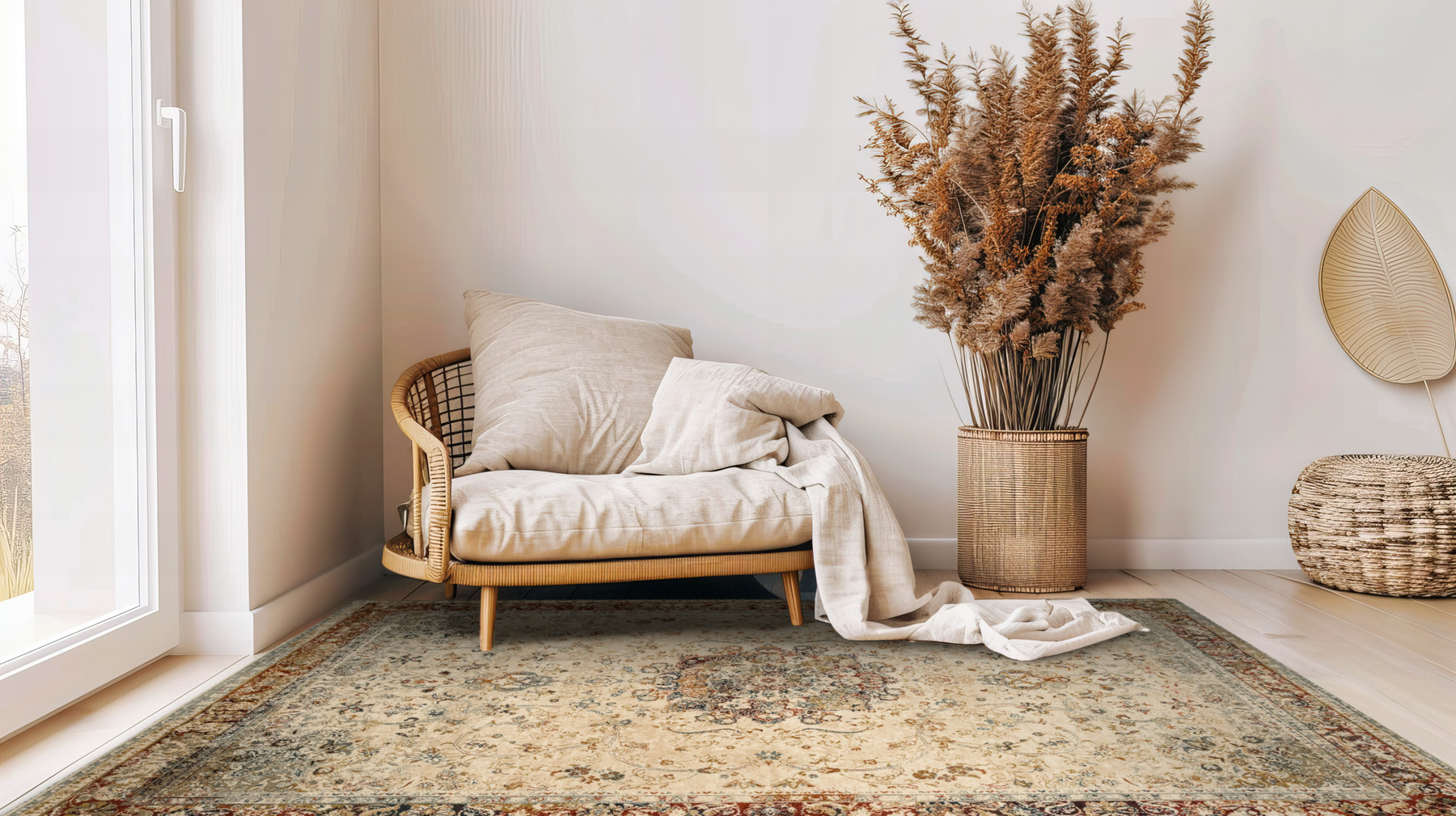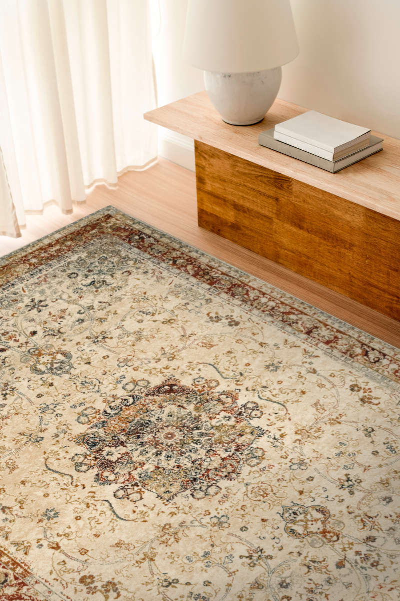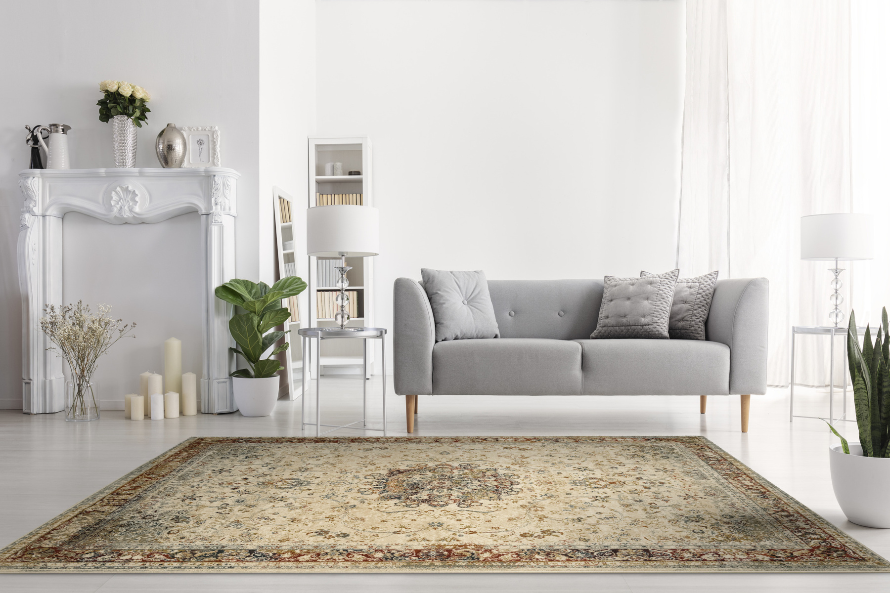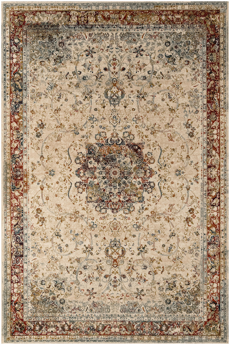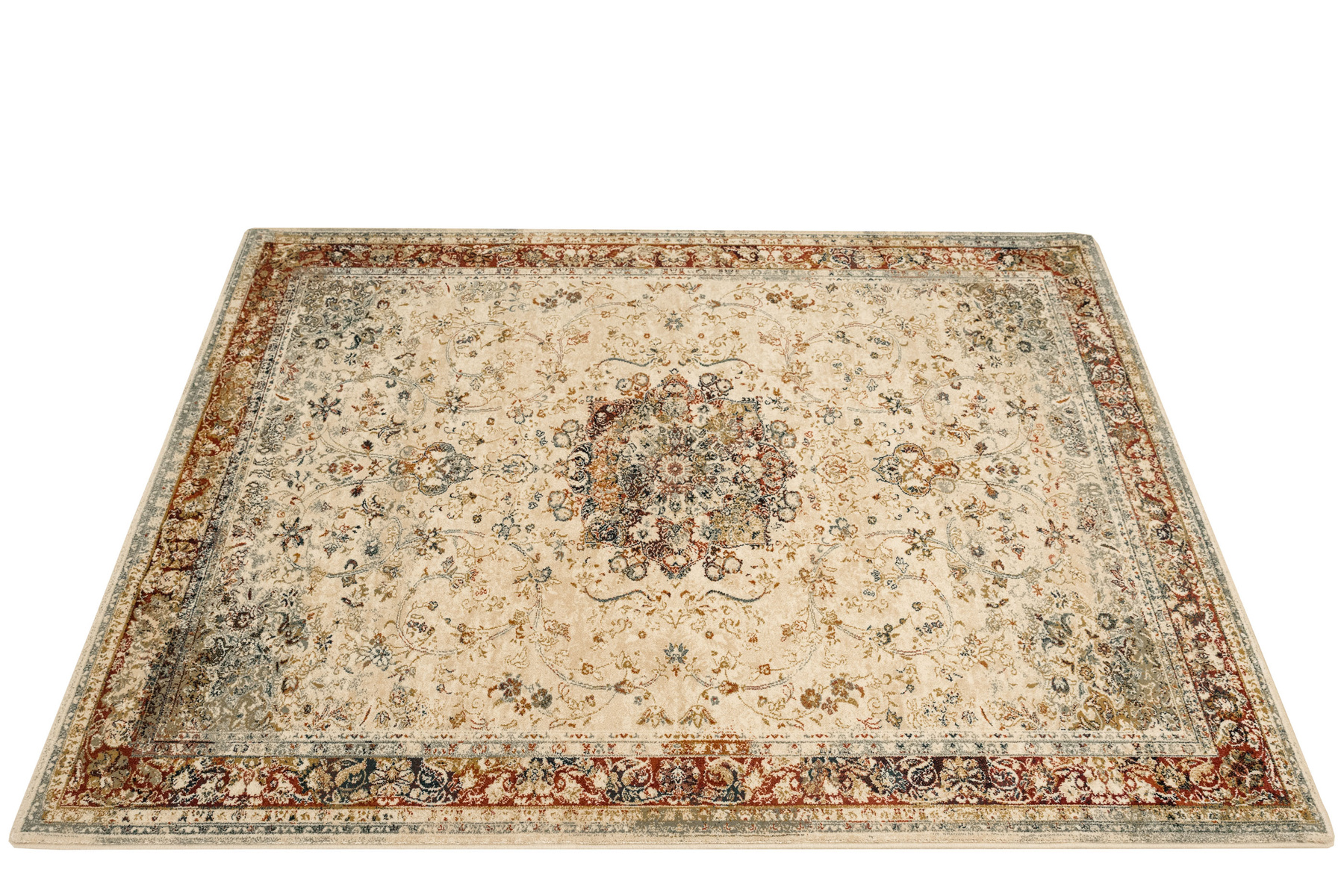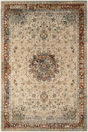 - Luksusowy dywan Omega Kordoba Kniak wykonany z wełny, z runem o klasycznym wzorze ornamentowym z w odcieniach beżu, kremu z akcentami w butelkowej, oliwkowej zieleni, czerwieni i czerni oraz spodem wykończonym jutą.