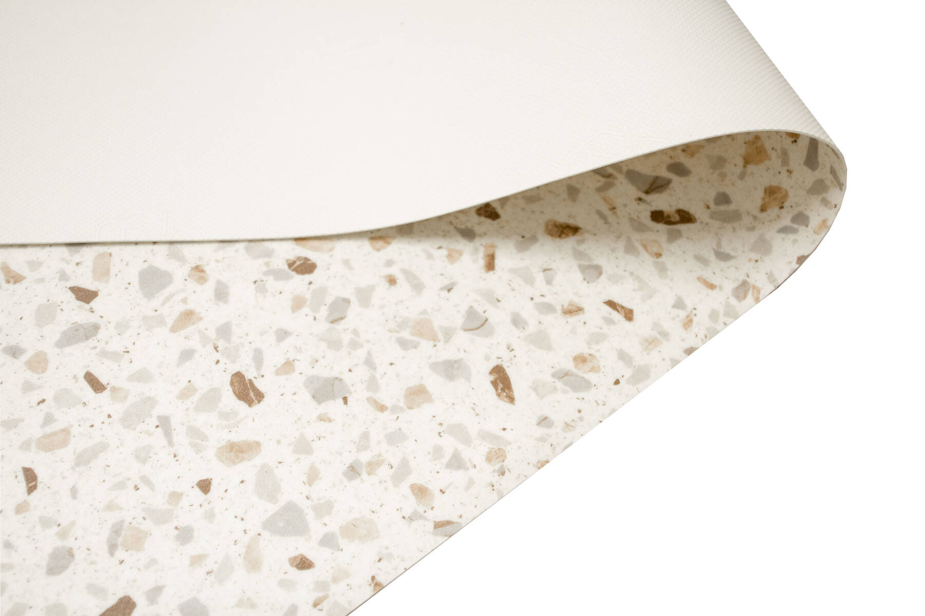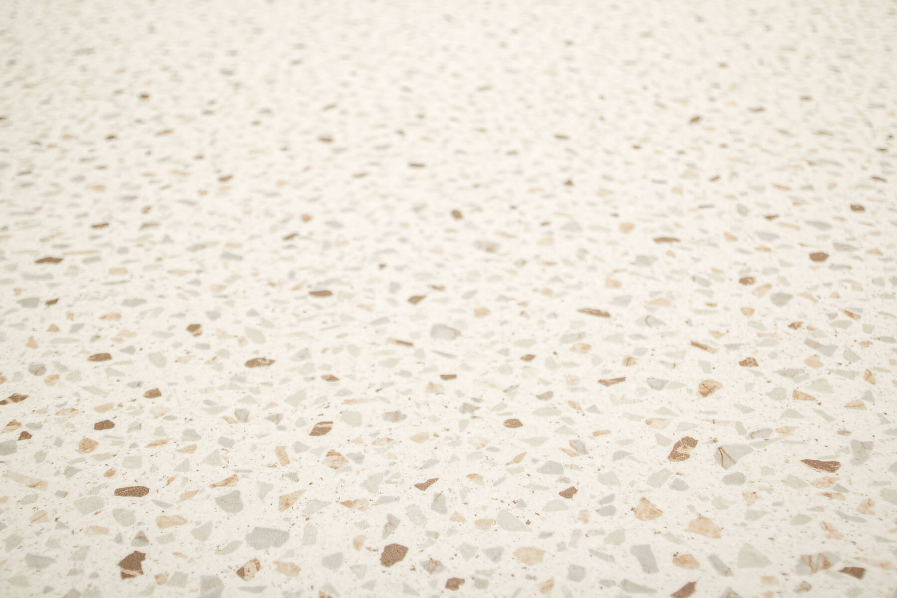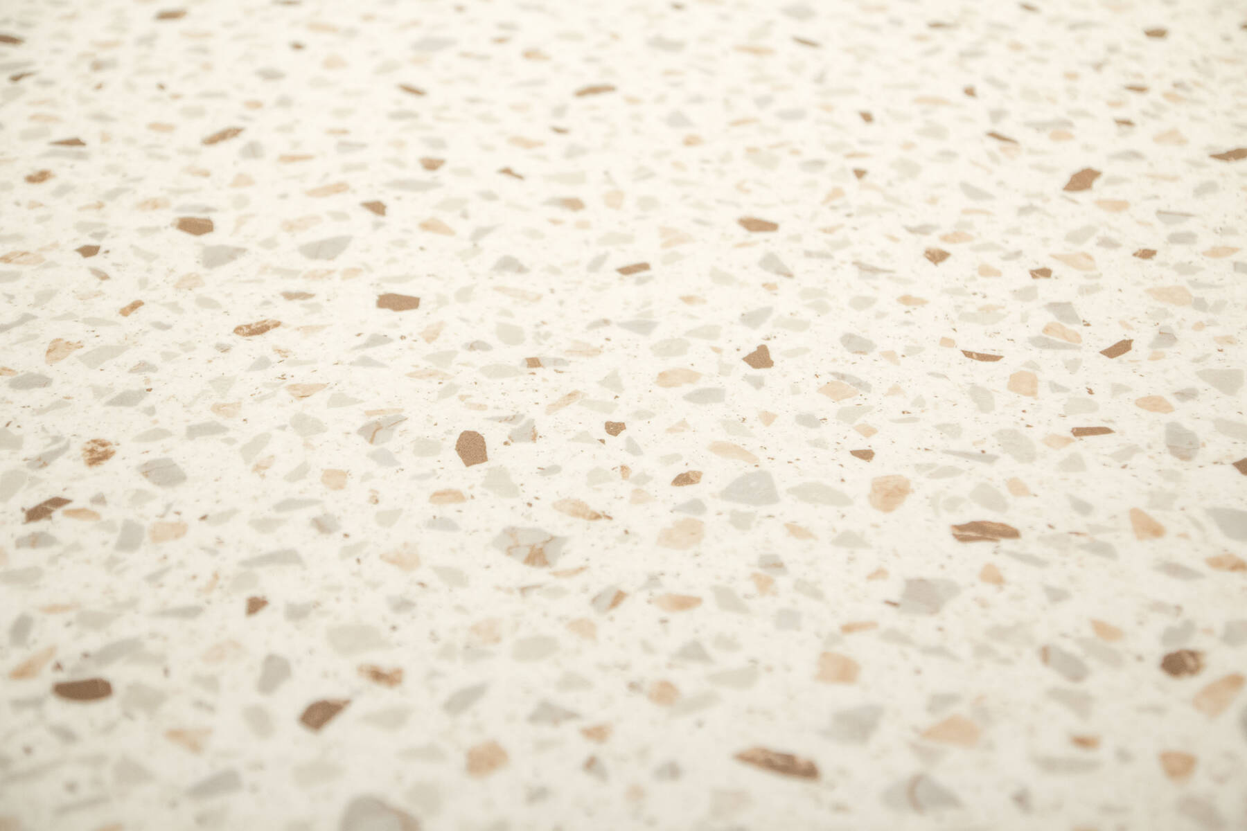 - Wytrzymała domowa wykładzina PCV Stellar Marmette ze wzorem imitującym lastryko z kamyczkami w odcieniach beżu, kremu, szarości i brązu z poliuretanową powierzchnią ochronną.