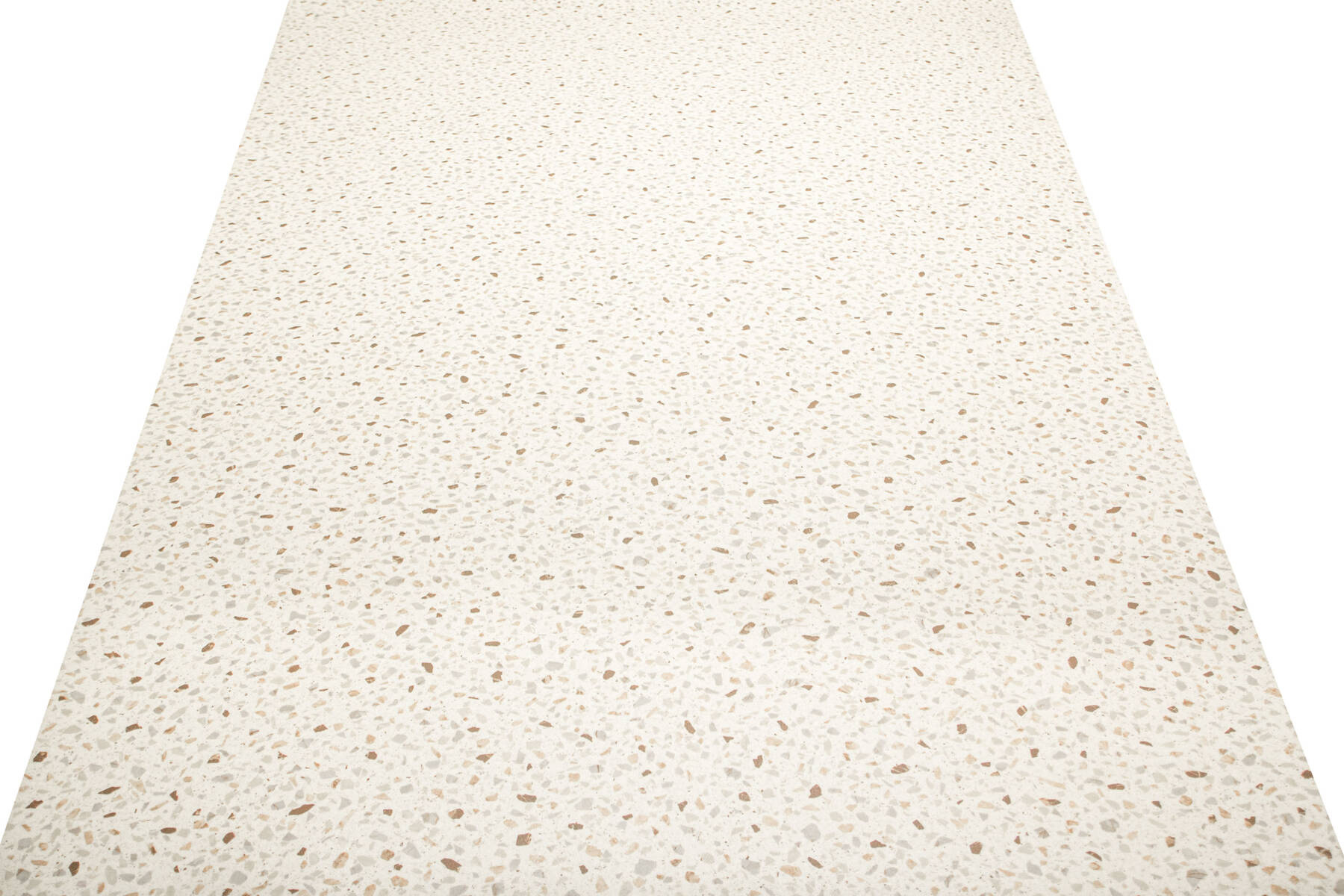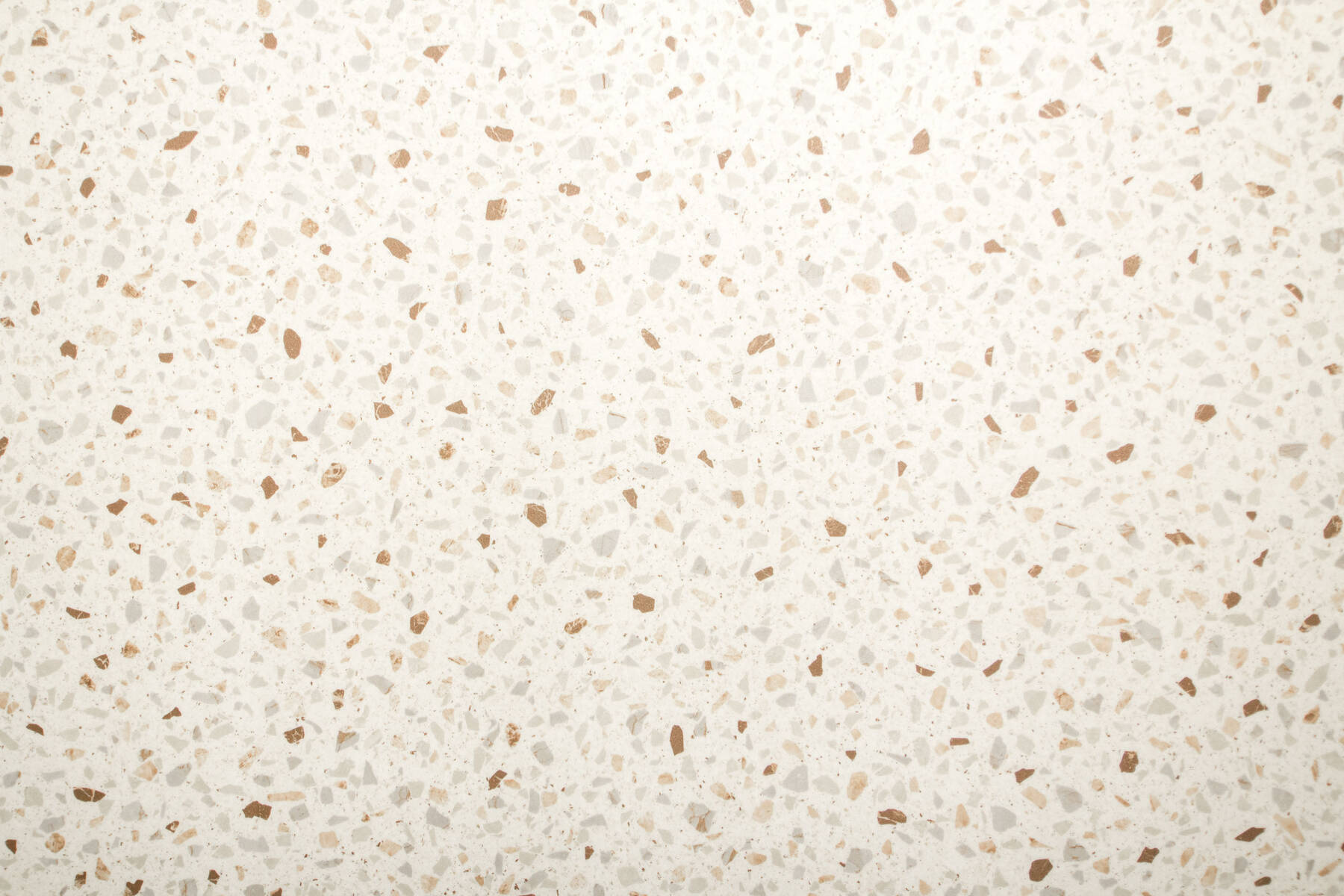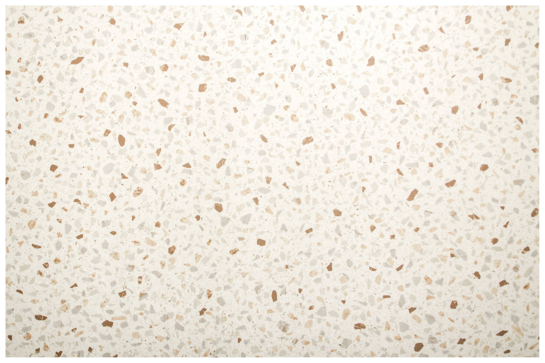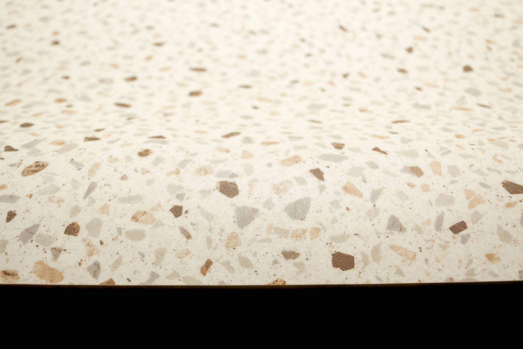 - Wytrzymała domowa wykładzina PCV Stellar Marmette ze wzorem imitującym lastryko z kamyczkami w odcieniach beżu, kremu, szarości i brązu z poliuretanową powierzchnią ochronną.