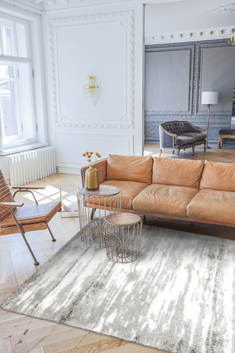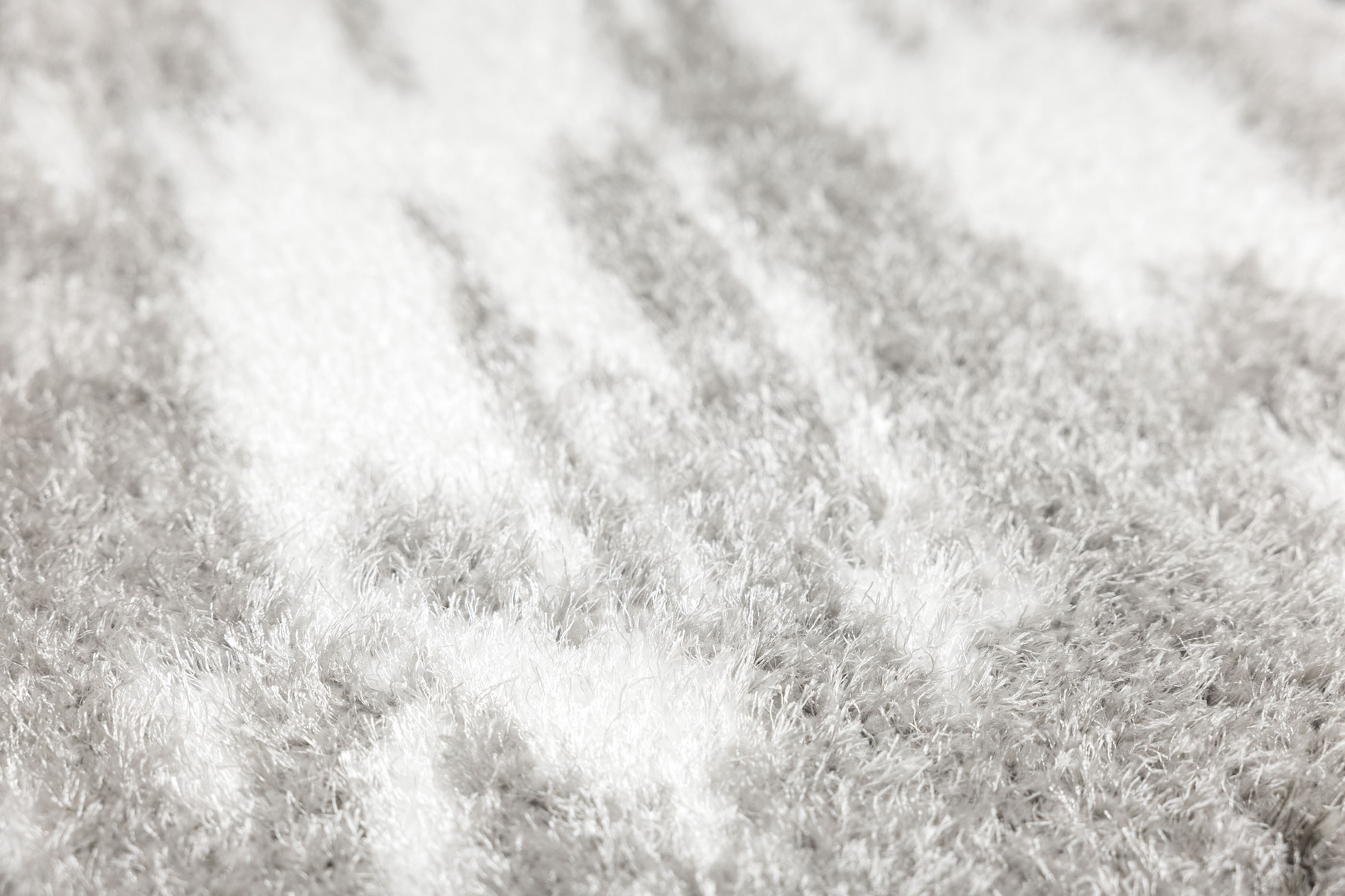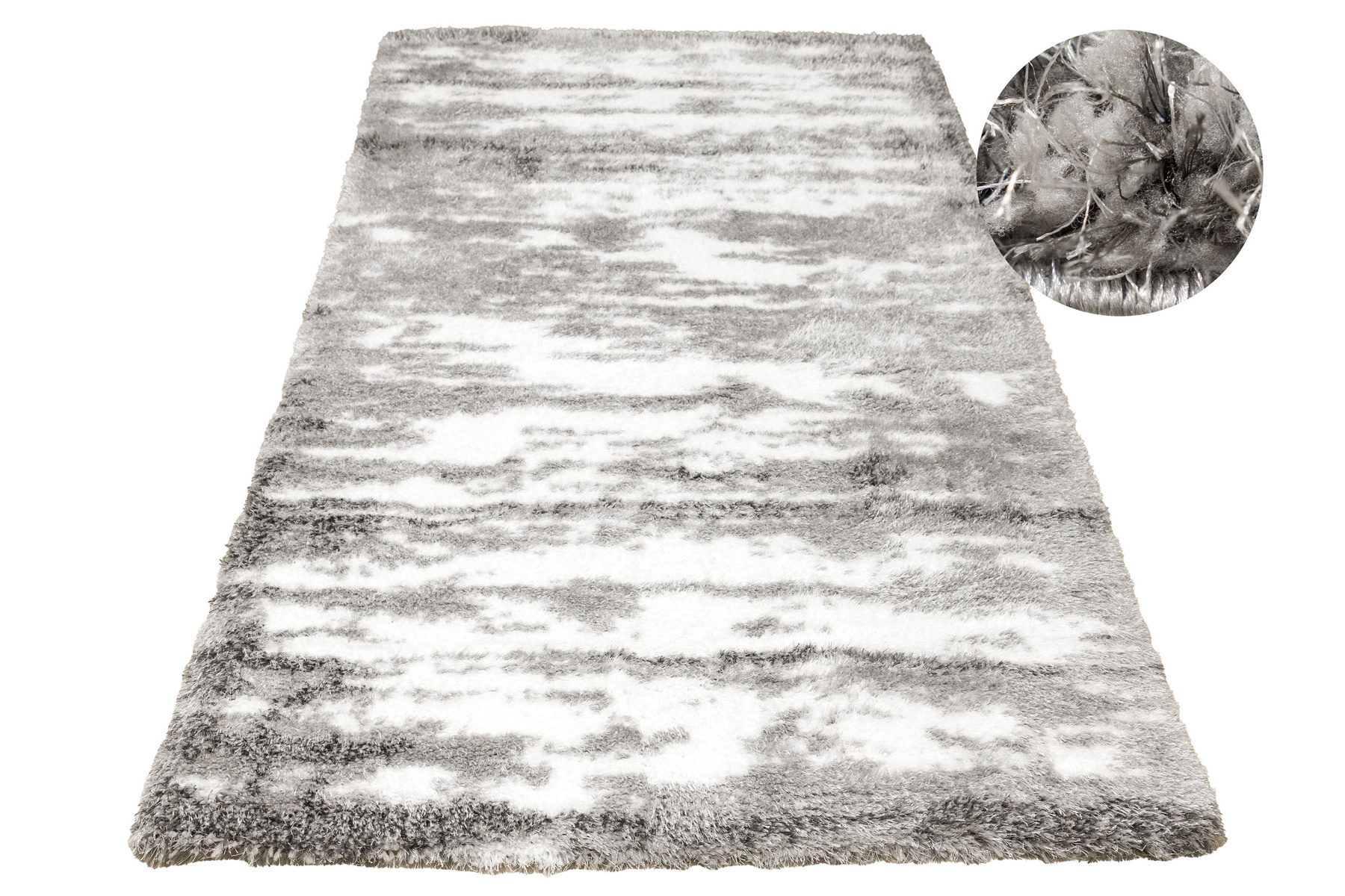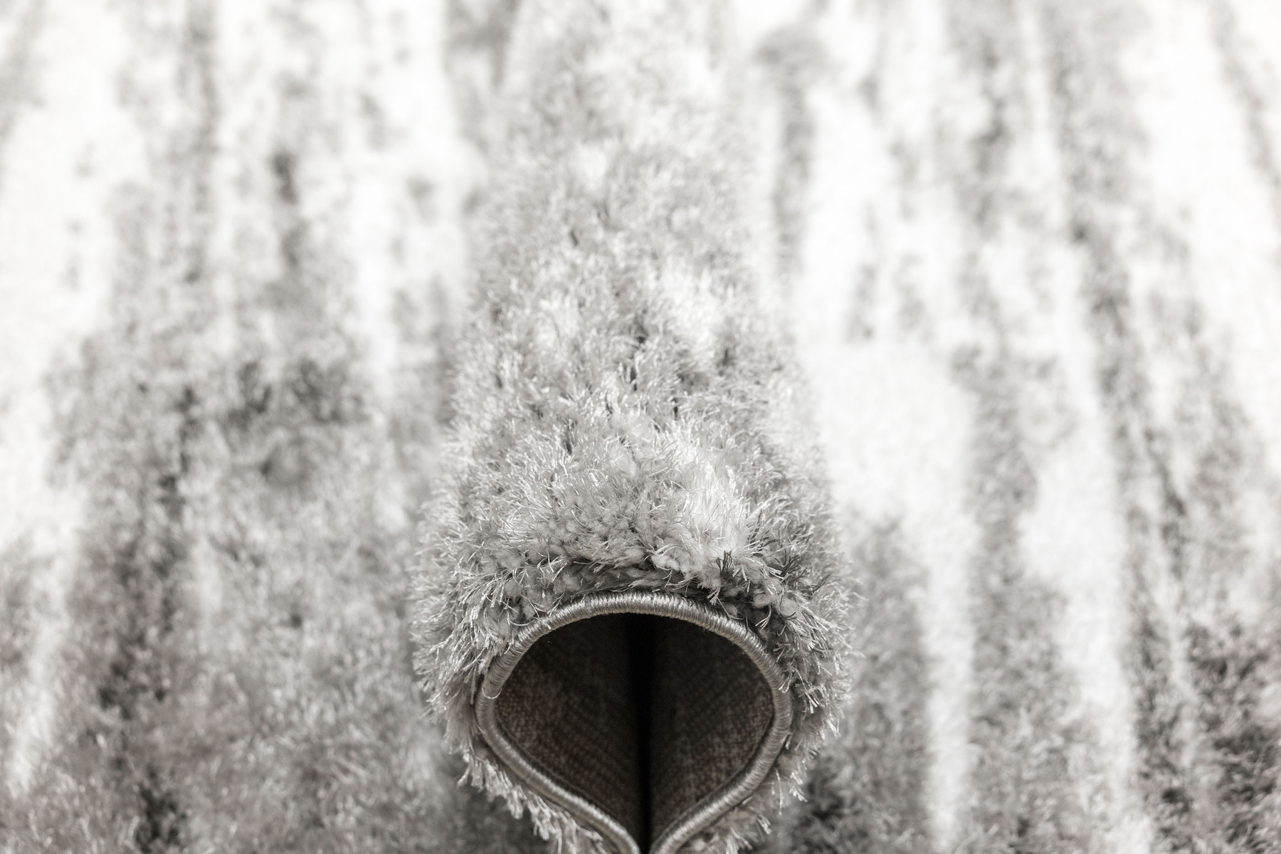 - Wyjątkowo miękki i puszysty, lśniący dywan PUFFY z runem typu shaggy w kompozycji abstrakcyjnej imitującej beton, marmur w odzieniach szarości, antracytu z dodatkiem srebrzystej nitki.