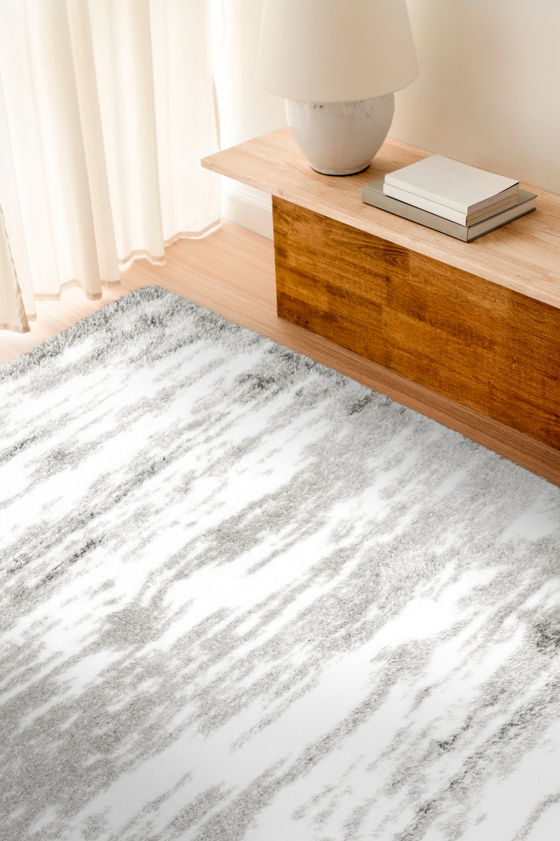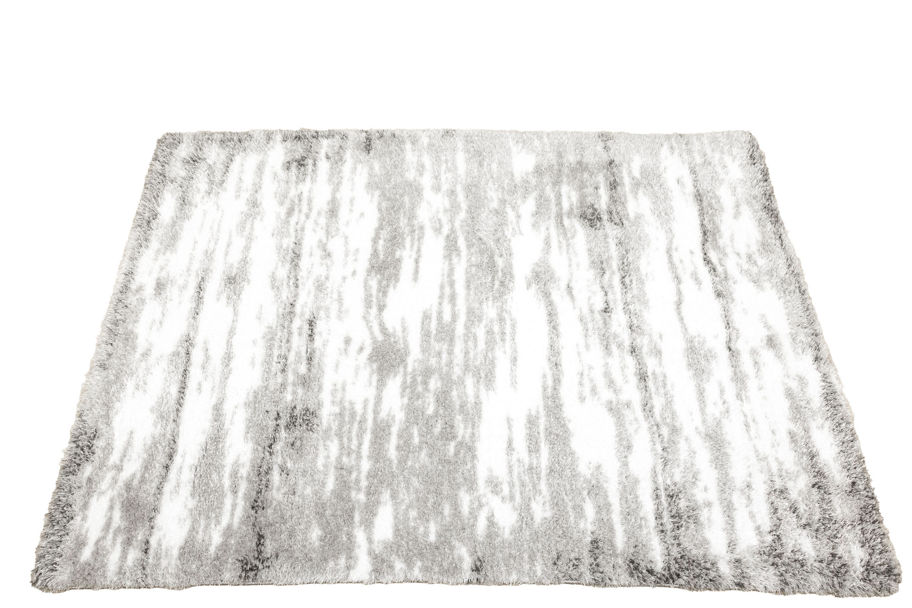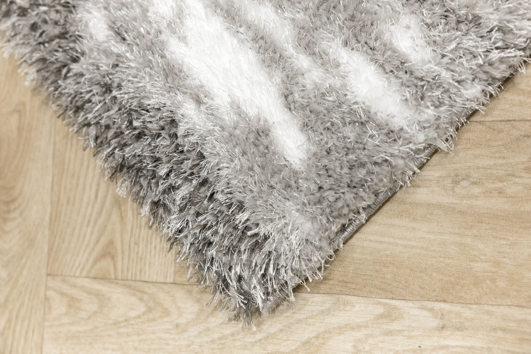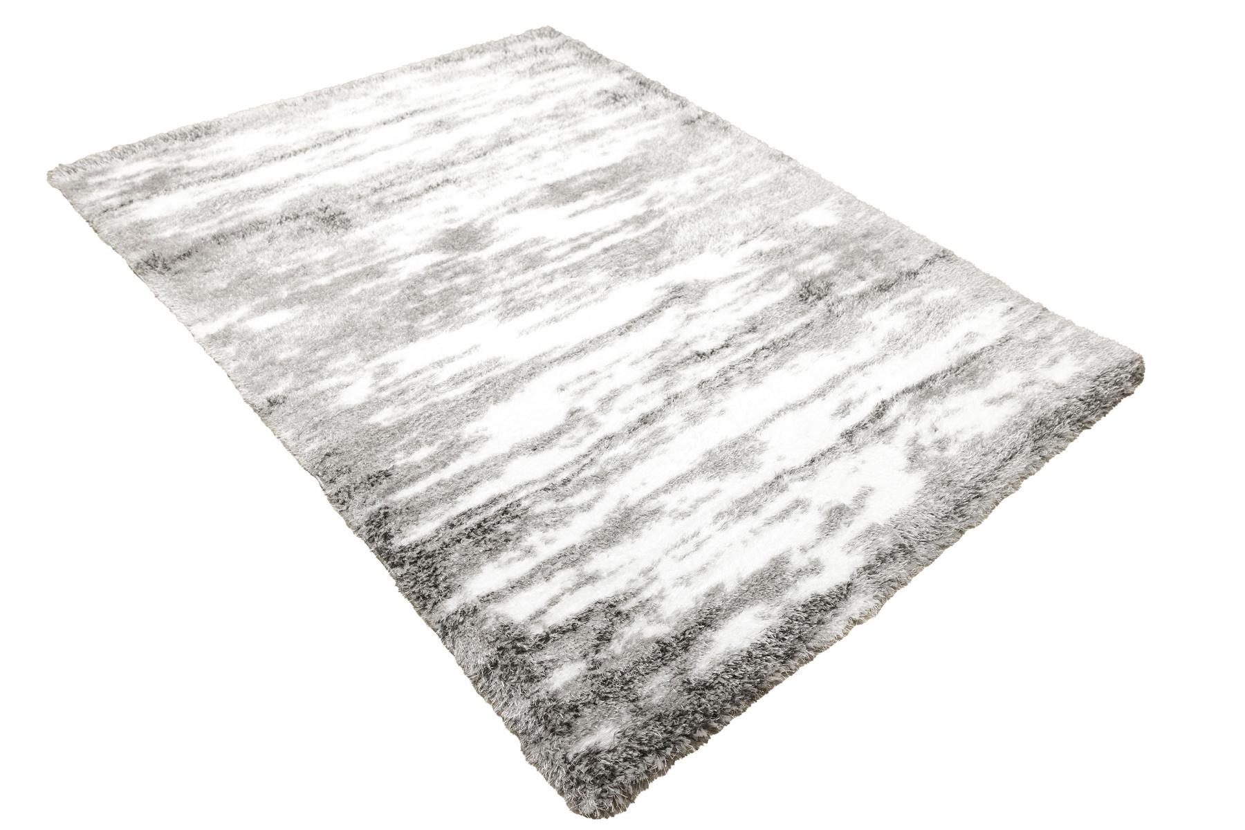 - Wyjątkowo miękki i puszysty, lśniący dywan PUFFY z runem typu shaggy w kompozycji abstrakcyjnej imitującej beton, marmur w odzieniach szarości, antracytu z dodatkiem srebrzystej nitki.