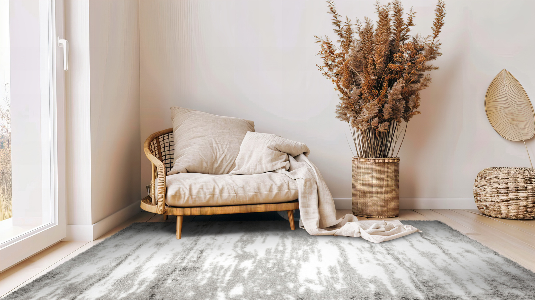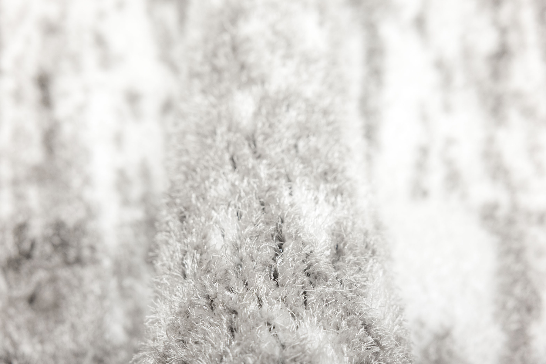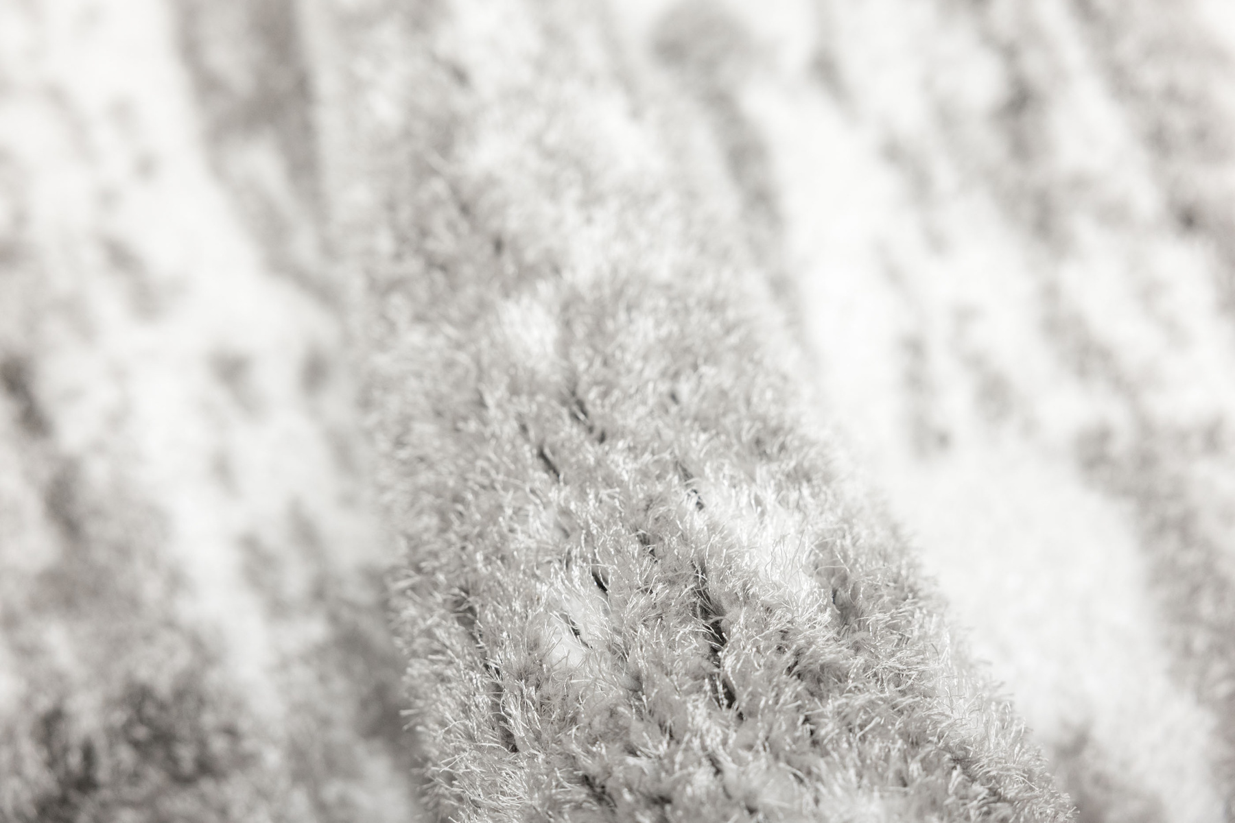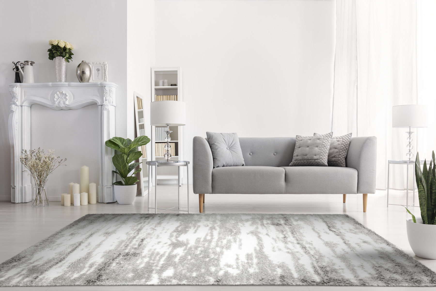 - Wyjątkowo miękki i puszysty, lśniący dywan PUFFY z runem typu shaggy w kompozycji abstrakcyjnej imitującej beton, marmur w odzieniach szarości, antracytu z dodatkiem srebrzystej nitki.