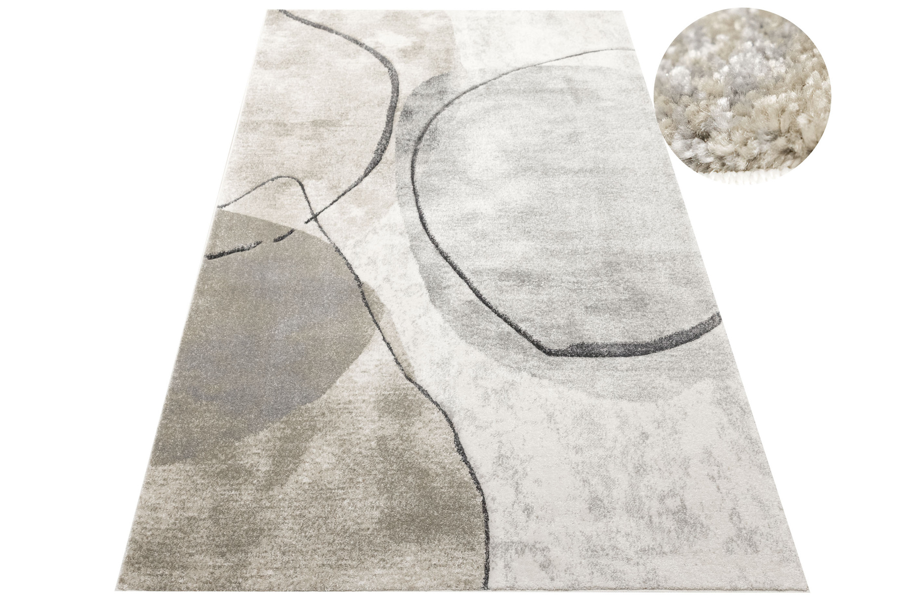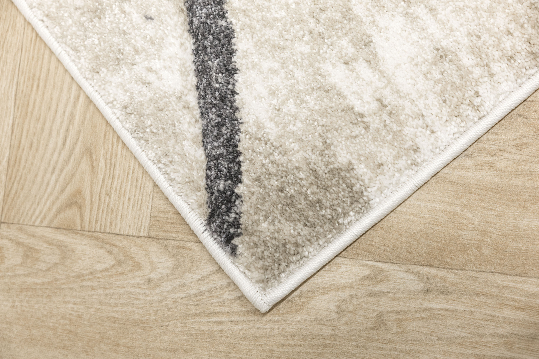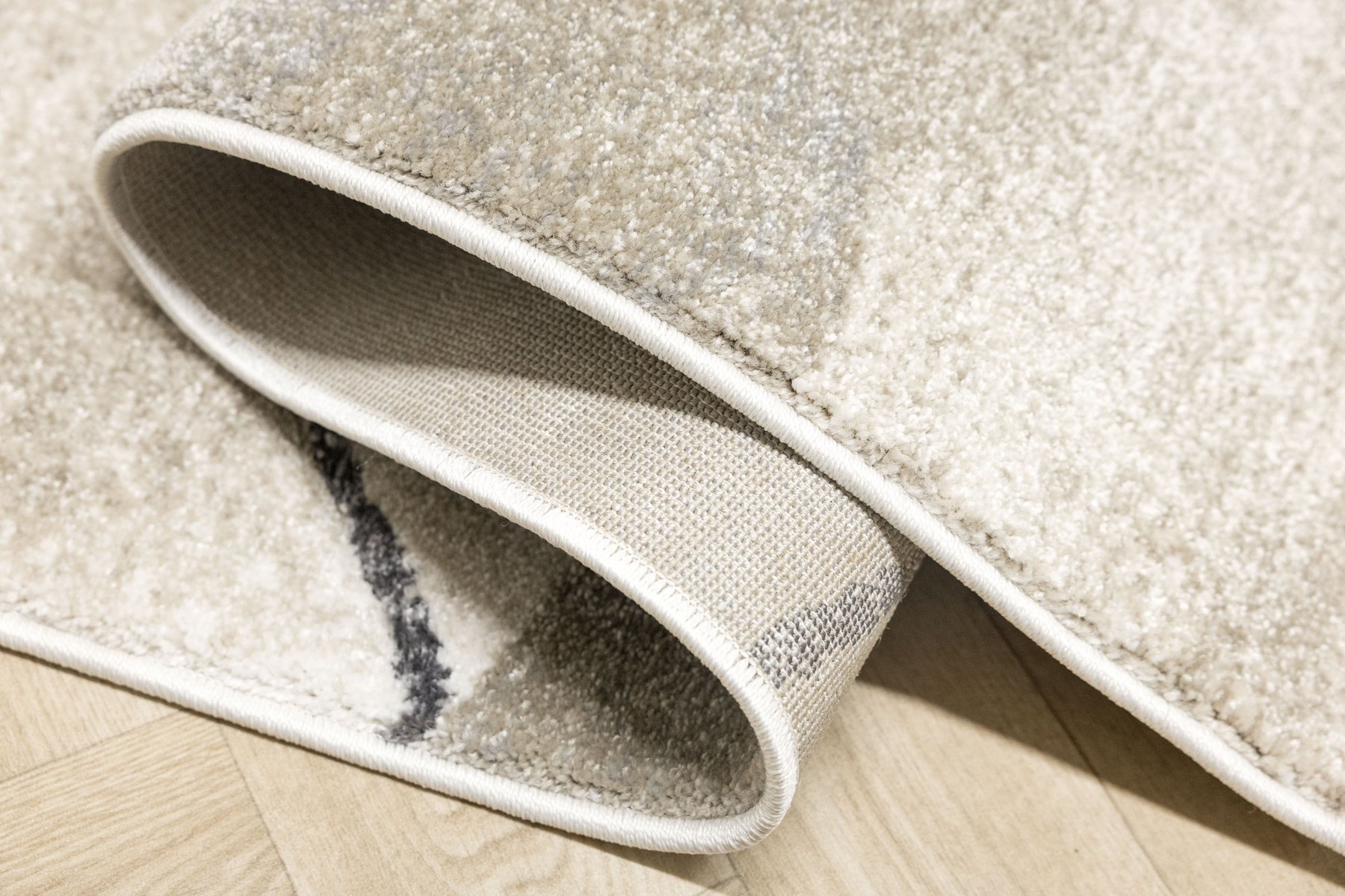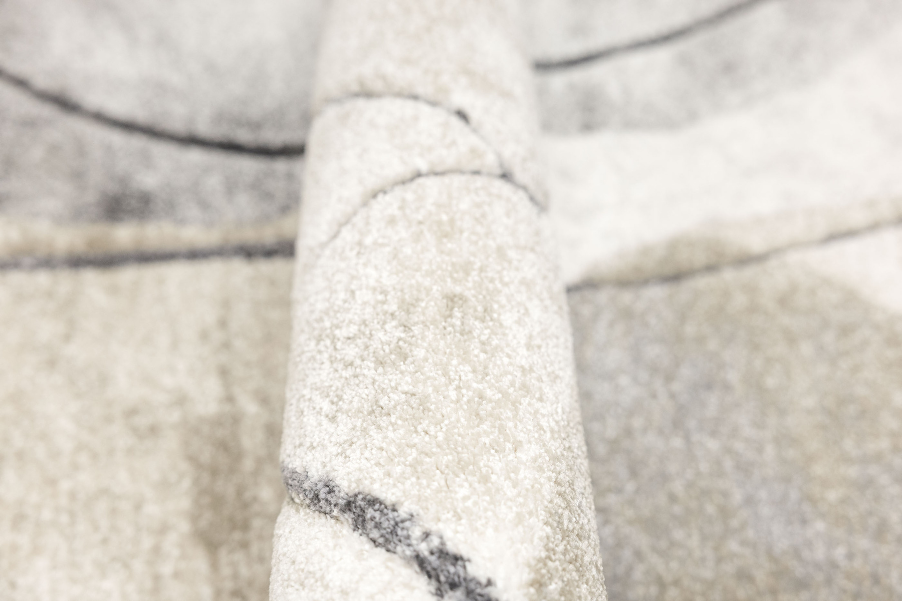 - Miękki i przyjemny w dotyku dywan Daisy Carving z lśniącym wycinanym runem z nowoczesnym wzorem w stylu abstrakcyjnym w odcieniach szarości, beżu i kremu.