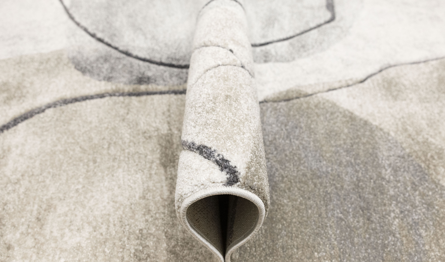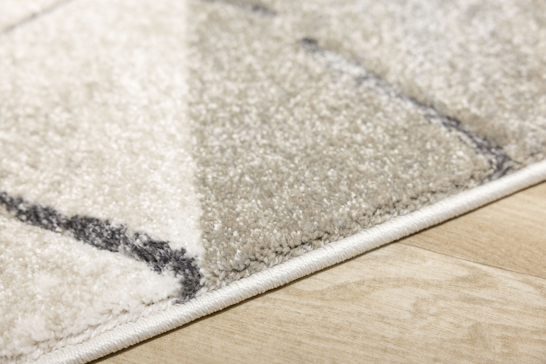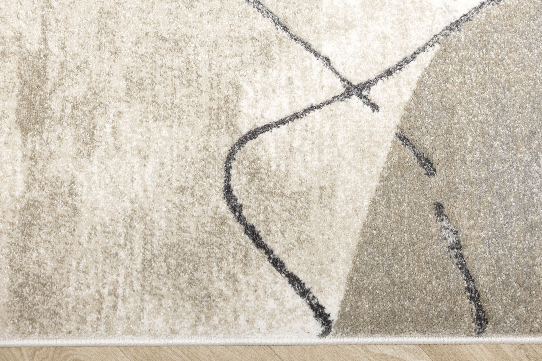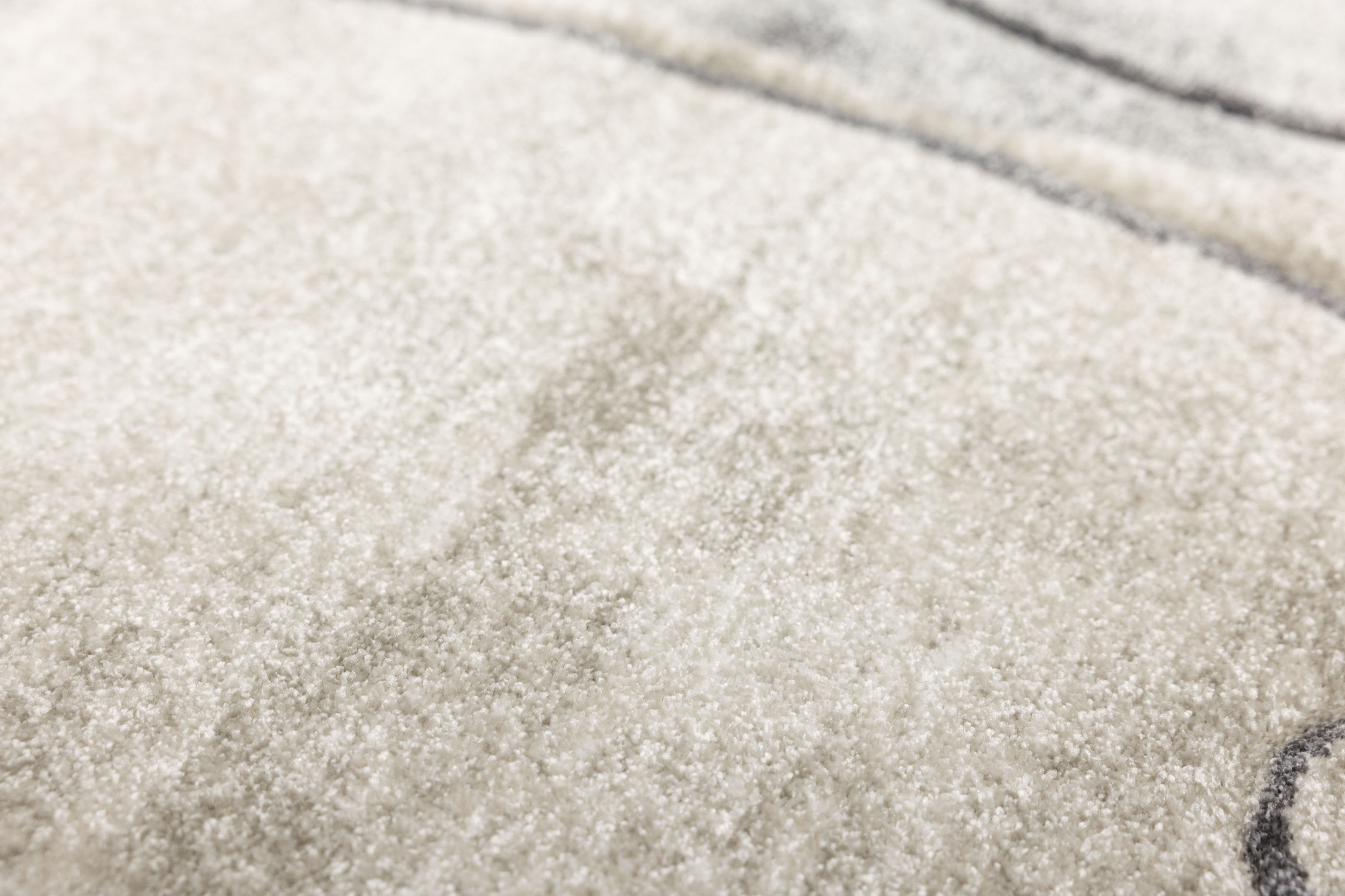 - Miękki i przyjemny w dotyku dywan Daisy Carving z lśniącym wycinanym runem z nowoczesnym wzorem w stylu abstrakcyjnym w odcieniach szarości, beżu i kremu.