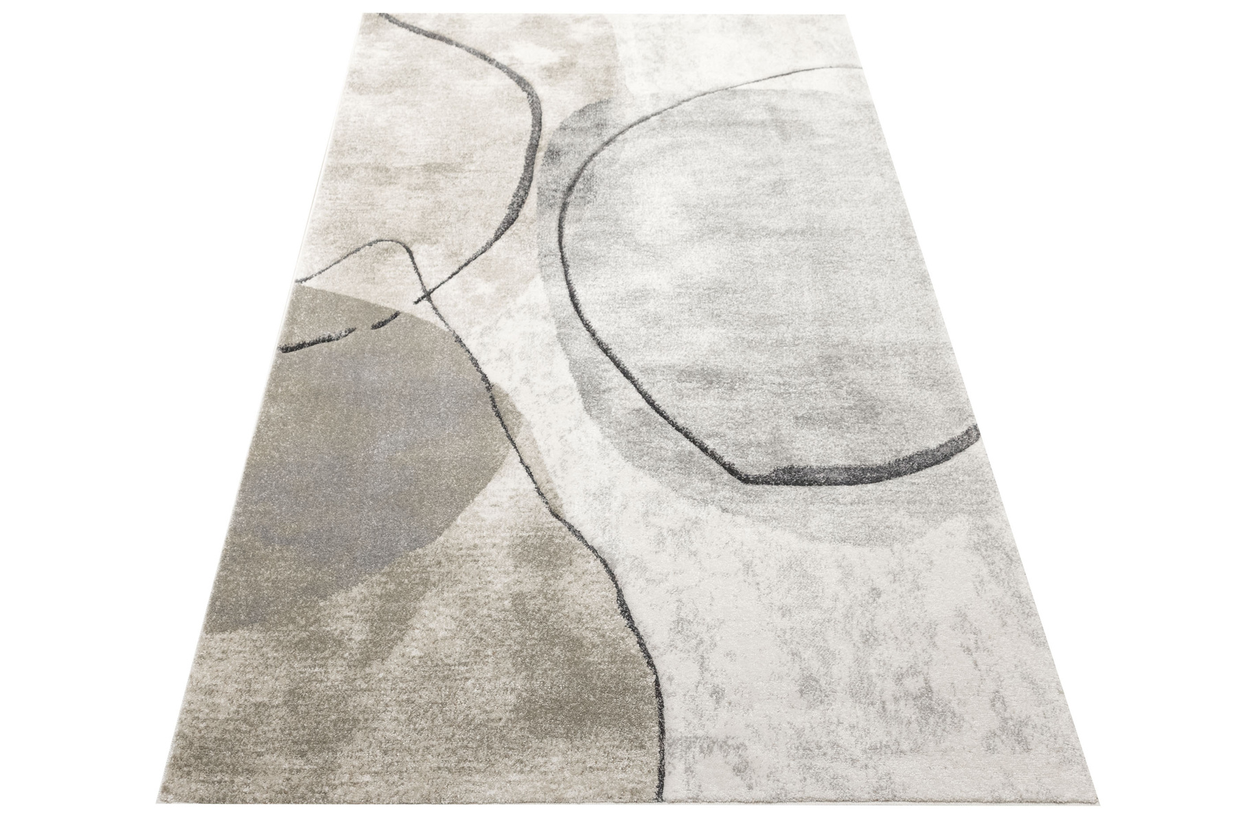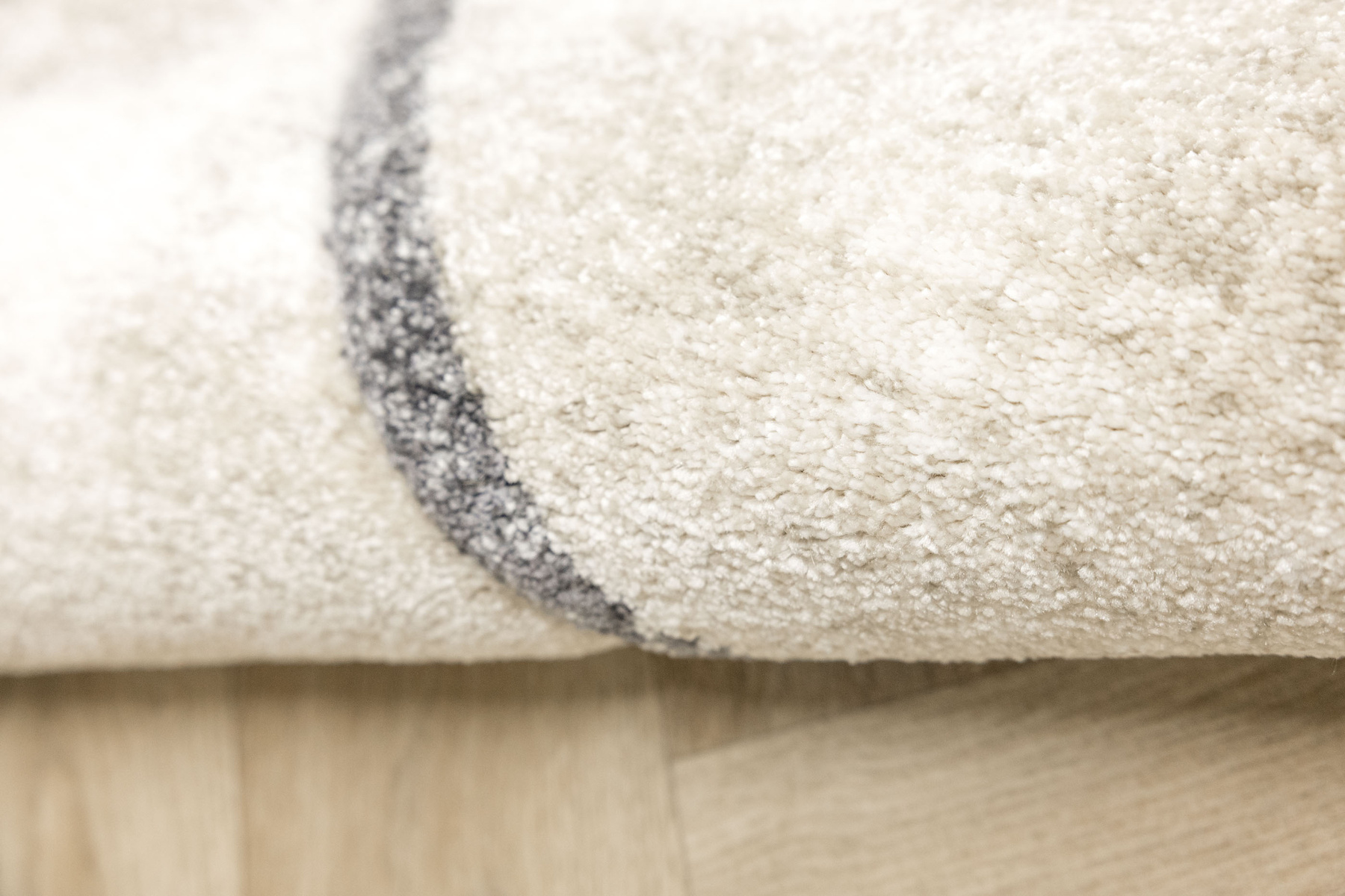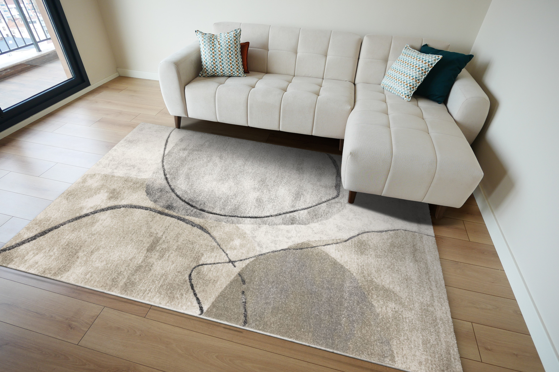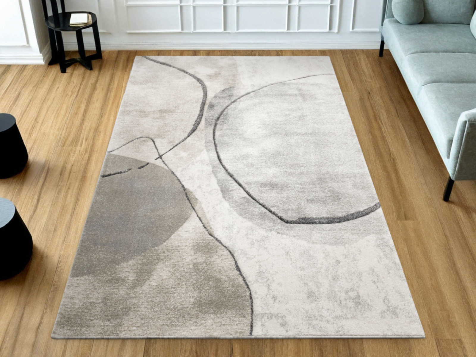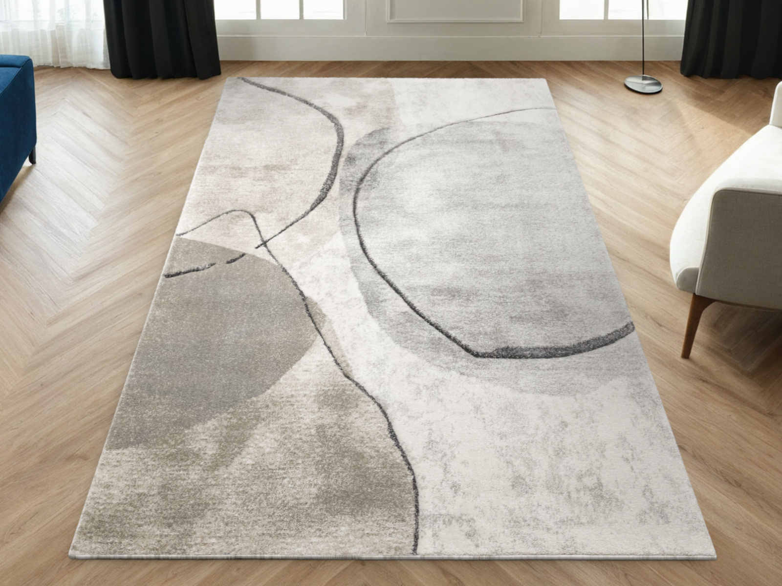 - Miękki i przyjemny w dotyku dywan Daisy Carving z lśniącym wycinanym runem z nowoczesnym wzorem w stylu abstrakcyjnym w odcieniach szarości, beżu i kremu.