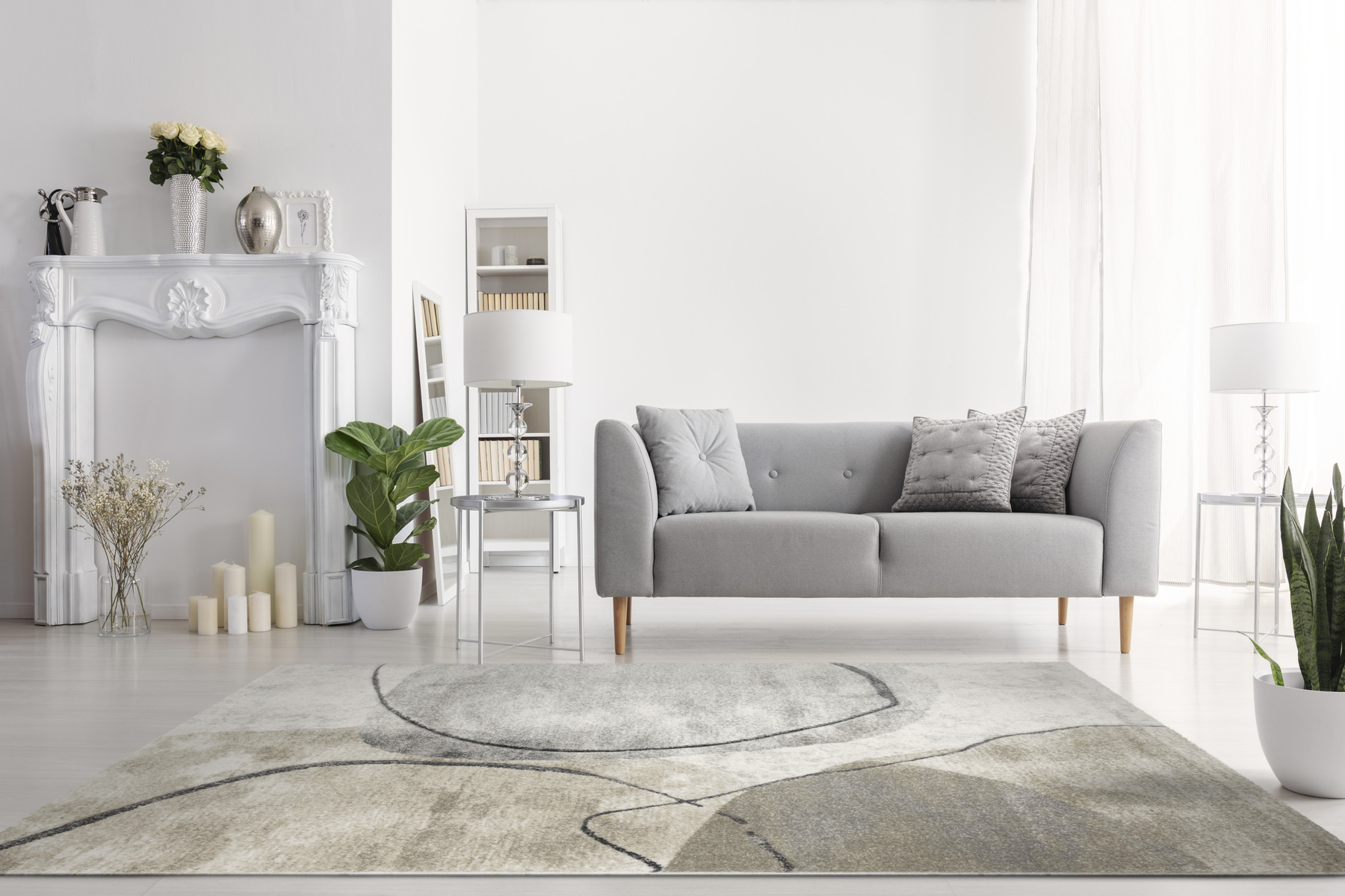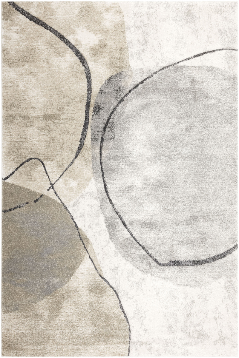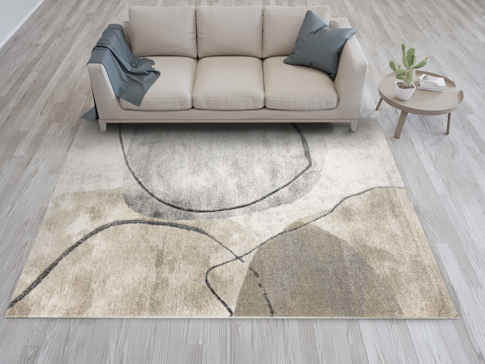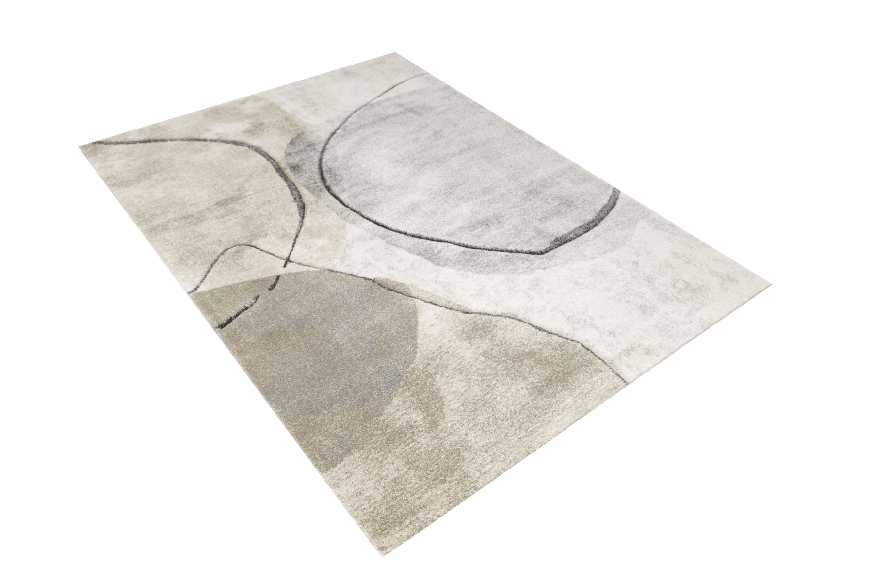 - Miękki i przyjemny w dotyku dywan Daisy Carving z lśniącym wycinanym runem z nowoczesnym wzorem w stylu abstrakcyjnym w odcieniach szarości, beżu i kremu.