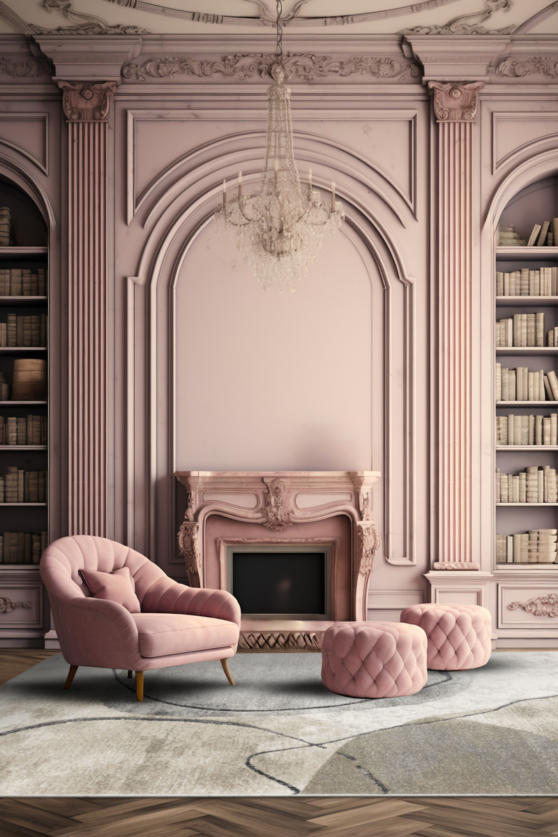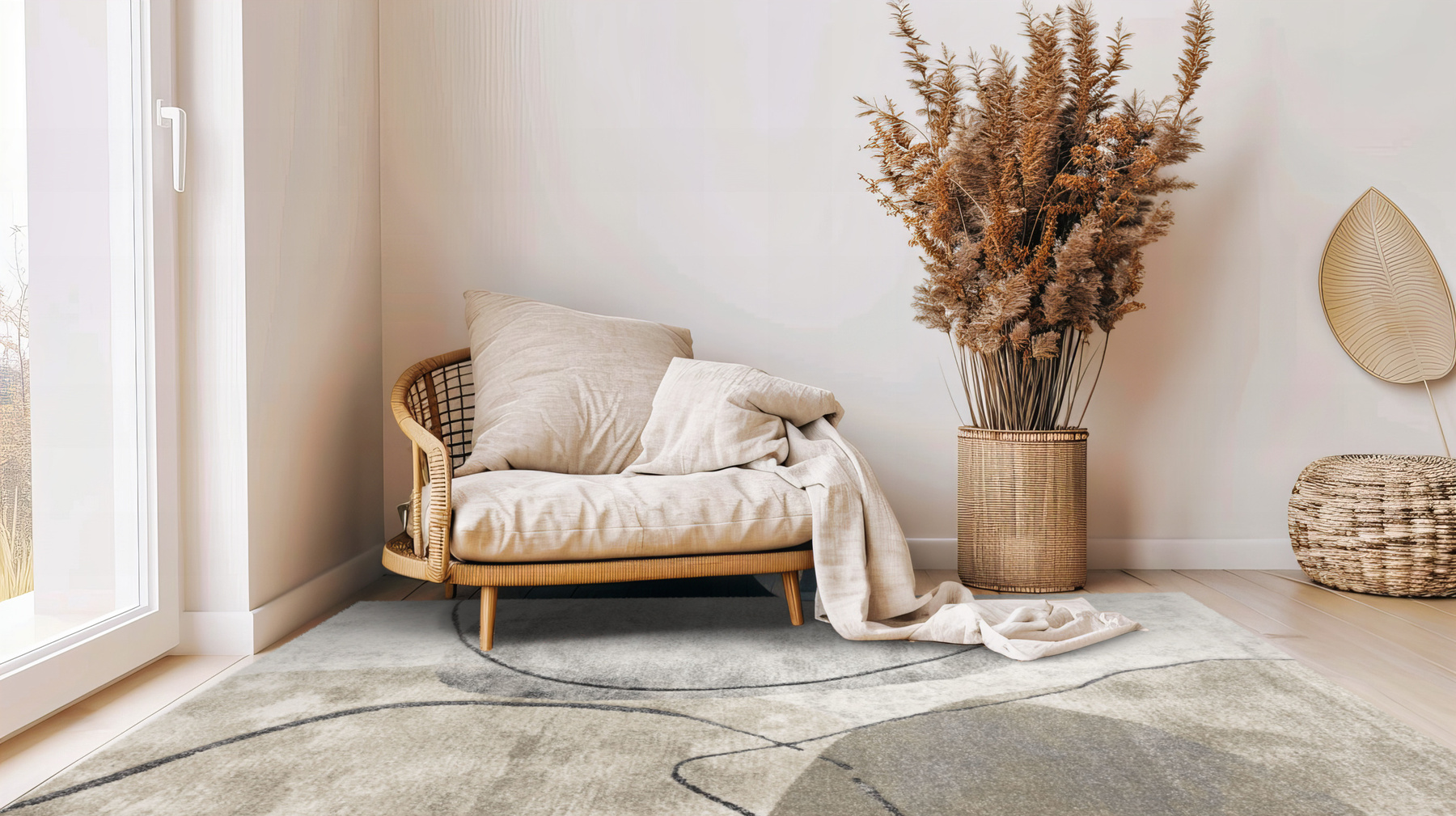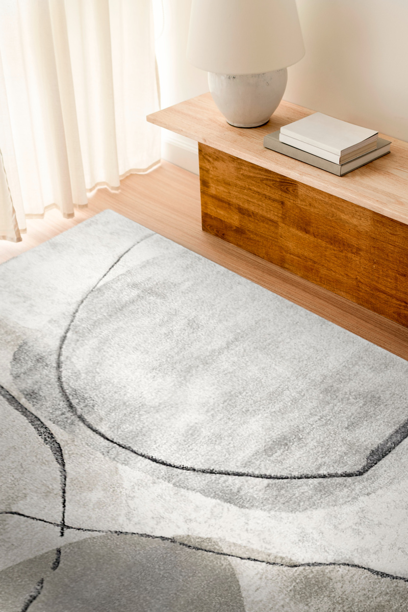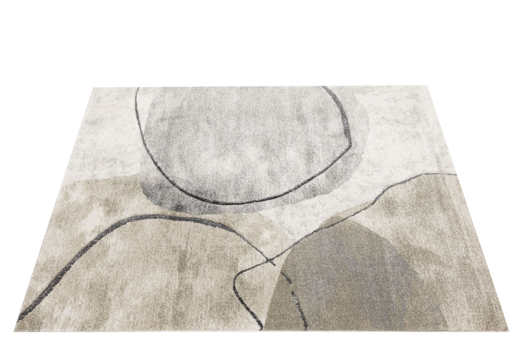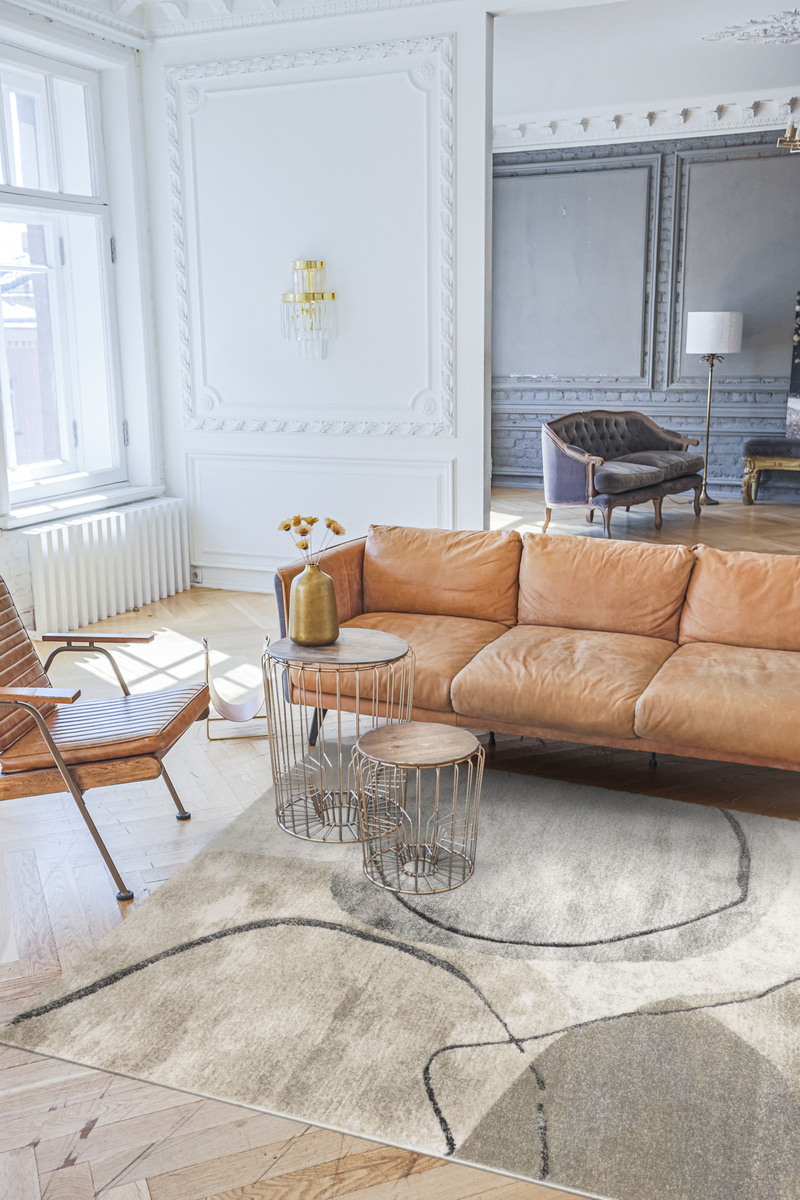 - Miękki i przyjemny w dotyku dywan Daisy Carving z lśniącym wycinanym runem z nowoczesnym wzorem w stylu abstrakcyjnym w odcieniach szarości, beżu i kremu.