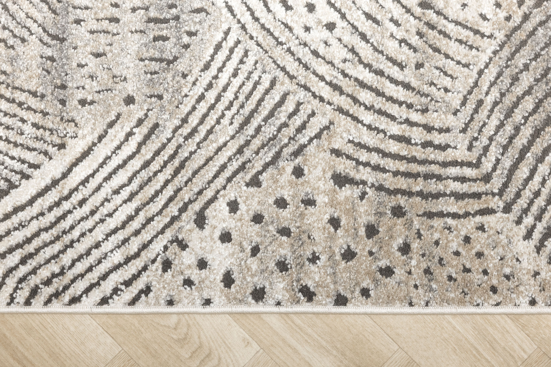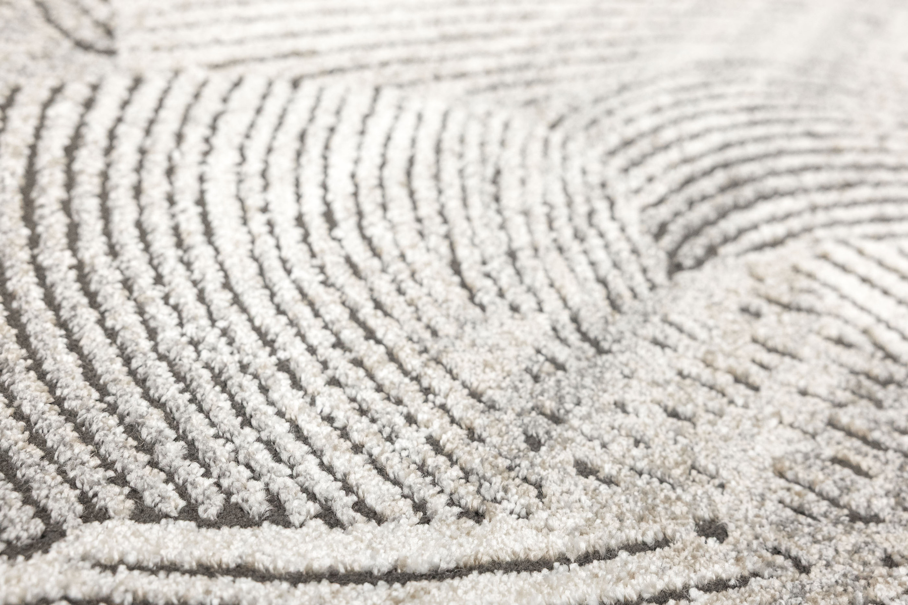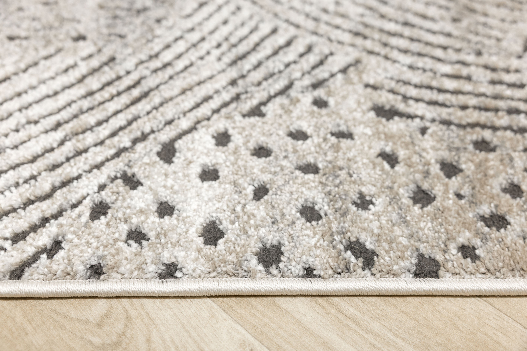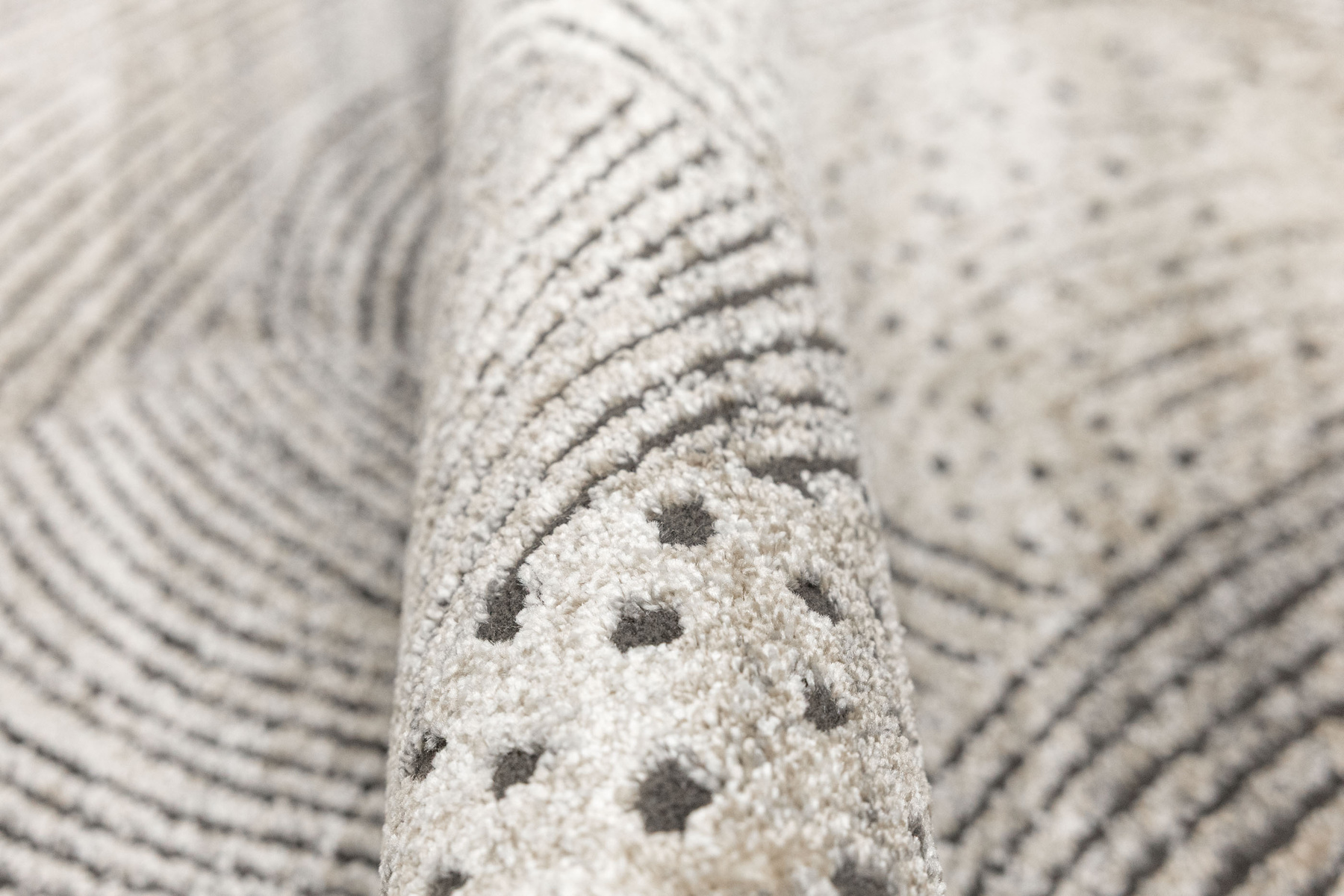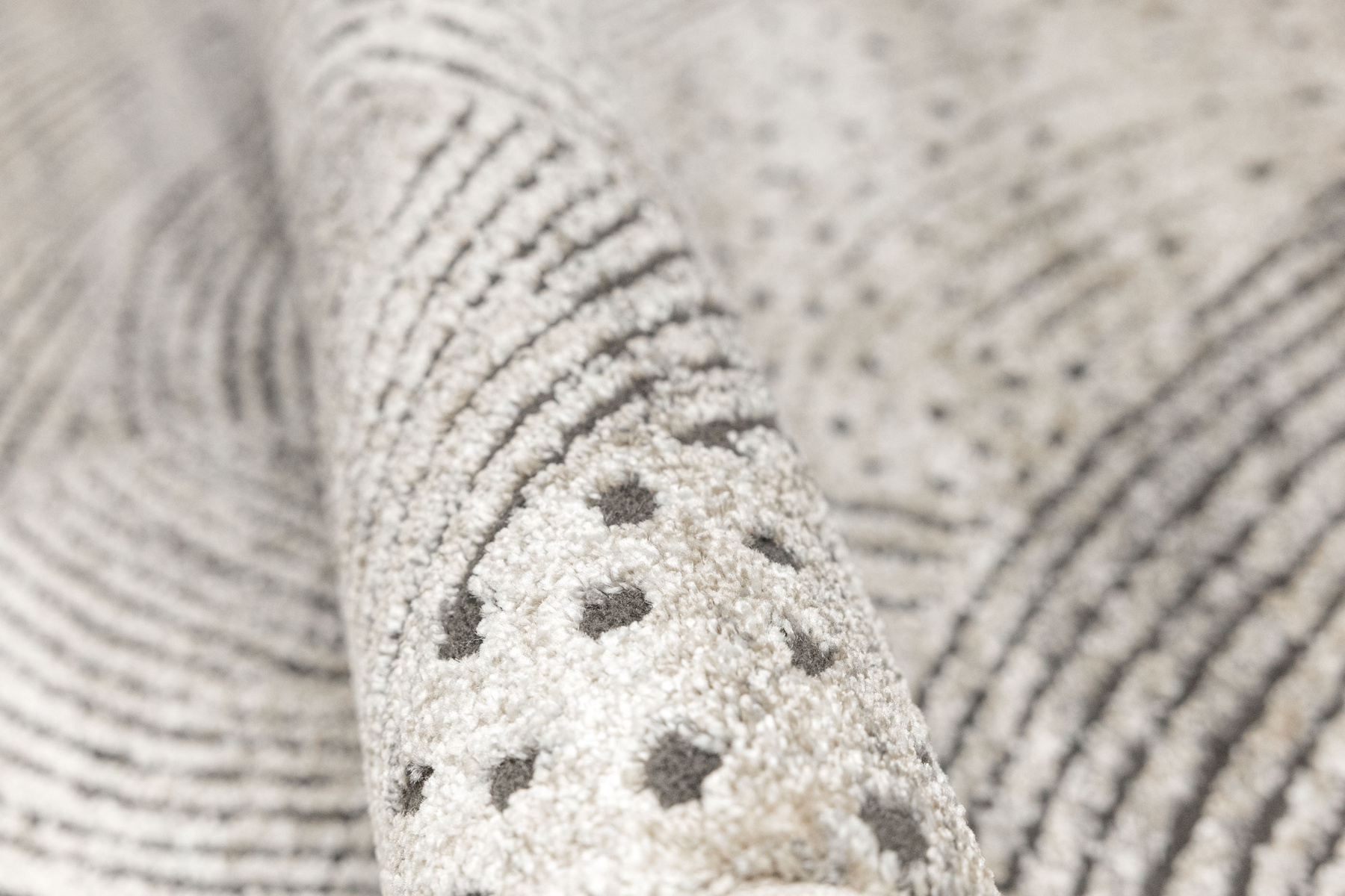 - Miękki i przyjemny w dotyku dywan Matara o dwupoziomowym runie ozdobionym inspirowanym naturą wzorem w kremach, beżach, szarościach i w czerni. Spód dywanu wykończony jutą.