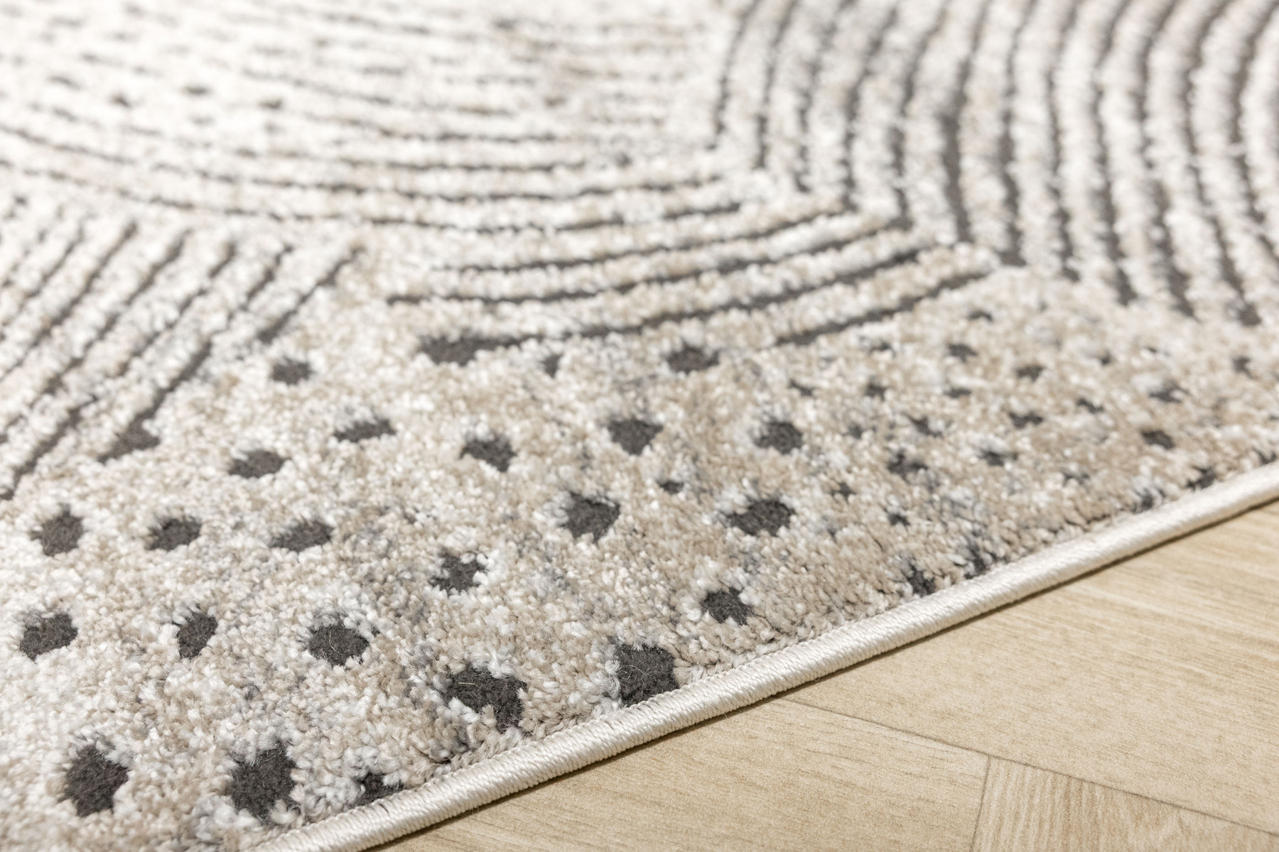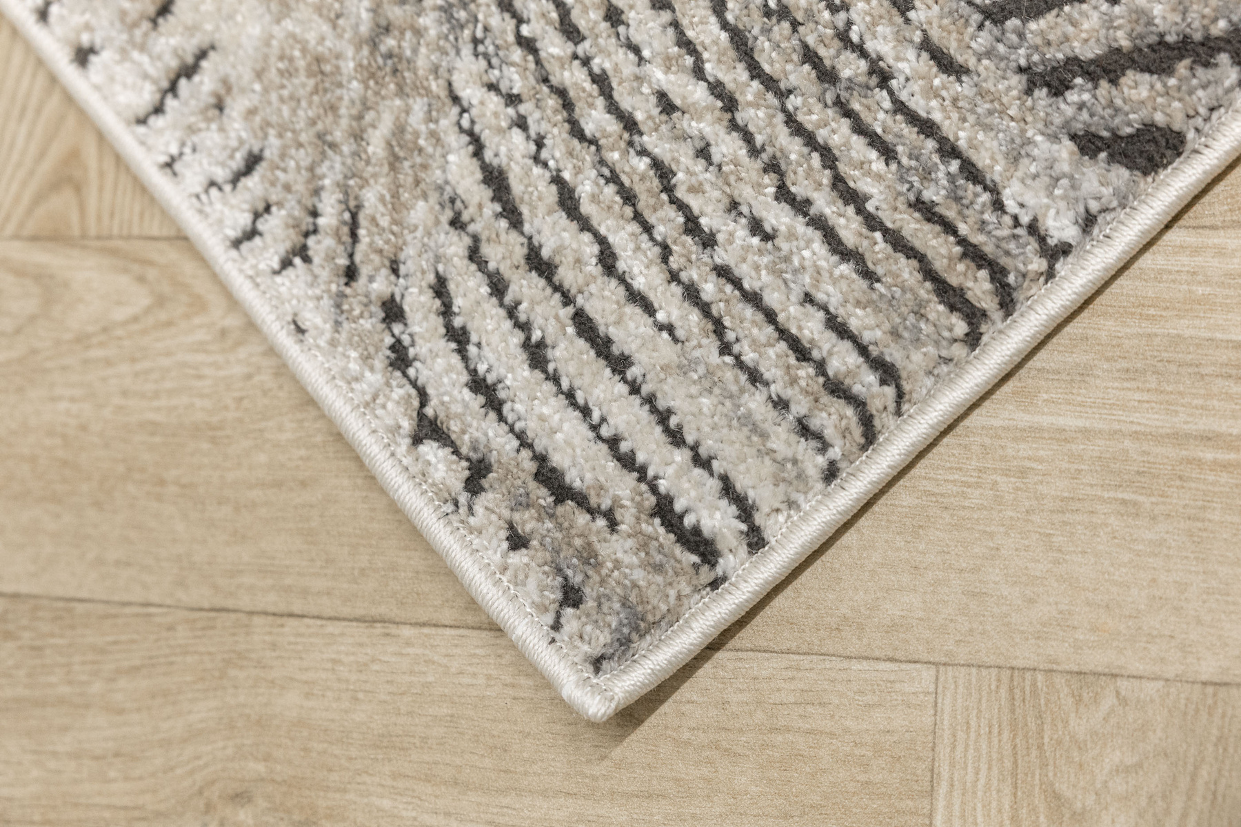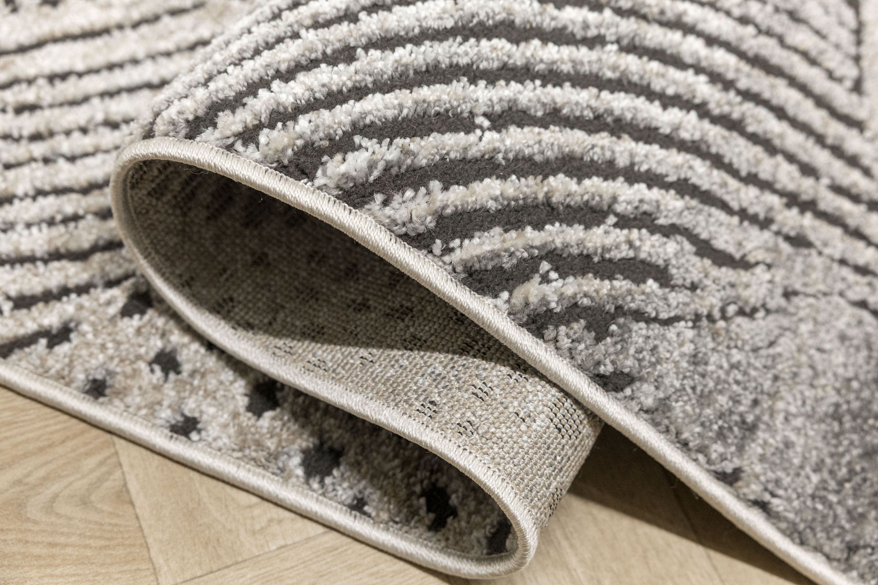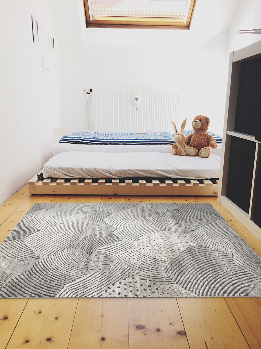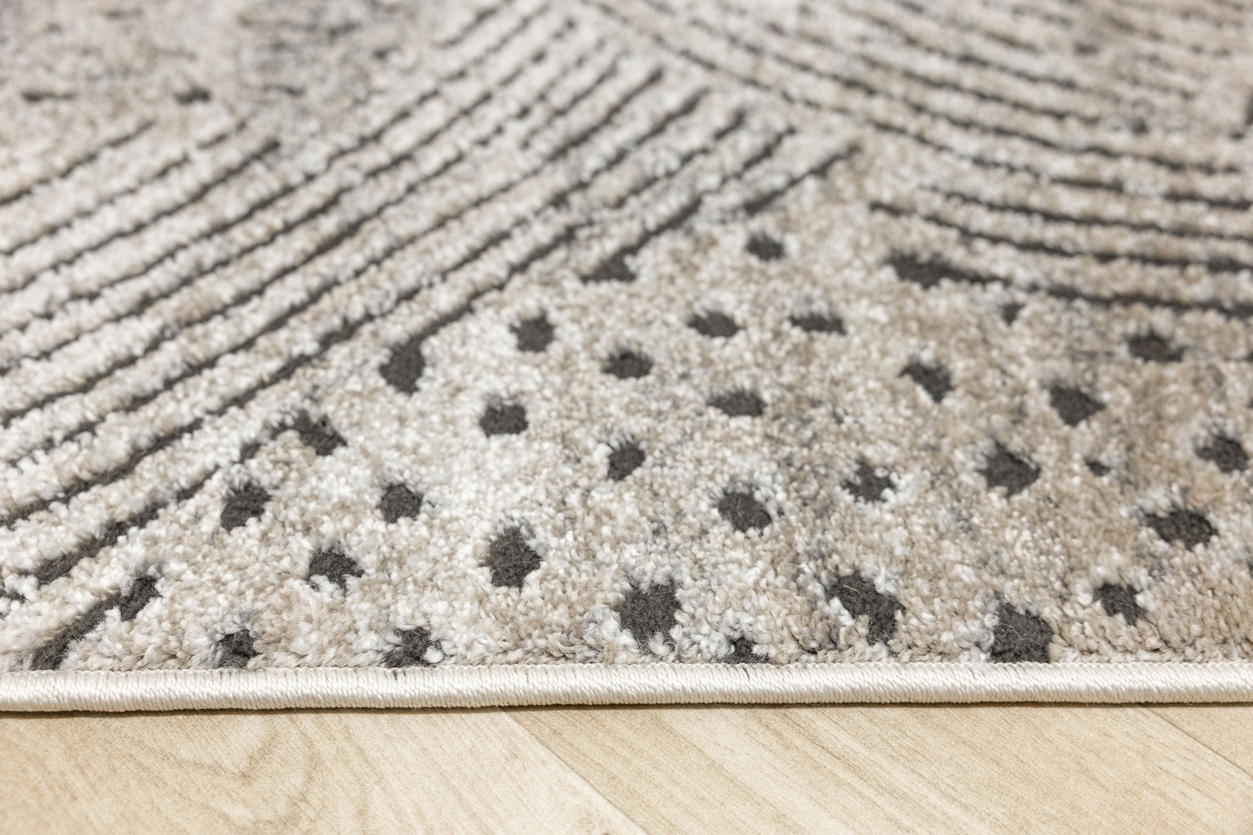 - Miękki i przyjemny w dotyku dywan Matara o dwupoziomowym runie ozdobionym inspirowanym naturą wzorem w kremach, beżach, szarościach i w czerni. Spód dywanu wykończony jutą.
