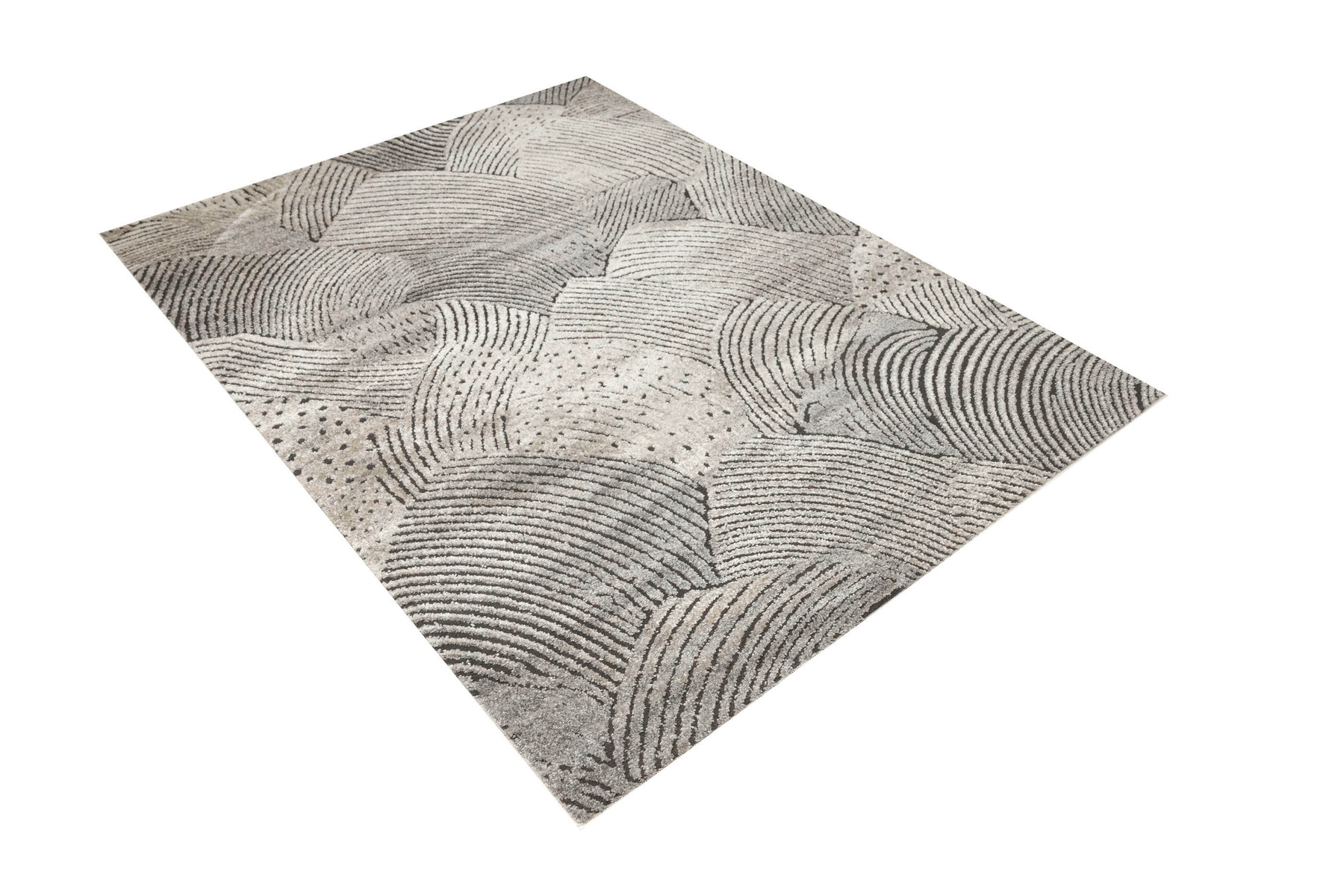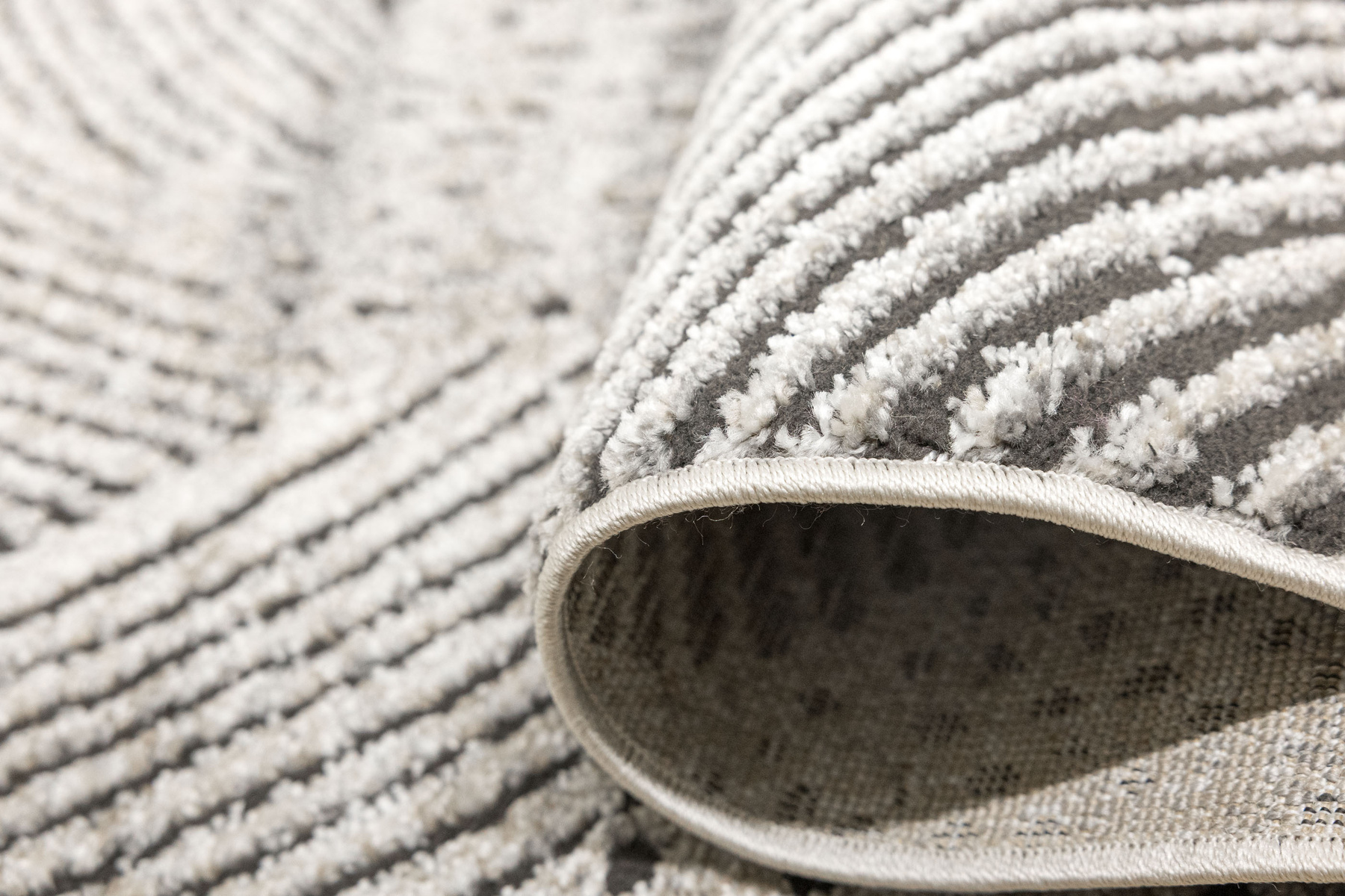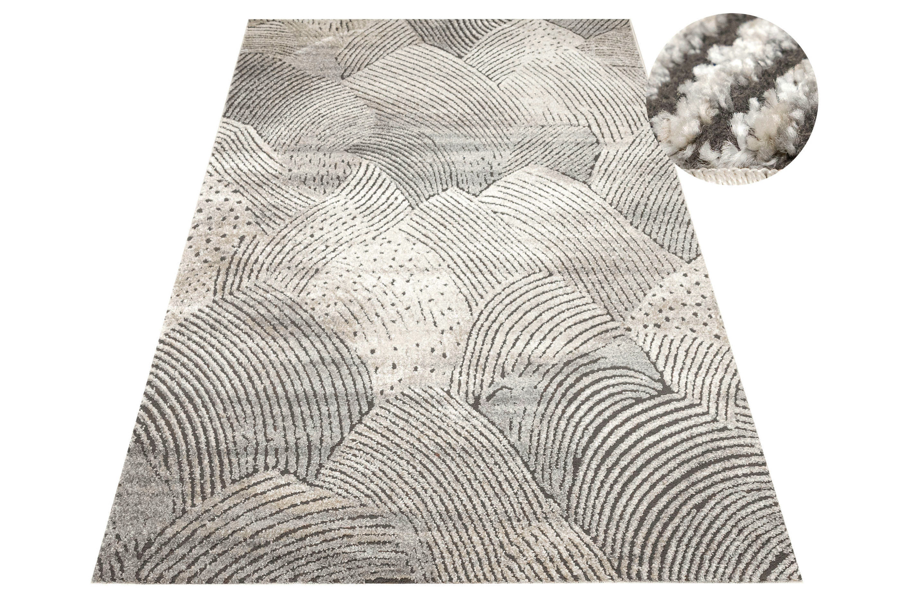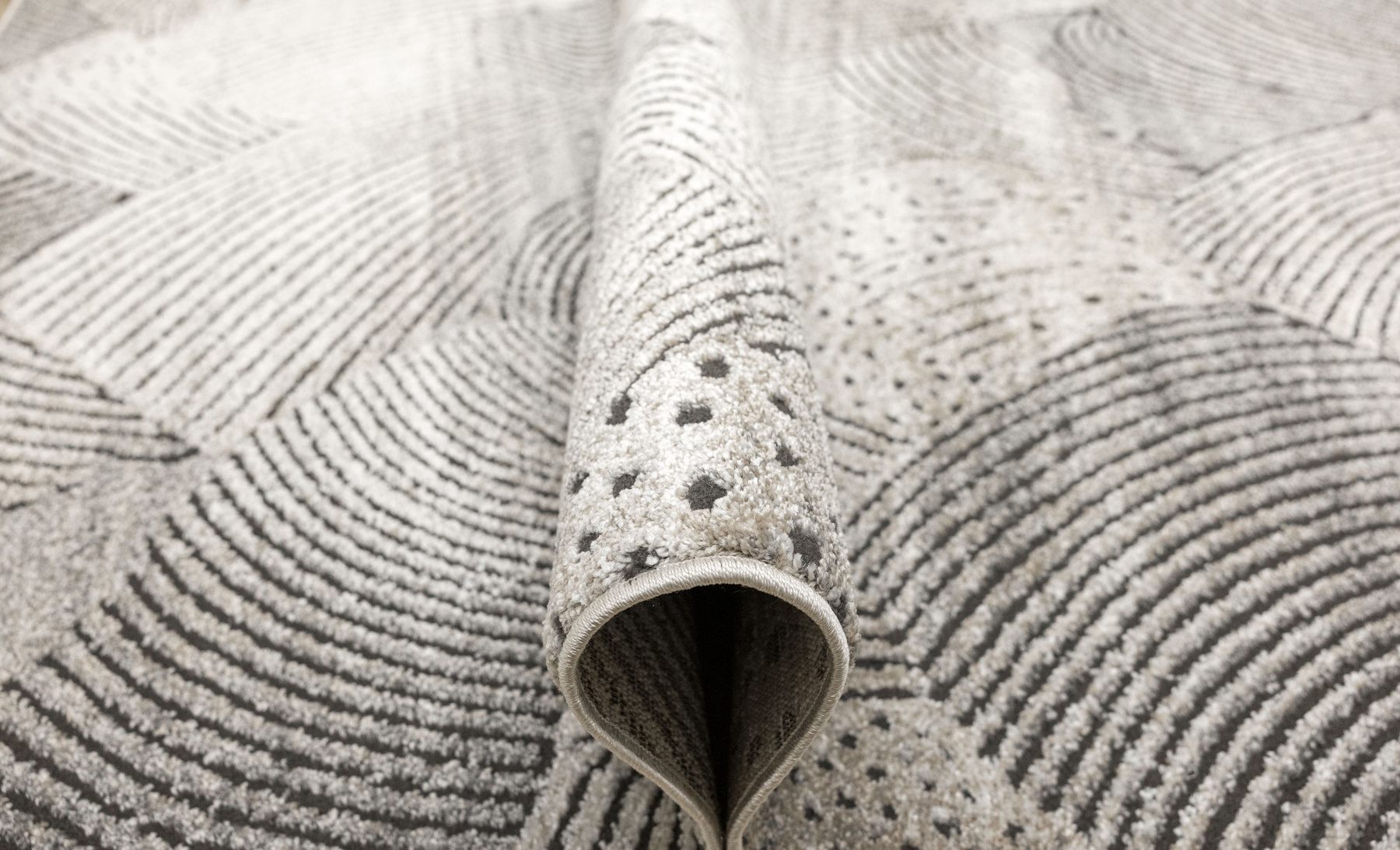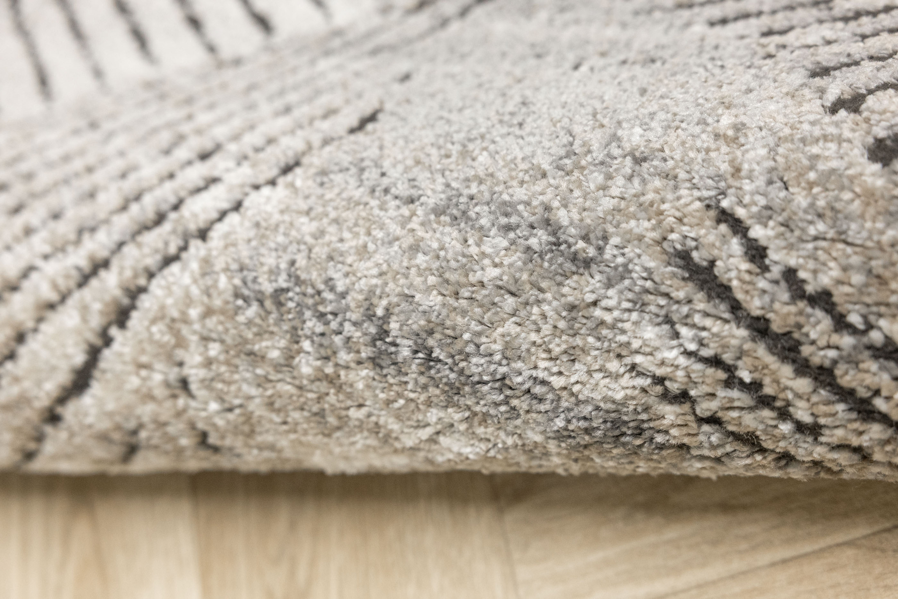 - Miękki i przyjemny w dotyku dywan Matara o dwupoziomowym runie ozdobionym inspirowanym naturą wzorem w kremach, beżach, szarościach i w czerni. Spód dywanu wykończony jutą.